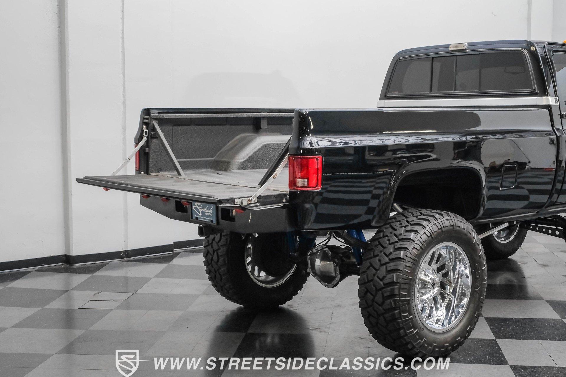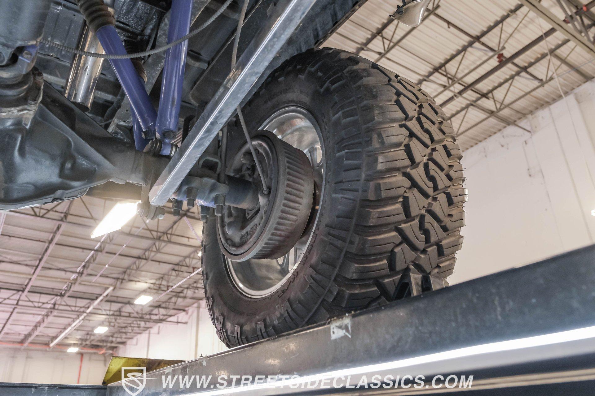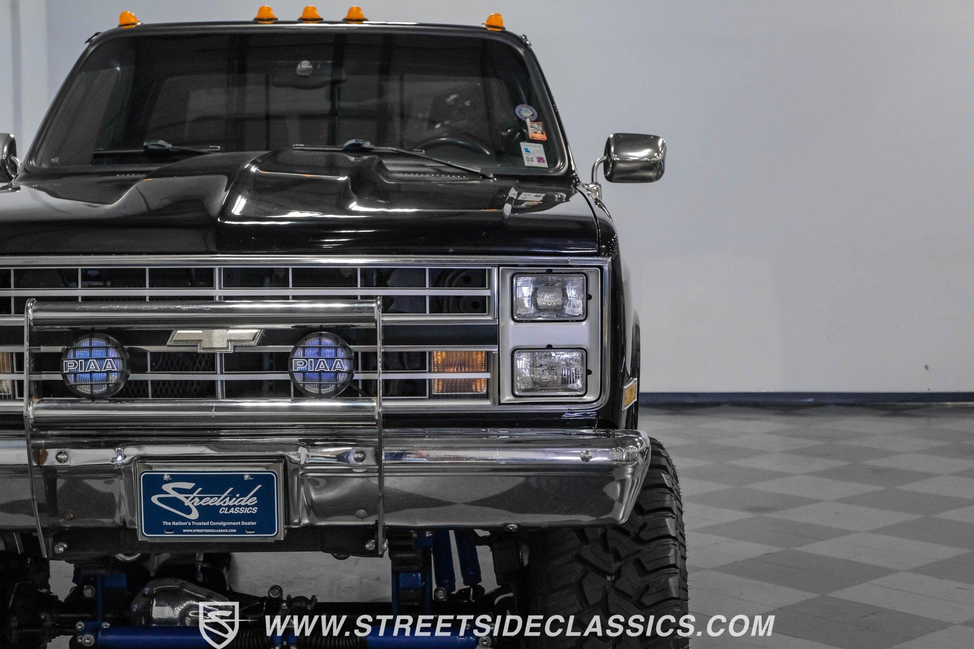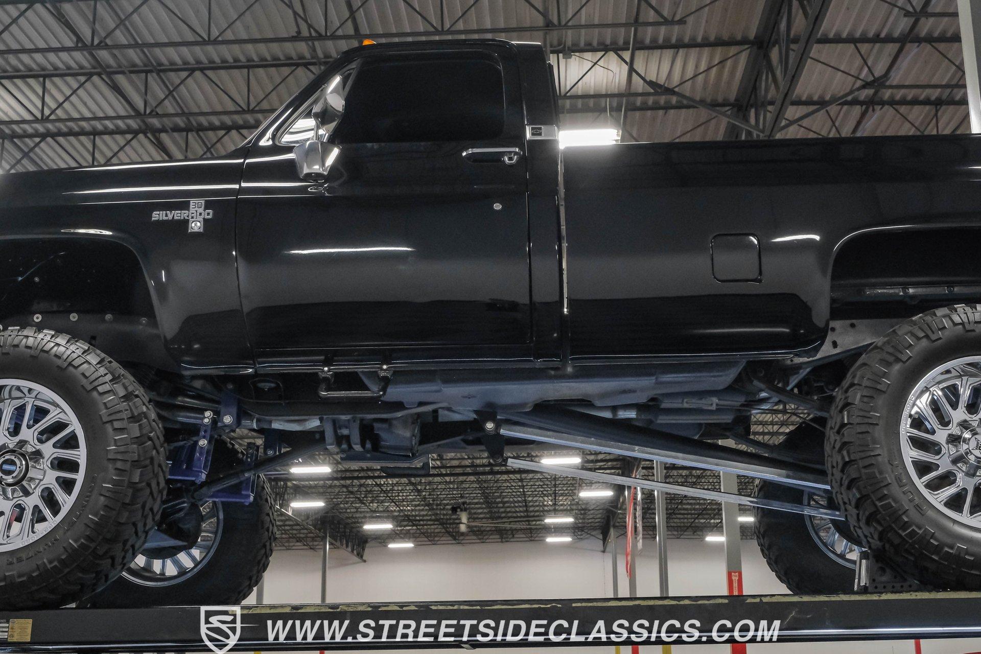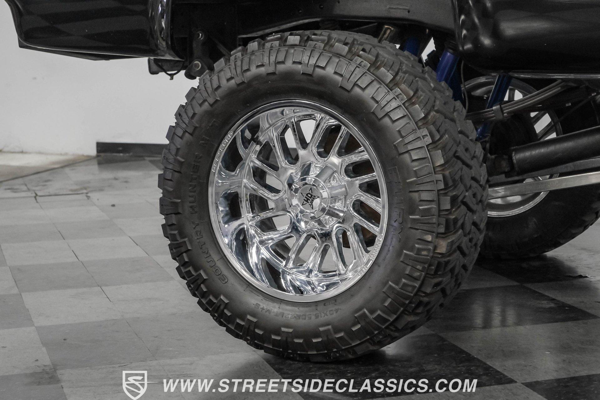 Here is one big, big truck that looks awesome and mean at the same time. It's a 1986 Chevrolet K30 Silverado 4x4 that has all the goodies a truck enthusiast would want. The paint job is excellent and pairs perfectly with the chrome. The wheels and tires give this beast a menacing look, and with four-wheel drive, it probably can go anywhere it wants. The chrome front bumper looks great and the rear has a flush mounted black steel custom bumper, and when you tie that in with the cowl induction hood, you have one well-put-together truck. There are also clearance lights on top and PIAA lights on the grille for added visibility. And for extra protection, it comes with a spray-in bed liner and two functional fuel tanks. The interior is very nicely done with a Charcoal Gray and Black color theme. The gauge cluster holds its original configuration, with a mounted AutoGauge tachometer on top of the dashboard. Just off to the right are your heat and air conditioning controls, and below that is a JVC AM/FM radio with Aux inputs and Bluetooth. For steering, you get a GT steering wheel and a tilt steering column with column shifting, while engaging four-wheel drive requires the floor shifter. The bench seats look to be in very good shape, as do the dash, headliner, carpets, and door panels. And along with the bench seat, it features a center console above for those little things you usually keep in one. A big truck like this needs big power, and that's exactly what this Chevy has. Under the hood is a BluePrint 540 cubic-inch crate engine that's been dynoed at 704 horsepower and 703 lb-ft of torque. This engine is equipped with aluminum BluePrint heads, a healthy cam, and a Weiand intake with a Holley 4-barrel carburetor. Power is sent through a TH400 transmission that connects to axles that harbor 4.56 gears. For suspension, both the front and rear use leaf springs and shocks-two sets of shocks per side in the front and three shocks per side in the rear. This beautiful truck rides on 22-inch Luxx wheels wrapped in massive 40x15.50R22 Fury tires. Front power disc brakes combined with rear power drum brakes bring this beast to a stop. And for a sound that matches its monstrous vibe, the engine exhales through long-tube headers, dual exhaust, and a set of Flowmasters. Highlights: BluePrint 540 Cubic-Inch Crate Engine Dynoed At 704 Horsepower And 703 LB-FT Of Torque (With Dyno Sheet) Aluminum BluePrint Heads Healthy Camshaft Weiand Intake With Holley 4-Barrel Carburetor TH400 4-Speed Transmission 4.56 Gears Front And Rear Leaf Springs Two Shocks In The Front On Each Side And Three On Each Side For The Rear Front Power Disc Brakes 22-Inch Luxx Wheels With 40x15.50R22 Fury Tires Power Windows And Locks Functional Dual Fuel Tanks Heat And Air Conditioning Tilt Steering Wheel Overhead Console For Storage Aftermarket Rearview Mirror With Temp Readouts and Compass GT Steering Wheel Aftermarket Clearance Lights And PIAA Lights Big, bold, and in control-that's what this 1986 Chevrolet K30 Silverado 4x4 is all about. If you like driving above traffic, you'll feel like the king of the road in this monster. For more info, Call Us Today!