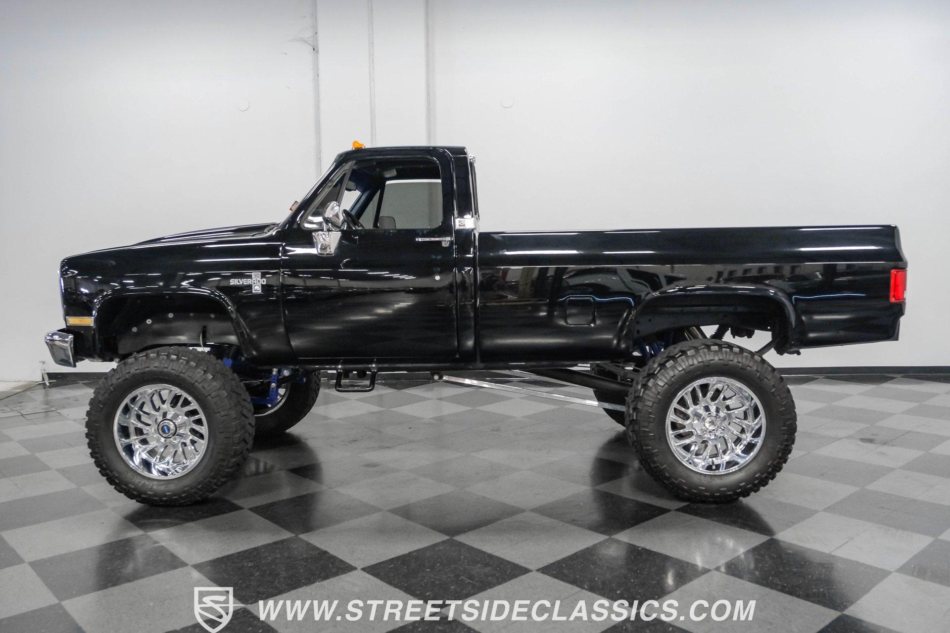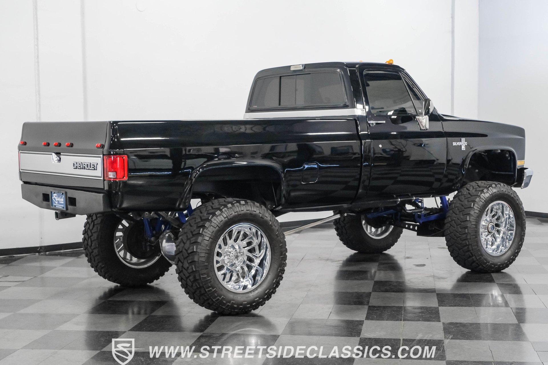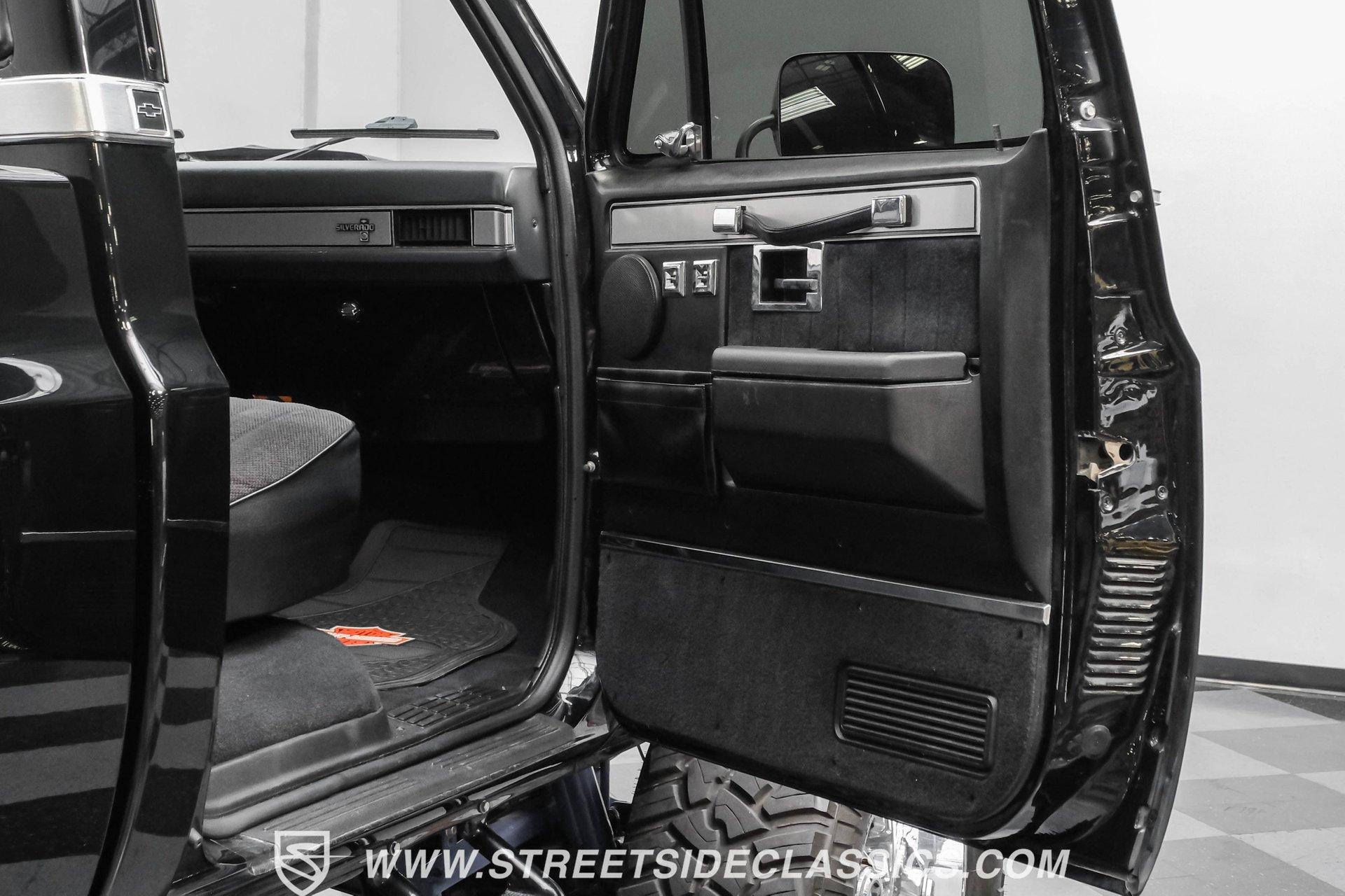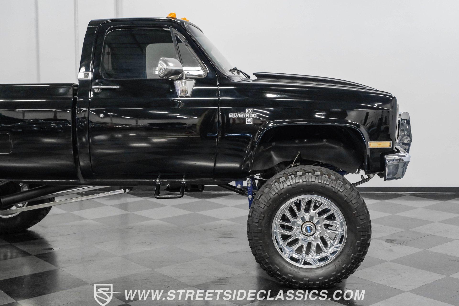 Here is one big, big truck that looks awesome and mean at the same time. It's a 1986 Chevrolet K30 Silverado 4x4 that has all the goodies a truck enthusiast would want. The paint job is excellent and pairs perfectly with the chrome. The wheels and tires give this beast a menacing look, and with four-wheel drive, it probably can go anywhere it wants. The chrome front bumper looks great and the rear has a flush mounted black steel custom bumper, and when you tie that in with the cowl induction hood, you have one well-put-together truck. There are also clearance lights on top and PIAA lights on the grille for added visibility. And for extra protection, it comes with a spray-in bed liner and two functional fuel tanks. The interior is very nicely done with a Charcoal Gray and Black color theme. The gauge cluster holds its original configuration, with a mounted AutoGauge tachometer on top of the dashboard. Just off to the right are your heat and air conditioning controls, and below that is a JVC AM/FM radio with Aux inputs and Bluetooth. For steering, you get a GT steering wheel and a tilt steering column with column shifting, while engaging four-wheel drive requires the floor shifter. The bench seats look to be in very good shape, as do the dash, headliner, carpets, and door panels. And along with the bench seat, it features a center console above for those little things you usually keep in one. A big truck like this needs big power, and that's exactly what this Chevy has. Under the hood is a BluePrint 540 cubic-inch crate engine that's been dynoed at 704 horsepower and 703 lb-ft of torque. This engine is equipped with aluminum BluePrint heads, a healthy cam, and a Weiand intake with a Holley 4-barrel carburetor. Power is sent through a TH400 transmission that connects to axles that harbor 4.56 gears. For suspension, both the front and rear use leaf springs and shocks-two sets of shocks per side in the front and three shocks per side in the rear. This beautiful truck rides on 22-inch Luxx wheels wrapped in massive 40x15.50R22 Fury tires. Front power disc brakes combined with rear power drum brakes bring this beast to a stop. And for a sound that matches its monstrous vibe, the engine exhales through long-tube headers, dual exhaust, and a set of Flowmasters. Highlights: BluePrint 540 Cubic-Inch Crate Engine Dynoed At 704 Horsepower And 703 LB-FT Of Torque (With Dyno Sheet) Aluminum BluePrint Heads Healthy Camshaft Weiand Intake With Holley 4-Barrel Carburetor TH400 4-Speed Transmission 4.56 Gears Front And Rear Leaf Springs Two Shocks In The Front On Each Side And Three On Each Side For The Rear Front Power Disc Brakes 22-Inch Luxx Wheels With 40x15.50R22 Fury Tires Power Windows And Locks Functional Dual Fuel Tanks Heat And Air Conditioning Tilt Steering Wheel Overhead Console For Storage Aftermarket Rearview Mirror With Temp Readouts and Compass GT Steering Wheel Aftermarket Clearance Lights And PIAA Lights Big, bold, and in control-that's what this 1986 Chevrolet K30 Silverado 4x4 is all about. If you like driving above traffic, you'll feel like the king of the road in this monster. For more info, Call Us Today!