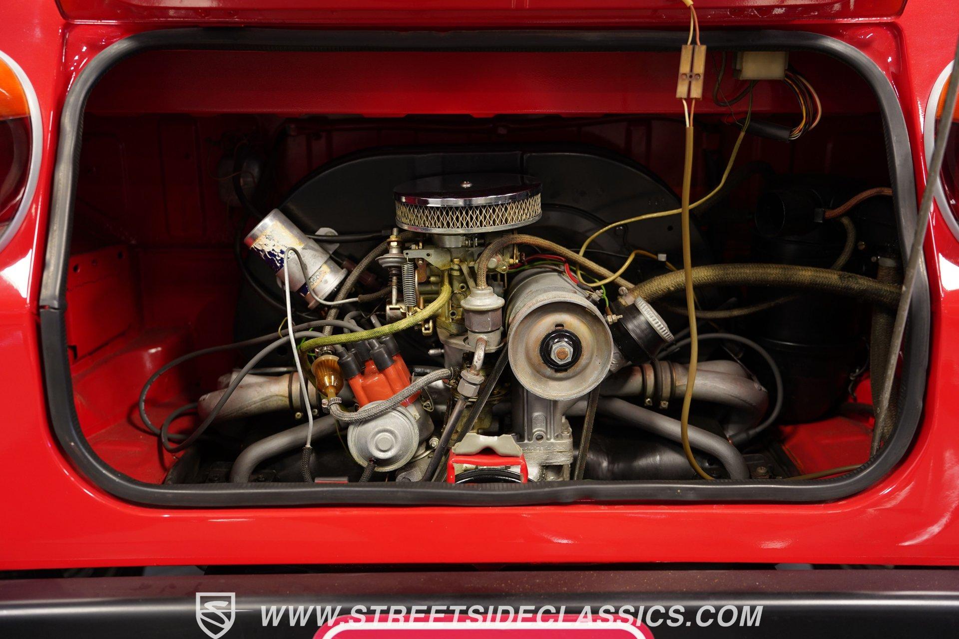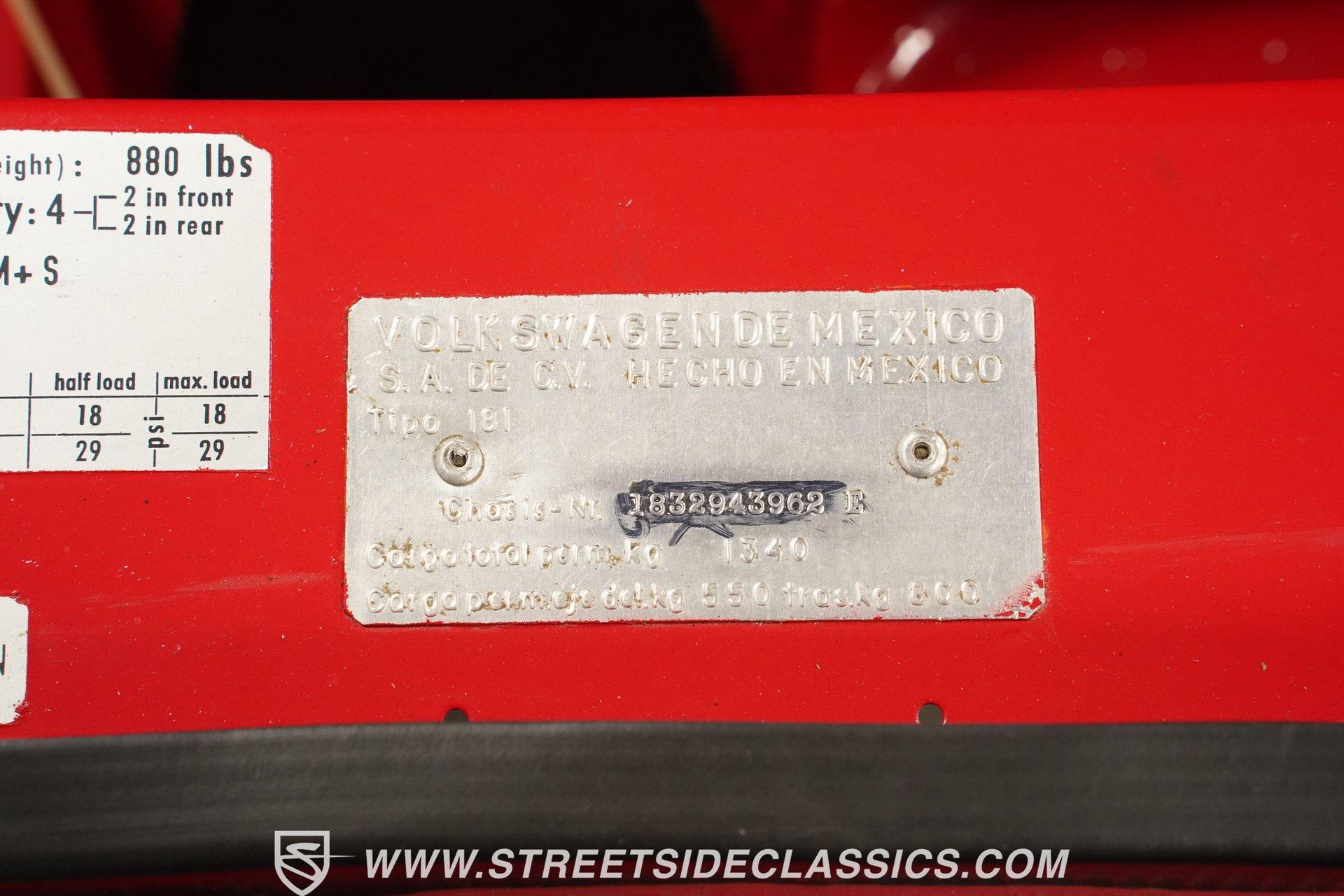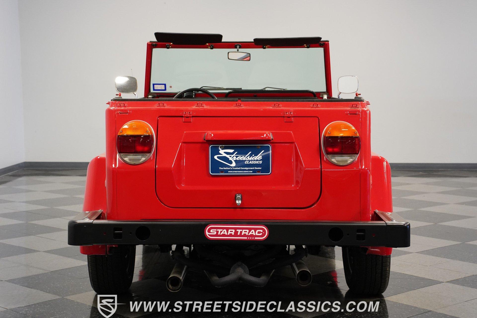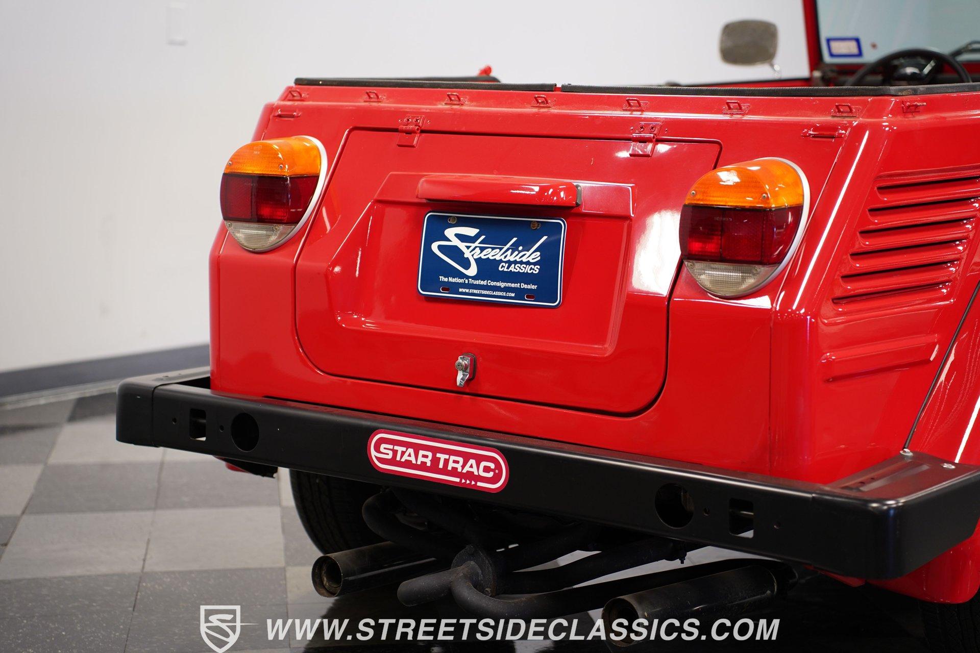 How often do you come across a classic car that's equal parts automotive icon and fitting time capsule centerpiece? Yet it's an apt description for this 1973 Volkswagen Thing Convertible Hard Top. Wearing striking red paint and appearing ready for the road, it's a very clean representative of its seldom-seen model. Take a nice, long look, and it will reinforce the notion of this VW's sturdy state. It sports brightwork that's in consistently good shape, and its panel gaps are surprisingly uniform. While its freewheeling image leads you to think of it primarily as an open-air vehicle, should the skies darken when you're behind the wheel, you'll have two options for protection from the elements, including both a soft top and a well-fitted contrasting white hard top. The interior is a great example of the simple but functional VW styling of the early '70s and has received the attention it needed to bring it back to top form. Both the front buckets and rear bench seat have been reupholstered in a white and black houndstooth check that looks sharp in this setting, while offering plenty of comfort for longer excursions. The floor is lined with wood paneling that appears to have also been revitalized and adds a strong element to the surrounding freshened red steel surfaces inside the doors. The factory steering wheel is still in place, and just in front of it, the factory instrument gauge is still functional and readable. An aftermarket Kenwood AM/FM/CD stereo takes the place of its factory counterpart at the center of the dash, and while it will need a little attention to get back online, that shouldn't be a difficult job. This German classic is powered by a factory correct, air-cooled 1600cc engine that's ready for the asphalt right off the bat. Starting up easily, idling smoothly, and accelerating without hesitation, the engine pairs with a 4-speed manual transmission that shifts without a hitch and it sits in a nice, clean engine bay, surrounded by wiring that appears to have recently been replaced. The clutch action is surprisingly precise, and the car tracks with no wandering, reinforcing the notion that this unique ride would be a really fun open-air cruiser that's sure to turn heads. HIGHLIGHTS 1600CC FACTORY CORRECT ENGINE 4-SPEED MANUAL TRANSMISSION REAR WHEEL DRIVE AFTERMARKET DUAL EXHAUST 15" WHEELS CONVERTIBLE CLOTH TOP REMOVABLE HARD TOP CAPTIVATING RED EXTERIOR FRESHENED INTERIOR MIXES VINYL AND CLOTH BLACK AND WHITE HOUNDSTOOTH CHECK UPHOLSTERY If you're searching for a truly unique classic but don't want to sacrifice drivability in the process, this 1973 Volkswagen Thing Hard Top Convertible is well worth checking out. You just don't see many of these cars on the road anymore, and the solid road-readiness and freshened appearance this one has should put it at the top of your list. Call today!