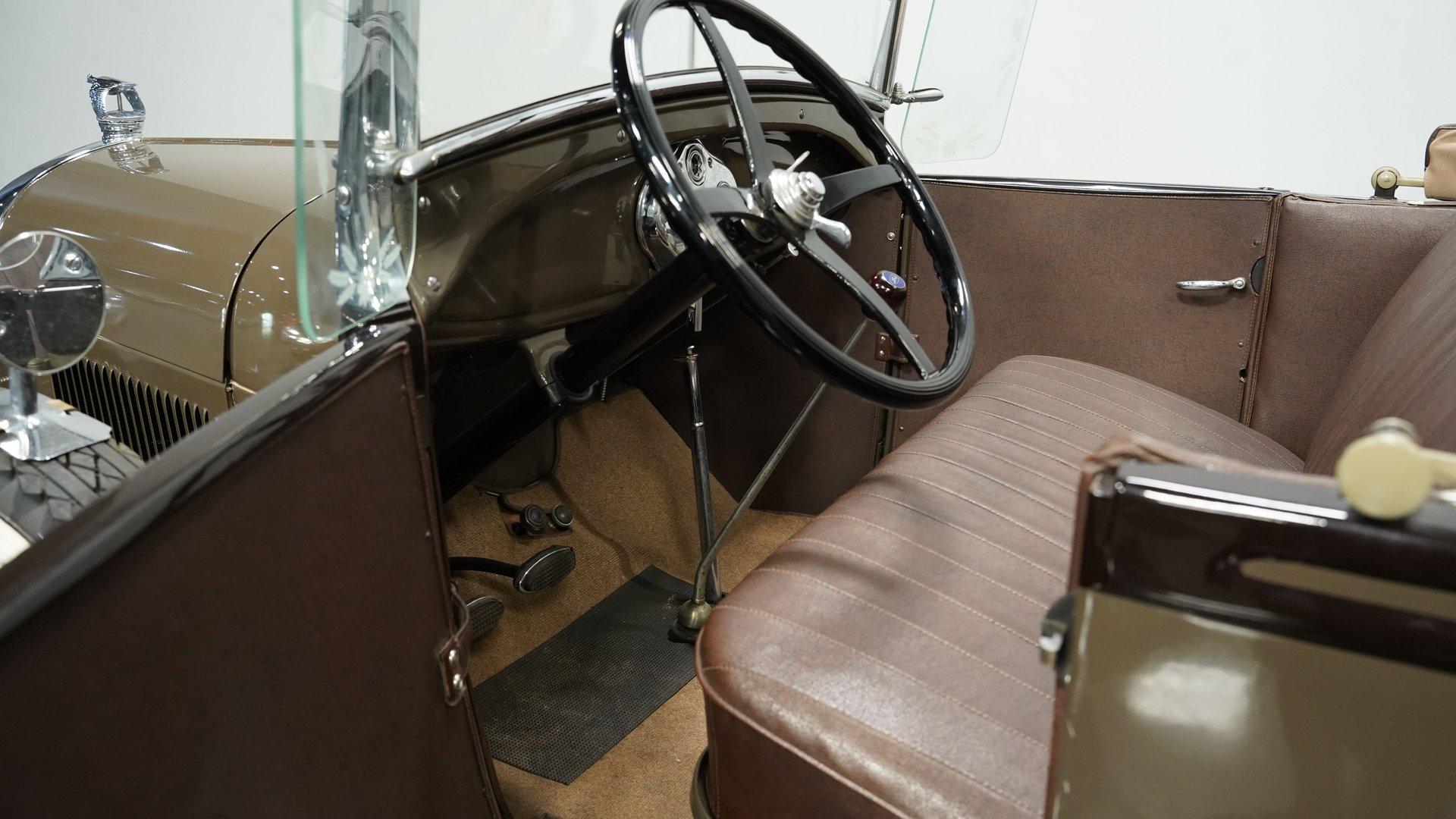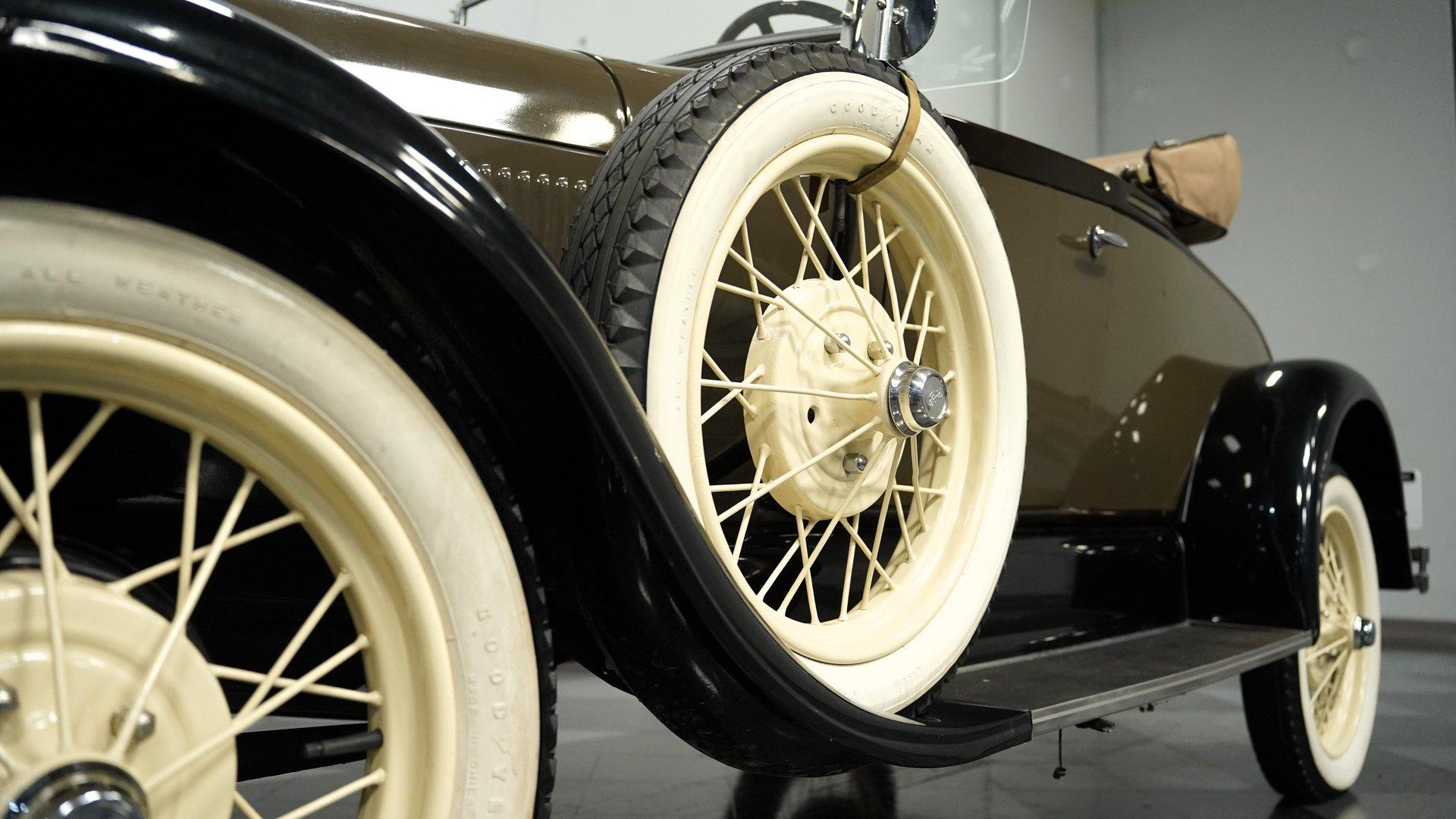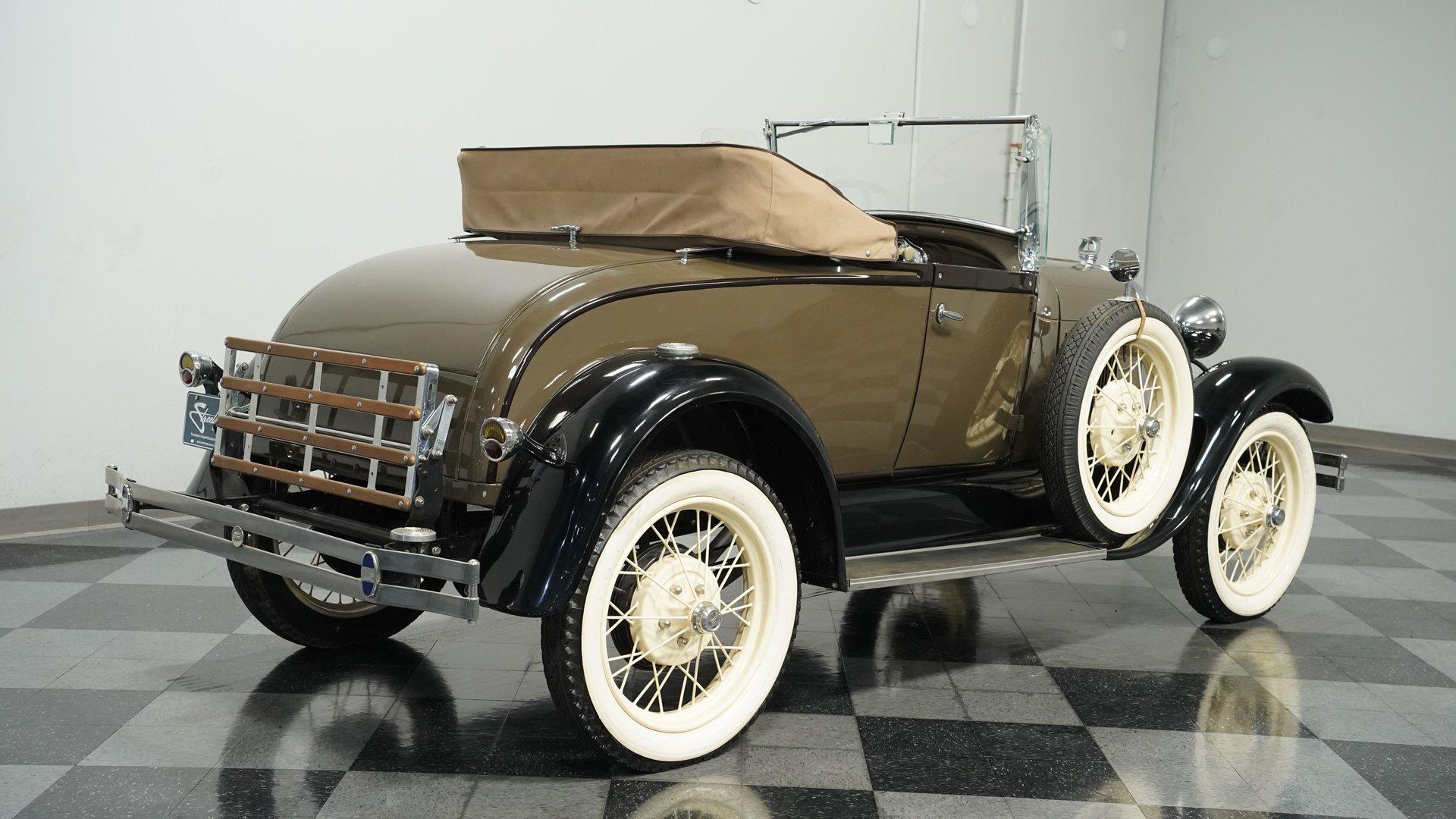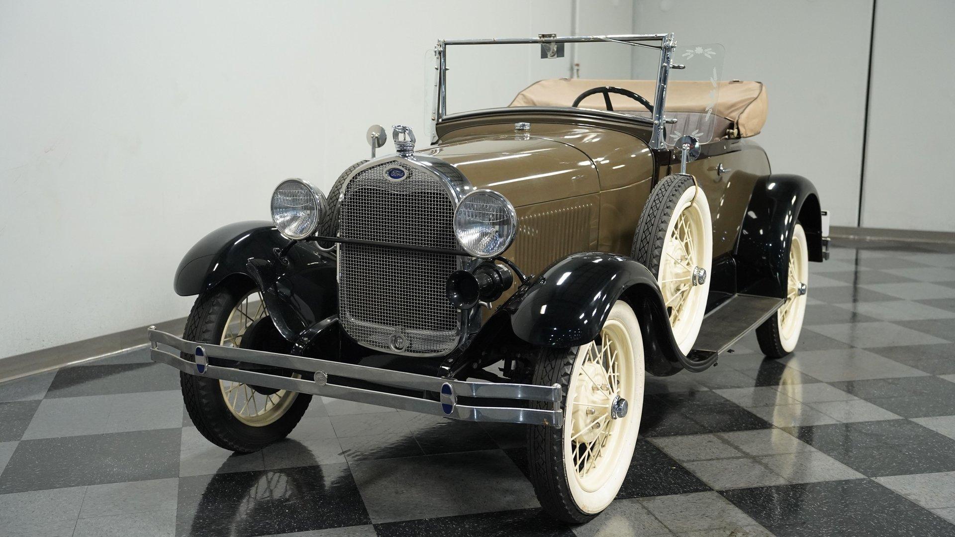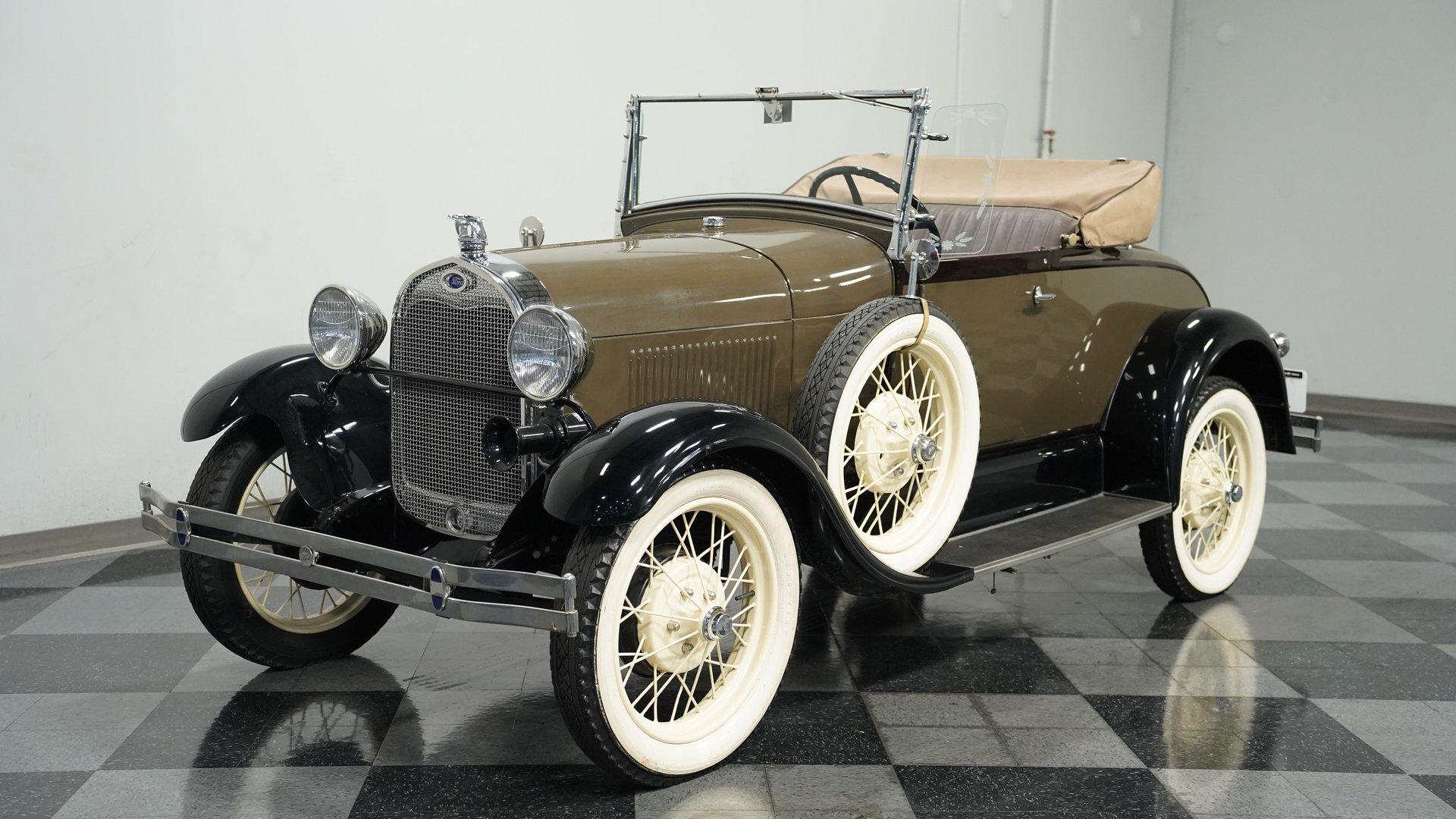 The Ford Model A replaced the wildly successful Model T for the 1928 model year with production lasting until 1931. A far more complex vehicle than its predecessor, it debuted many significant improvements. Its L-head inline four-cylinder engine gained more displacement and produced a claimed 40 horsepower-twice that of the Model T. Fuel was gravity fed to the carburetor from a tank positioned in the cowl, between the engine compartment and the dashboard, featuring a visual fuel gauge. Other new features included four-wheel mechanical brakes, a battery-powered ignition system, and safety glass for the windshield, an industry first. Significantly, the Model A was also the first Ford to adopt a standard set of driver controls, with conventional clutch, throttle, and brake pedals and a gear shifter like on vehicles from other manufacturers of the day. Ford offered a wide variety of consumer and commercial body styles for the Model A, with the Roadster body seen on the 1929 Ford Rumble Seat Roadster offered here remaining particularly popular among collectors. This restored 1929 Ford Model A Rumble Seat Roadster displays a sharp exterior that has been carefully maintained. The classic Olive Drab and Black paint job shows excellent depth across the body panels and fenders. The straw-colored spoke wheels contrast well against the body color, with wide whitewall tires giving it proper road presence. A tan canvas convertible top folds neatly behind the cabin, and the running boards feature good rubber covering. This Model A is well accessorized, with a grill guard, Flying Quail hood ornament, etched wing windows, dual side-mount tires with mirrors, luggage rack, manual drivers-side wiper, and whitewall tires. The brown vinyl interior presents clean, functional simplicity. The bench seat provides good support with the floor shifter positioned for easy access. The dash is painted to match the exterior, creating visual continuity throughout the vehicle. Brown door panels match the seating surfaces, maintaining a cohesive look across all interior components. A beveled rear-view mirror offers necessary visibility for safe driving. The carpet shows good condition throughout the cabin floor. The 201 CI 4-cylinder engine connects to a 3-speed manual transmission for authentic Model A performance with a clean engine bay showing evidence of proper maintenance. An upgrade to an alternator helps insure reliability. Mechanical drum brakes handle stopping duties from all four corners and the front suspension uses a mono leaf spring while the rear employs a traditional leaf spring setup. The factory rear end maintains correct specifications and the exhaust provides the only soundtrack you need. HIGHLIGHTS: 201 CI 4-Cylinder Engine 3-Speed Manual Transmission Luggage Rack Two-Tone Olive Drab and Black Paint Beveled Rear View Mirror Tan Canvas Convertible Top 21" Straw Painted True Spoke Wheels Wide Whitewall Tires Side Mount Side Tires Accessory Grill Shield Accessory Flying Quail Hood Ornament Etched Wing Windows Spare Tire Mounted Mirrors Rumble Seat Upgraded with Alternator This well accessorized 1929 Ford Model A Rumble Seat Roadster combines authentic design with solid mechanical fundamentals. Perfect for parades, classic car shows, or weekend drives, this well-maintained Model A offers a genuine slice of automotive history. Call today!