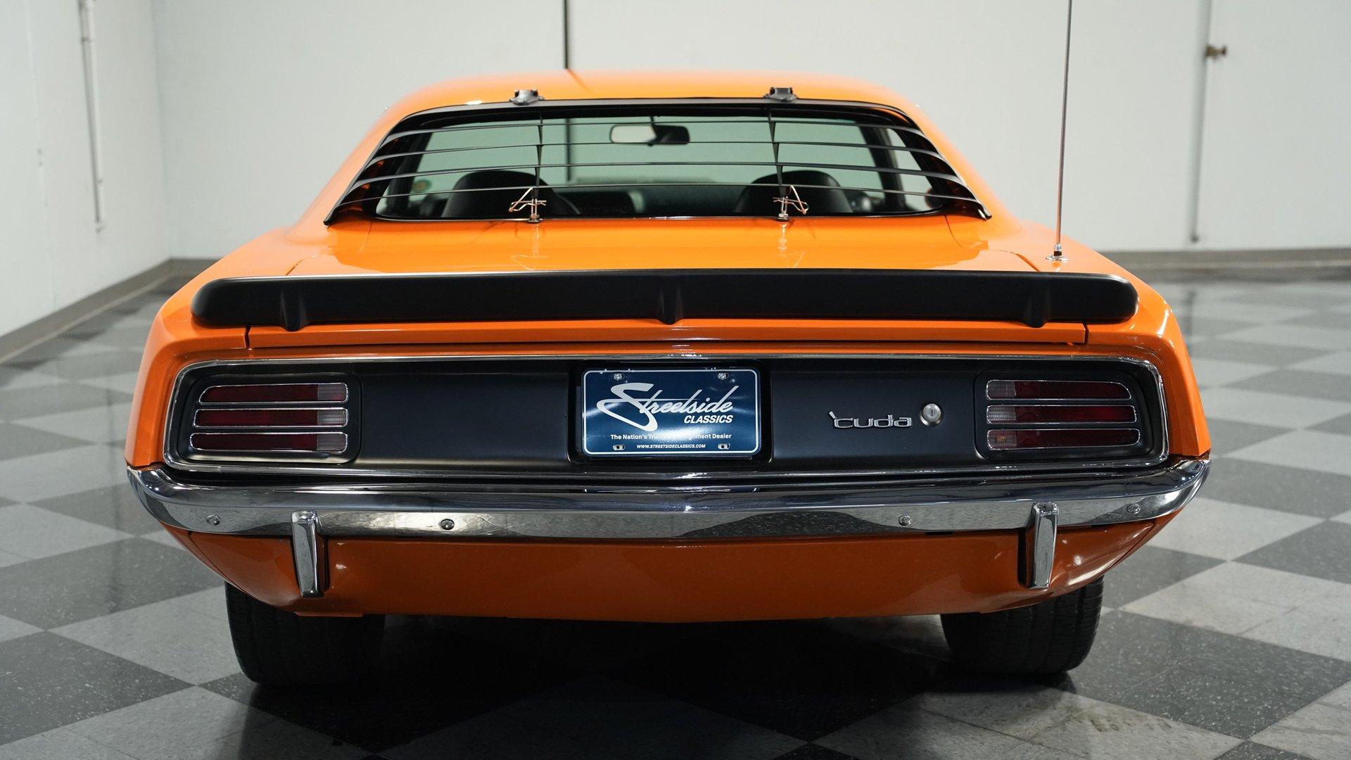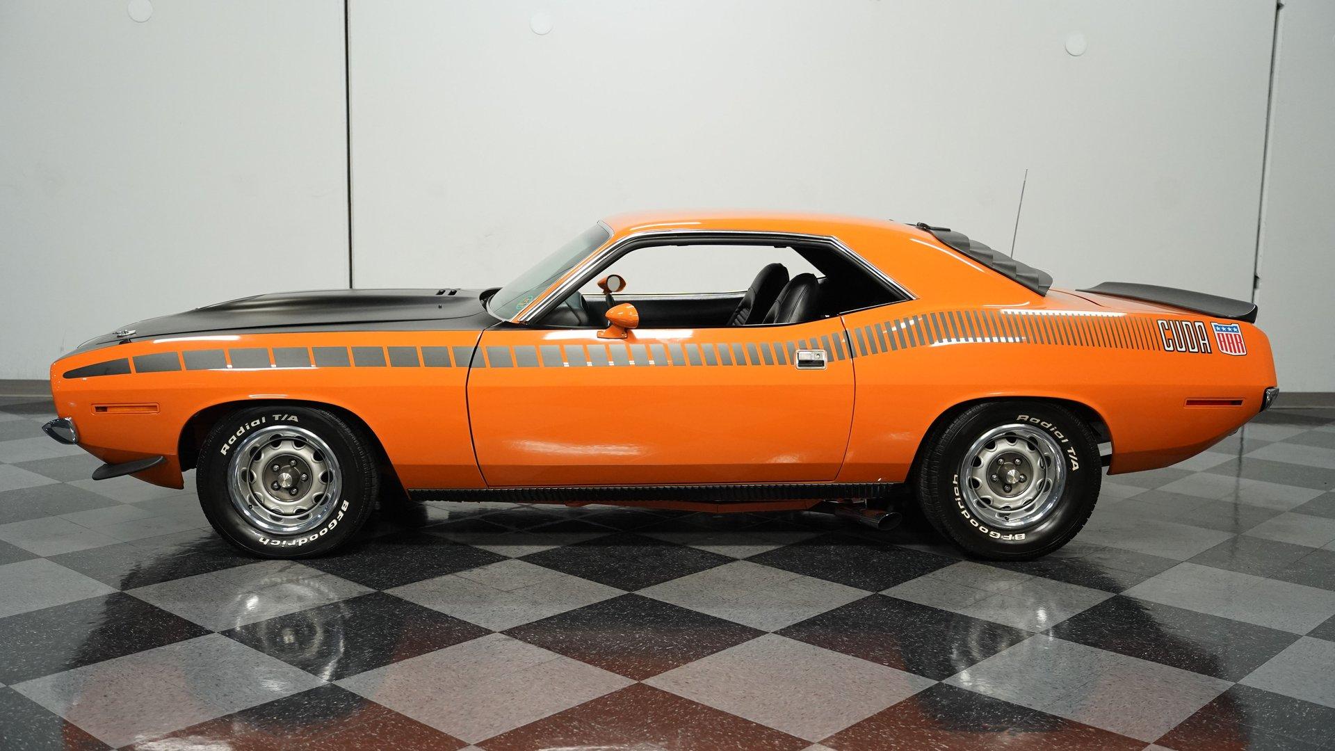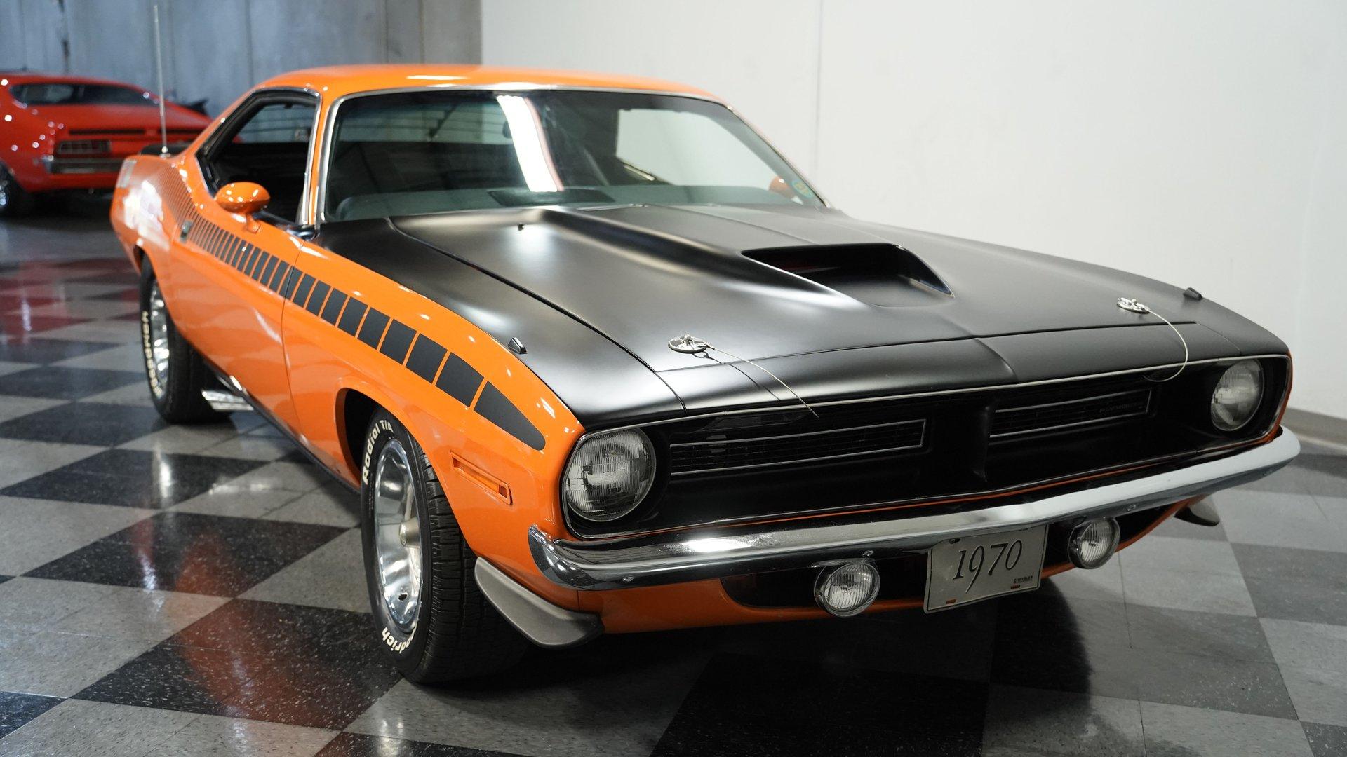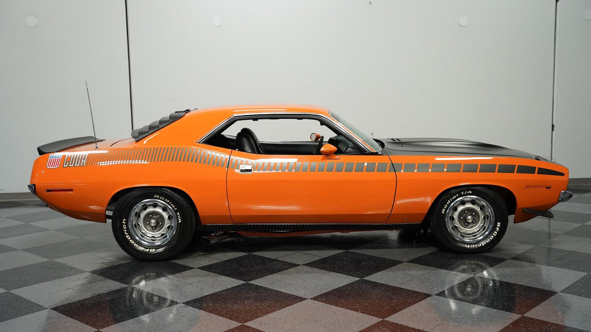 Who hasn't ever wanted to own a muscle car like this, especially if you're a Mopar guy? Let's face it, 1970 Plymouth Cuda AAR Tributes don't come along too often, and true Cuda AARs rarely ever do. But here you have one that has been restored with meticulous detail and comes with a photo book of the rotisserie restoration. This means no hidden surprises-just a real-deal tribute Cuda with an almost flawless Vitamin C Orange and Matte Black paint job. Looking at this car and listening to it run should bring shivers up your spine. Black louvers on the rear window, side-exit exhaust, period-correct wheels with beauty stripes-this baby has it all. The interior is mostly black with vinyl bucket seats in the front and back. The carpet, door panels, headliner, and dashboard all look fantastic. The center console is sharp with the pistol-grip shifter surrounded by a period-correct woodgrain inlay. The dashboard gauge cluster has been redone to stock with woodgrain inlays and extremely clear and easy-to-read gauges. On one side of the steering console, there are the heat and A/C controls, and on the other are the stock-appearing radio controls. The weather stripping and windows look great, and so do the door jambs and sills. Inside the trunk, you'll find it painted the same color as the exterior and spotless. Under the hood should send you into a whole other world of happiness. Although the engine looks very stock, you're looking at an inconspicuous 406 Stroker V8. A Six-Pack carburetor setup is installed on top of the intake for consistent fuel delivery. Mated to the engine is a T5 5-speed manual transmission with a Centerforce performance clutch, which runs back to an 8 ¾ rear axle. The front suspension relies on A-arms with shocks for handling, while the rear uses a leaf spring setup with shocks. The 15-inch Rallye wheels with beauty rings are classic on these Mopars, and the 235/60R15 front and 275/60R15 rear tires give this Cuda the perfect stance. Power front disc brakes and power rear drum brakes handle the stopping duties, while the exhaust note roars through shorty manifolds, dual exhaust, aftermarket mufflers, and side-exit exhaust pipes. HIghlights: Photo Book Of Rotisserie Restoration 406 Stocker V8 With A Six-Pack Carburetor Setup T5 5-speed Manual Transmission Centerforce Performance Clutch 8 ¾ Rear Axle 15-inch Rallye Wheels With Beauty Rings Subframe Connectors Front A-Arms With Shocks-Rear Leaf Springs With Shocks Front 235/60R15 And Rear 275/60R15 Tires Front Power Disc Brakes-Rear Power Drum Brakes Shorty Manifolds, Dual Exhaust, Aftermarket Mufflers, Side Exit Exhaust Pipes Power Steering Heat/Defrost/Air Conditioning AM Radio What better way to cruise around town on a nice day than in this 1970 Plymouth Cuda AAR Tribute? If you like popping the clutch, letting the tires spin, and even getting a little sideways, you'll have no problem doing it with this 406 Stroker motor backing you. Quit Dreaming and Call Today!