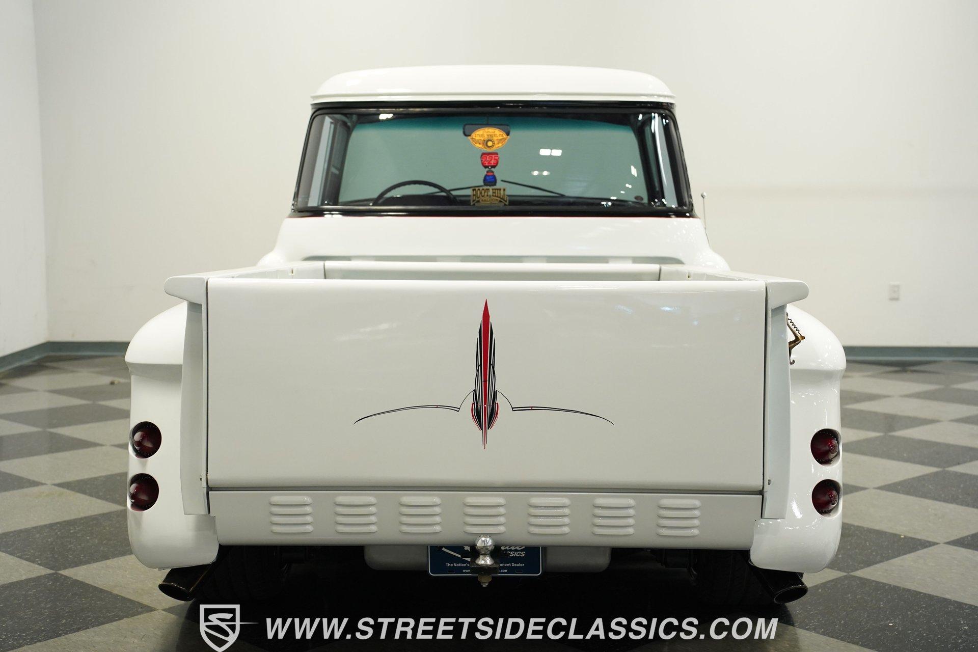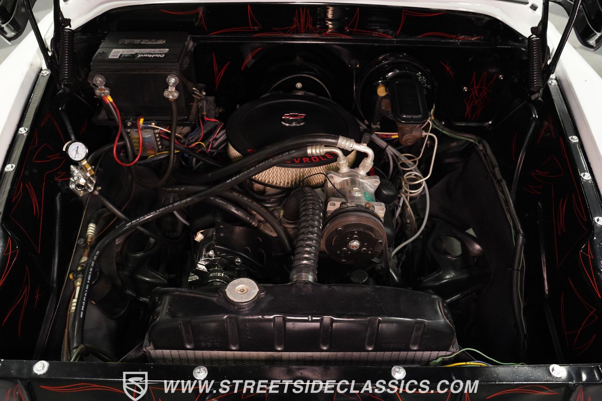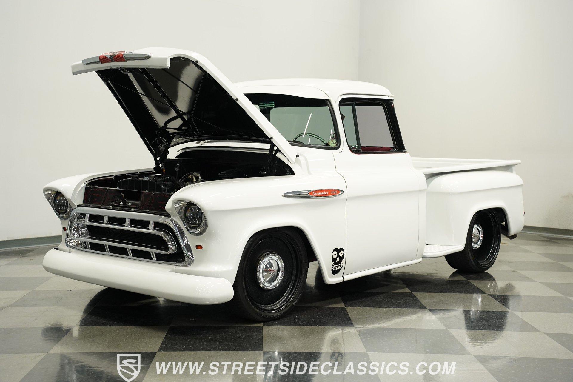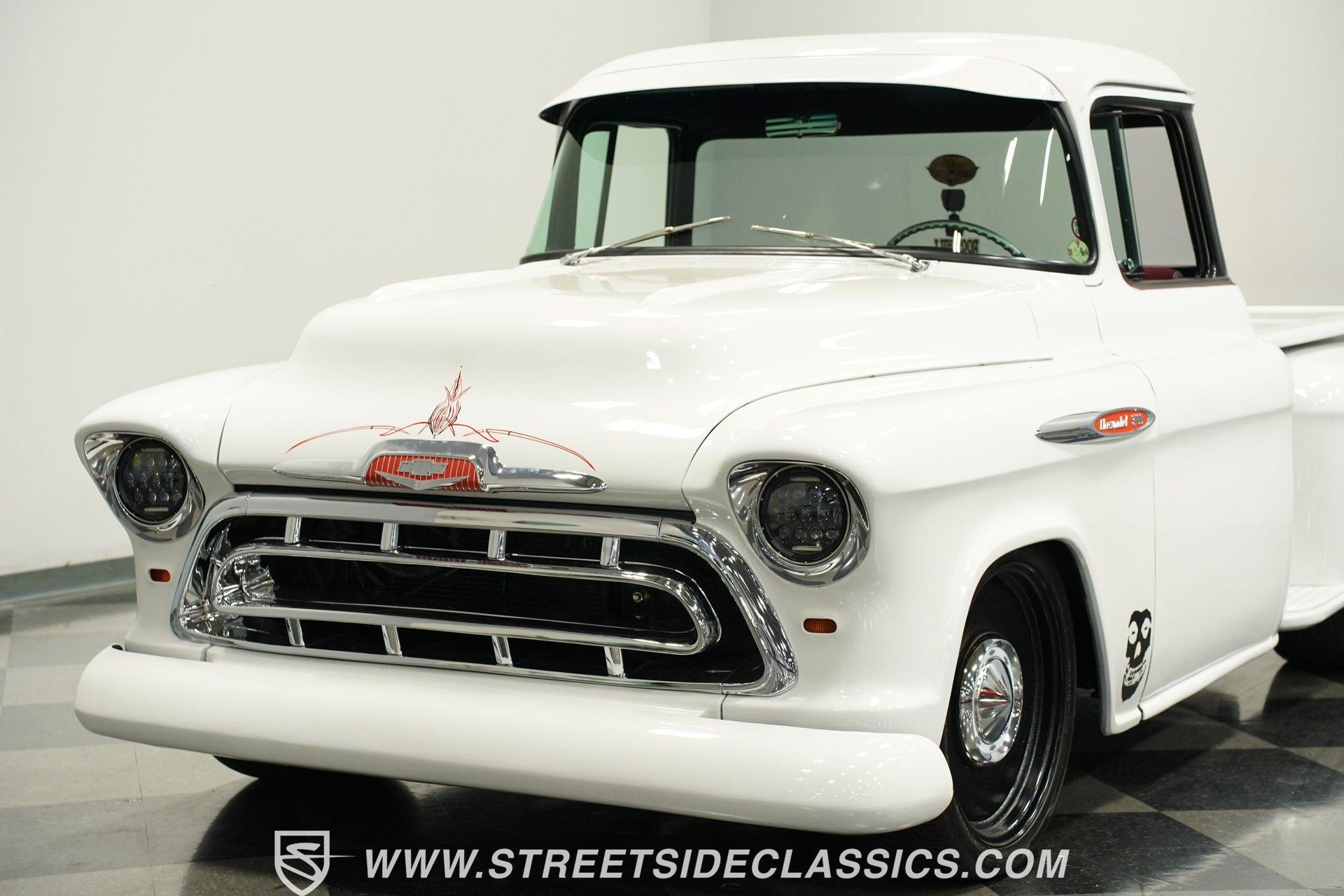Cool custom short-bed trucks are always in style and make for big hits at car shows and cruises. This 1957 Chevrolet 3100 Big Back Window cruiser will turn heads no matter what event it shows up to. The crisp white paint job and pinstriping in the front and rear go perfectly with the black Detroit Steel wheels, painted white bumpers, chrome front grille, LED headlights, and the custom frenched rear taillights tucked into the rear fenders. The door handles are shaved along with the tailgate handle. The truck bed looks outstanding, just like the rest of the truck. And just in case you need to tow something, there is a trailer hitch under the rear bumper. The interior carries an original/custom vibe. The red bench seat sets off the mostly black cabin. The original Chevy gauge cluster is paired with a Mooneyes tachometer and three AutoMeter gauges: Fuel, Water Temp, and Oil Pressure. A Holley Sniper Fuel Injection Control unit sits to the right of the steering wheel, helping the driver keep a closer eye on engine activity. The door panels are in good shape, as are the dashboard and custom headliner. Door jambs, dashboard, and glove box all feature creative pinstriping designs. The custom steering wheel looks sharp, and the shifter lever topped with a grenade knob adds a unique touch. Altogether, it's a well-done classic look for the interior. Under the hood, the pinstriping continues and only enhances the clean engine bay, which houses the Holley Sniper fuel-injected 350 cubic-inch V8 engine. This is paired with a reliable 700R4 4-speed automatic transmission that runs back to a later-model 10-bolt rear axle. For suspension, the Chevrolet gets a Camaro front subframe featuring A-arms with coil springs and shocks, while the rear uses leaf springs with air shocks. Gloss black Detroit Steel 20-inch wheels with chrome center caps sit at all four corners-wheels are wrapped in 245/40R20 front tires and 275/35ZR20 rear tires. For stopping power, the truck features power front disc brakes and rear drum brakes. And for that great old-school sound, dual exhaust runs through Cherry Bomb-style resonators. Highlights: 350 Cubic-Inch V8 Holley Sniper Fuel Injection System-Controller Inside 700R4 4-Speed Automatic Transmission GM Later Model 10-Bolt Rear Axle Camaro Front Subframe With A-Arms, Coil Springs, And Shocks Rear Leaf Springs With Air Shocks 20-Inch Gloss Black Detroit Steel Wheels Front 245/40R20 Tires Dated 2022-Rear 275/35ZR20 Tires Dated 2024 Power Front Disc Brakes-Power Rear Drum Brakes Stock Style Exhaust Manifold, Dual Exhaust, Cherry Bomb Resonators (Mufflers) Shaved Door Handles With Shaved Tailgate Handle Hand-Laid Pinstriping Exterior/Interior/Engine Bay Power Steering LED Headlights Custom Headliner Custom Frenched Taillights Rubber Bedliner Heat Power Windows Custom Steering Wheel With Tilt Mooneyes Tachometer AutoMeter Gauges: Oil, Temp, Fuel This beautiful 1957 Chevrolet 3100 Big Back Window is the epitome of cool cruising. It looks good, it sounds good, and it's full of custom touches. In the end, anyone who owns it will enjoy every moment they spend around this custom build. If a simple cruiser is what you're looking for, look no further-Call Us Today!