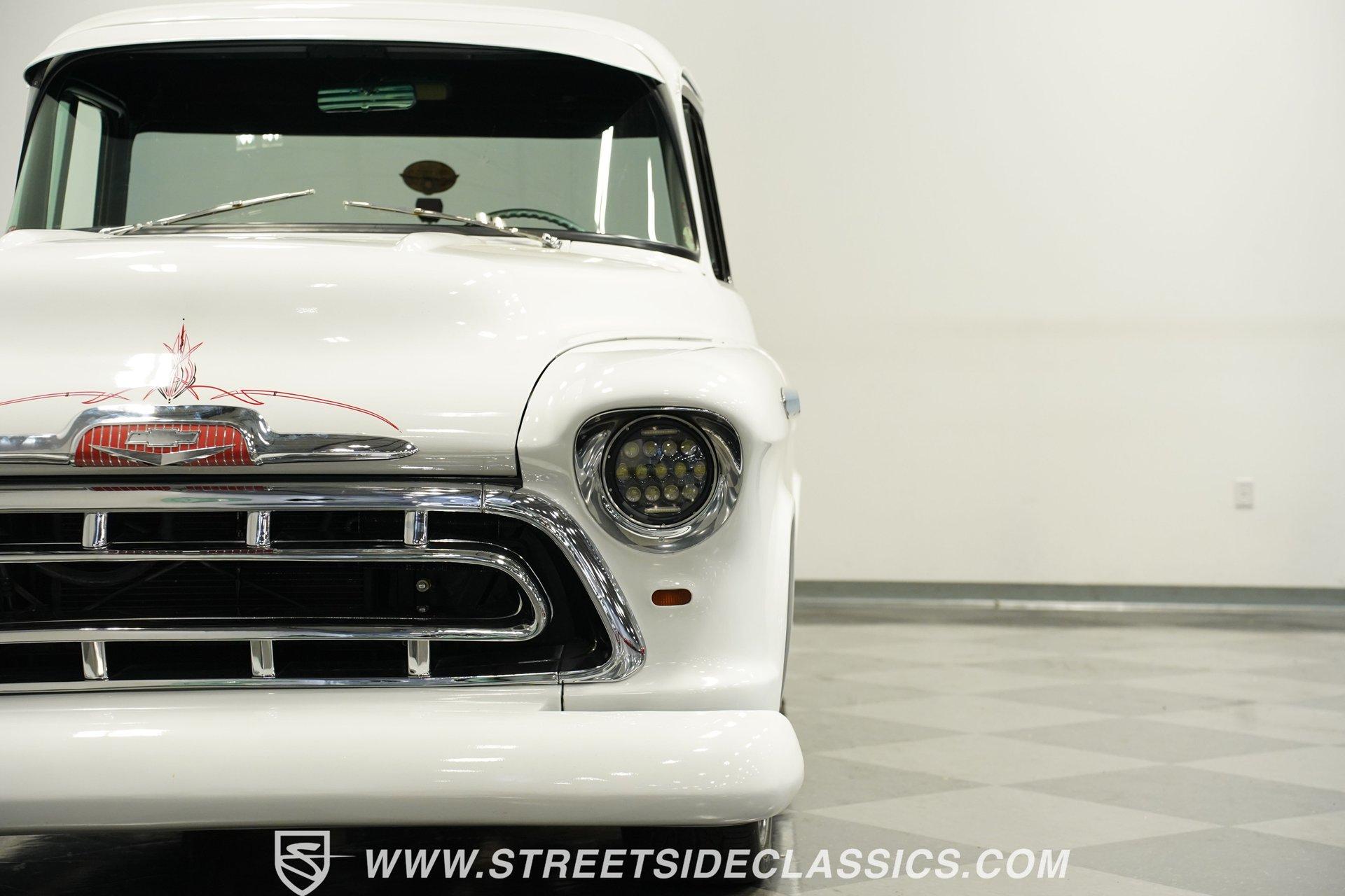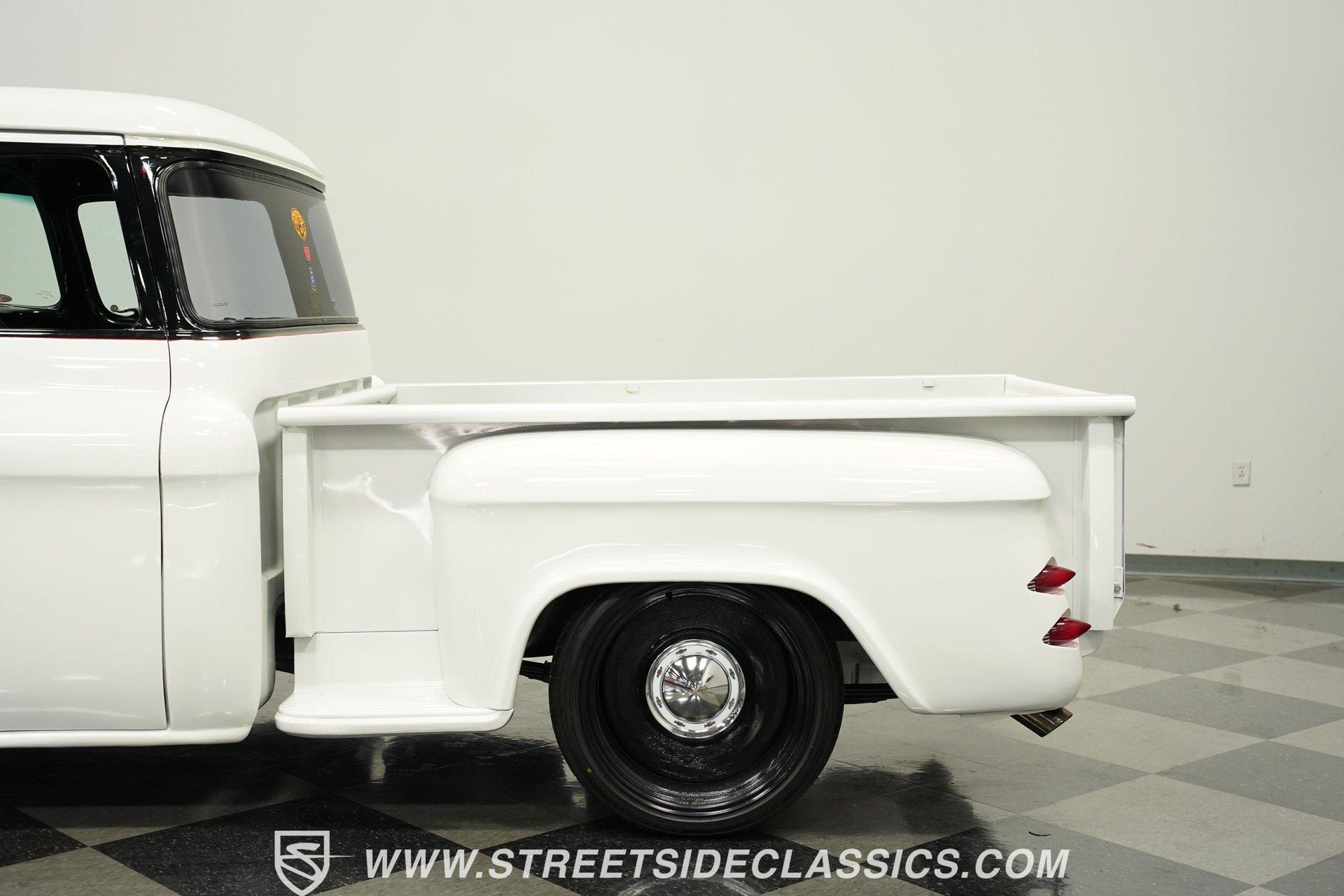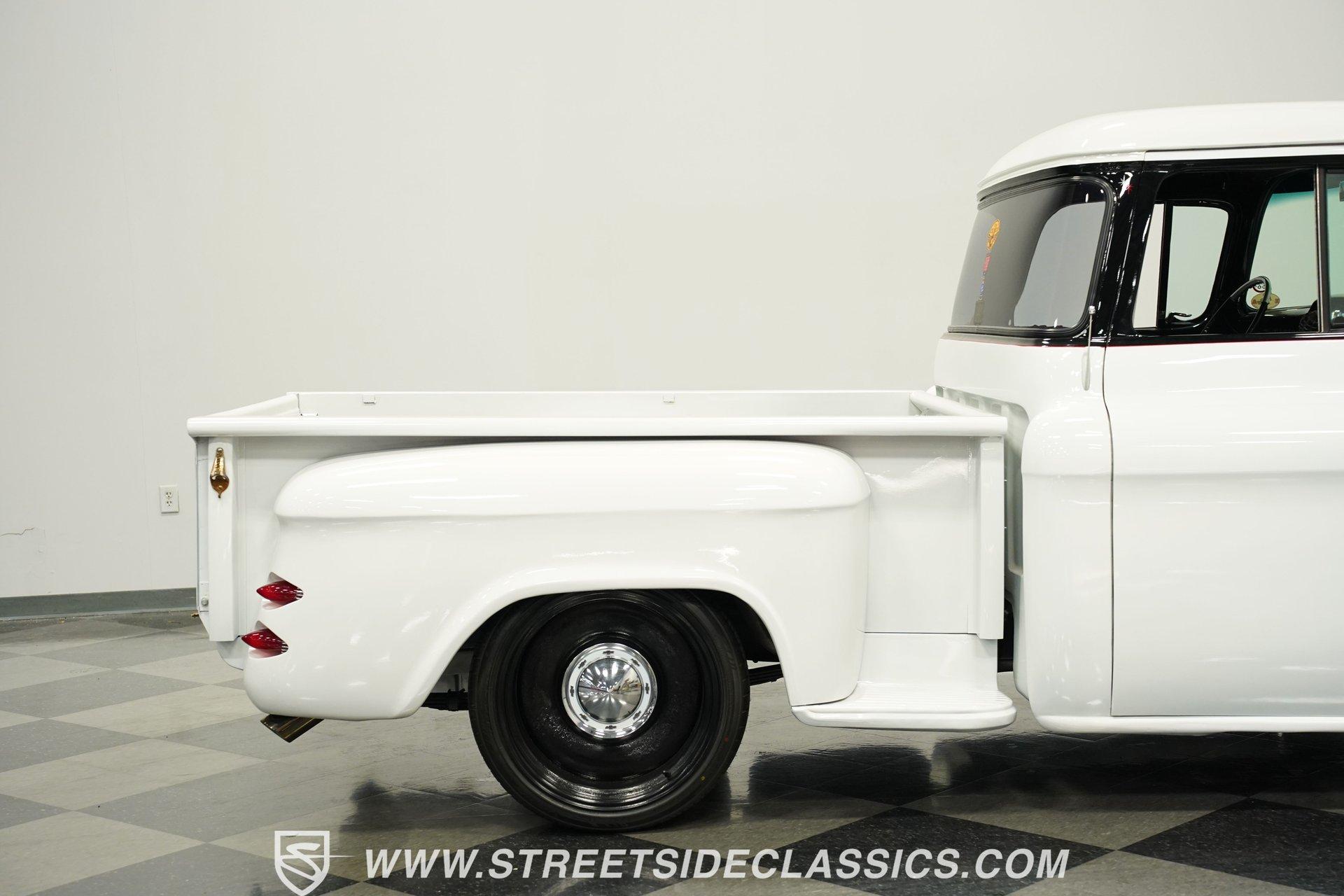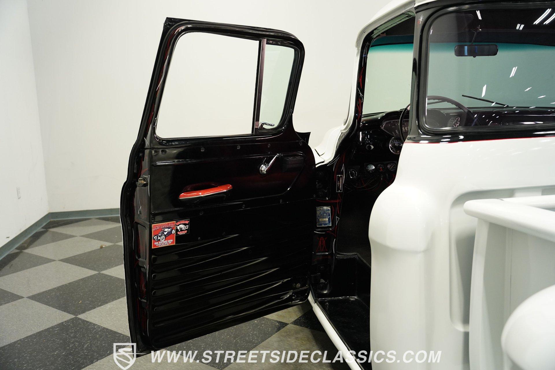 Cool custom short-bed trucks are always in style and make for big hits at car shows and cruises. This 1957 Chevrolet 3100 Big Back Window cruiser will turn heads no matter what event it shows up to. The crisp white paint job and pinstriping in the front and rear go perfectly with the black Detroit Steel wheels, painted white bumpers, chrome front grille, LED headlights, and the custom frenched rear taillights tucked into the rear fenders. The door handles are shaved along with the tailgate handle. The truck bed looks outstanding, just like the rest of the truck. And just in case you need to tow something, there is a trailer hitch under the rear bumper. The interior carries an original/custom vibe. The red bench seat sets off the mostly black cabin. The original Chevy gauge cluster is paired with a Mooneyes tachometer and three AutoMeter gauges: Fuel, Water Temp, and Oil Pressure. A Holley Sniper Fuel Injection Control unit sits to the right of the steering wheel, helping the driver keep a closer eye on engine activity. The door panels are in good shape, as are the dashboard and custom headliner. Door jambs, dashboard, and glove box all feature creative pinstriping designs. The custom steering wheel looks sharp, and the shifter lever topped with a grenade knob adds a unique touch. Altogether, it's a well-done classic look for the interior. Under the hood, the pinstriping continues and only enhances the clean engine bay, which houses the Holley Sniper fuel-injected 350 cubic-inch V8 engine. This is paired with a reliable 700R4 4-speed automatic transmission that runs back to a later-model 10-bolt rear axle. For suspension, the Chevrolet gets a Camaro front subframe featuring A-arms with coil springs and shocks, while the rear uses leaf springs with air shocks. Gloss black Detroit Steel 20-inch wheels with chrome center caps sit at all four corners-wheels are wrapped in 245/40R20 front tires and 275/35ZR20 rear tires. For stopping power, the truck features power front disc brakes and rear drum brakes. And for that great old-school sound, dual exhaust runs through Cherry Bomb-style resonators. Highlights: 350 Cubic-Inch V8 Holley Sniper Fuel Injection System-Controller Inside 700R4 4-Speed Automatic Transmission GM Later Model 10-Bolt Rear Axle Camaro Front Subframe With A-Arms, Coil Springs, And Shocks Rear Leaf Springs With Air Shocks 20-Inch Gloss Black Detroit Steel Wheels Front 245/40R20 Tires Dated 2022-Rear 275/35ZR20 Tires Dated 2024 Power Front Disc Brakes-Power Rear Drum Brakes Stock Style Exhaust Manifold, Dual Exhaust, Cherry Bomb Resonators (Mufflers) Shaved Door Handles With Shaved Tailgate Handle Hand-Laid Pinstriping Exterior/Interior/Engine Bay Power Steering LED Headlights Custom Headliner Custom Frenched Taillights Rubber Bedliner Heat Power Windows Custom Steering Wheel With Tilt Mooneyes Tachometer AutoMeter Gauges: Oil, Temp, Fuel This beautiful 1957 Chevrolet 3100 Big Back Window is the epitome of cool cruising. It looks good, it sounds good, and it's full of custom touches. In the end, anyone who owns it will enjoy every moment they spend around this custom build. If a simple cruiser is what you're looking for, look no further-Call Us Today!