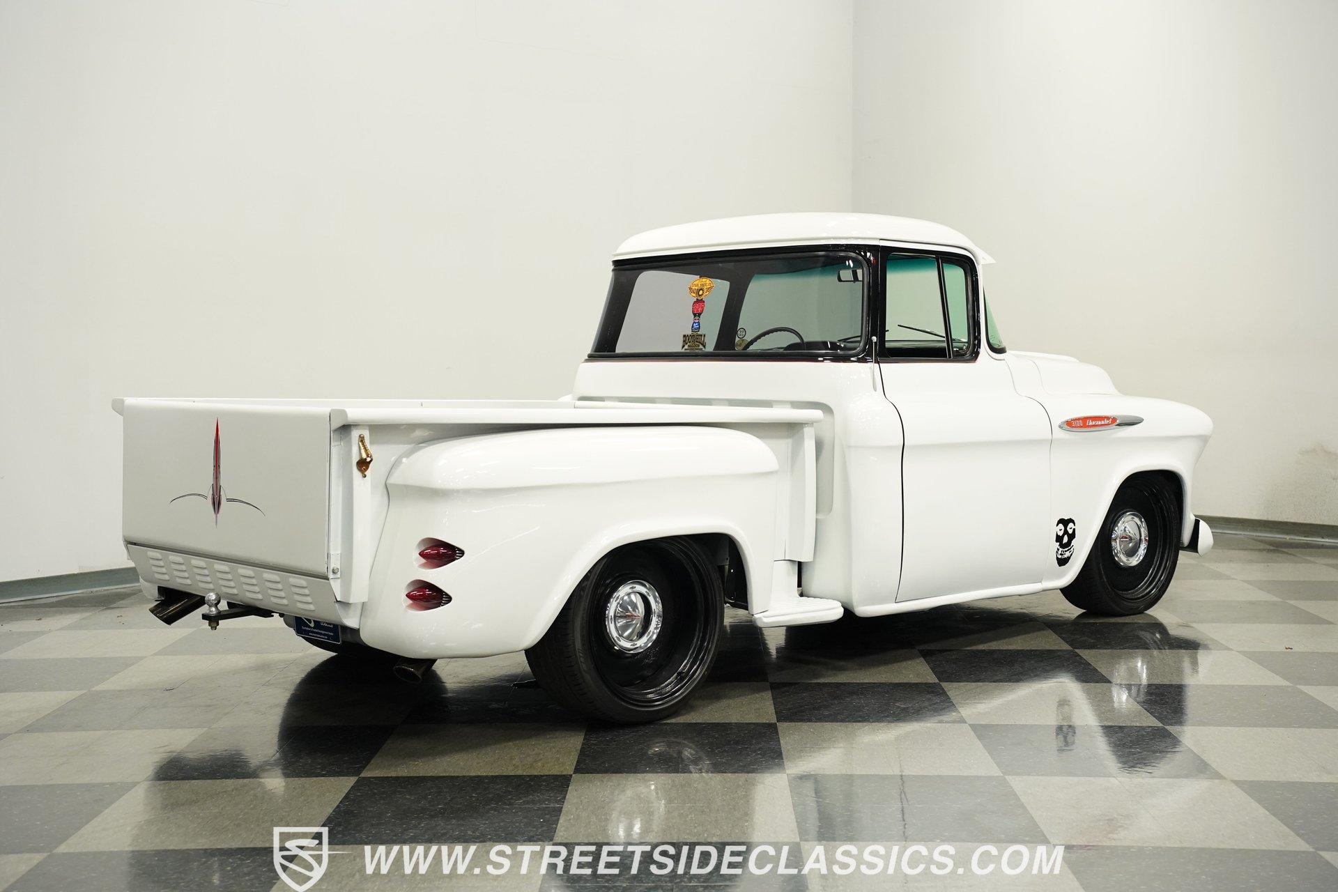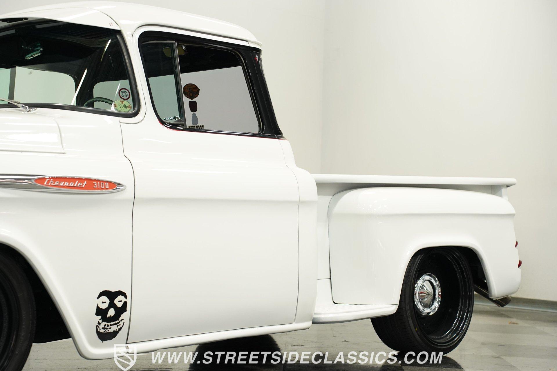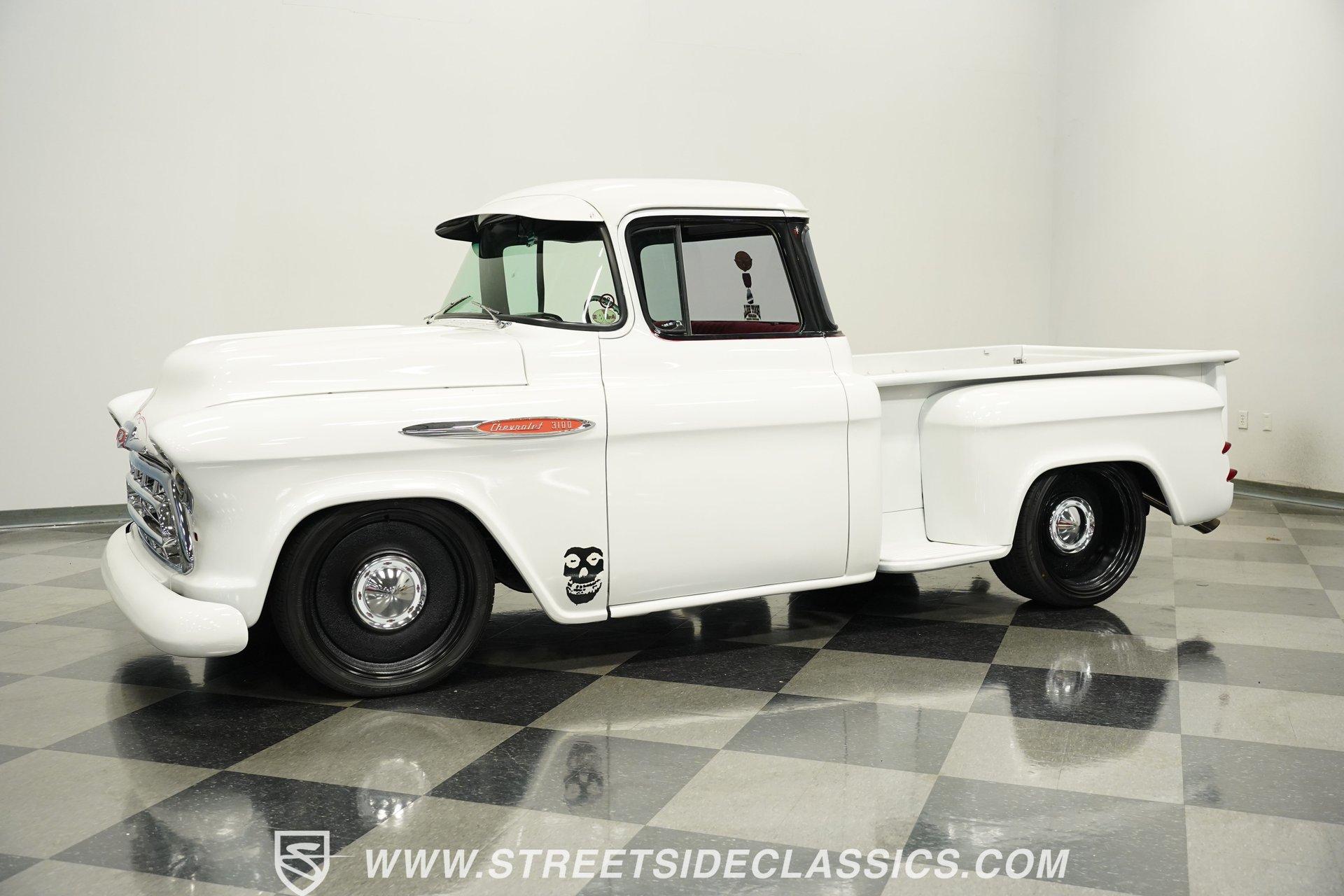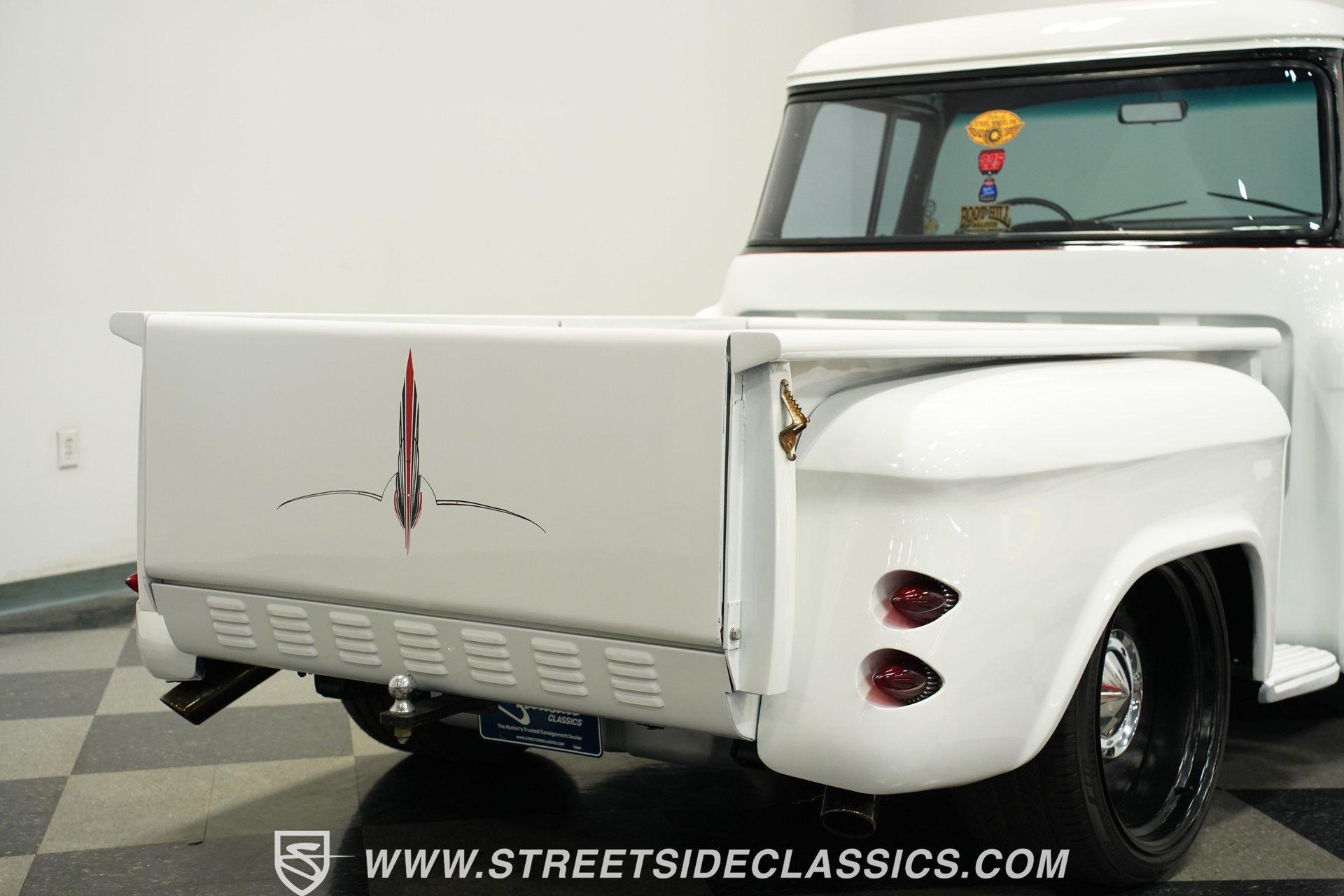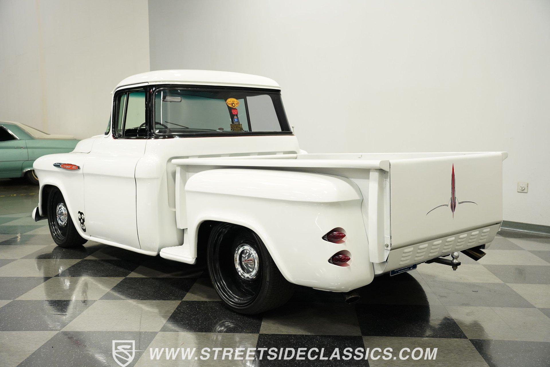 Cool custom short-bed trucks are always in style and make for big hits at car shows and cruises. This 1957 Chevrolet 3100 Big Back Window cruiser will turn heads no matter what event it shows up to. The crisp white paint job and pinstriping in the front and rear go perfectly with the black Detroit Steel wheels, painted white bumpers, chrome front grille, LED headlights, and the custom frenched rear taillights tucked into the rear fenders. The door handles are shaved along with the tailgate handle. The truck bed looks outstanding, just like the rest of the truck. And just in case you need to tow something, there is a trailer hitch under the rear bumper. The interior carries an original/custom vibe. The red bench seat sets off the mostly black cabin. The original Chevy gauge cluster is paired with a Mooneyes tachometer and three AutoMeter gauges: Fuel, Water Temp, and Oil Pressure. A Holley Sniper Fuel Injection Control unit sits to the right of the steering wheel, helping the driver keep a closer eye on engine activity. The door panels are in good shape, as are the dashboard and custom headliner. Door jambs, dashboard, and glove box all feature creative pinstriping designs. The custom steering wheel looks sharp, and the shifter lever topped with a grenade knob adds a unique touch. Altogether, it's a well-done classic look for the interior. Under the hood, the pinstriping continues and only enhances the clean engine bay, which houses the Holley Sniper fuel-injected 350 cubic-inch V8 engine. This is paired with a reliable 700R4 4-speed automatic transmission that runs back to a later-model 10-bolt rear axle. For suspension, the Chevrolet gets a Camaro front subframe featuring A-arms with coil springs and shocks, while the rear uses leaf springs with air shocks. Gloss black Detroit Steel 20-inch wheels with chrome center caps sit at all four corners-wheels are wrapped in 245/40R20 front tires and 275/35ZR20 rear tires. For stopping power, the truck features power front disc brakes and rear drum brakes. And for that great old-school sound, dual exhaust runs through Cherry Bomb-style resonators. Highlights: 350 Cubic-Inch V8 Holley Sniper Fuel Injection System-Controller Inside 700R4 4-Speed Automatic Transmission GM Later Model 10-Bolt Rear Axle Camaro Front Subframe With A-Arms, Coil Springs, And Shocks Rear Leaf Springs With Air Shocks 20-Inch Gloss Black Detroit Steel Wheels Front 245/40R20 Tires Dated 2022-Rear 275/35ZR20 Tires Dated 2024 Power Front Disc Brakes-Power Rear Drum Brakes Stock Style Exhaust Manifold, Dual Exhaust, Cherry Bomb Resonators (Mufflers) Shaved Door Handles With Shaved Tailgate Handle Hand-Laid Pinstriping Exterior/Interior/Engine Bay Power Steering LED Headlights Custom Headliner Custom Frenched Taillights Rubber Bedliner Heat Power Windows Custom Steering Wheel With Tilt Mooneyes Tachometer AutoMeter Gauges: Oil, Temp, Fuel This beautiful 1957 Chevrolet 3100 Big Back Window is the epitome of cool cruising. It looks good, it sounds good, and it's full of custom touches. In the end, anyone who owns it will enjoy every moment they spend around this custom build. If a simple cruiser is what you're looking for, look no further-Call Us Today!