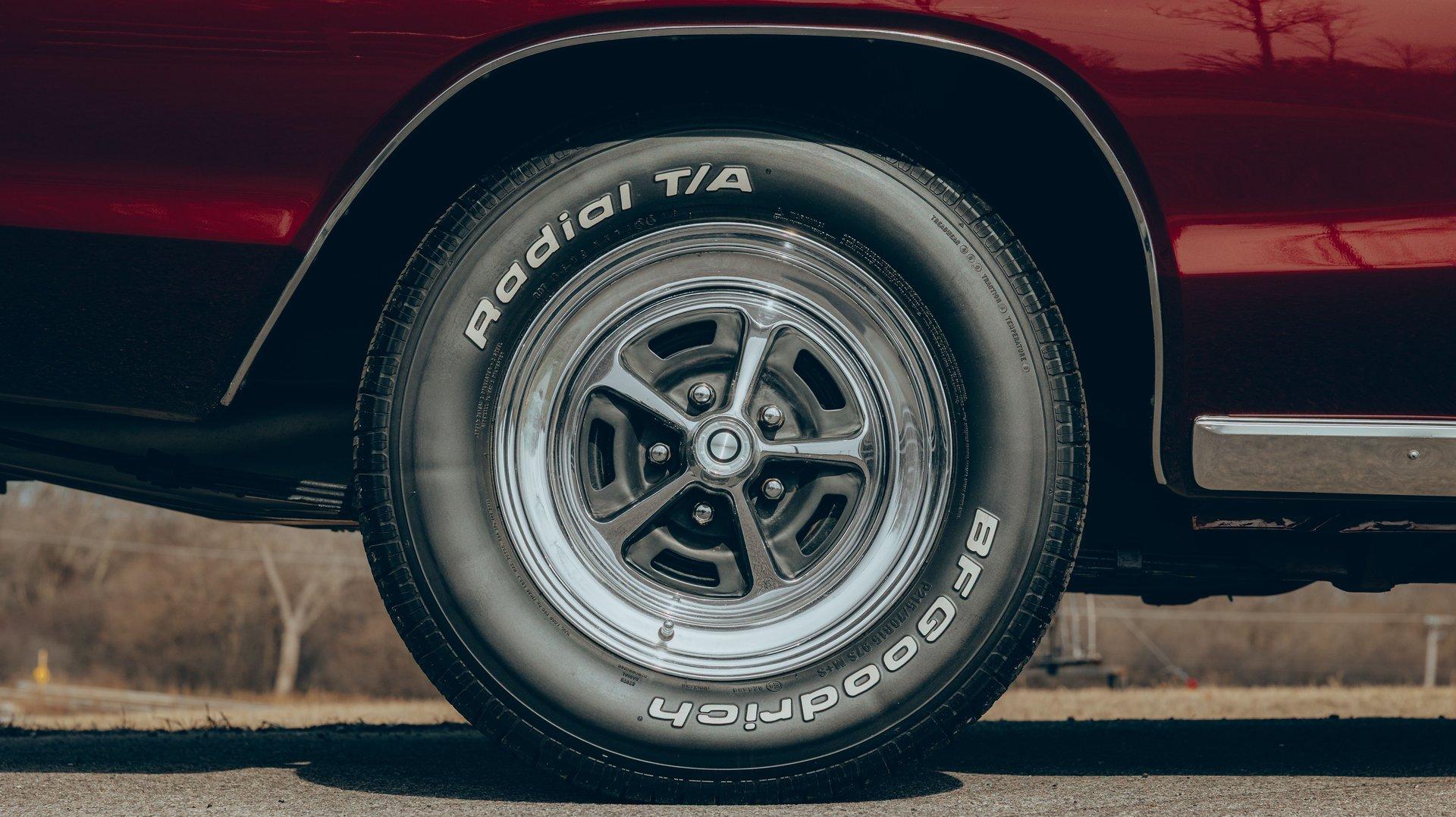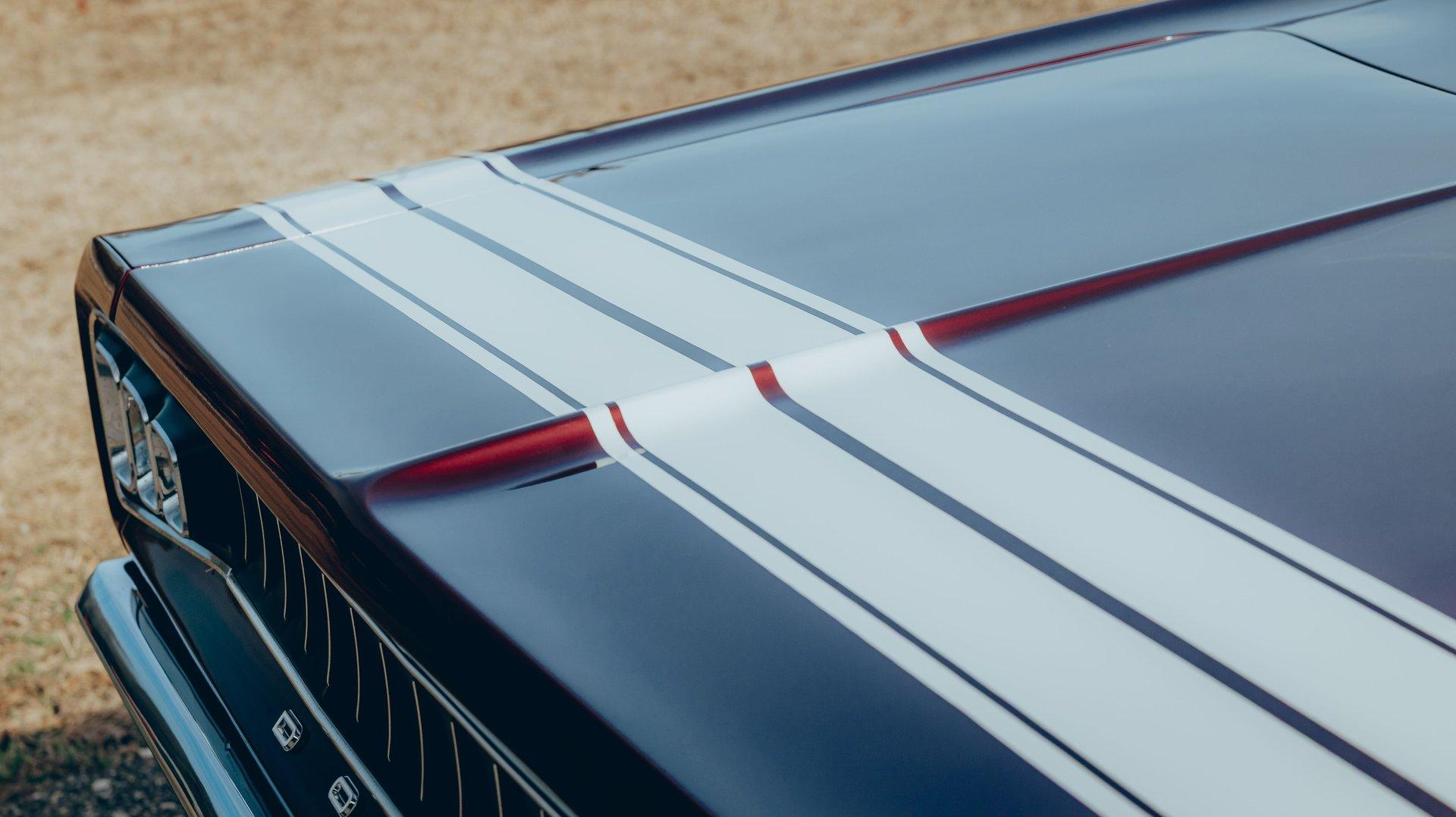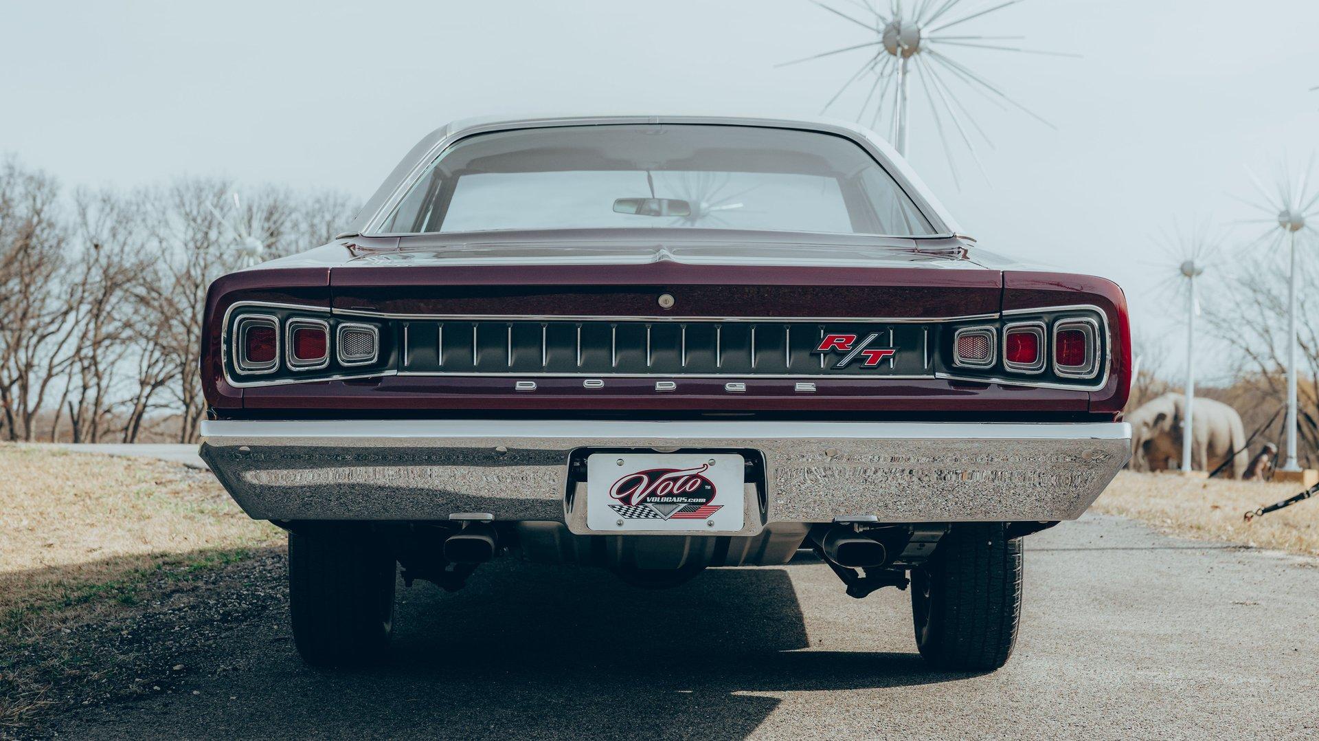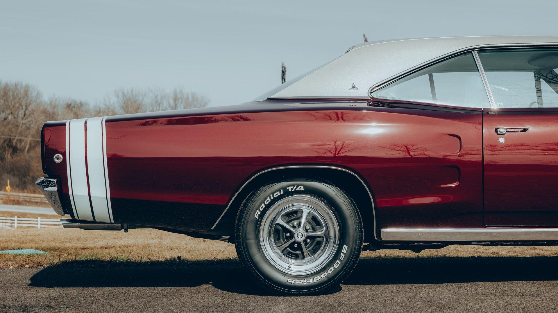 EXTERIOR: Ultra rare, highly desirable colors! The factory Burgundy paint has just enough metallic to make it shimmer. It is beautifully laid out and applied with great attention to detail. It also has a smooth and reflective finish. The rear bumblebee stripe is painted on and smooth to the touch. Looking down the side of the body it is straight as an arrow. The panels are well aligned with good gaps. The doors close easily with minimal effort. The Pearl White vinyl top is also a rare option, and in great condition. The hood bulge really looks tough. The blacked out front grille and headlights are in excellent shape. The blacked out tail panel with triple taillights is iconic. It has the correct R/T emblems. The chrome has a glorious shine. It's rolling on a set of 15” Magnum 500 wheels wrapped in BFGoodrich Radial T/A tires.