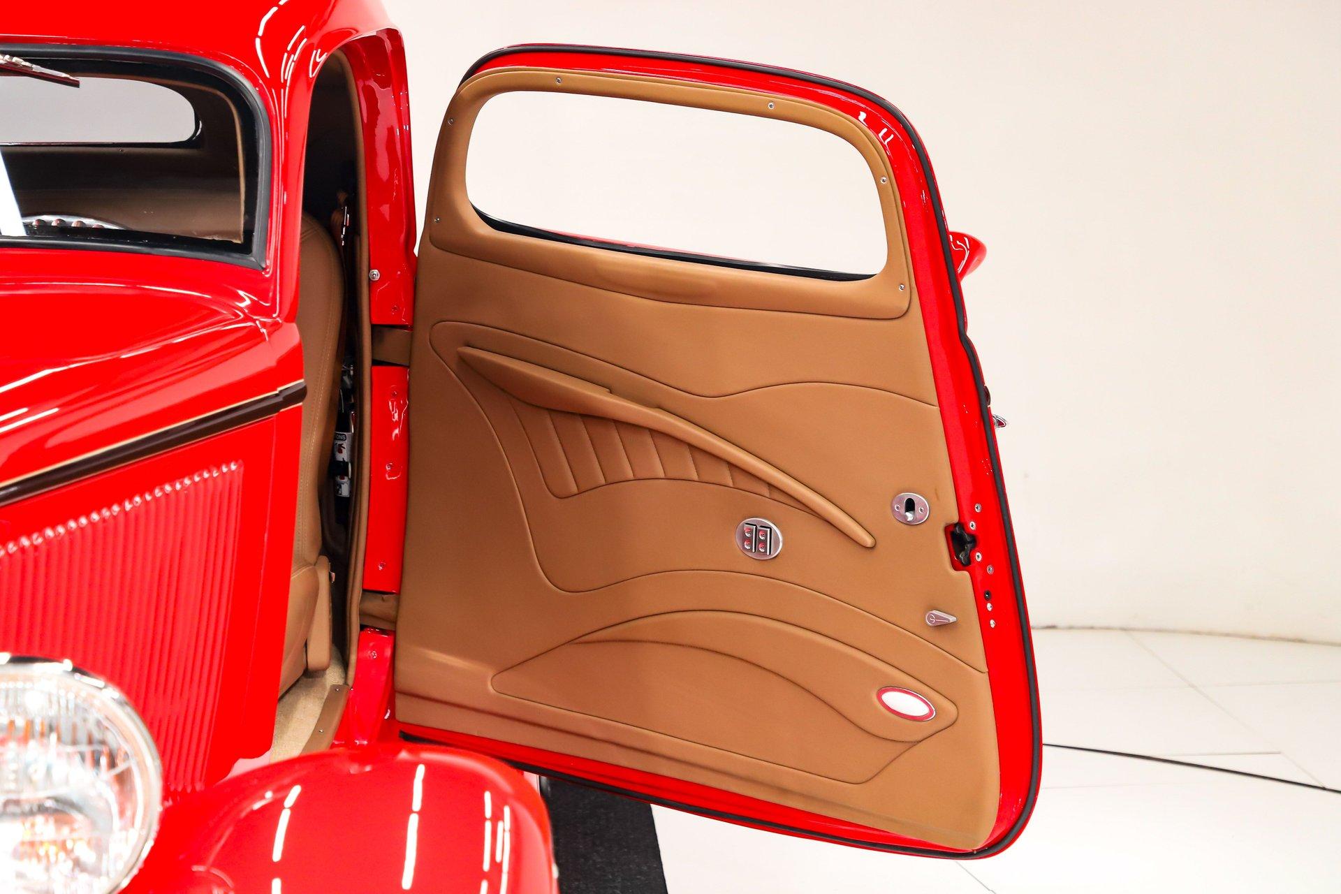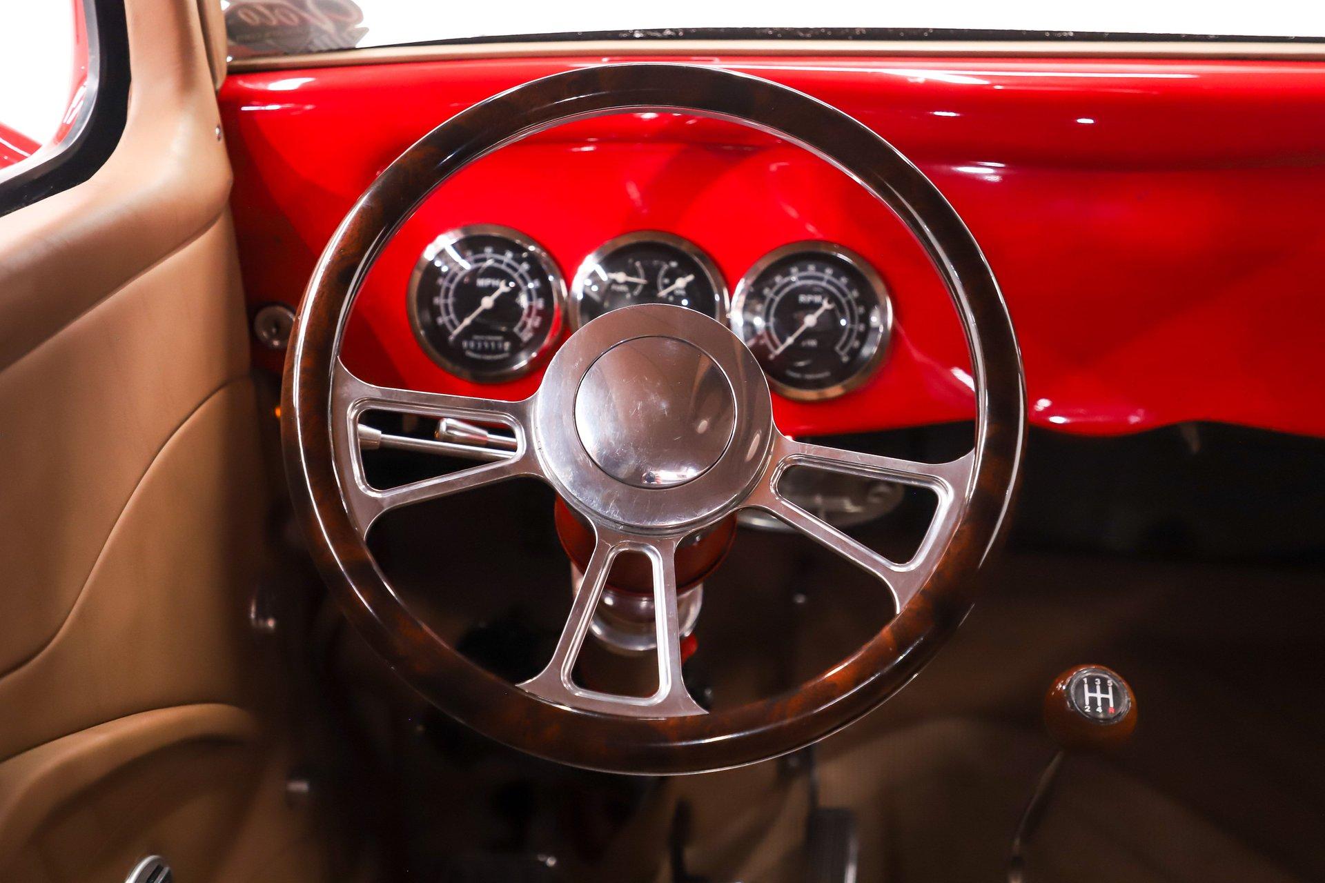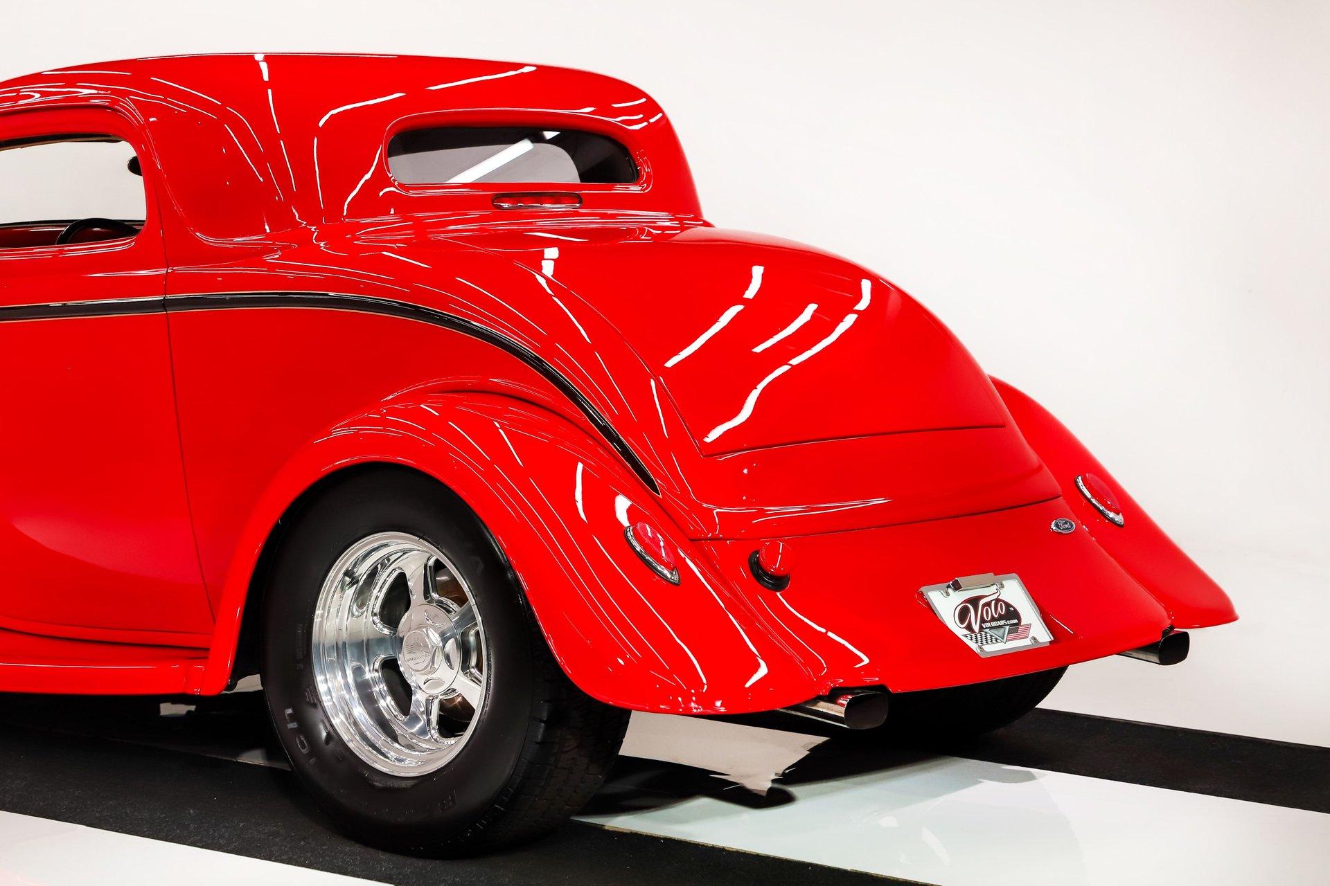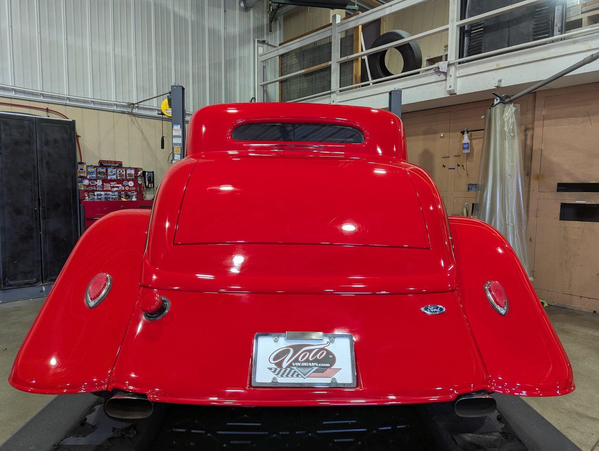 Celebrating our 65 year anniversary! This family owned and operated business was established in 1960, making us the oldest classic car dealership in America. Special thank you to all our customers for entrusting us to park the car of your dreams in your driveway while preserving automotive history for future generations to embrace and enjoy. -Grams family & Volo Museum staff INTRODUCTION: A Ford motor in a Ford with a 5-speed manual! Mostly you will find Chevy motors with an automatic trans. This is a quality build throughout. It incorporates the vintage charm with some modern enhancements making fun to look at and twice as fun to drive! EXTERIOR: Anyone else think of ZZ Top when they look at this car? Its a classic hot rod: ‘33 chopped three window coupe with suicide doors and full fenders. It's a very high quality fiberglass reproduction body that is absolutely straight and fits very nicely. The running boards have some custom curvatures and the hood is a metal three piece that can open from either side. The red paint is polished smooth and glossy. I like that it has original style door handles and original style big headlights. The headlights and lenses have Ford script on them, the turn signals are built in. The mirrors are updated and have built in turn signals too. In back is a set of teardrop LED tail lights and a third brake light below the rear window. It rolls on a really nice set of polished Billet Specialties wheels wrapped in BFGoodrich tires, of course much fatter in back for that hot rod look. INTERIOR: This is a first class interior! The entire inside is upholstered including under the dash and behind the seat. There is a lot of custom sculpture work on the door panels and headliner. It's a very comfortable Wise Guys power seat. Down on the floor it has premium Mercedes style square loop carpet with matching mats. It also has leather boots around the chrome e-brake and the Hurst 5-speed shifter. The dash is clean and simple dash,the controls are below out of site. A nice looking set of easy to read Classic Instrument gauges includes a tachometer and it's showing 3,500 miles since the build. The tilt column has a beautiful deluxe wheel. The stereo is overhead and the speakers are custom integrated into the rear panel. 3 point retractable seatbelts were installed. ENGINE COMPARTMENT: Yes, it has a Ford motor! It's a crate 351W making 365 HP with Roush heads, aluminum intake, a dual feed Holley Street Avenger 670 carb, Mallory Unilite ignition and a set of coated headers. It's dressed up in some very nicely custom painted valve covers and air cleaner. The front of the engine has a polished alternator and polished A/C compressor. The engine bay is a nice smooth red finish. TRUNK COMPARTMENT: The trunk compartment is done with the same amount of detail as the interior! A switch inside the car operates the power lift trunk. It's been boxed beautifully and upholstered. The floor has the premium carpet. Behind the panel you'll find the battery. UNDERSIDE: Powder coated chassis, the frame is boxed and has tubular supports. Up front it has a TCI independent suspension with tubular control arms, swaybar, coilover adjustable gas shocks, rack and pinion steering. In back is a four link system, also with coilover adjustable gas shocks. It has disc brakes at all four of the wheels and a working e-brake assembly. A very nicely bent exhaust system with Flowmaster mufflers and dumps was ceramic coated black. It goes all the way out the back with flared polished tips. It has a composite fuel tank from Tanks Inc, braided stainless fuel lines and an inline chrome filter. Looking up at the motor, it's clean and it has a high torque starter. A heavy duty scatter shield covers a Center Force hydraulic clutch and it has a crate 5-speed Richmond trans. The rebuilt 9 inch locker rear end was powder coated. It is very clean and proper under this one! SERVICE: We take pride in our cars and reputation. Therefore, we built a 2 million dollar, 10,000 square ft service center, and hired a team of technicians to service the essentials on every car we sell. CONCLUSION: This is a well built hot rod with class! For nearly 30 years, I, Jay Grams, have personally written the highlights for almost every car in our collection. What I provide is my professional opinion based on my experience with these vehicles. However, opinions can vary, and I strongly recommend a personal inspection to form your own view. Our sales team is always available to answer any questions you may have. One great option is to request a personalized walk-around video, where we can showcase the car and share our team’s insights. **Our cars are displayed within a museum setting. If you are interested in a specific vehicle, please schedule an appointment with a salesperson to view it. Without an appointment, there is an admission fee to enter the showroom. If you decide to purchase a car, your admission will be refunded, and you'll receive a one-year museum membership. ☎️ 815 385 3644 9-5 central ? Sales@volocars.com Answered ASAP Air conditioning Power steering 4 wheel disc Posi rear Power windows Power seat Power trunk lift Seat belts Tilt wheel Polished wheels