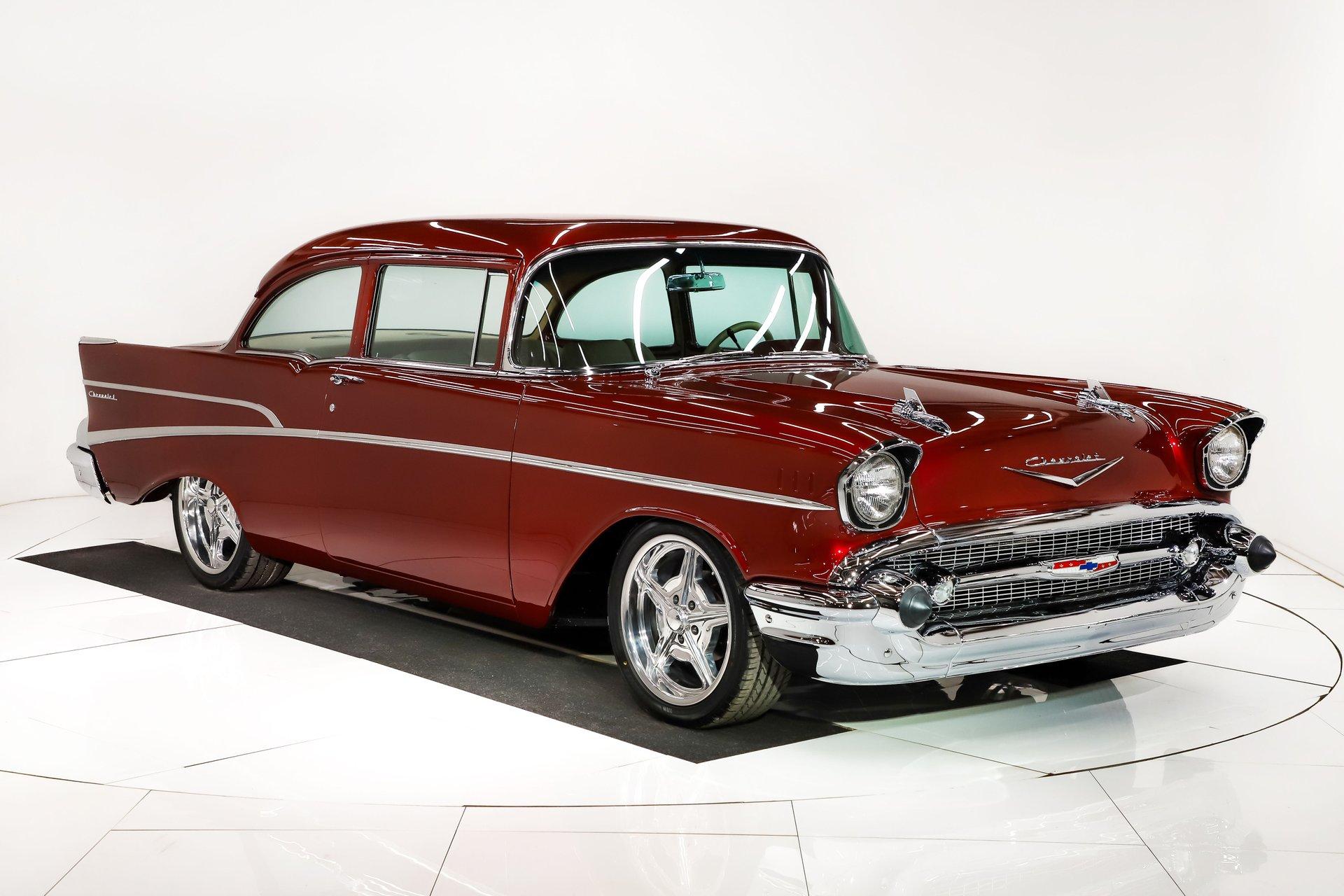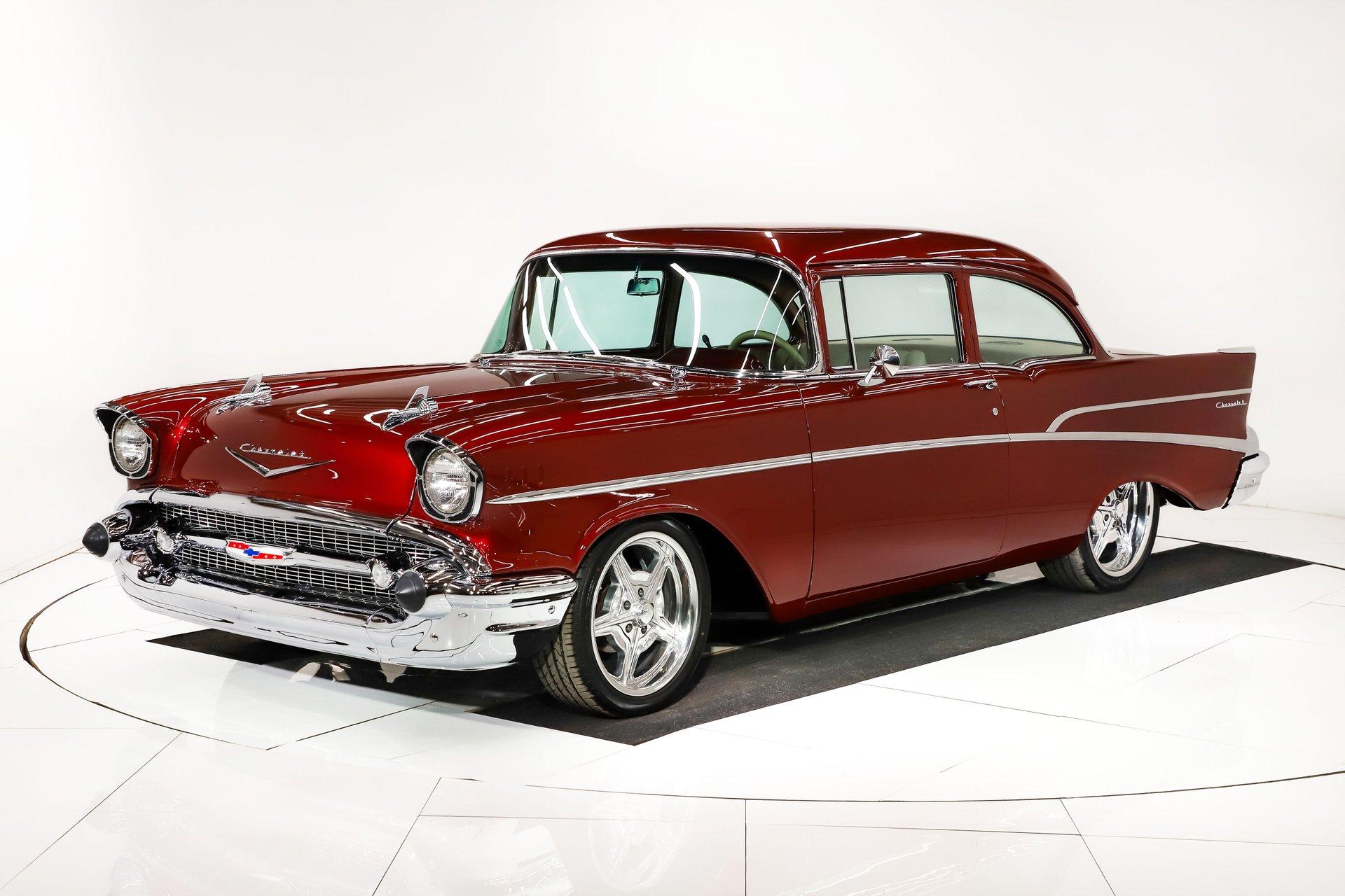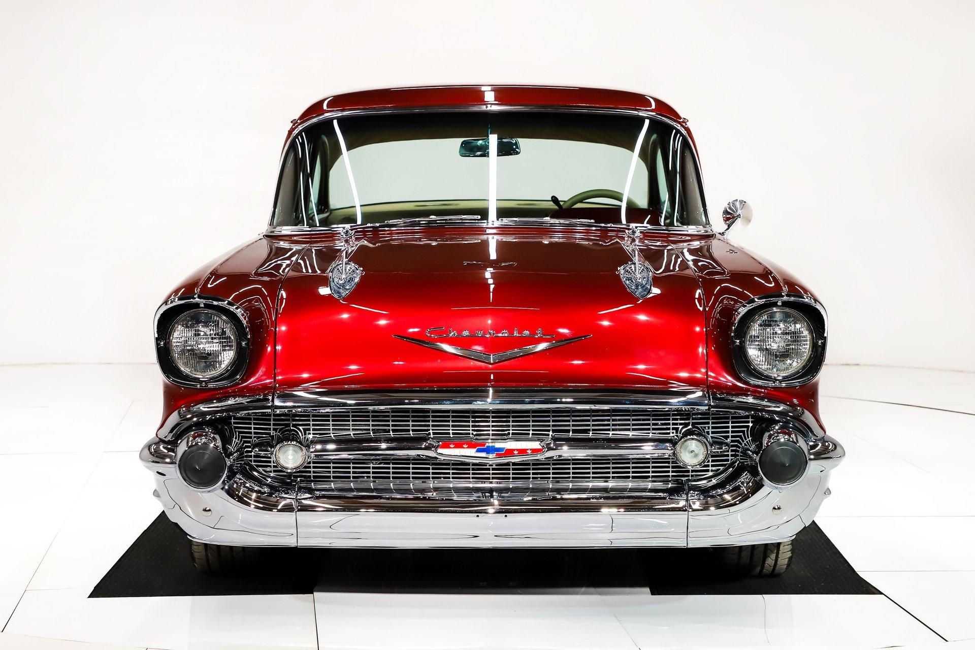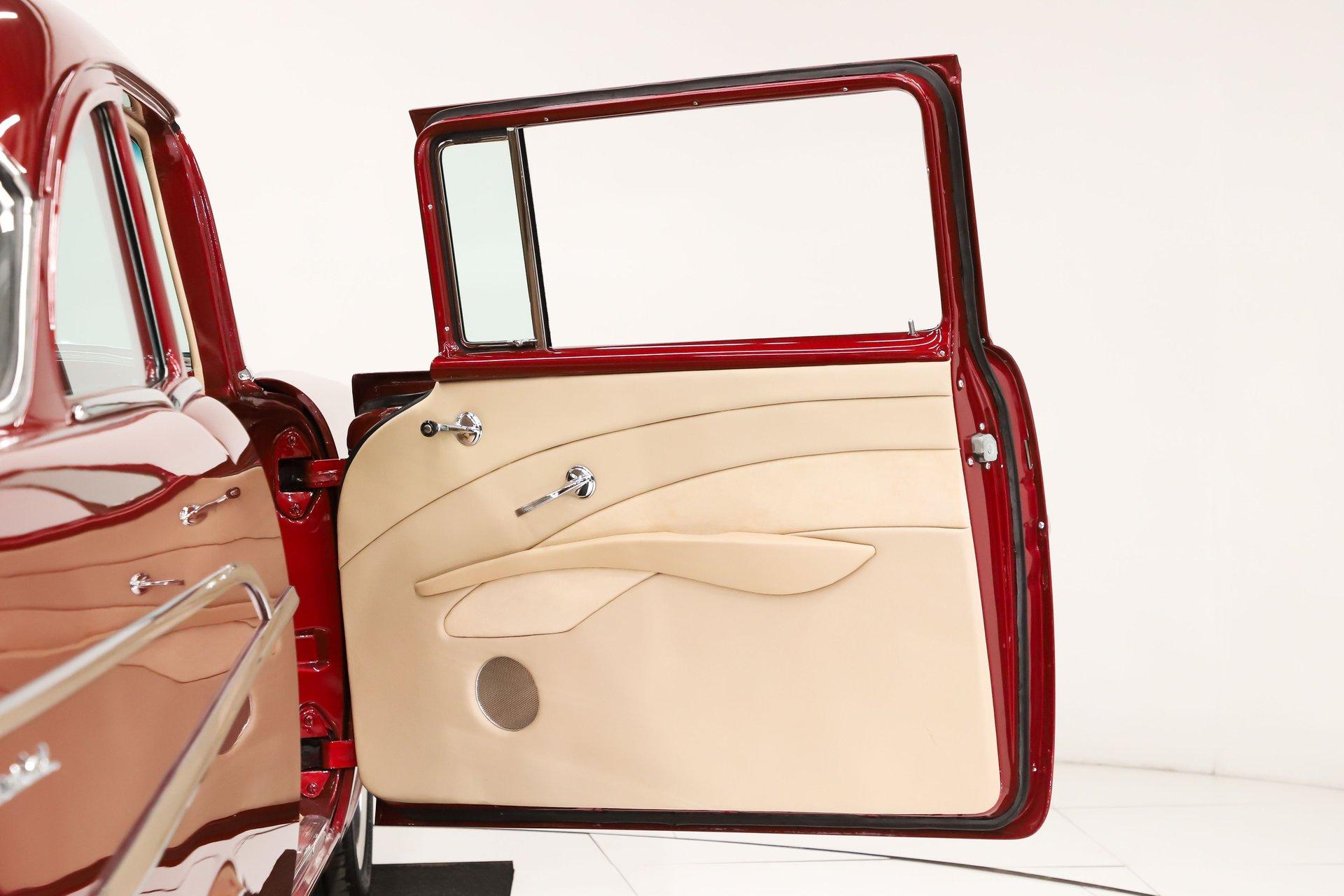 First class ride! The fit and finishes are highlighted by the colors and stance. Of course, it has everything to make it a comfortable cruiser too. EXTERIOR: This is the biggest reason I bought this car, the laser straight body! Really, I fell in love with the body, the panels fit precisely. I nerded out when the doors clicked shut just by letting go. The Patriot Red Pearl color is gorgeous and it has a wet, glossy finish. All the chrome, trim and weatherstrips have been replaced. All the glass was replaced too. It was just treated to a new a new set of Billet Specialties wheels and performance tires, 18s in front, 20s in back and extra wide. INTERIOR: A perfect complement to the exterior: a very classy light tan leather and Alcantara upholstery. The door panels are sculpted real nice and have speakers integrated in them. The bucket seats have great bolsters and recline. You will be looking at a dash painted as slick as the body. The heater controls are updated to electric slides, it has a retro stereo in the factory hole and the shift indicator is updated for the overdrive. A lower panel was fabricated for the a/c vents. A custom console was also fabricated which gives some storage space and holds the power window switches. The rear shelf is custom with 6x9 speakers. Down on the floor is custom carpet and mats. Above is an Alcantara headliner. It's beautiful and comfortable in here! ENGINE COMPARTMENT: This has a GM crate Ram Jet 350 which was a special motor with a fuel injection that looked right out of the 60s with modern technology. It makes 351 hp, there no reliability like a GM crate motor! The front of it has a serpentine belt system with polished components. It has air conditioning, a modern power steering and power brakes. Out in front is a list of polished components that look great. It also has a trans cooler and a power steering color hidden behind the grill. The metal surfaces are painted slick finishing off this beautiful compartment! TRUNK COMPARTMENT: It has been completely boxed and custom upholstered to match the interior. Even under the trunk lid is upholstered in Alcantara. There is light stain in the carpet floor. UNDERSIDE: Body off frame restored in 2010. The frame is smooth and powder coated black. The steering and suspension were completely rebuilt, swaybars front and back were installed. The brake system was completely new and upgraded with disc at all four wheels, it has a custom e-brake. The fuel tank is polished like chrome. The exhaust has a crossover pipe and Flowmaster mufflers. Bottom of the motor is clean, has a high torque starter and chrome flywheel cover. The trans was upgraded with a TCI 700R-4 overdrive automatic with an aluminum pan. The rebuilt driveshaft leads back to a new 9 inch rear with back brace and posi gears. The floors under this car are so clean they are painted like the body. SERVICE: We inspected this car closely and installed working reverse lights, serviced the air conditioning, adjusted the shift indicator, tightened steering wheel, fixed turn signals, horns, and dash lights. We calibrated the speedometer, installed swaybar link and replaced the rear rotors. Yes, it is gorgeous, and you won't be able to handle the compliments. It was really meant to be driven. The motor, trans and rear were new for the maximum reliability. This was a meticulously built ‘57! For nearly 30 years, I, Jay Grams, have personally written the highlights for almost every car in our collection. What I provide is my professional opinion based on my experience with these vehicles. However, opinions can vary, and I strongly recommend a personal inspection to form your own view. Our sales team is always available to answer any questions you may have. One great option is to request a personalized walk-around video, where we can showcase the car and share our team’s insights. **Our cars are displayed within a museum setting. If you are interested in a specific vehicle, please schedule an appointment with a salesperson to view it. Without an appointment, there is an admission fee to enter the showroom. If you decide to purchase a car, your admission will be refunded, and you'll receive a one-year museum membership. 815 385 3644 9-5 central Sales@volocars.com Answered ASAP Ramjet injection Air conditioning Power steering Power brakes 4 wheel disc Posi rear Leather upholstery Power windows Bucket seats Console Stereo system