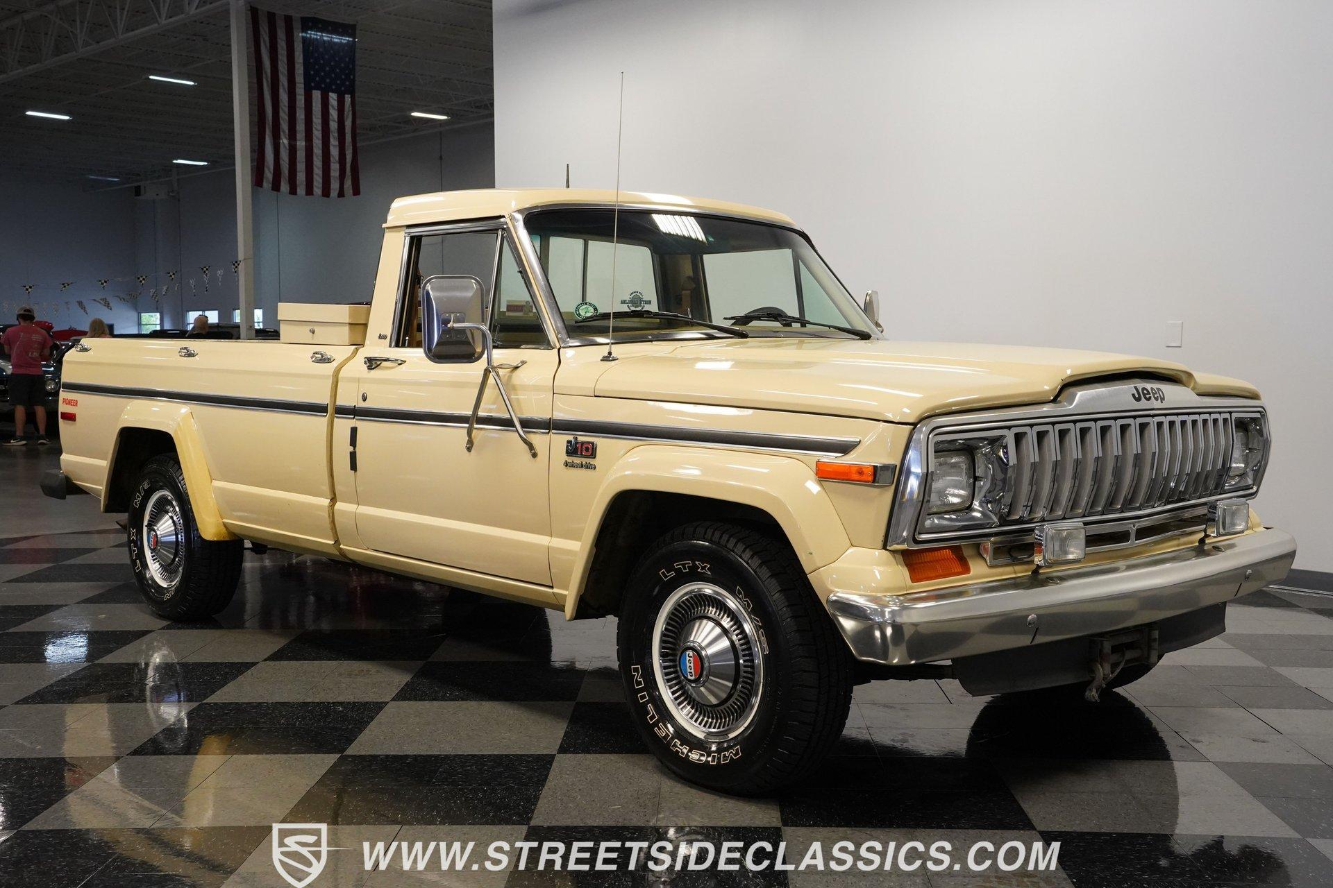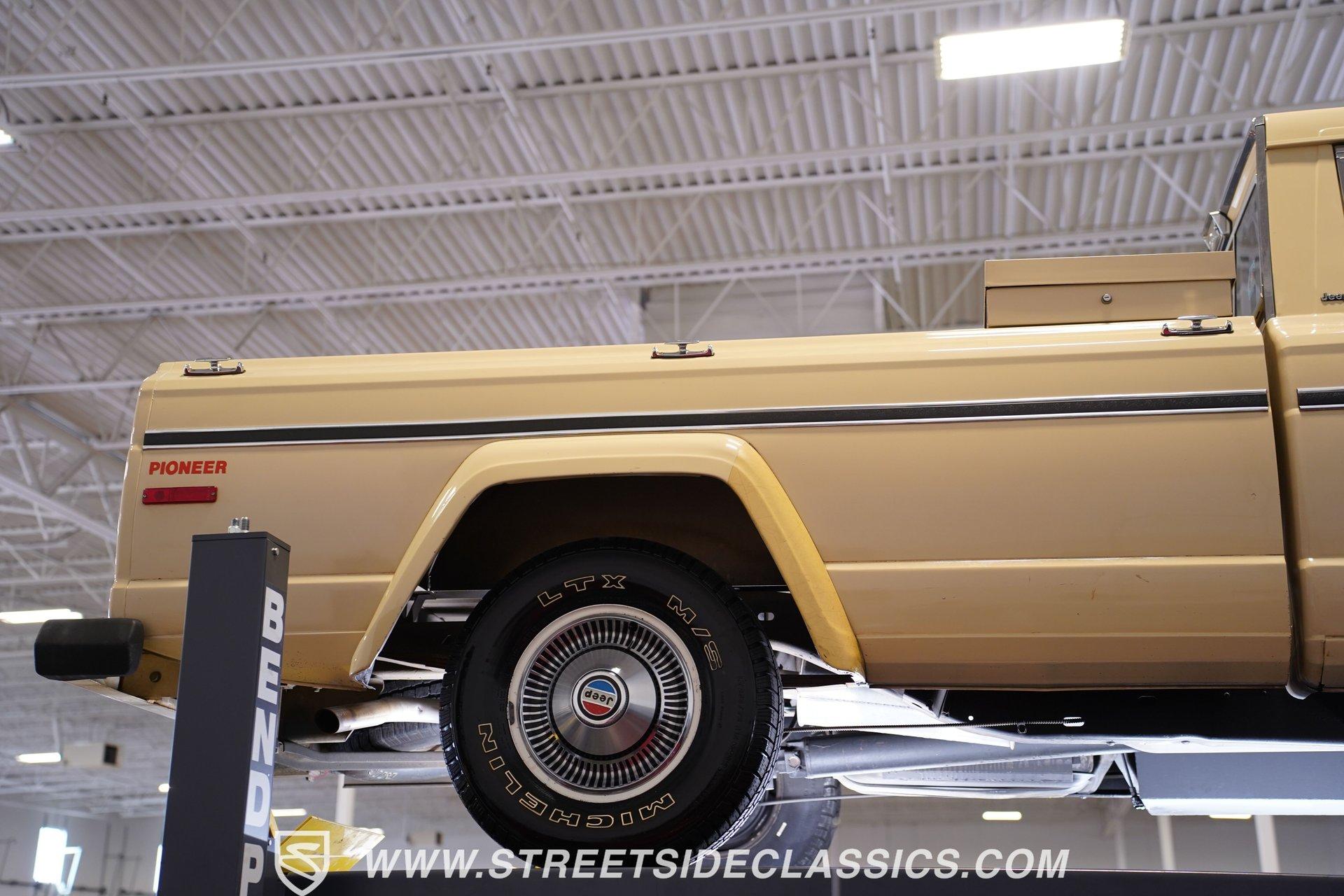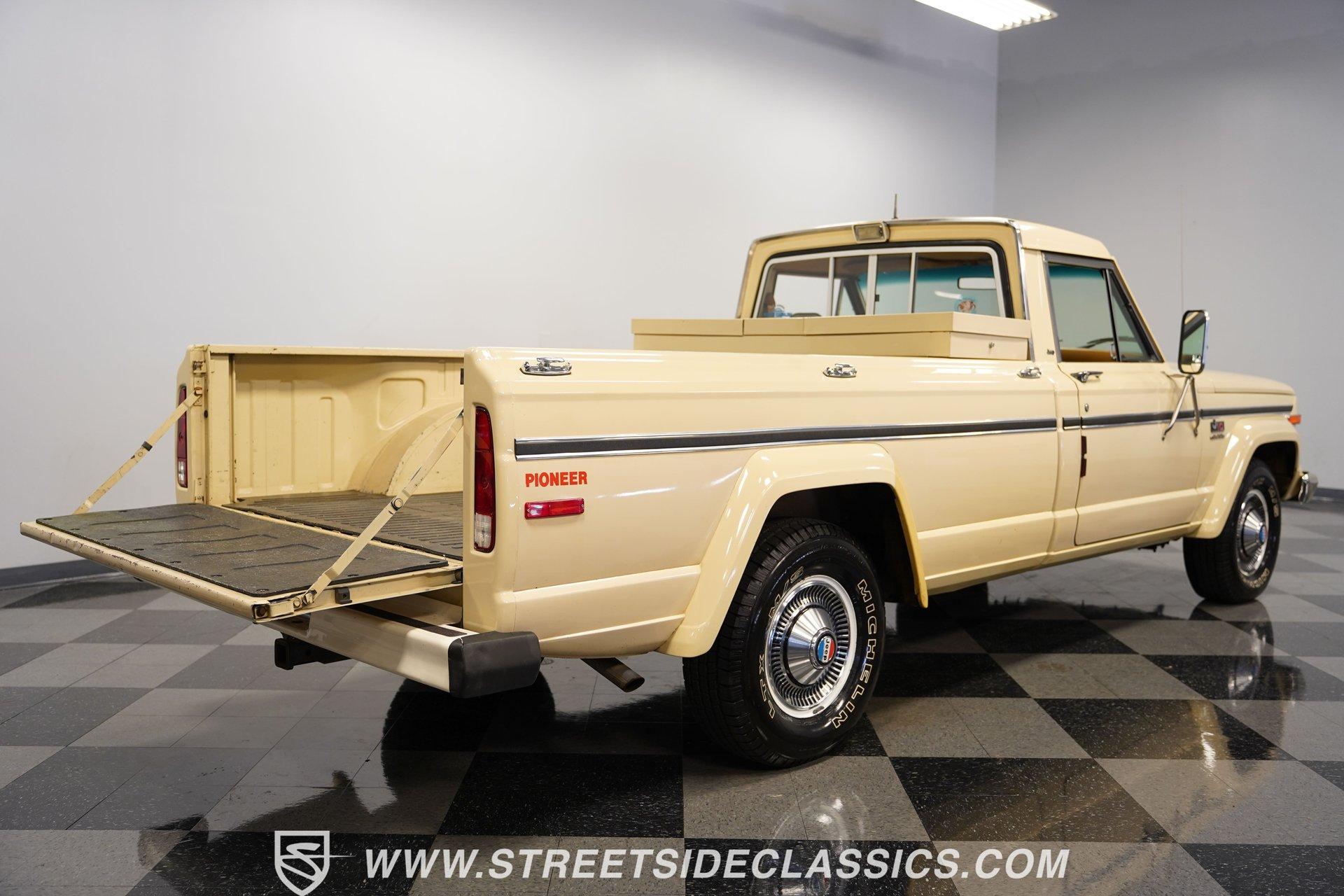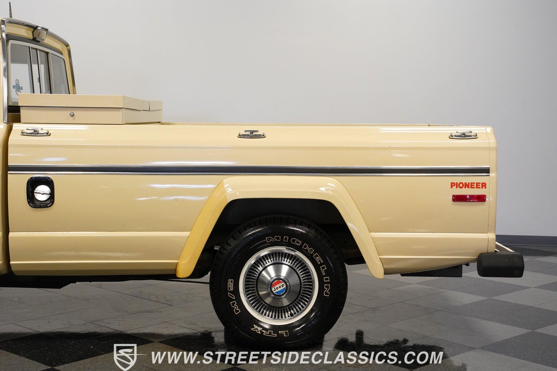 Here's a Jeep truck long-bed you won't see very often. This 1985 Jeep J10 Pioneer 4x4 is in great shape with an Almond Beige paint. The body panels are straight, the gaps are consistent, the glass and weather stripping are in good condition, and both doors shut properly. The chrome front bumper shines nicely, complemented by a stock-appealing grille that houses what appears to be newer headlights and fog lamps. The rear bumper is in good shape, and the tailgate features painted "JEEP" letters. The truck bed includes a rubber floor mat for protection and a front-mounted toolbox for storage. Inside, the interior has been refreshed, and the base color is mostly Tan. The seats, door panels, headliner, and carpet are all very clean. The steering wheel and gauge cluster appear original, as do the climate controls and other knobs and switches. Equipped with a factory under-dash mounted air conditioner. The AM/FM/Cassette radio in the dash appears to be original. For an older truck, this interior is clean, functional, and well-preserved. The engine bay looks stock and presents itself well. It houses a 360 cubic-inch V8 paired with a 727 Torqueflite automatic transmission. A Dana 44 front differential engages when four-wheel drive is used, while the AMC 20 rear differential solely handles the power when in two-wheel drive. Both front and rear axles are connected to factory style leaf spring suspension. Bolted on all four corners are 15-inch wheels with Jeep hubcaps, wrapped in LT235/75R15 tires. Highlights: 360 Cubic-Inch V8 727 Torqueflite Automatic Transmission A Second Auxiliary Fuel Tank Jasper Transfer Case 15-inch Wheels With Jeep Hubcaps Front And Rear LT235/75R15 Tires Power Front Disc Brakes Stock Style Exhaust Built-In Toolbox in Truck Bed Trailer Hitch Radio With AM/FM/Cassette Cruise Control Heat And Defrost Tilt Steering Wheel Owner's Manual This 1985 Jeep J10 Pioneer 4x4 can cruise, handle hard work, and shine at your local car show. It drives well, has a solid body/frame, a great paint job, and very clean interior. If you're an old-school Jeep enthusiast, you'll appreciate this Jeep's work ethic and simplicity. Call Today!