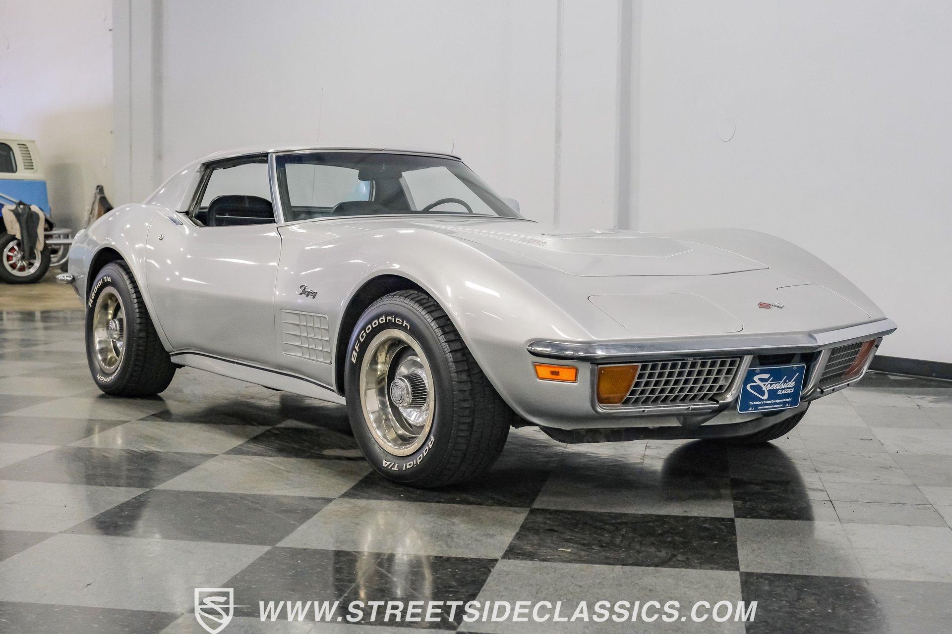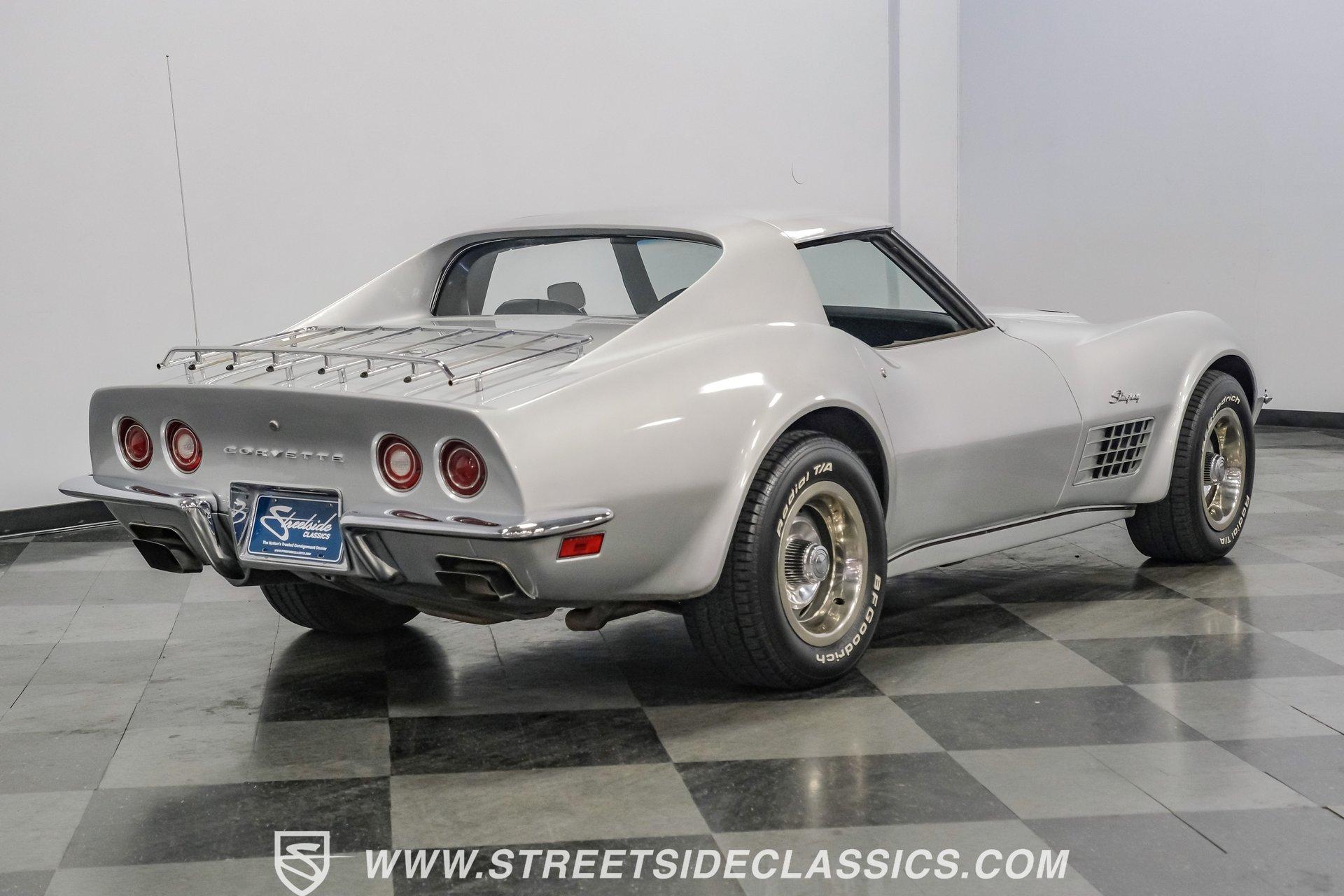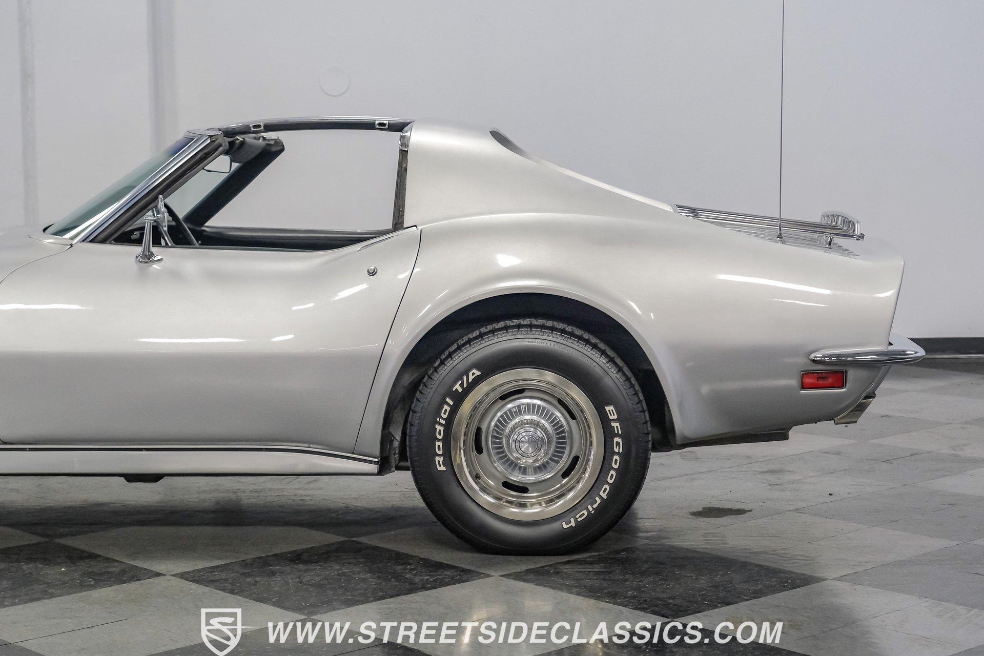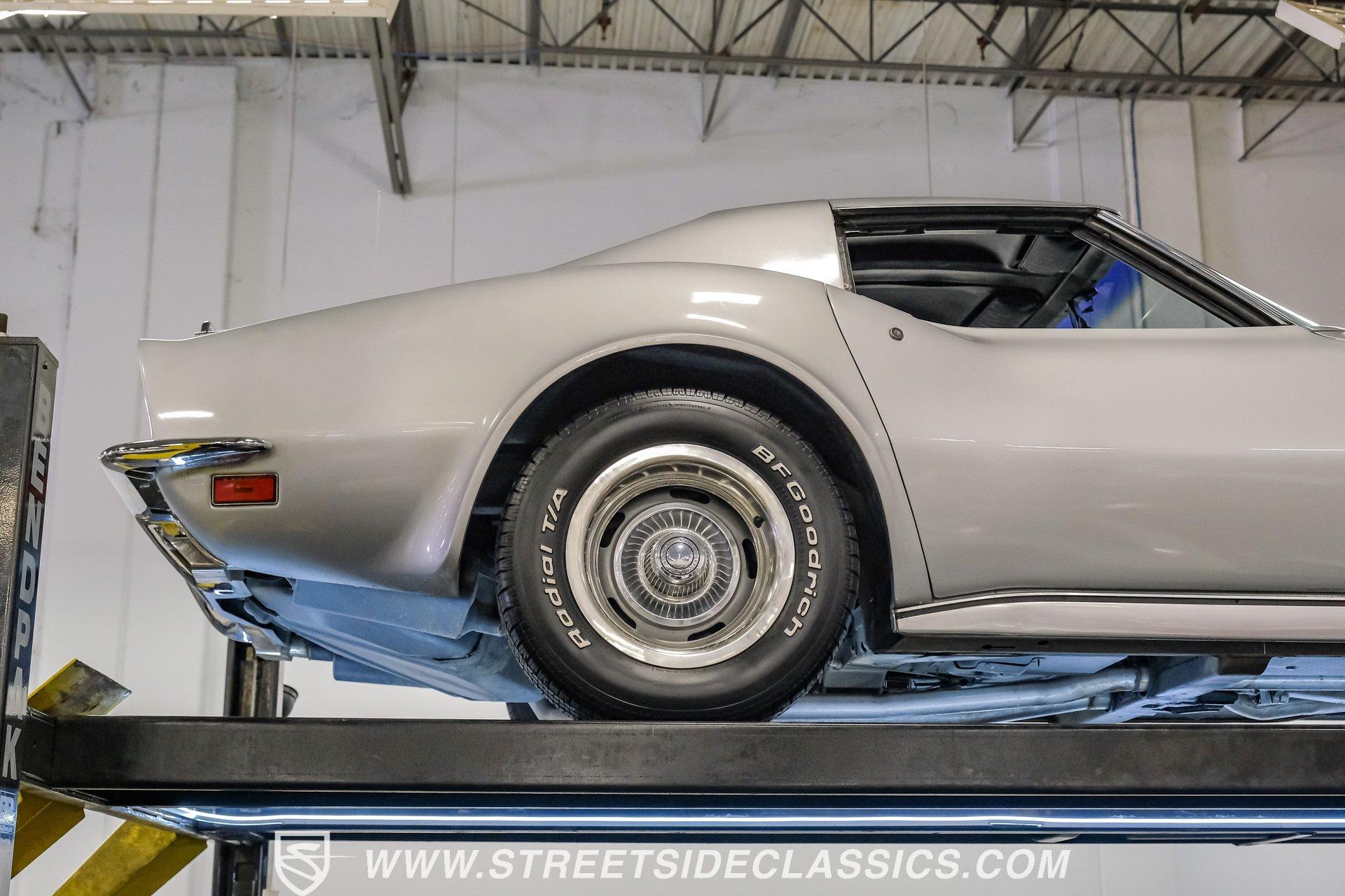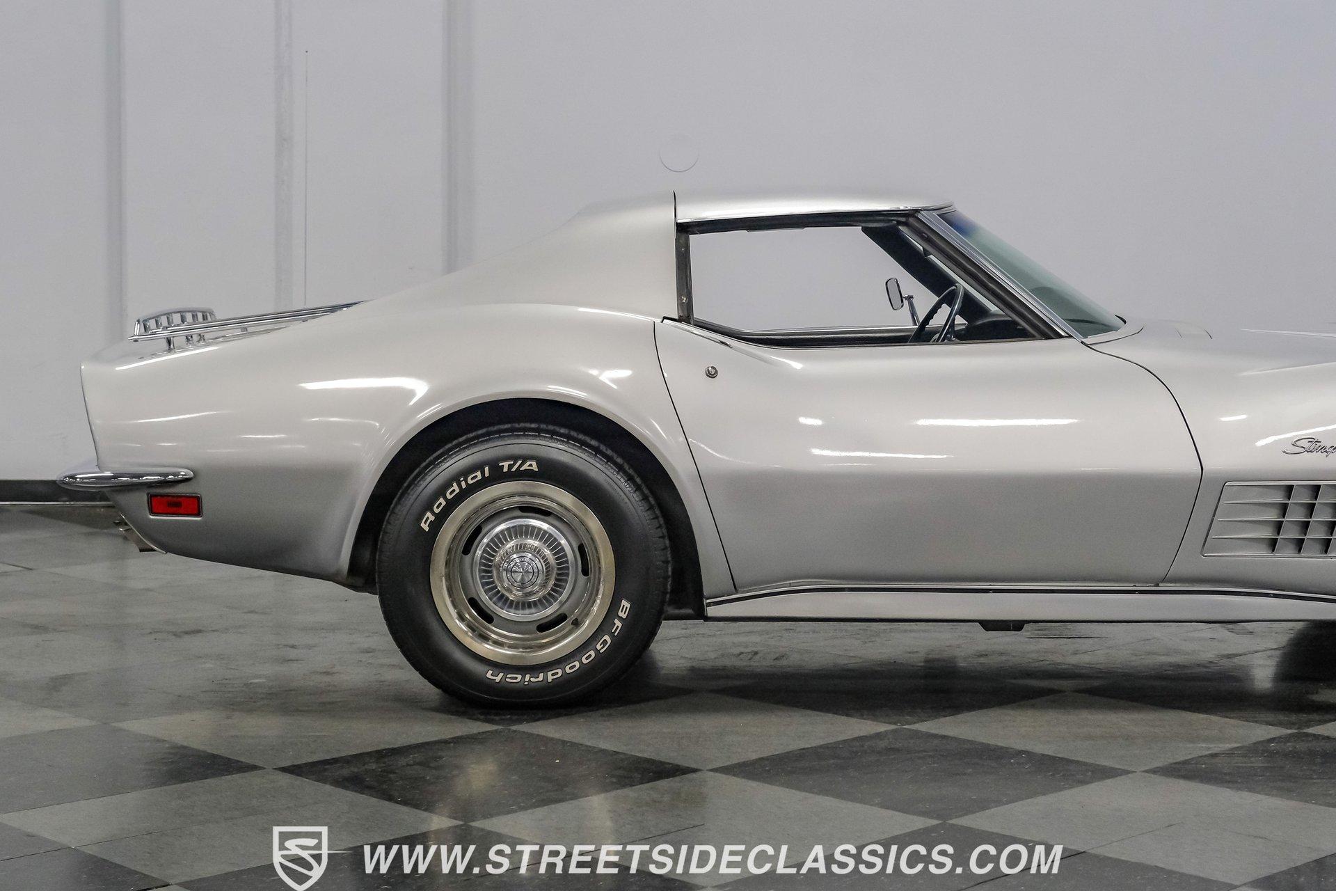 The second generation of Chevy's Corvette has quietly been gaining popularity among collectors over the last several years. One look at this 1972 Chevrolet Corvette LT1 383 and it's easy to see why. Fully repainted in a shimmering silver, this C2 features a useful rear luggage rack, complementing its signature T-Tops and sinewy Coke-bottle shape. Inside, we find a stock and correct appearing black leather interior. A center console separates a pair of bucket seats, while a three-spoke, power-assisted steering wheel sits ahead of a large 160 mph speedometer and 7,000 rpm tachometer. A quintet of auxiliary gauges sits above a retro-styled AM/FM/AUX/Bluetooth head unit, while simple wheel-controlled HVAC controls and a shift pattern diagram sit near the well-placed shifter. Although it came from the factory with an LT1, this Corvette benefits from an even more potent 383 cubic-inch BluePrint Engines stroker crate V-8 engine. This potent small block comes with lightweight aluminum heads, a mild performance cam, and a single Holley four-barrel carburetor. A true dual exhaust system feeds into a set of sweet-sounding FlowMaster mufflers, and with approximately 300 miles on it since installation, this engine has barely been broken in. Power is routed through a tried-and-true four-speed manual transmission, also with approximately 300 miles on its newly installed clutch. HIGHLIGHTS: Full Silver Repaint T-Tops Luggage Rack BluePrint Engines Crate Motor 383 Stroker V8 Approx 300 Miles on Motor Aluminum Heads Performance Cam Holley Four Barrel Four Speed Manual New Clutch Dual Exhaust FlowMasters Black Leather Interior Power Windows Power Steering Tilt Wheel Four Wheel Power Disc Brakes Rallye Wheels BFG Tires Owner's Manual This 1972 Chevrolet Corvette LT1 383 rides on an independent front suspension with a transverse leaf-spring setup in the rear. Fifteen-inch Rallye wheels are wrapped in 245/60R-15 BFG tires, with power disc brakes hiding behind at all four corners, ready to scrub off speed whenever called upon. This well-done C2 is a prime example of how good this generation can look and drive with only a couple of carefully selected upgrades. If you are one of the millions who adore the second generation of the Corvette, this is the car you've been waiting for. Don't wait, call today!