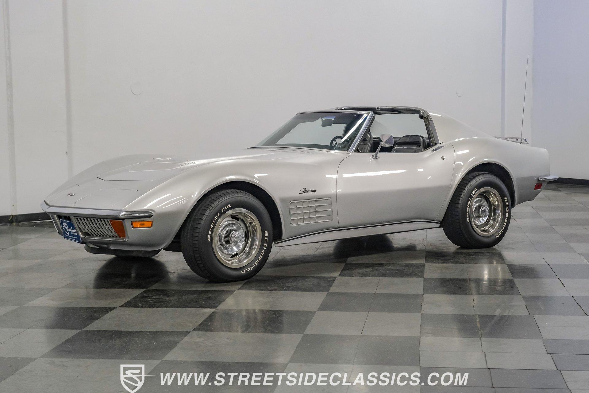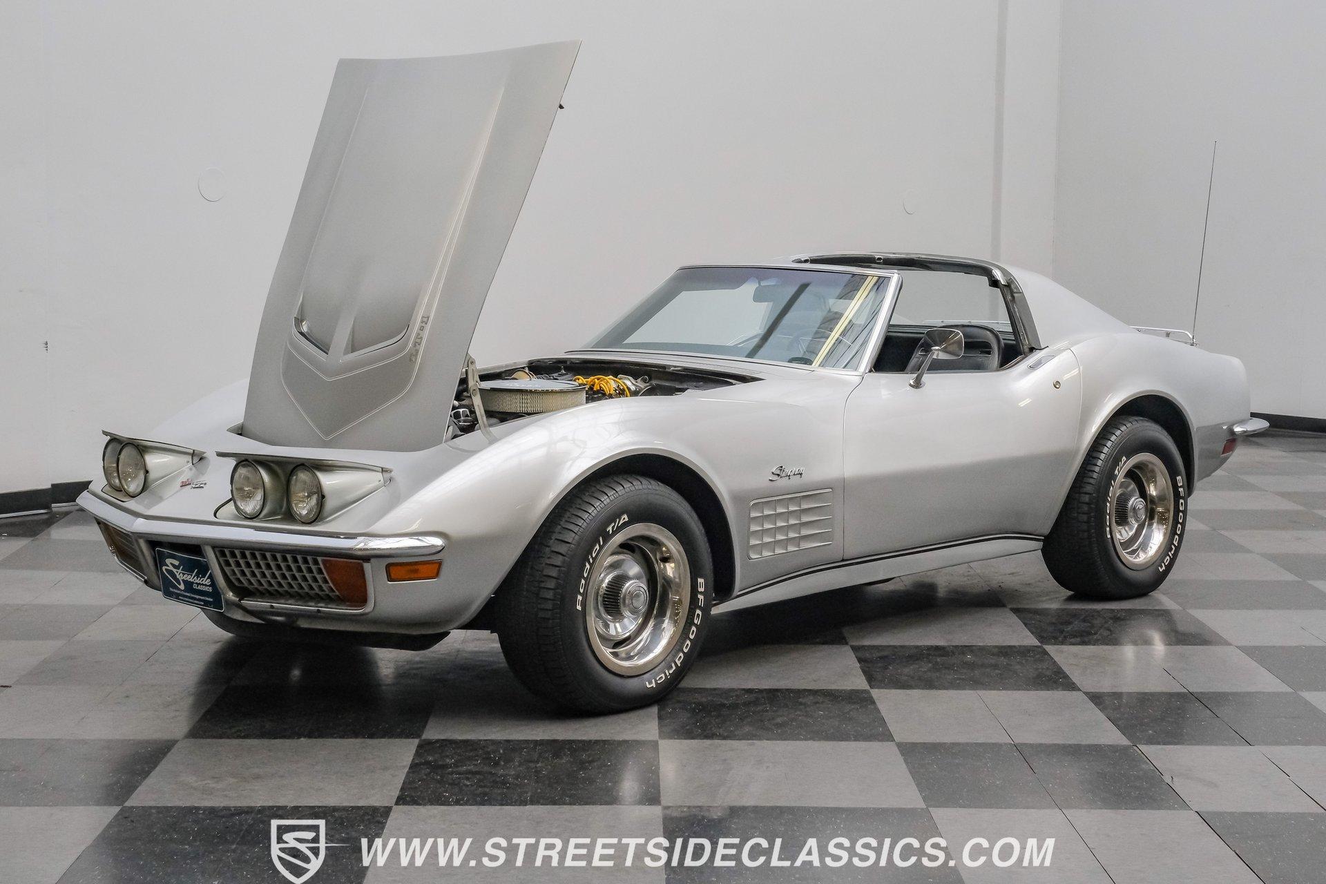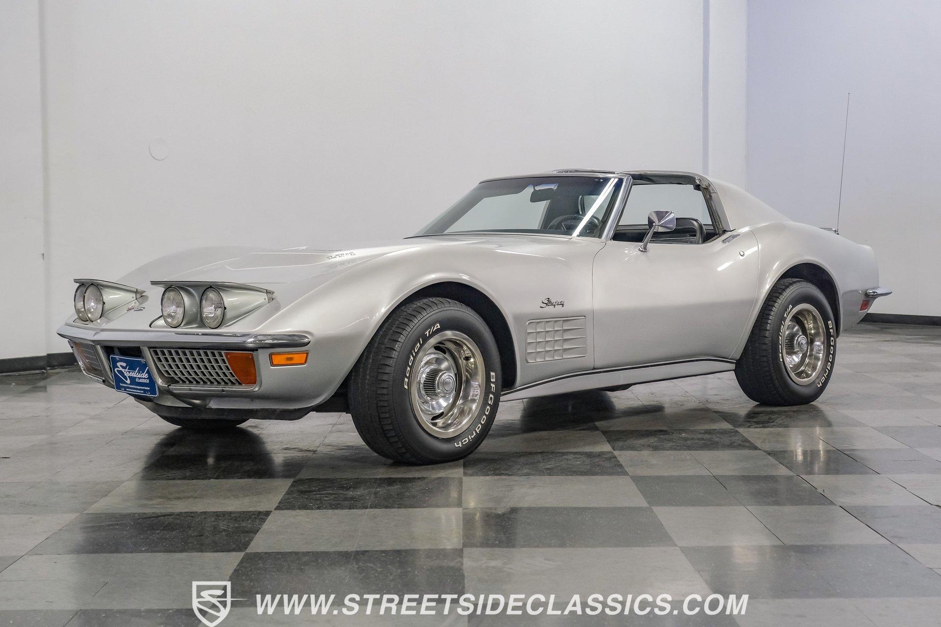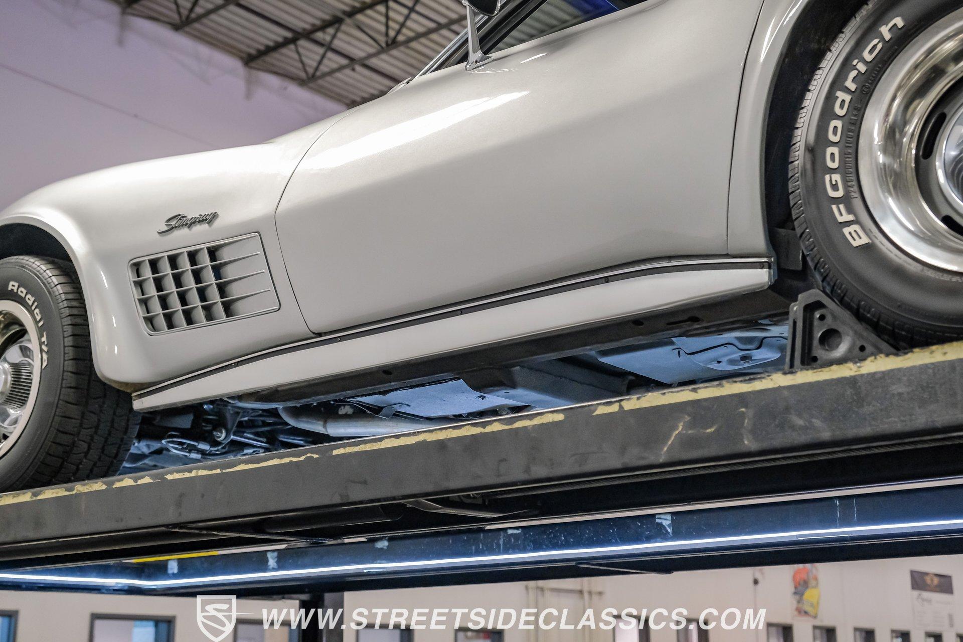 The second generation of Chevy's Corvette has quietly been gaining popularity among collectors over the last several years. One look at this 1972 Chevrolet Corvette LT1 383 and it's easy to see why. Fully repainted in a shimmering silver, this C2 features a useful rear luggage rack, complementing its signature T-Tops and sinewy Coke-bottle shape. Inside, we find a stock and correct appearing black leather interior. A center console separates a pair of bucket seats, while a three-spoke, power-assisted steering wheel sits ahead of a large 160 mph speedometer and 7,000 rpm tachometer. A quintet of auxiliary gauges sits above a retro-styled AM/FM/AUX/Bluetooth head unit, while simple wheel-controlled HVAC controls and a shift pattern diagram sit near the well-placed shifter. Although it came from the factory with an LT1, this Corvette benefits from an even more potent 383 cubic-inch BluePrint Engines stroker crate V-8 engine. This potent small block comes with lightweight aluminum heads, a mild performance cam, and a single Holley four-barrel carburetor. A true dual exhaust system feeds into a set of sweet-sounding FlowMaster mufflers, and with approximately 300 miles on it since installation, this engine has barely been broken in. Power is routed through a tried-and-true four-speed manual transmission, also with approximately 300 miles on its newly installed clutch. HIGHLIGHTS: Full Silver Repaint T-Tops Luggage Rack BluePrint Engines Crate Motor 383 Stroker V8 Approx 300 Miles on Motor Aluminum Heads Performance Cam Holley Four Barrel Four Speed Manual New Clutch Dual Exhaust FlowMasters Black Leather Interior Power Windows Power Steering Tilt Wheel Four Wheel Power Disc Brakes Rallye Wheels BFG Tires Owner's Manual This 1972 Chevrolet Corvette LT1 383 rides on an independent front suspension with a transverse leaf-spring setup in the rear. Fifteen-inch Rallye wheels are wrapped in 245/60R-15 BFG tires, with power disc brakes hiding behind at all four corners, ready to scrub off speed whenever called upon. This well-done C2 is a prime example of how good this generation can look and drive with only a couple of carefully selected upgrades. If you are one of the millions who adore the second generation of the Corvette, this is the car you've been waiting for. Don't wait, call today!