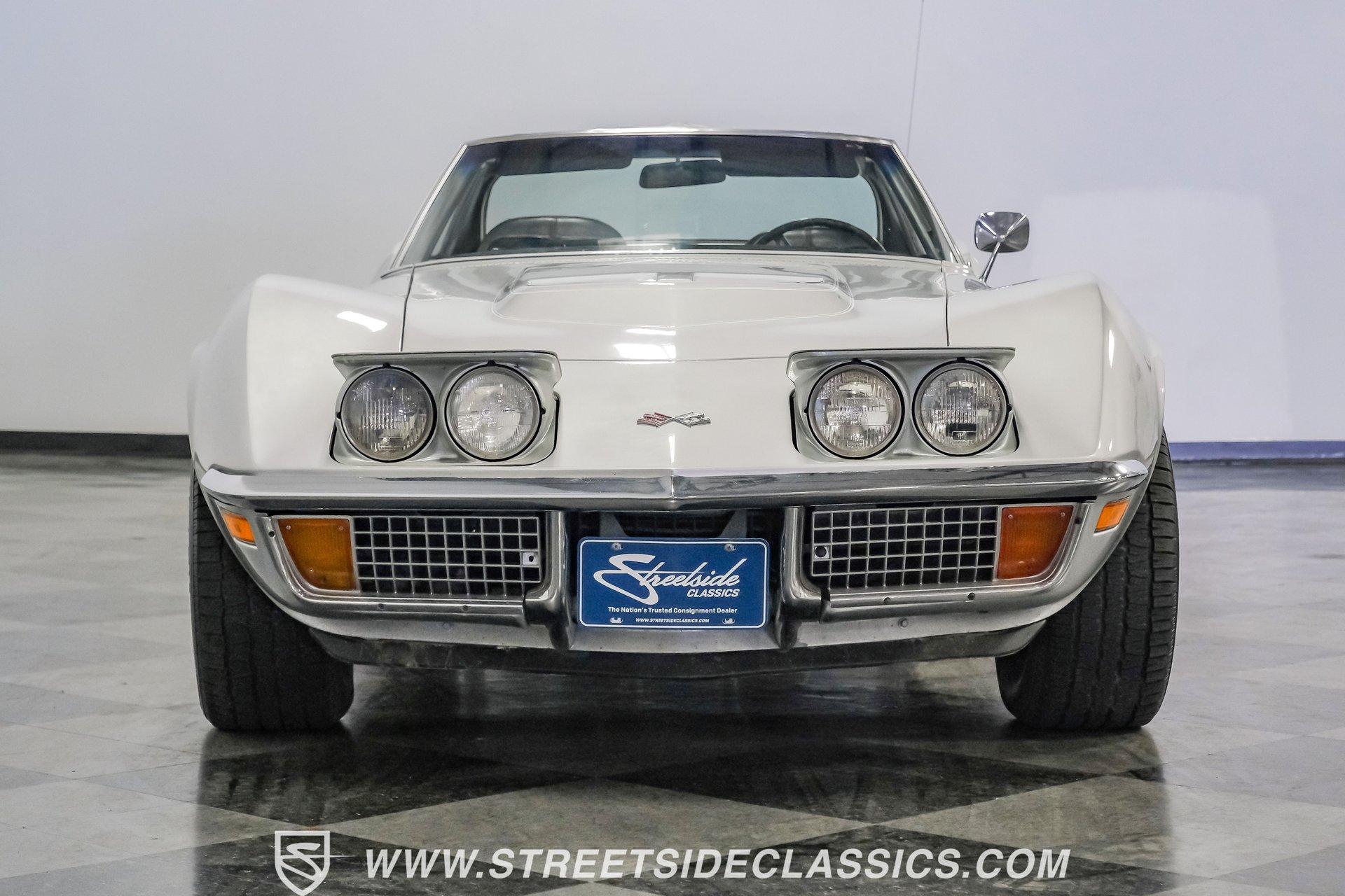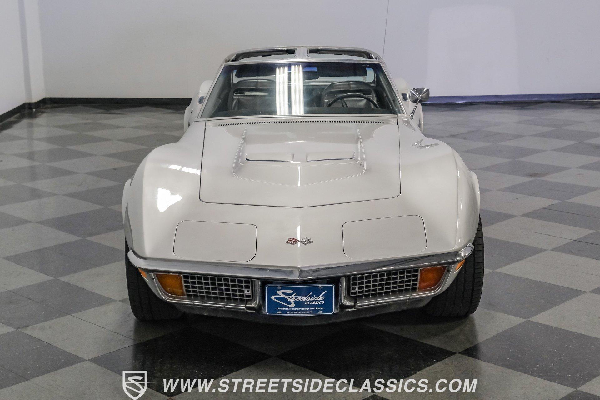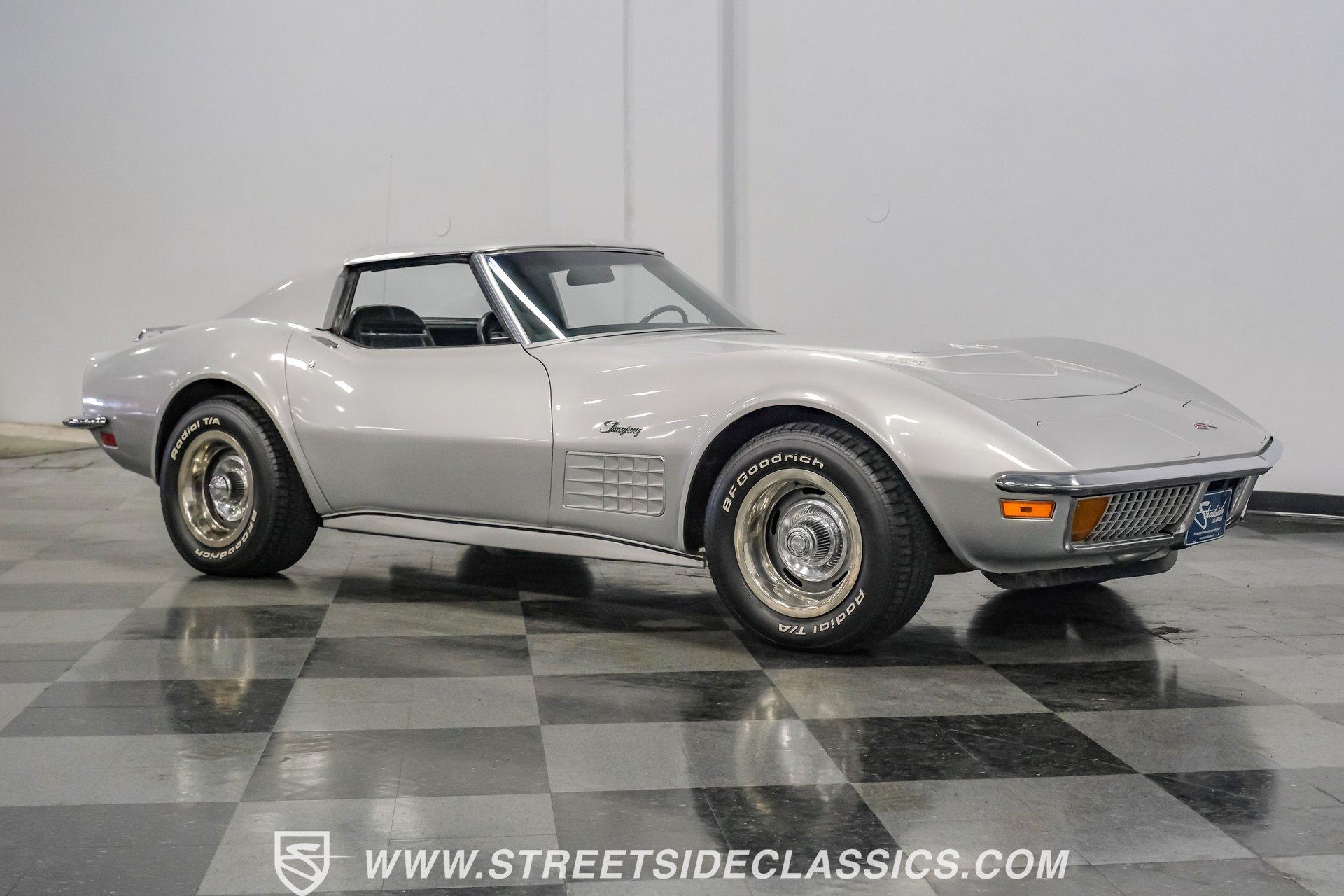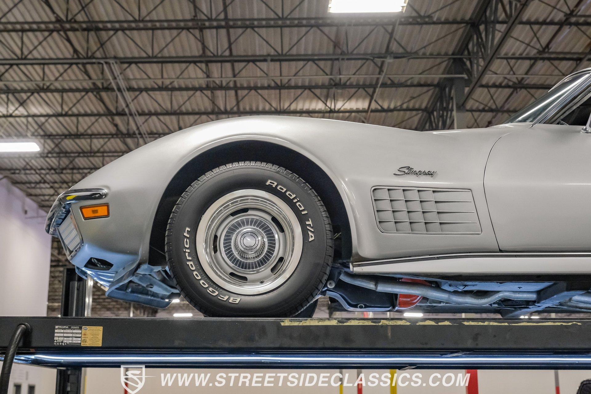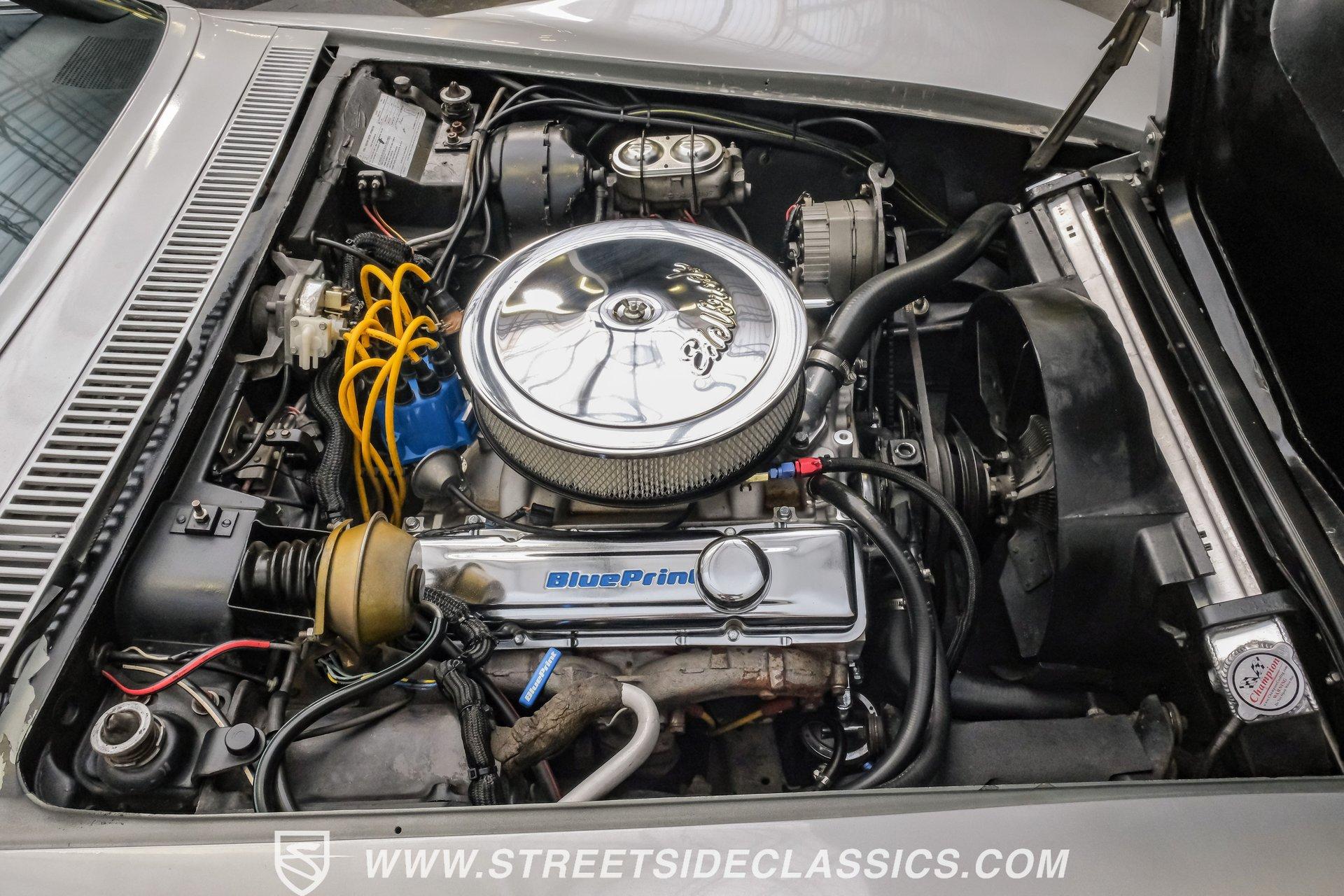 The second generation of Chevy's Corvette has quietly been gaining popularity among collectors over the last several years. One look at this 1972 Chevrolet Corvette LT1 383 and it's easy to see why. Fully repainted in a shimmering silver, this C2 features a useful rear luggage rack, complementing its signature T-Tops and sinewy Coke-bottle shape. Inside, we find a stock and correct appearing black leather interior. A center console separates a pair of bucket seats, while a three-spoke, power-assisted steering wheel sits ahead of a large 160 mph speedometer and 7,000 rpm tachometer. A quintet of auxiliary gauges sits above a retro-styled AM/FM/AUX/Bluetooth head unit, while simple wheel-controlled HVAC controls and a shift pattern diagram sit near the well-placed shifter. Although it came from the factory with an LT1, this Corvette benefits from an even more potent 383 cubic-inch BluePrint Engines stroker crate V-8 engine. This potent small block comes with lightweight aluminum heads, a mild performance cam, and a single Holley four-barrel carburetor. A true dual exhaust system feeds into a set of sweet-sounding FlowMaster mufflers, and with approximately 300 miles on it since installation, this engine has barely been broken in. Power is routed through a tried-and-true four-speed manual transmission, also with approximately 300 miles on its newly installed clutch. HIGHLIGHTS: Full Silver Repaint T-Tops Luggage Rack BluePrint Engines Crate Motor 383 Stroker V8 Approx 300 Miles on Motor Aluminum Heads Performance Cam Holley Four Barrel Four Speed Manual New Clutch Dual Exhaust FlowMasters Black Leather Interior Power Windows Power Steering Tilt Wheel Four Wheel Power Disc Brakes Rallye Wheels BFG Tires Owner's Manual This 1972 Chevrolet Corvette LT1 383 rides on an independent front suspension with a transverse leaf-spring setup in the rear. Fifteen-inch Rallye wheels are wrapped in 245/60R-15 BFG tires, with power disc brakes hiding behind at all four corners, ready to scrub off speed whenever called upon. This well-done C2 is a prime example of how good this generation can look and drive with only a couple of carefully selected upgrades. If you are one of the millions who adore the second generation of the Corvette, this is the car you've been waiting for. Don't wait, call today!