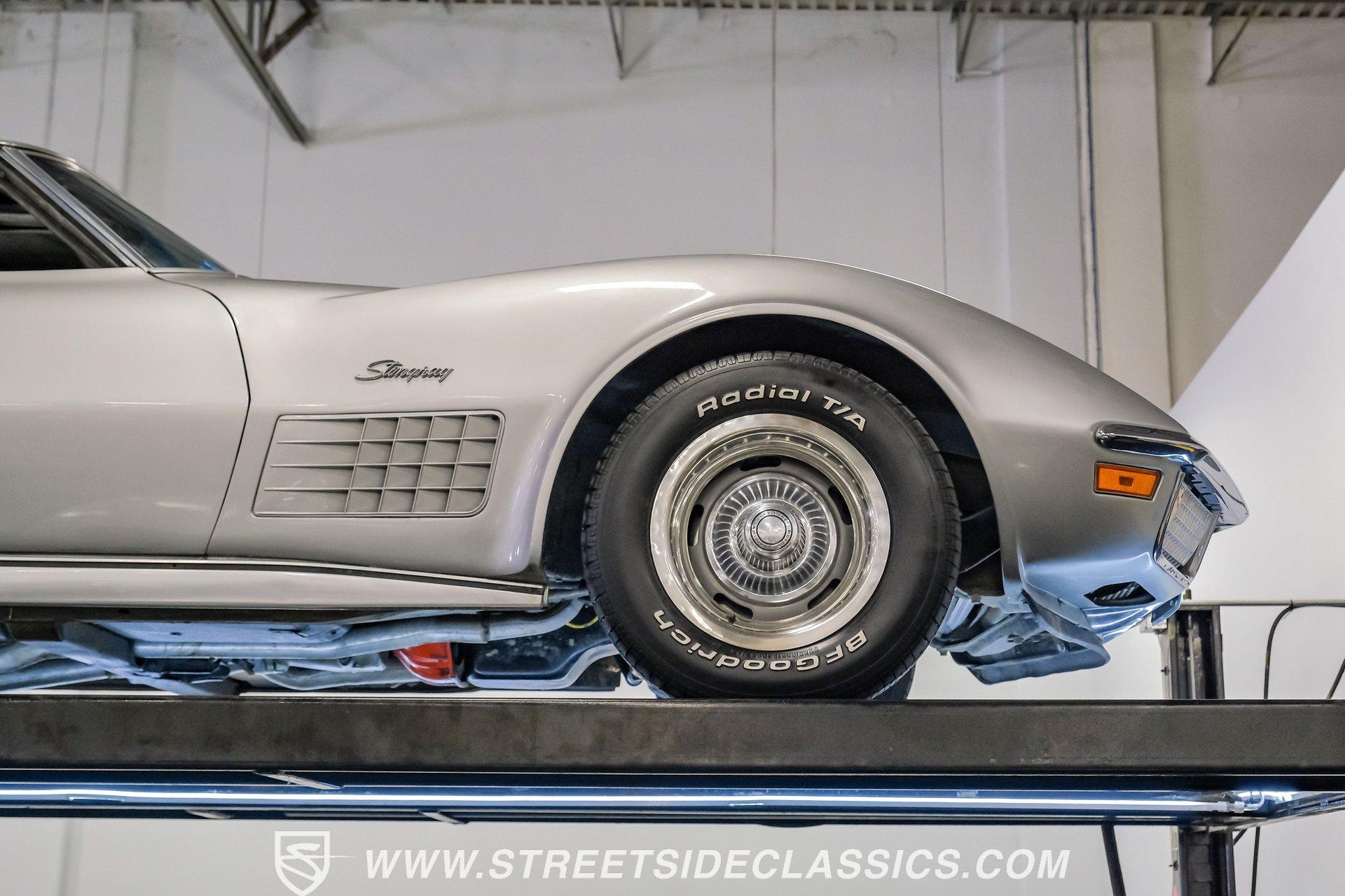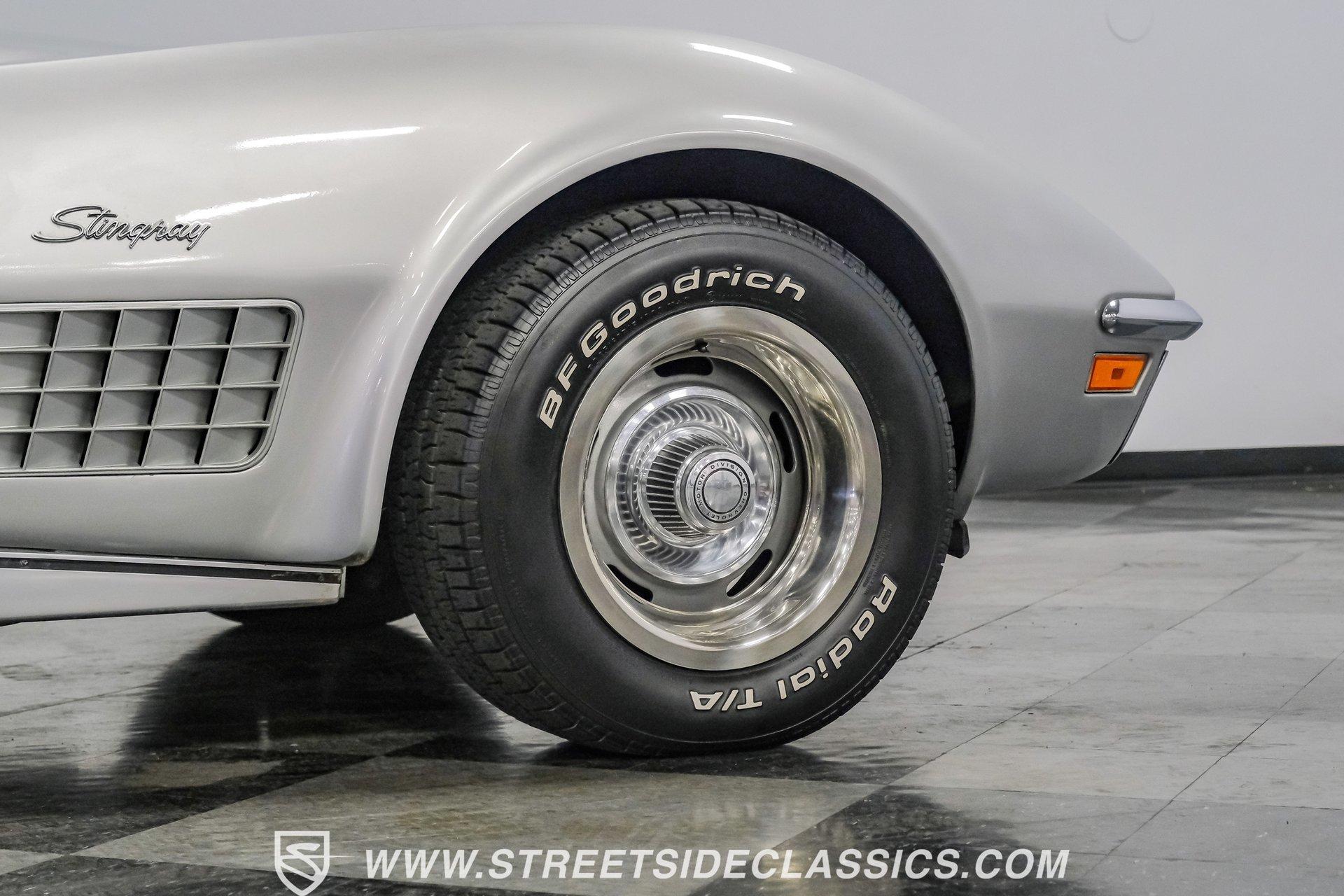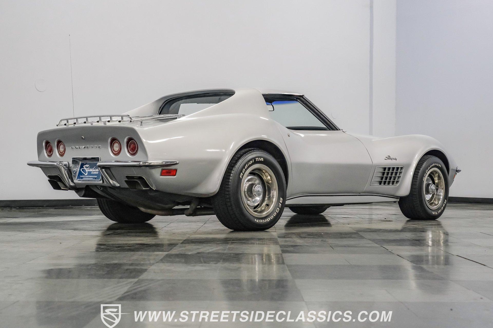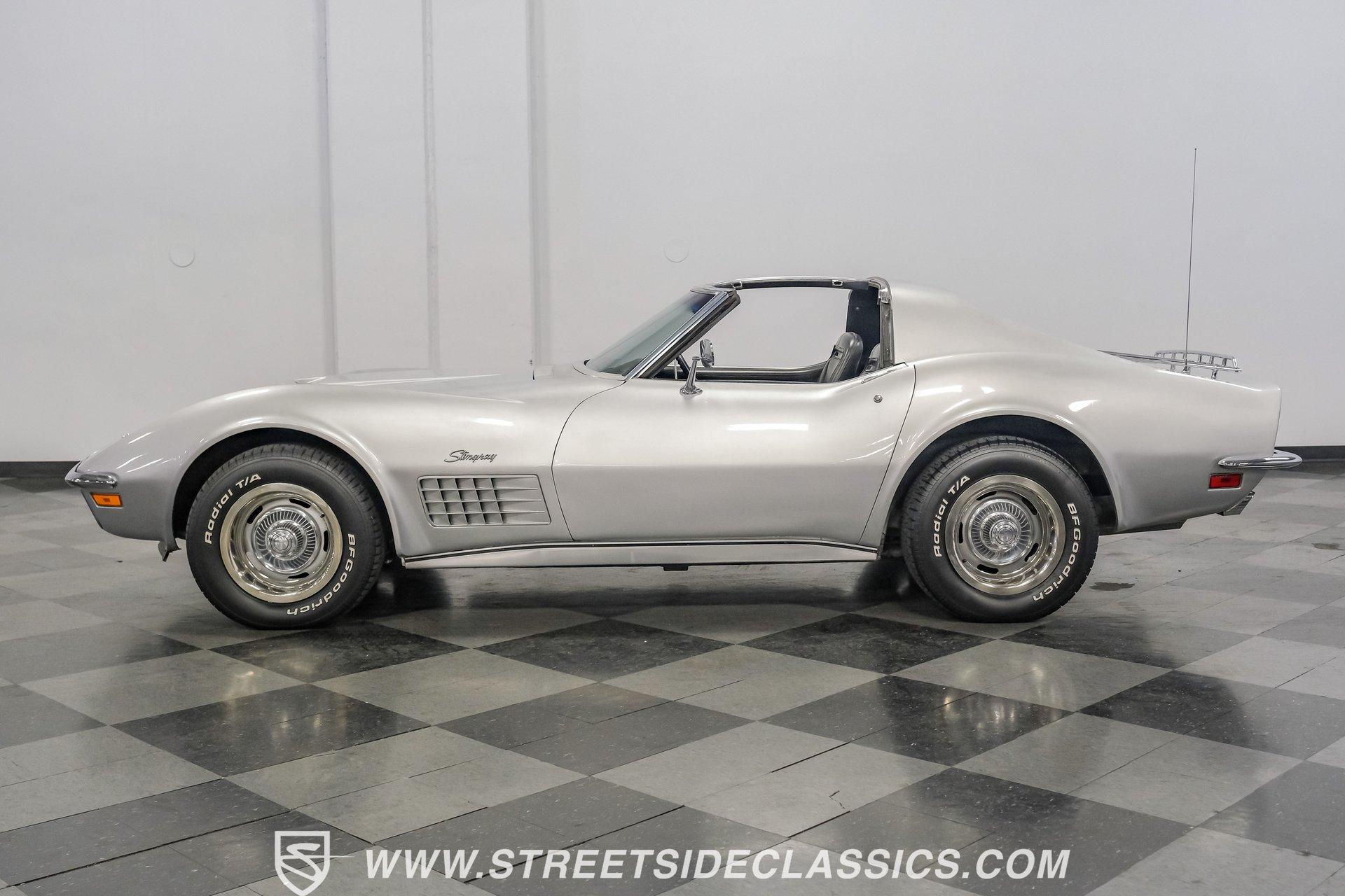 The second generation of Chevy's Corvette has quietly been gaining popularity among collectors over the last several years. One look at this 1972 Chevrolet Corvette LT1 383 and it's easy to see why. Fully repainted in a shimmering silver, this C2 features a useful rear luggage rack, complementing its signature T-Tops and sinewy Coke-bottle shape. Inside, we find a stock and correct appearing black leather interior. A center console separates a pair of bucket seats, while a three-spoke, power-assisted steering wheel sits ahead of a large 160 mph speedometer and 7,000 rpm tachometer. A quintet of auxiliary gauges sits above a retro-styled AM/FM/AUX/Bluetooth head unit, while simple wheel-controlled HVAC controls and a shift pattern diagram sit near the well-placed shifter. Although it came from the factory with an LT1, this Corvette benefits from an even more potent 383 cubic-inch BluePrint Engines stroker crate V-8 engine. This potent small block comes with lightweight aluminum heads, a mild performance cam, and a single Holley four-barrel carburetor. A true dual exhaust system feeds into a set of sweet-sounding FlowMaster mufflers, and with approximately 300 miles on it since installation, this engine has barely been broken in. Power is routed through a tried-and-true four-speed manual transmission, also with approximately 300 miles on its newly installed clutch. HIGHLIGHTS: Full Silver Repaint T-Tops Luggage Rack BluePrint Engines Crate Motor 383 Stroker V8 Approx 300 Miles on Motor Aluminum Heads Performance Cam Holley Four Barrel Four Speed Manual New Clutch Dual Exhaust FlowMasters Black Leather Interior Power Windows Power Steering Tilt Wheel Four Wheel Power Disc Brakes Rallye Wheels BFG Tires Owner's Manual This 1972 Chevrolet Corvette LT1 383 rides on an independent front suspension with a transverse leaf-spring setup in the rear. Fifteen-inch Rallye wheels are wrapped in 245/60R-15 BFG tires, with power disc brakes hiding behind at all four corners, ready to scrub off speed whenever called upon. This well-done C2 is a prime example of how good this generation can look and drive with only a couple of carefully selected upgrades. If you are one of the millions who adore the second generation of the Corvette, this is the car you've been waiting for. Don't wait, call today!