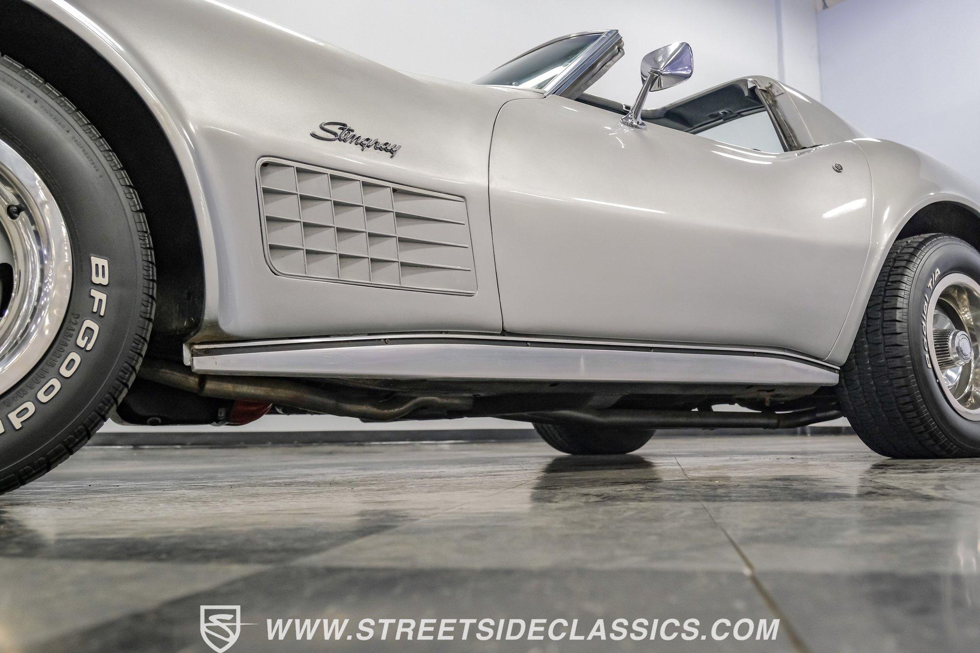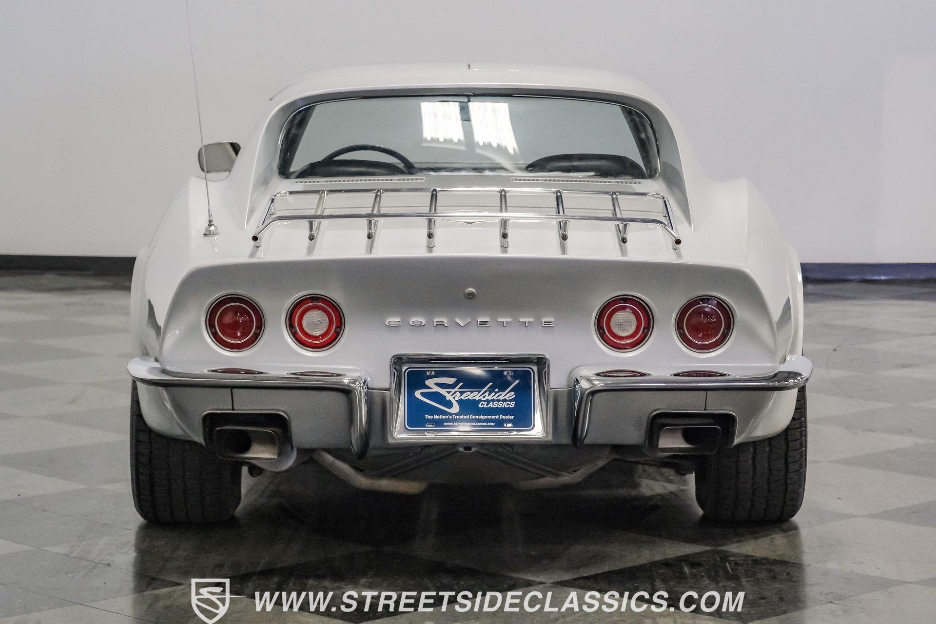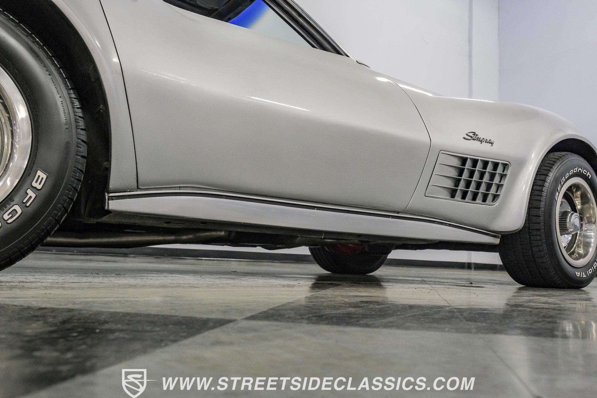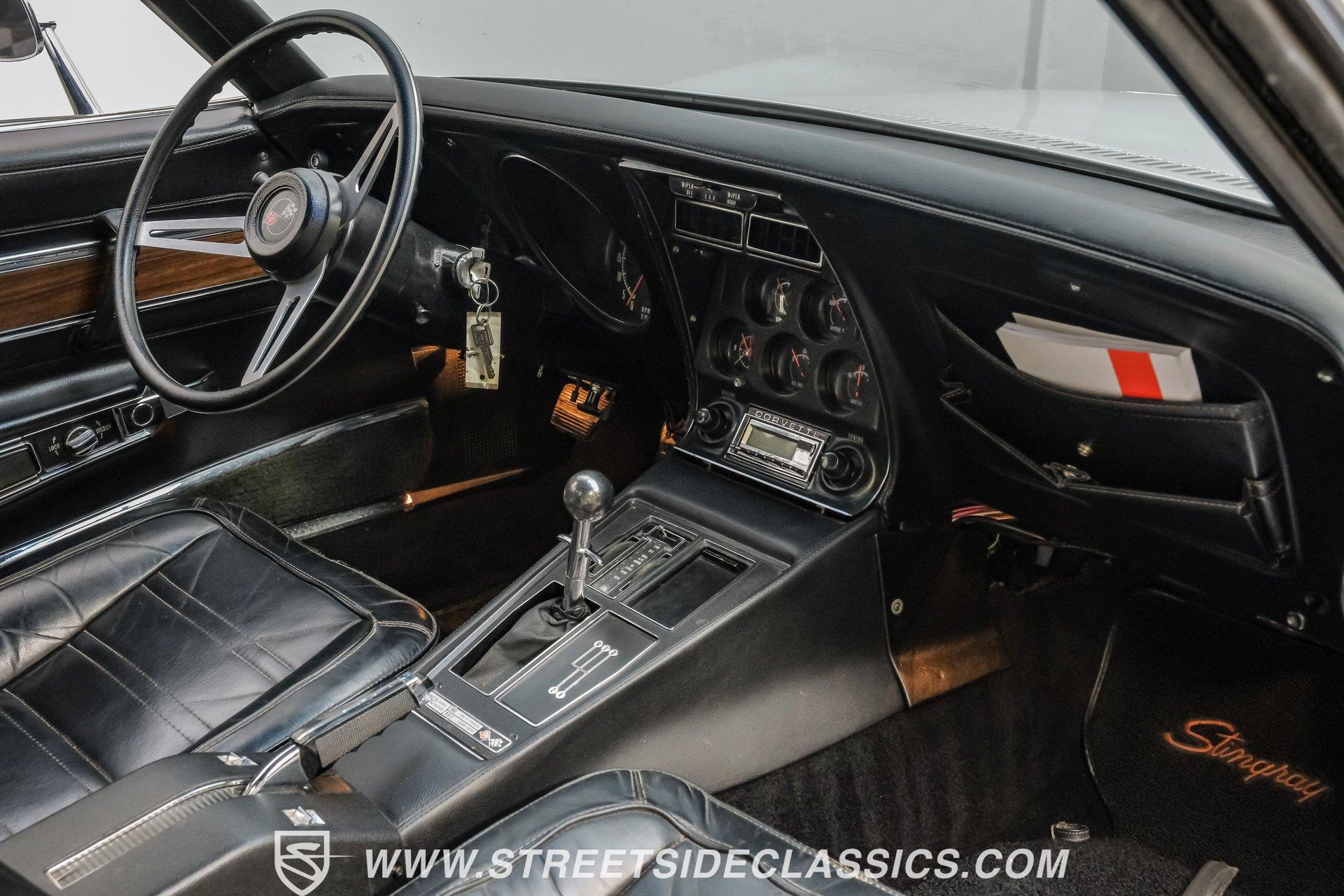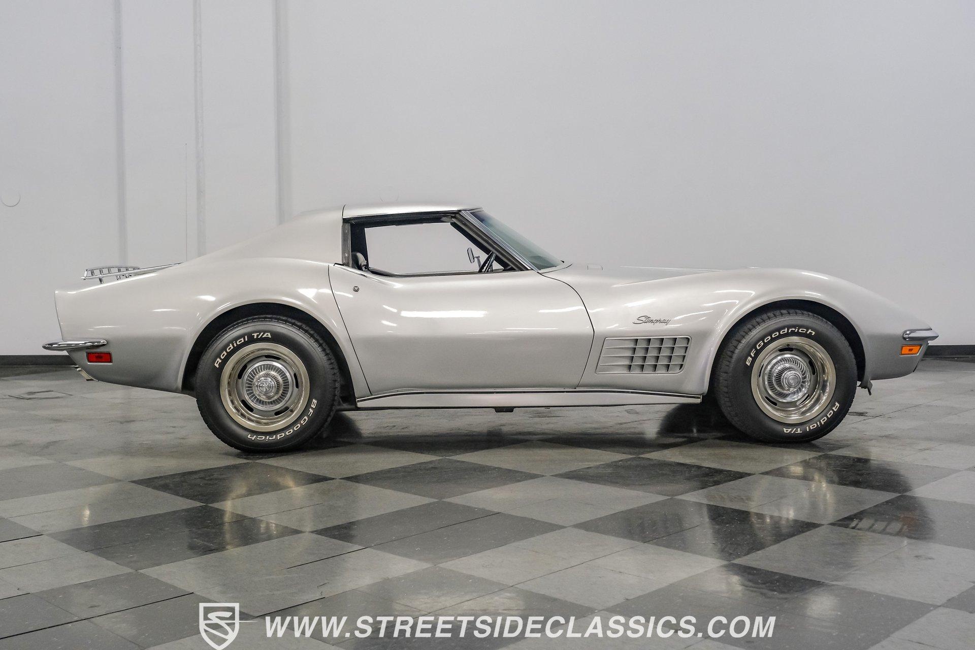 The second generation of Chevy's Corvette has quietly been gaining popularity among collectors over the last several years. One look at this 1972 Chevrolet Corvette LT1 383 and it's easy to see why. Fully repainted in a shimmering silver, this C2 features a useful rear luggage rack, complementing its signature T-Tops and sinewy Coke-bottle shape. Inside, we find a stock and correct appearing black leather interior. A center console separates a pair of bucket seats, while a three-spoke, power-assisted steering wheel sits ahead of a large 160 mph speedometer and 7,000 rpm tachometer. A quintet of auxiliary gauges sits above a retro-styled AM/FM/AUX/Bluetooth head unit, while simple wheel-controlled HVAC controls and a shift pattern diagram sit near the well-placed shifter. Although it came from the factory with an LT1, this Corvette benefits from an even more potent 383 cubic-inch BluePrint Engines stroker crate V-8 engine. This potent small block comes with lightweight aluminum heads, a mild performance cam, and a single Holley four-barrel carburetor. A true dual exhaust system feeds into a set of sweet-sounding FlowMaster mufflers, and with approximately 300 miles on it since installation, this engine has barely been broken in. Power is routed through a tried-and-true four-speed manual transmission, also with approximately 300 miles on its newly installed clutch. HIGHLIGHTS: Full Silver Repaint T-Tops Luggage Rack BluePrint Engines Crate Motor 383 Stroker V8 Approx 300 Miles on Motor Aluminum Heads Performance Cam Holley Four Barrel Four Speed Manual New Clutch Dual Exhaust FlowMasters Black Leather Interior Power Windows Power Steering Tilt Wheel Four Wheel Power Disc Brakes Rallye Wheels BFG Tires Owner's Manual This 1972 Chevrolet Corvette LT1 383 rides on an independent front suspension with a transverse leaf-spring setup in the rear. Fifteen-inch Rallye wheels are wrapped in 245/60R-15 BFG tires, with power disc brakes hiding behind at all four corners, ready to scrub off speed whenever called upon. This well-done C2 is a prime example of how good this generation can look and drive with only a couple of carefully selected upgrades. If you are one of the millions who adore the second generation of the Corvette, this is the car you've been waiting for. Don't wait, call today!