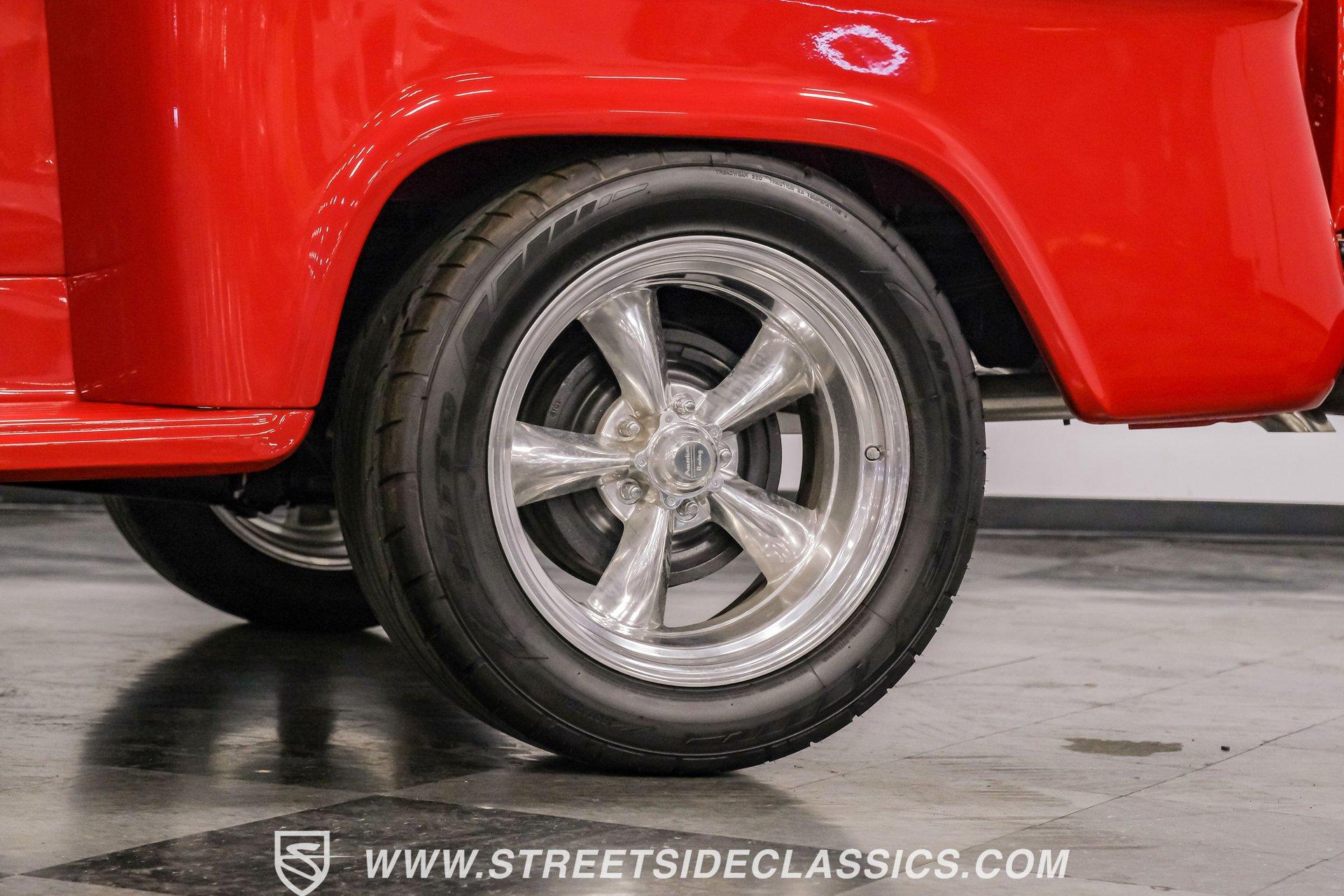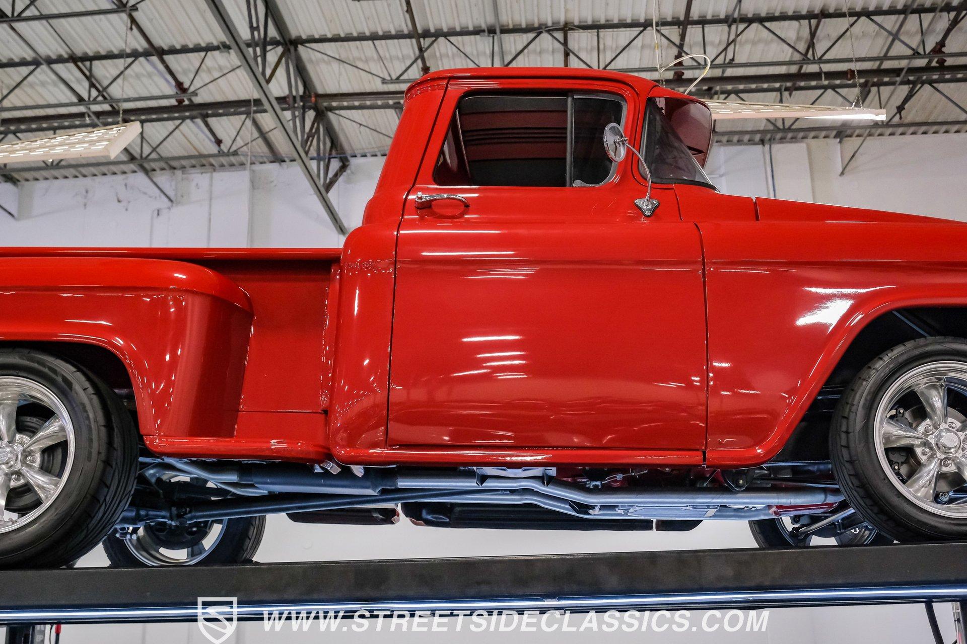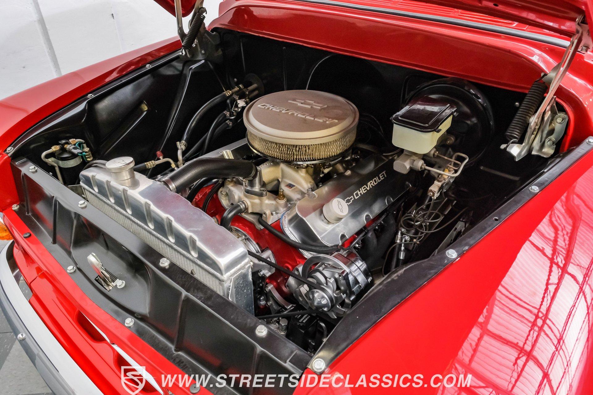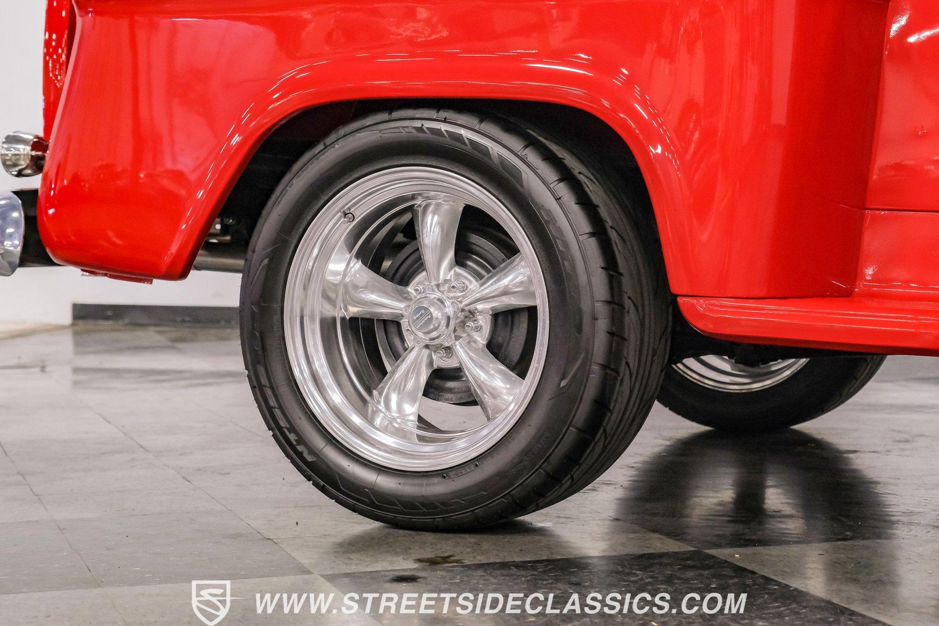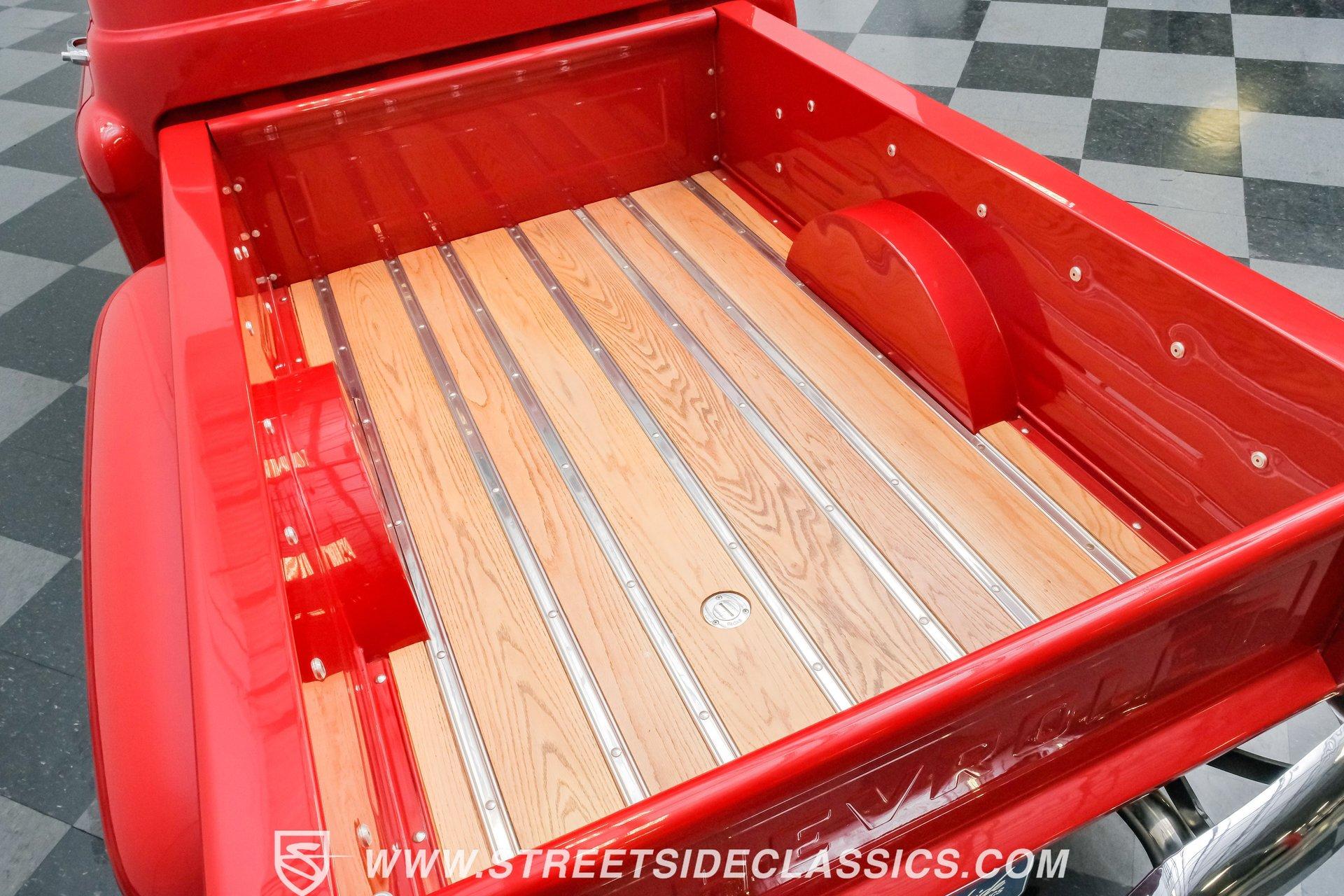 Custom trucks done-up this nice don't come around too often. This 1956 Chevrolet 3100 Custom presents a Metallic Red paint job that just pops out at you. It goes great with the curves of the step-side short-bed look, the retro wheels, and the chrome bumpers. This truck has the perfect stance, a clean undercarriage, and a bed that uses classy wood planks with shiny separators to finish off the look. If you're looking for a vehicle that can go to car shows and draw tons of attention, this is your gem. Just as much time and detail went into the interior as the exterior. Red and black vinyl bench seats create a very cool look, paired with a matching headliner. Black carpeting with a red Chevrolet emblem in the center ties it all together. The door panels and dashboard are painted solid red to match the exterior and are in great shape. The custom gauge cluster includes dolphin aftermarket gauges. To the right is a RetroSound radio, and next to that are the climate controls, which look factory-restored. Complementing the setup is a billet steering wheel and billet gas and brake pedals. In the middle of the floor on the transmission tunnel sits a Lokar shifter handle and brake lever. For added kicks, aftermarket speakers are mounted in the kick panels. The engine bay is nicely painted flat black and houses a rebuilt 454 cubic-inch big-block, finished in Chevy Orange. It's equipped with an aluminum radiator and electric fans, aluminum valve covers, billet pulleys for accessories, and an Edelbrock intake topped with a Holley 4-barrel carburetor. Mated to the big-block is a TH400 3-speed automatic transmission that sends power back to a 12-bolt rear axle. The front suspension features a straight axle with leaf springs and shocks, while the rear uses a solid axle with leaf springs and shocks. American Racing 17-inch wheels sit up front, and 18-inch wheels are mounted in the rear. These are wrapped in 245/45ZR17 Nitto tires in the front and 295/45ZR18 Nitto tires in the rear. Braking is handled by front power disc brakes and rear power drums. Shorty headers push the exhaust through dual pipes and aftermarket mufflers. HIghlights: 454 Cubic-Inch Big-Block Aluminum Radiator With Electric Fans Billet Pulleys For Accessories TH400 3-Speed Automatic Transmission 12-Bolt Rear Axle Front 17-Inch American Racing Wheels With 245/45ZR17 Nitto Tires - 2020 Rear 18-Inch American Racing Wheels With 295/45ZR18 Nitto Tires - 2019 Front Power Disc Brakes Headers, Dual Exhaust, Aftermarket Mufflers Power Steering Air Conditioning Tilt Steering Column RetroSounds AM/FM Radio With Aux Inputs And Bluetooth This is a gorgeous truck for cruising. With only 226 miles on the build, this 1956 Chevrolet 3100 Custom is ready for someone to have a lot of fun in. Whether it's weekend cruising, local car shows, or simply admiring it in your driveway or garage, you can't go wrong with a truck this beautiful. Call Today!