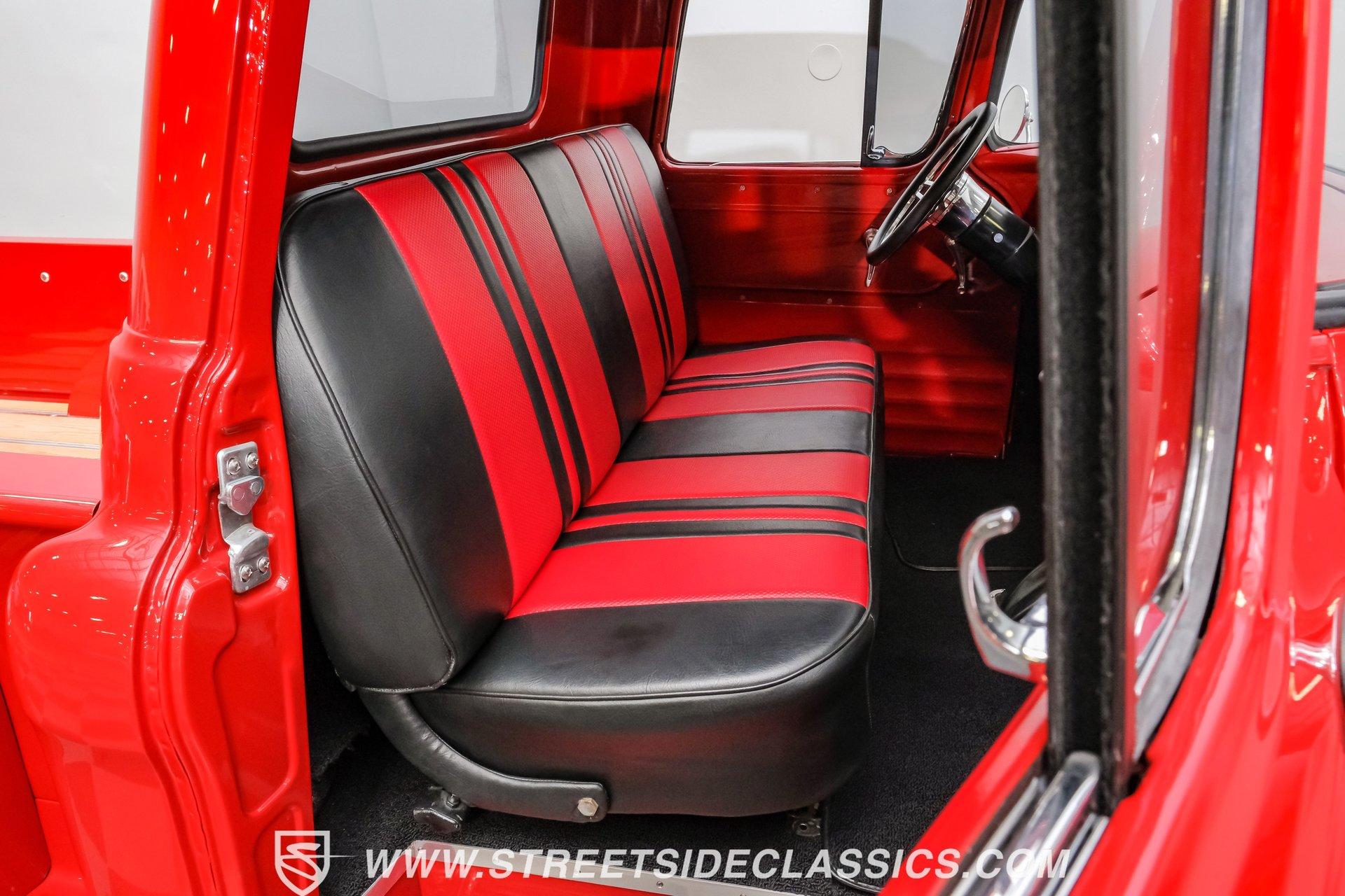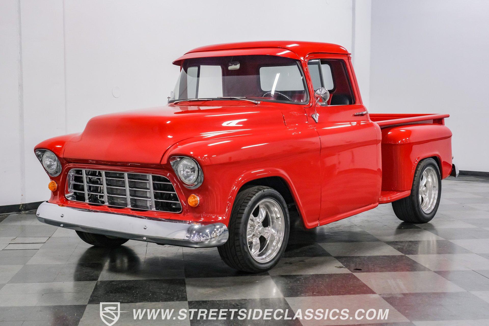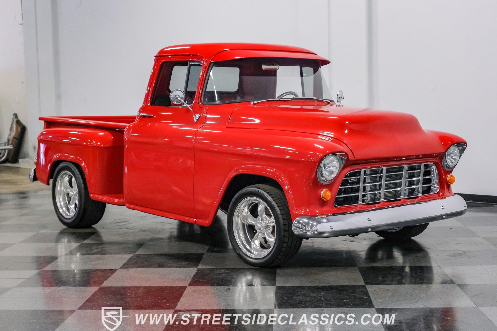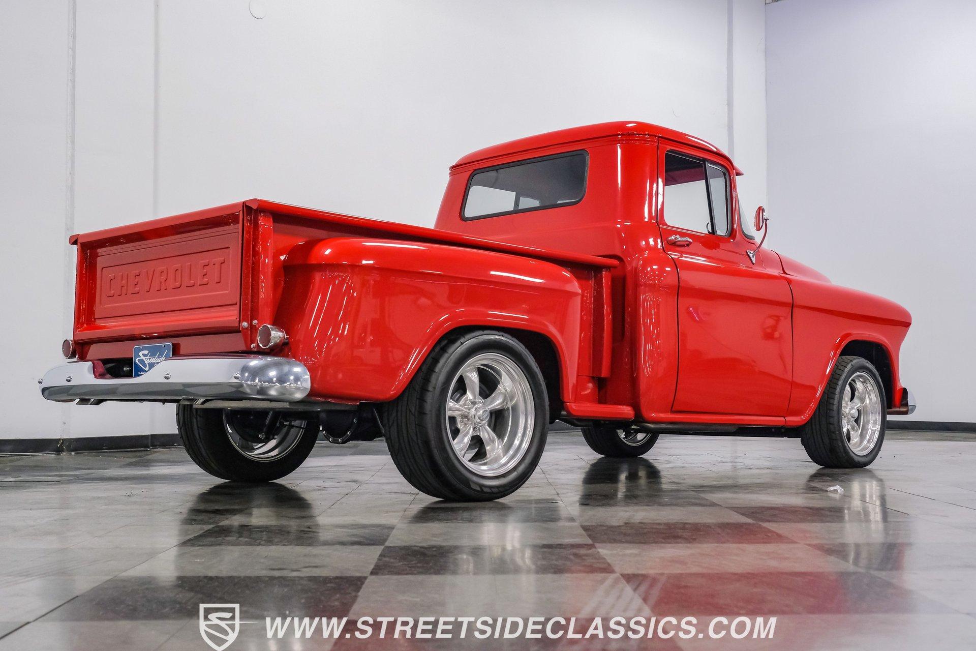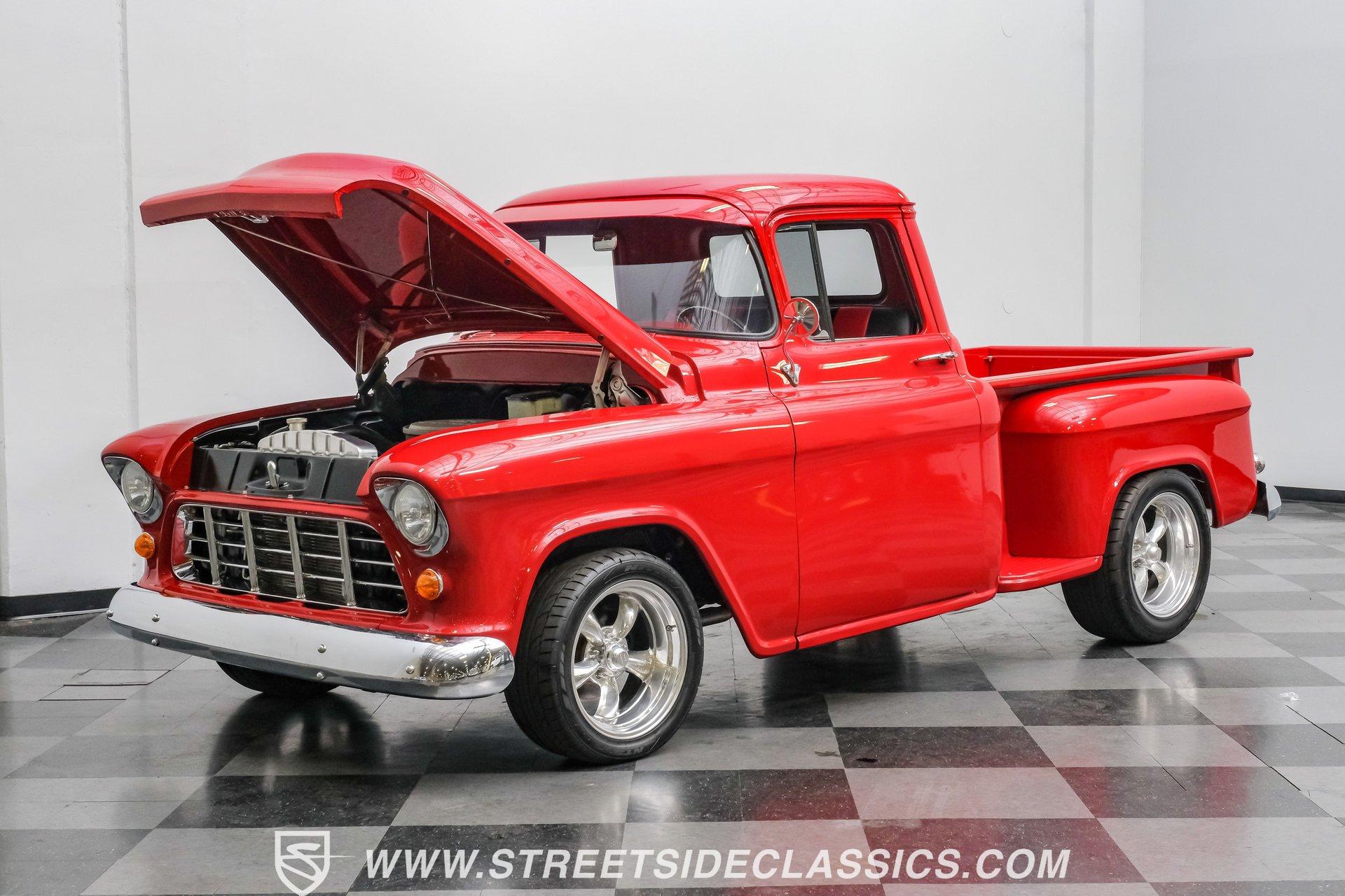 Custom trucks done-up this nice don't come around too often. This 1956 Chevrolet 3100 Custom presents a Metallic Red paint job that just pops out at you. It goes great with the curves of the step-side short-bed look, the retro wheels, and the chrome bumpers. This truck has the perfect stance, a clean undercarriage, and a bed that uses classy wood planks with shiny separators to finish off the look. If you're looking for a vehicle that can go to car shows and draw tons of attention, this is your gem. Just as much time and detail went into the interior as the exterior. Red and black vinyl bench seats create a very cool look, paired with a matching headliner. Black carpeting with a red Chevrolet emblem in the center ties it all together. The door panels and dashboard are painted solid red to match the exterior and are in great shape. The custom gauge cluster includes dolphin aftermarket gauges. To the right is a RetroSound radio, and next to that are the climate controls, which look factory-restored. Complementing the setup is a billet steering wheel and billet gas and brake pedals. In the middle of the floor on the transmission tunnel sits a Lokar shifter handle and brake lever. For added kicks, aftermarket speakers are mounted in the kick panels. The engine bay is nicely painted flat black and houses a rebuilt 454 cubic-inch big-block, finished in Chevy Orange. It's equipped with an aluminum radiator and electric fans, aluminum valve covers, billet pulleys for accessories, and an Edelbrock intake topped with a Holley 4-barrel carburetor. Mated to the big-block is a TH400 3-speed automatic transmission that sends power back to a 12-bolt rear axle. The front suspension features a straight axle with leaf springs and shocks, while the rear uses a solid axle with leaf springs and shocks. American Racing 17-inch wheels sit up front, and 18-inch wheels are mounted in the rear. These are wrapped in 245/45ZR17 Nitto tires in the front and 295/45ZR18 Nitto tires in the rear. Braking is handled by front power disc brakes and rear power drums. Shorty headers push the exhaust through dual pipes and aftermarket mufflers. HIghlights: 454 Cubic-Inch Big-Block Aluminum Radiator With Electric Fans Billet Pulleys For Accessories TH400 3-Speed Automatic Transmission 12-Bolt Rear Axle Front 17-Inch American Racing Wheels With 245/45ZR17 Nitto Tires - 2020 Rear 18-Inch American Racing Wheels With 295/45ZR18 Nitto Tires - 2019 Front Power Disc Brakes Headers, Dual Exhaust, Aftermarket Mufflers Power Steering Air Conditioning Tilt Steering Column RetroSounds AM/FM Radio With Aux Inputs And Bluetooth This is a gorgeous truck for cruising. With only 226 miles on the build, this 1956 Chevrolet 3100 Custom is ready for someone to have a lot of fun in. Whether it's weekend cruising, local car shows, or simply admiring it in your driveway or garage, you can't go wrong with a truck this beautiful. Call Today!