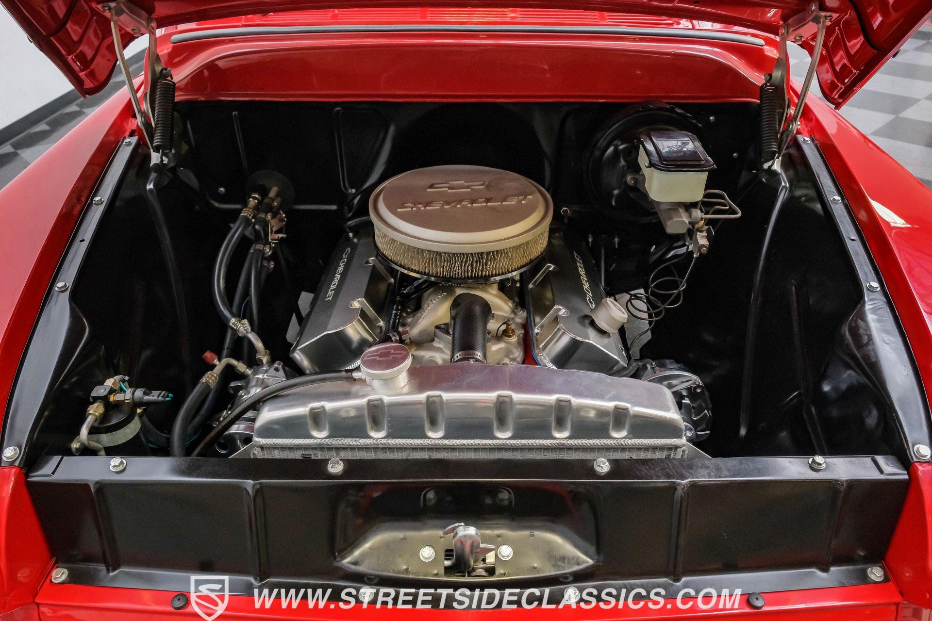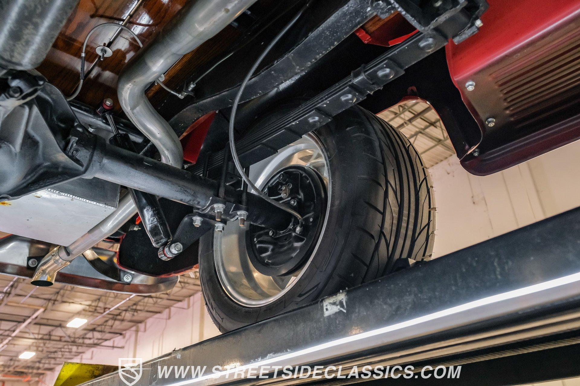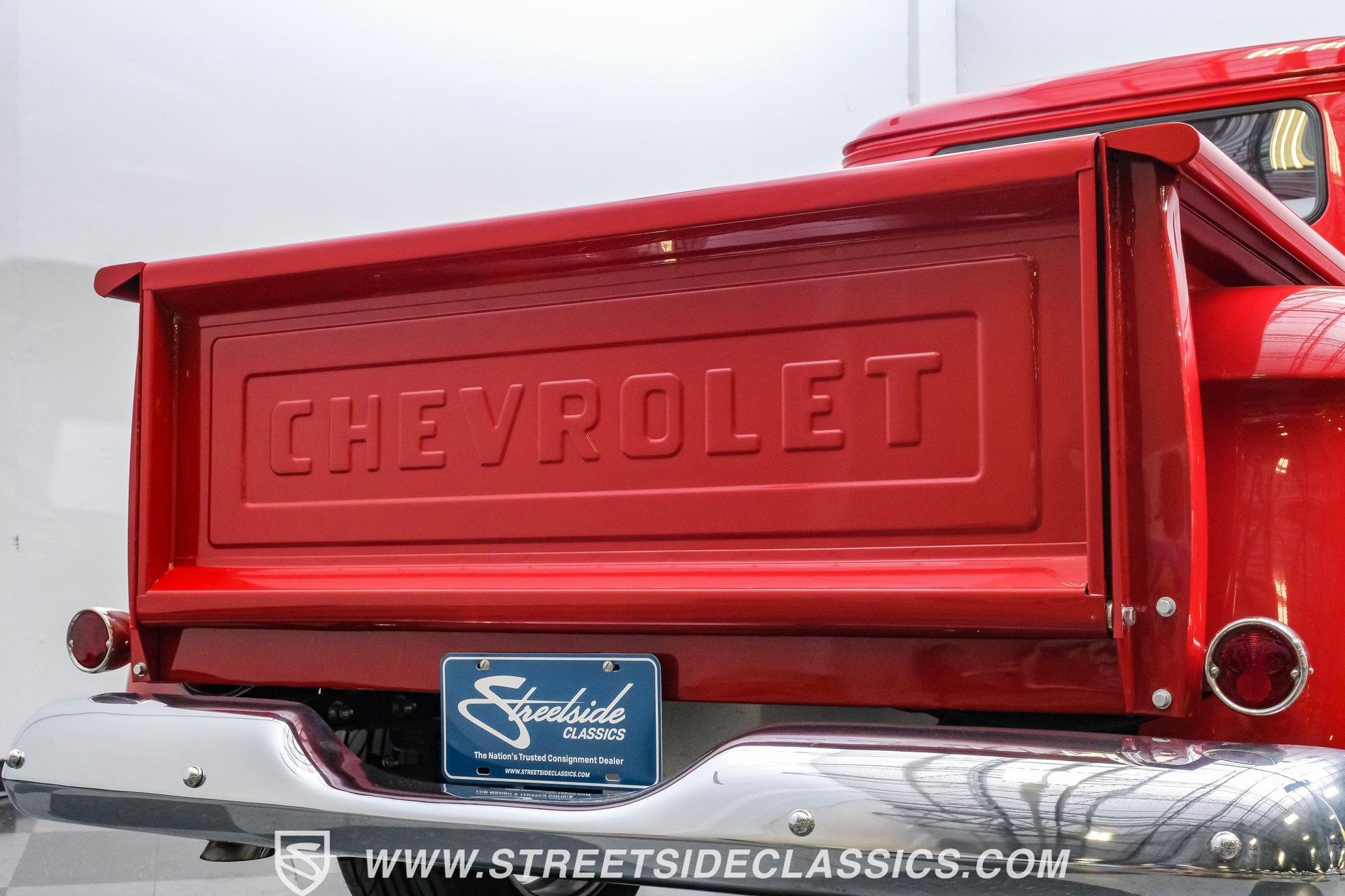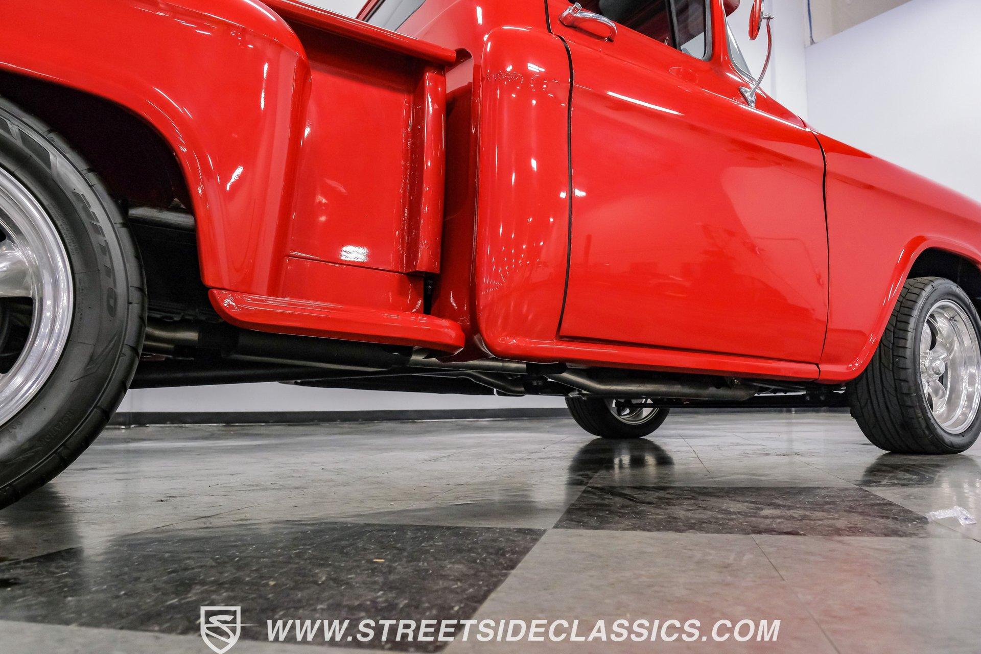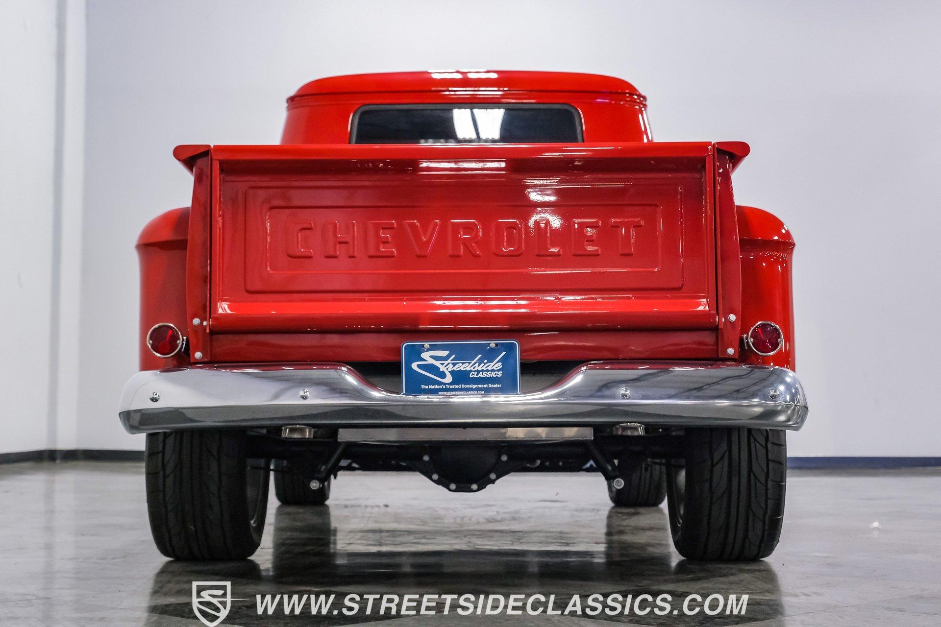 Custom trucks done-up this nice don't come around too often. This 1956 Chevrolet 3100 Custom presents a Metallic Red paint job that just pops out at you. It goes great with the curves of the step-side short-bed look, the retro wheels, and the chrome bumpers. This truck has the perfect stance, a clean undercarriage, and a bed that uses classy wood planks with shiny separators to finish off the look. If you're looking for a vehicle that can go to car shows and draw tons of attention, this is your gem. Just as much time and detail went into the interior as the exterior. Red and black vinyl bench seats create a very cool look, paired with a matching headliner. Black carpeting with a red Chevrolet emblem in the center ties it all together. The door panels and dashboard are painted solid red to match the exterior and are in great shape. The custom gauge cluster includes dolphin aftermarket gauges. To the right is a RetroSound radio, and next to that are the climate controls, which look factory-restored. Complementing the setup is a billet steering wheel and billet gas and brake pedals. In the middle of the floor on the transmission tunnel sits a Lokar shifter handle and brake lever. For added kicks, aftermarket speakers are mounted in the kick panels. The engine bay is nicely painted flat black and houses a rebuilt 454 cubic-inch big-block, finished in Chevy Orange. It's equipped with an aluminum radiator and electric fans, aluminum valve covers, billet pulleys for accessories, and an Edelbrock intake topped with a Holley 4-barrel carburetor. Mated to the big-block is a TH400 3-speed automatic transmission that sends power back to a 12-bolt rear axle. The front suspension features a straight axle with leaf springs and shocks, while the rear uses a solid axle with leaf springs and shocks. American Racing 17-inch wheels sit up front, and 18-inch wheels are mounted in the rear. These are wrapped in 245/45ZR17 Nitto tires in the front and 295/45ZR18 Nitto tires in the rear. Braking is handled by front power disc brakes and rear power drums. Shorty headers push the exhaust through dual pipes and aftermarket mufflers. HIghlights: 454 Cubic-Inch Big-Block Aluminum Radiator With Electric Fans Billet Pulleys For Accessories TH400 3-Speed Automatic Transmission 12-Bolt Rear Axle Front 17-Inch American Racing Wheels With 245/45ZR17 Nitto Tires - 2020 Rear 18-Inch American Racing Wheels With 295/45ZR18 Nitto Tires - 2019 Front Power Disc Brakes Headers, Dual Exhaust, Aftermarket Mufflers Power Steering Air Conditioning Tilt Steering Column RetroSounds AM/FM Radio With Aux Inputs And Bluetooth This is a gorgeous truck for cruising. With only 226 miles on the build, this 1956 Chevrolet 3100 Custom is ready for someone to have a lot of fun in. Whether it's weekend cruising, local car shows, or simply admiring it in your driveway or garage, you can't go wrong with a truck this beautiful. Call Today!