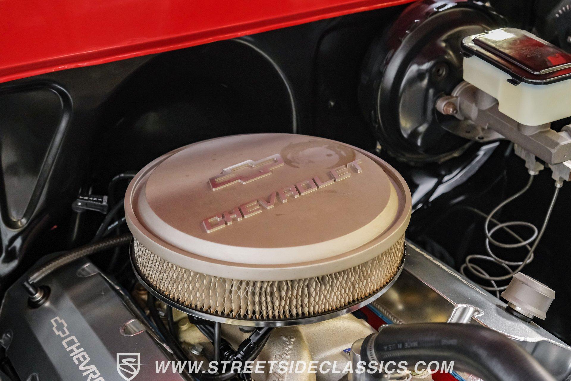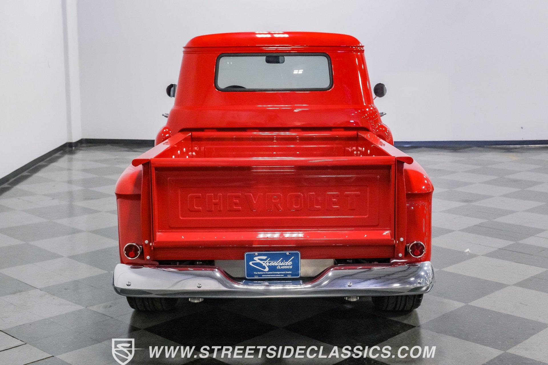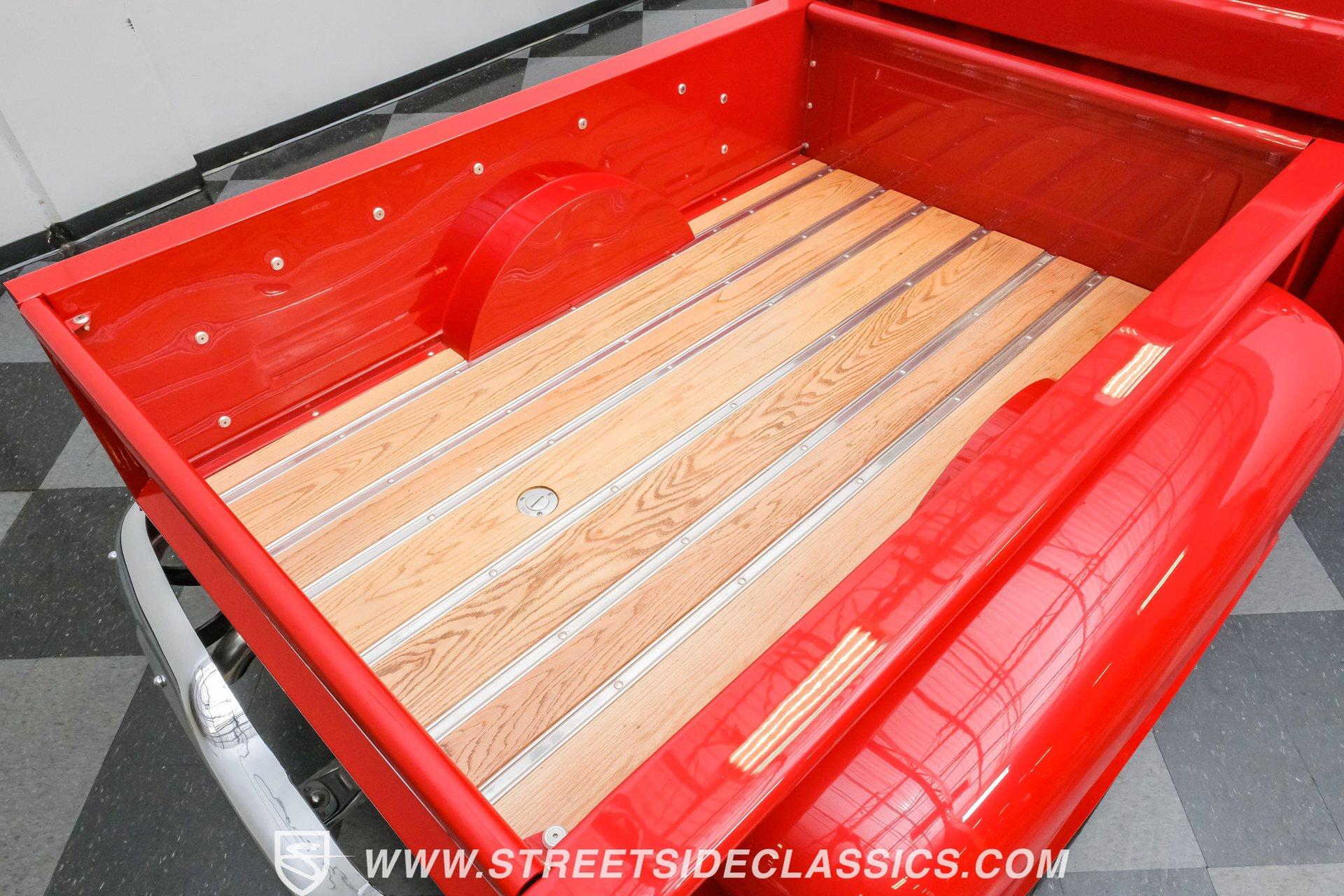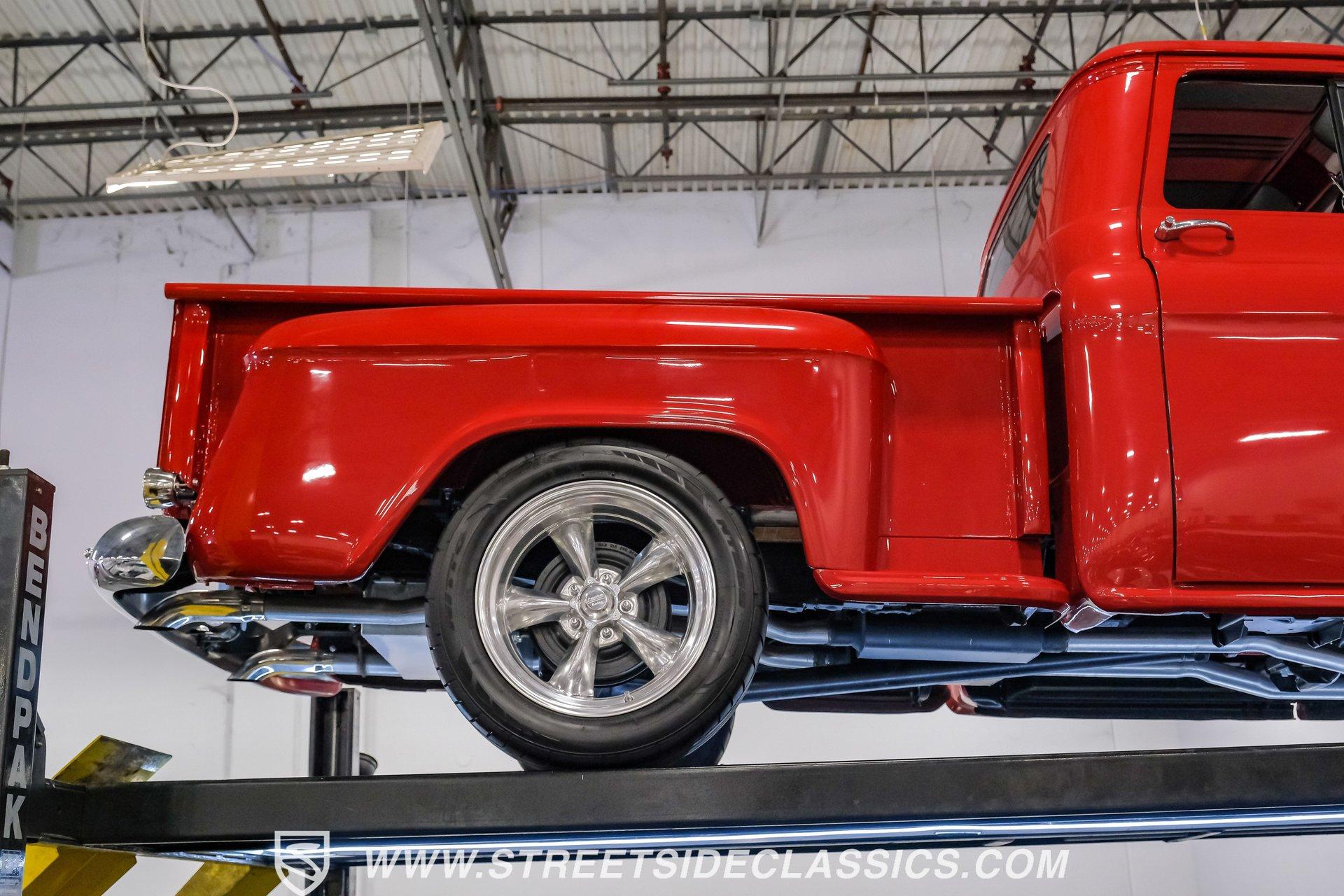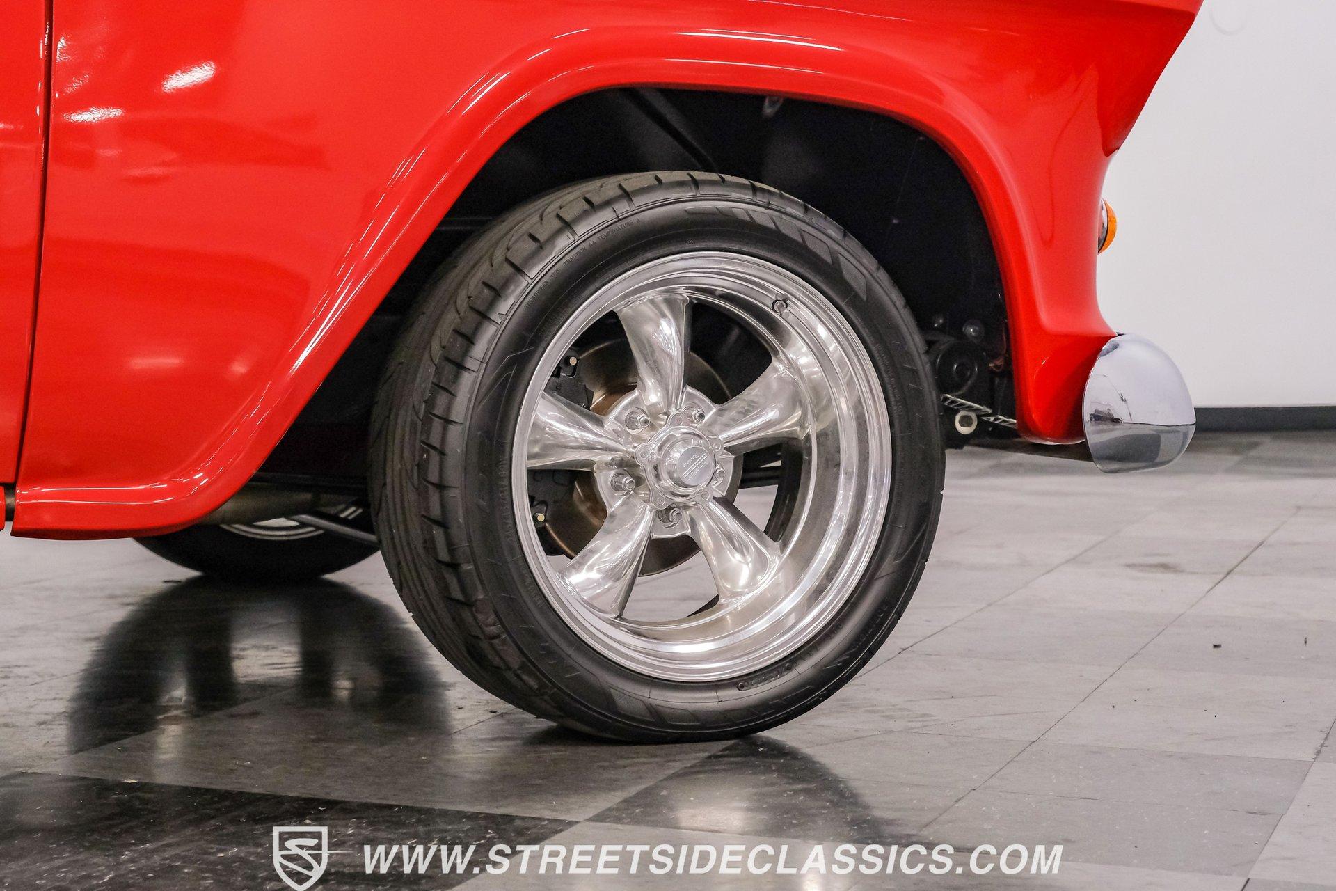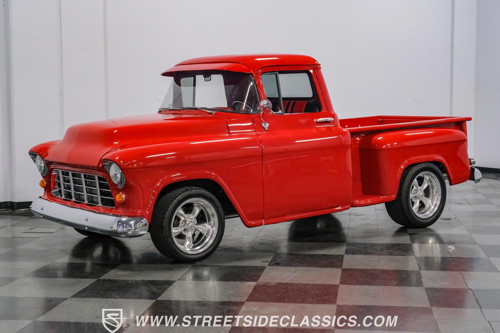 Custom trucks done-up this nice don't come around too often. This 1956 Chevrolet 3100 Custom presents a Metallic Red paint job that just pops out at you. It goes great with the curves of the step-side short-bed look, the retro wheels, and the chrome bumpers. This truck has the perfect stance, a clean undercarriage, and a bed that uses classy wood planks with shiny separators to finish off the look. If you're looking for a vehicle that can go to car shows and draw tons of attention, this is your gem. Just as much time and detail went into the interior as the exterior. Red and black vinyl bench seats create a very cool look, paired with a matching headliner. Black carpeting with a red Chevrolet emblem in the center ties it all together. The door panels and dashboard are painted solid red to match the exterior and are in great shape. The custom gauge cluster includes dolphin aftermarket gauges. To the right is a RetroSound radio, and next to that are the climate controls, which look factory-restored. Complementing the setup is a billet steering wheel and billet gas and brake pedals. In the middle of the floor on the transmission tunnel sits a Lokar shifter handle and brake lever. For added kicks, aftermarket speakers are mounted in the kick panels. The engine bay is nicely painted flat black and houses a rebuilt 454 cubic-inch big-block, finished in Chevy Orange. It's equipped with an aluminum radiator and electric fans, aluminum valve covers, billet pulleys for accessories, and an Edelbrock intake topped with a Holley 4-barrel carburetor. Mated to the big-block is a TH400 3-speed automatic transmission that sends power back to a 12-bolt rear axle. The front suspension features a straight axle with leaf springs and shocks, while the rear uses a solid axle with leaf springs and shocks. American Racing 17-inch wheels sit up front, and 18-inch wheels are mounted in the rear. These are wrapped in 245/45ZR17 Nitto tires in the front and 295/45ZR18 Nitto tires in the rear. Braking is handled by front power disc brakes and rear power drums. Shorty headers push the exhaust through dual pipes and aftermarket mufflers. HIghlights: 454 Cubic-Inch Big-Block Aluminum Radiator With Electric Fans Billet Pulleys For Accessories TH400 3-Speed Automatic Transmission 12-Bolt Rear Axle Front 17-Inch American Racing Wheels With 245/45ZR17 Nitto Tires - 2020 Rear 18-Inch American Racing Wheels With 295/45ZR18 Nitto Tires - 2019 Front Power Disc Brakes Headers, Dual Exhaust, Aftermarket Mufflers Power Steering Air Conditioning Tilt Steering Column RetroSounds AM/FM Radio With Aux Inputs And Bluetooth This is a gorgeous truck for cruising. With only 226 miles on the build, this 1956 Chevrolet 3100 Custom is ready for someone to have a lot of fun in. Whether it's weekend cruising, local car shows, or simply admiring it in your driveway or garage, you can't go wrong with a truck this beautiful. Call Today!