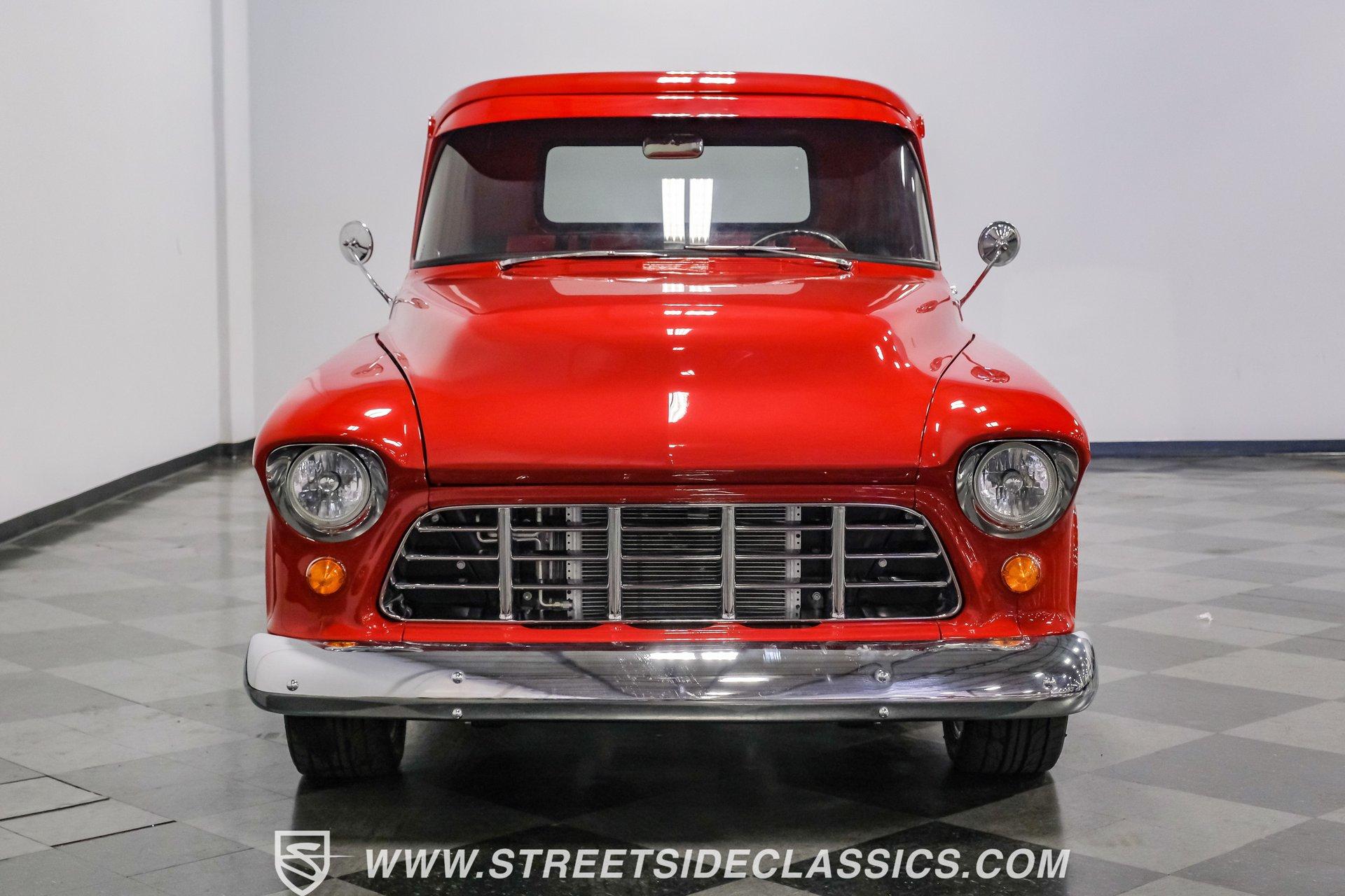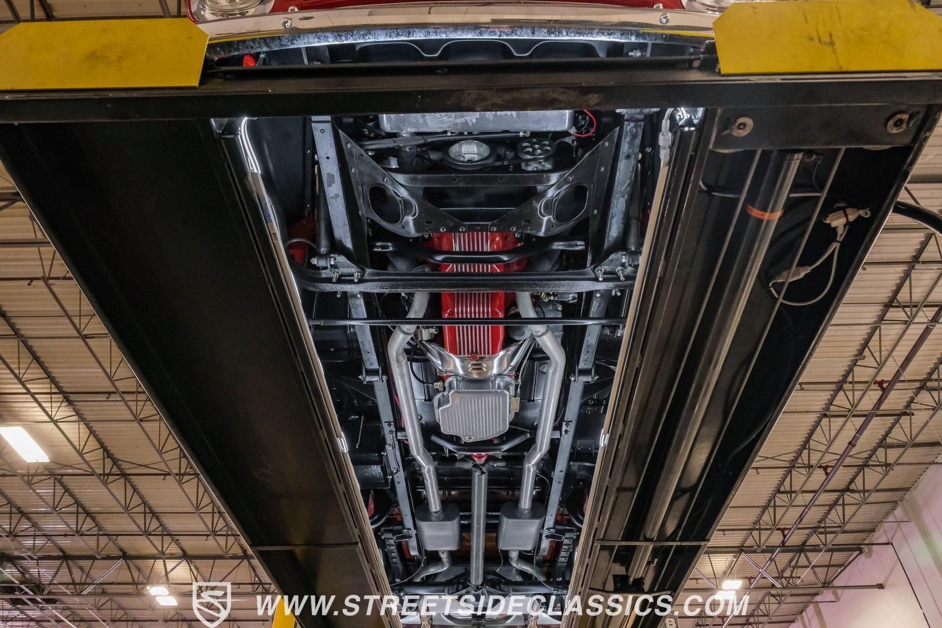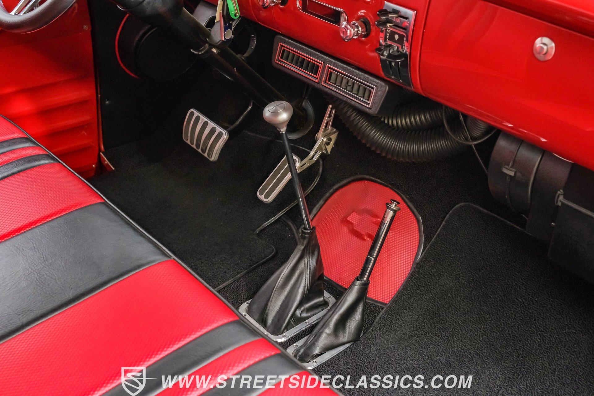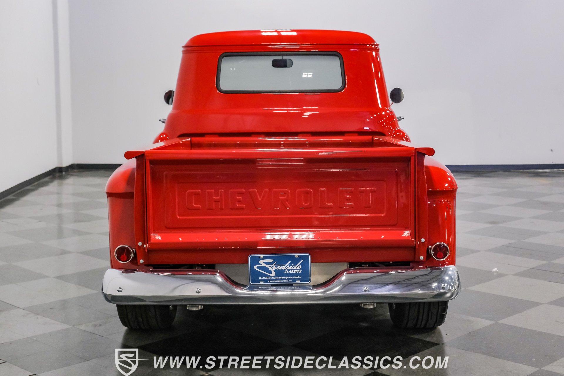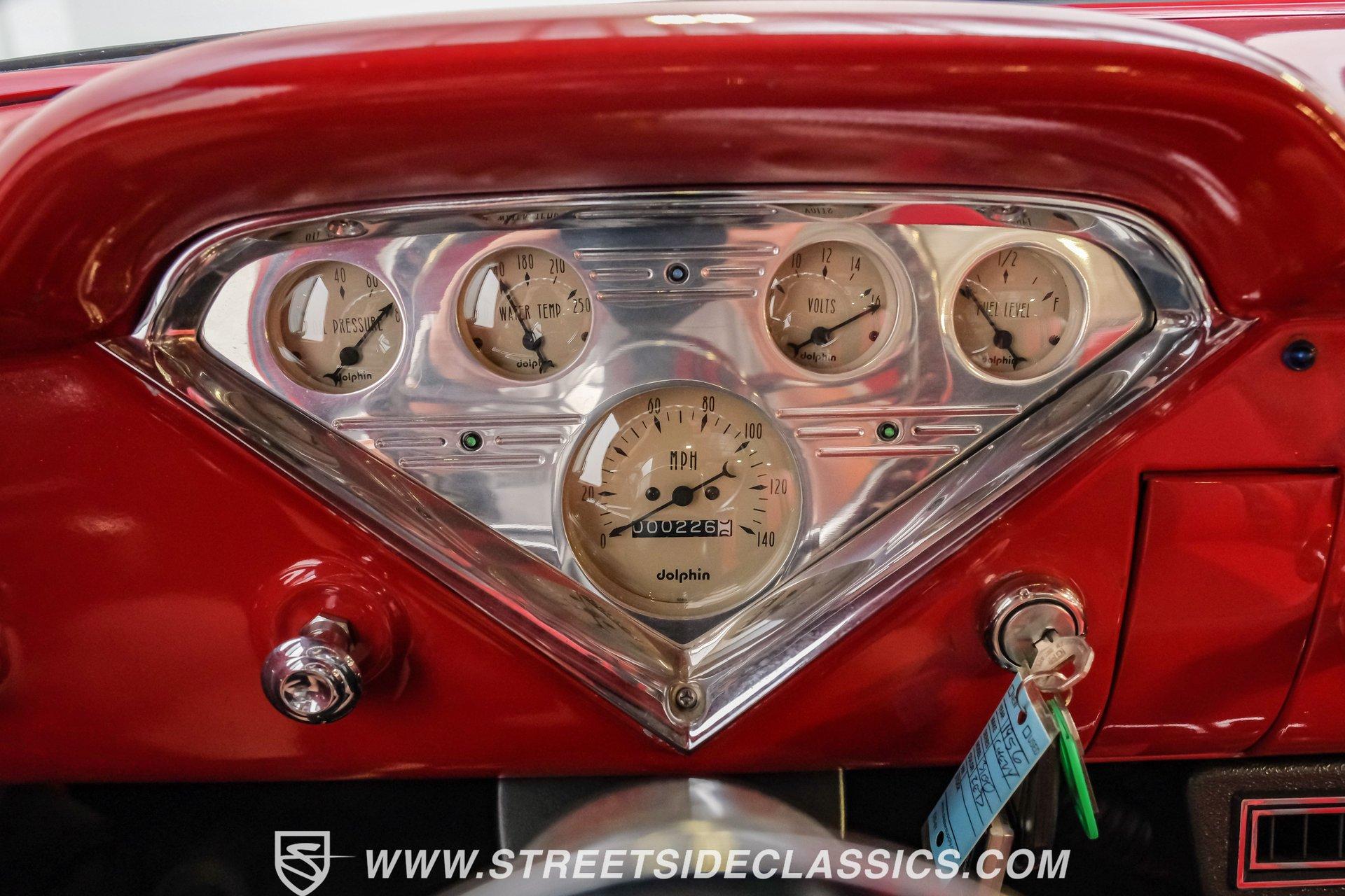 Custom trucks done-up this nice don't come around too often. This 1956 Chevrolet 3100 Custom presents a Metallic Red paint job that just pops out at you. It goes great with the curves of the step-side short-bed look, the retro wheels, and the chrome bumpers. This truck has the perfect stance, a clean undercarriage, and a bed that uses classy wood planks with shiny separators to finish off the look. If you're looking for a vehicle that can go to car shows and draw tons of attention, this is your gem. Just as much time and detail went into the interior as the exterior. Red and black vinyl bench seats create a very cool look, paired with a matching headliner. Black carpeting with a red Chevrolet emblem in the center ties it all together. The door panels and dashboard are painted solid red to match the exterior and are in great shape. The custom gauge cluster includes dolphin aftermarket gauges. To the right is a RetroSound radio, and next to that are the climate controls, which look factory-restored. Complementing the setup is a billet steering wheel and billet gas and brake pedals. In the middle of the floor on the transmission tunnel sits a Lokar shifter handle and brake lever. For added kicks, aftermarket speakers are mounted in the kick panels. The engine bay is nicely painted flat black and houses a rebuilt 454 cubic-inch big-block, finished in Chevy Orange. It's equipped with an aluminum radiator and electric fans, aluminum valve covers, billet pulleys for accessories, and an Edelbrock intake topped with a Holley 4-barrel carburetor. Mated to the big-block is a TH400 3-speed automatic transmission that sends power back to a 12-bolt rear axle. The front suspension features a straight axle with leaf springs and shocks, while the rear uses a solid axle with leaf springs and shocks. American Racing 17-inch wheels sit up front, and 18-inch wheels are mounted in the rear. These are wrapped in 245/45ZR17 Nitto tires in the front and 295/45ZR18 Nitto tires in the rear. Braking is handled by front power disc brakes and rear power drums. Shorty headers push the exhaust through dual pipes and aftermarket mufflers. HIghlights: 454 Cubic-Inch Big-Block Aluminum Radiator With Electric Fans Billet Pulleys For Accessories TH400 3-Speed Automatic Transmission 12-Bolt Rear Axle Front 17-Inch American Racing Wheels With 245/45ZR17 Nitto Tires - 2020 Rear 18-Inch American Racing Wheels With 295/45ZR18 Nitto Tires - 2019 Front Power Disc Brakes Headers, Dual Exhaust, Aftermarket Mufflers Power Steering Air Conditioning Tilt Steering Column RetroSounds AM/FM Radio With Aux Inputs And Bluetooth This is a gorgeous truck for cruising. With only 226 miles on the build, this 1956 Chevrolet 3100 Custom is ready for someone to have a lot of fun in. Whether it's weekend cruising, local car shows, or simply admiring it in your driveway or garage, you can't go wrong with a truck this beautiful. Call Today!