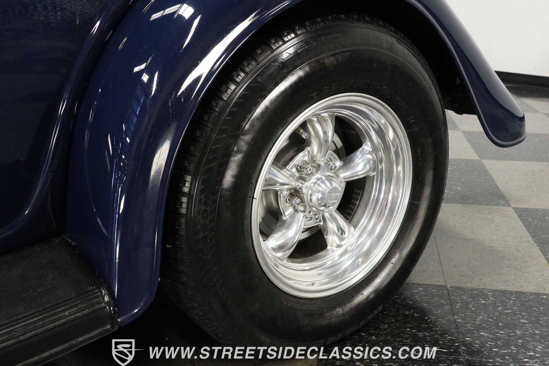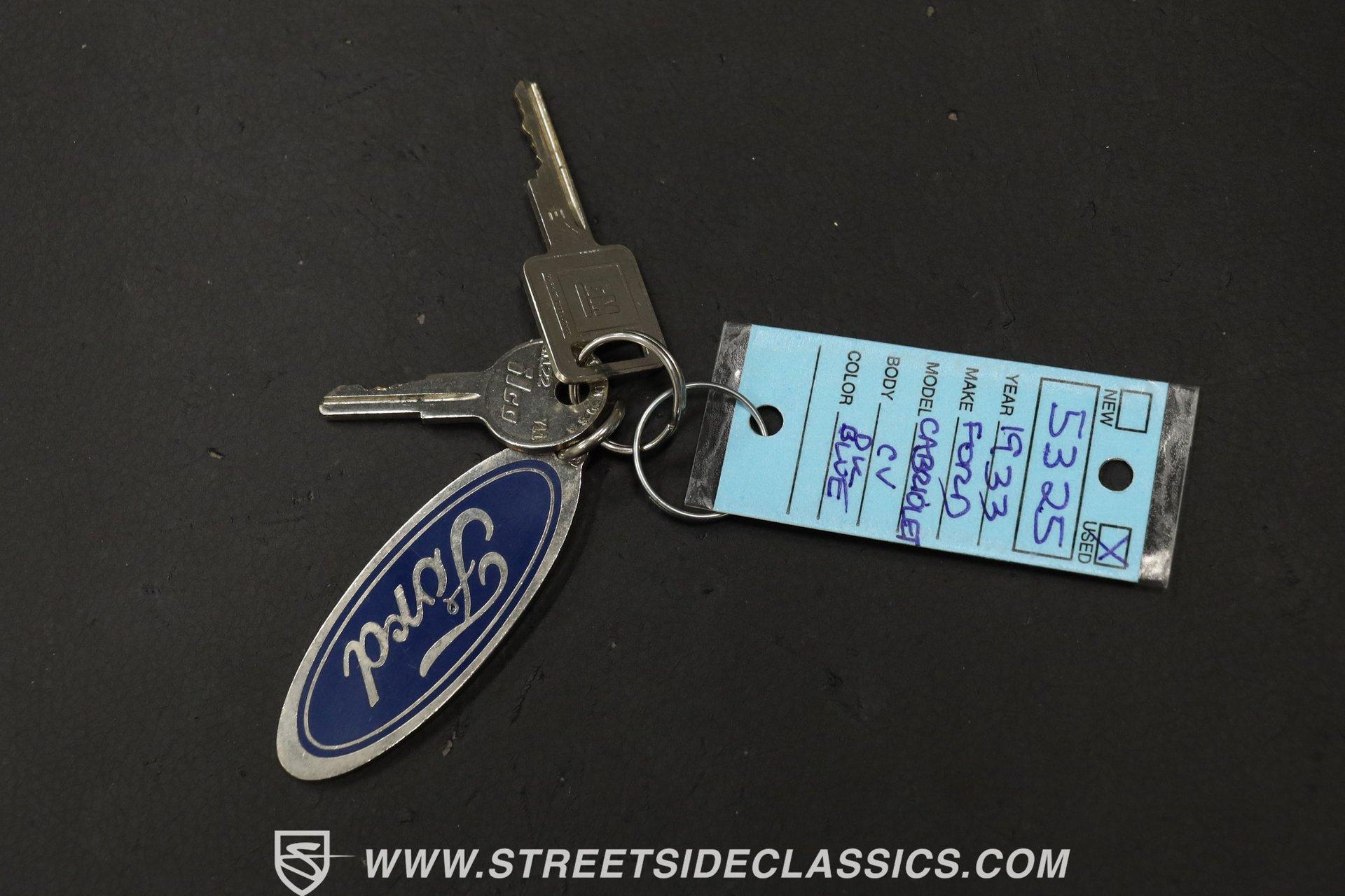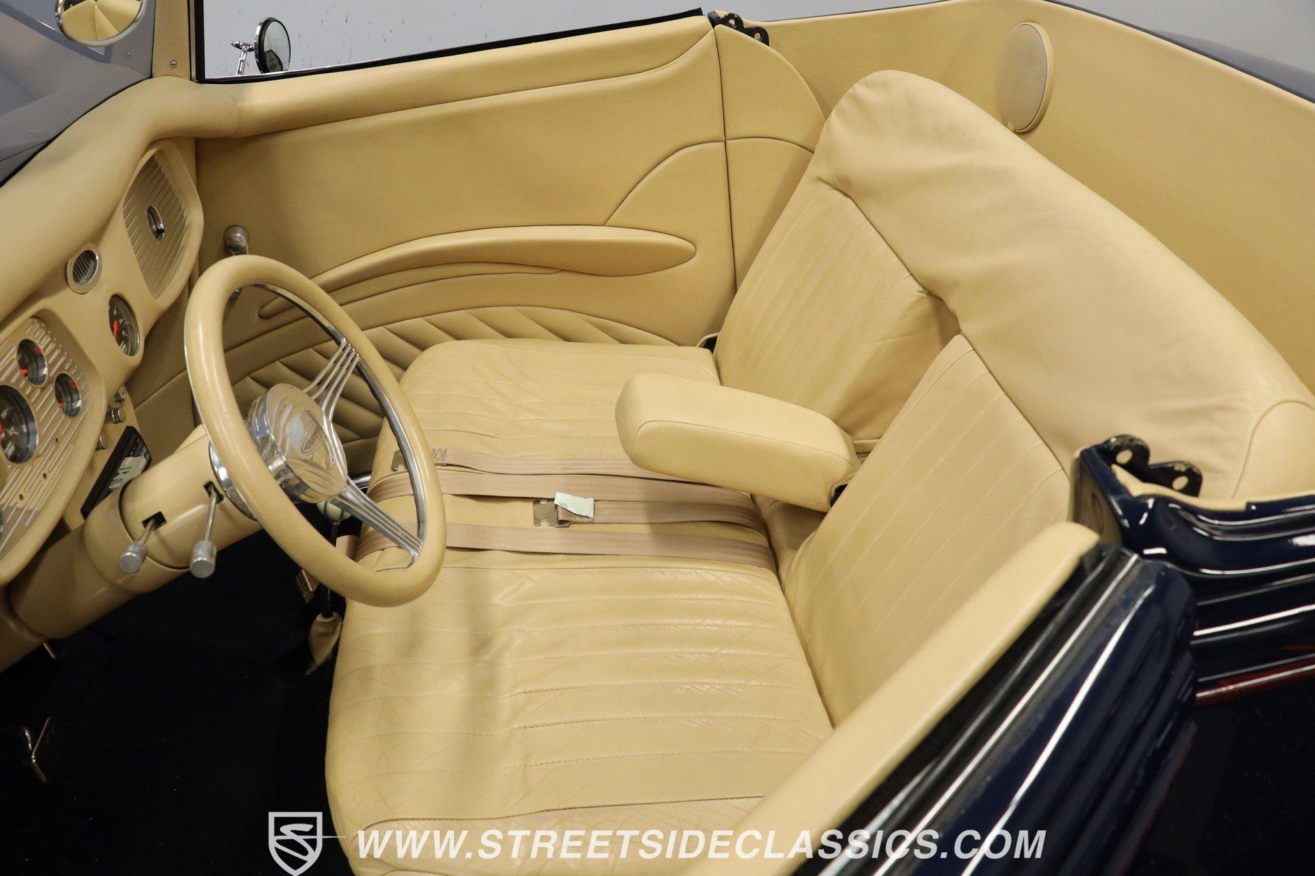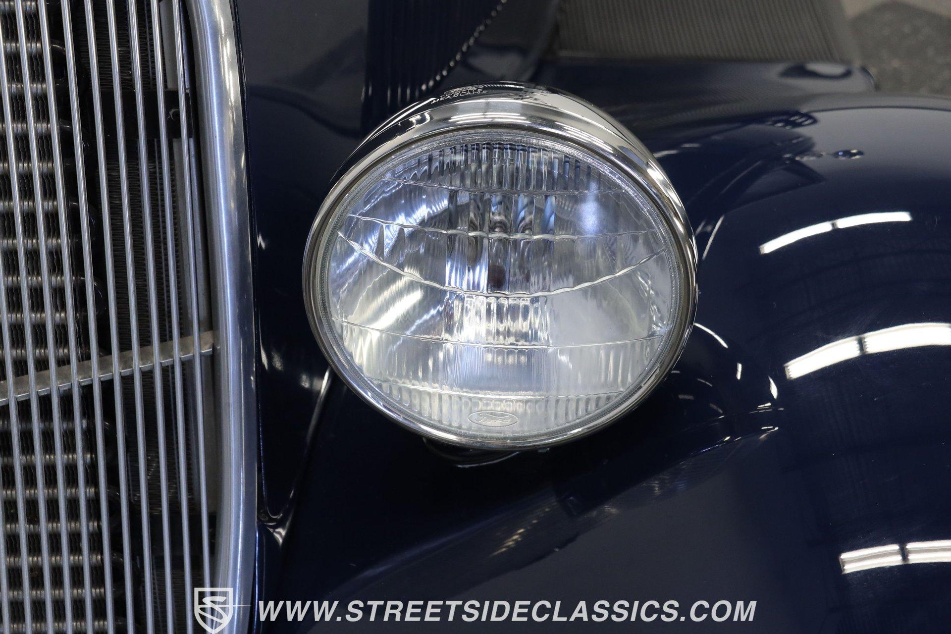 That sculpted front grille sitting between a pair of flared, tapered fenders. Those intricate engine vents. The husky form culminating in an aggressively sloped deck lid. With so much effortless style in one place, it's easy to see why this 1933 Ford Cabriolet makes for such a compelling foundation to build on. This is a great-looking cruiser, dressed in deep blue paint that holds a nice shine. And, where some circa '30s projects put the emphasis almost solely on aesthetics, this one features a collection of mechanical upgrades that make it a fine driver as well. Because it has only logged a little over 5,000 miles since being built, this open-air Ford should be well-positioned to offer many future miles of driving happiness. There's a lot to like about the accompanying interior. With its tan vinyl upholstery, tight, well-fitted door panels, and clean contrasting carpeting, this is a really nice driving environment. An aftermarket Budnik steering wheel sits on a tilt steering column, allowing you to arrive at the perfect driving position, and just in front of it, there's a collection of Auto Meter gauges sitting inside a nicely contoured instrument panel. An Alpine AM/FM/Cassette stereo sits at the center of the dash, teaming with a CD changer mounted in the trunk, to provide you with plenty of audio options. The removable cabriolet hardtop also makes this vintage Ford a viable driving option in less forgiving weather, and it fits nicely to keep the elements at bay. Beneath that distinctive hood sits a 350 cubic-inch V8 engine. It's fed by a 4-barrel Edelbrock carburetor and intake manifold and teams with a 3-speed automatic TH350 transmission that shifts well to result in a powerful, yet reliable drivetrain. An HEI electronic distributor supplies an enhanced, consistent spark while an upgraded aluminum radiator sits at the front of the engine bay to help keep operating temperatures under control. With all these mechanical components functioning in top form, this classic Ford starts promptly and accelerates smoothly. Power brakes that position discs in front supply a level of reliable stopping ability that comes in handy during frequent driving. HIGHLIGHTS ONLY A LITTLE MORE THAN 5,000 MILES ON THIS WELL-CONFIGURED BUILD 350 CUBIC-INCH CRATE ENGINE 4-BARREL CARBURETOR 3-SPEED AUTOMATIC TH350 TRANSMISSION SHORTY HEADERS DUAL EXHAUST, WITH BORLA MUFFLERS POWER STEERING POWER BRAKES WITH FRONT DISCS STAGGERED 14"/15" AMERICAN RACING WHEELS SUPER NICE DARK BLUE EXTERIOR TAN VINYL UPHOLSTERY BEIGE CANVAS CONVERTIBLE TOP BENCH SEATING AIR CONDITIONING COMPONENTS IN PLACE AM/FM/CASSETTE STEREO, COMBINED WITH TRUNK-MOUNTED CD CHANGER Featuring considerable head-turning ability, a well-planned configuration, and a strong driving condition, this 1933 Ford Cabriolet cruises on a set of staggered American Racing wheels that position 14" rims up front and 15" rims in back. It would be a great addition for the collector looking for Art Deco-inspired style combined with a fun experience behind the wheel. Call today!