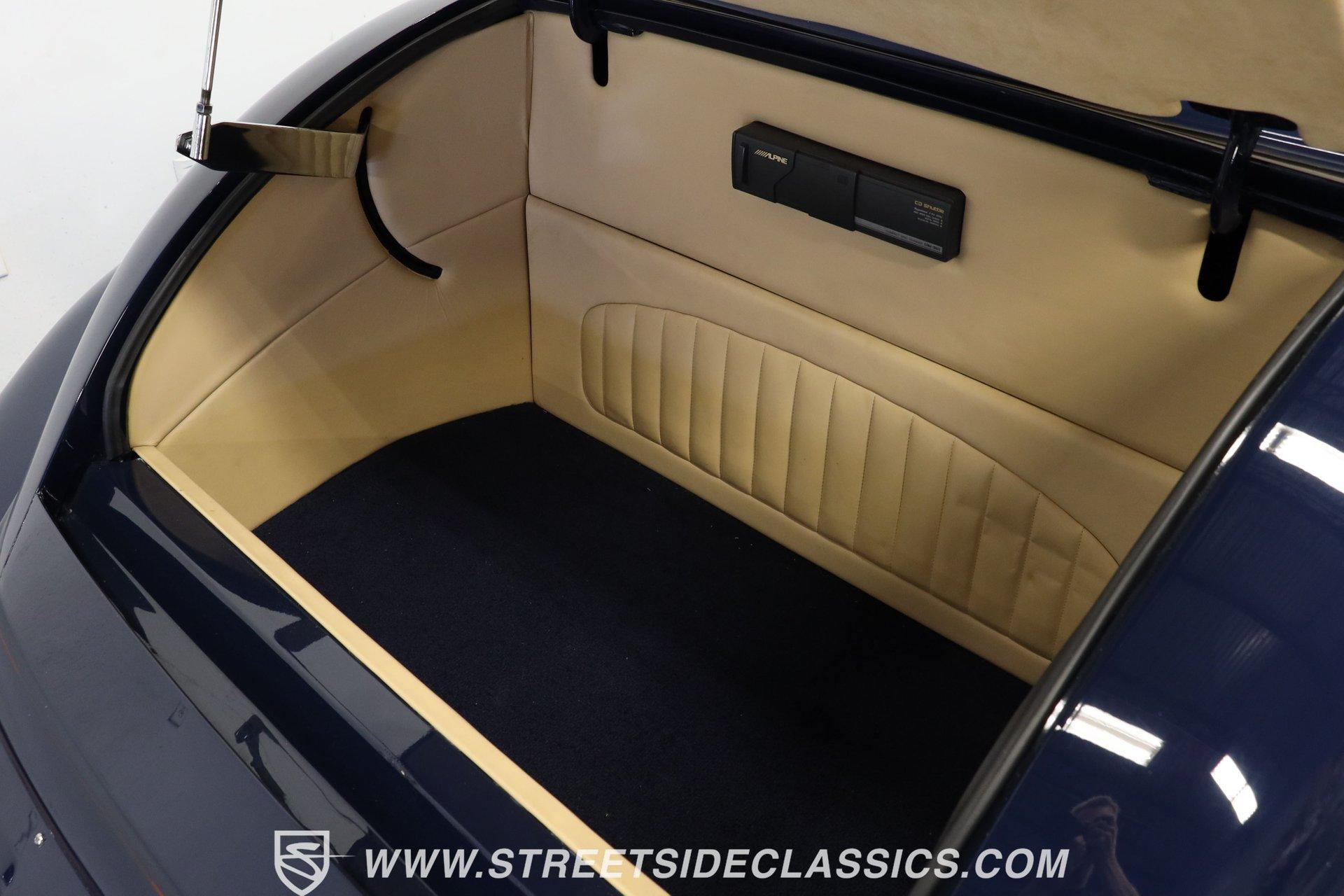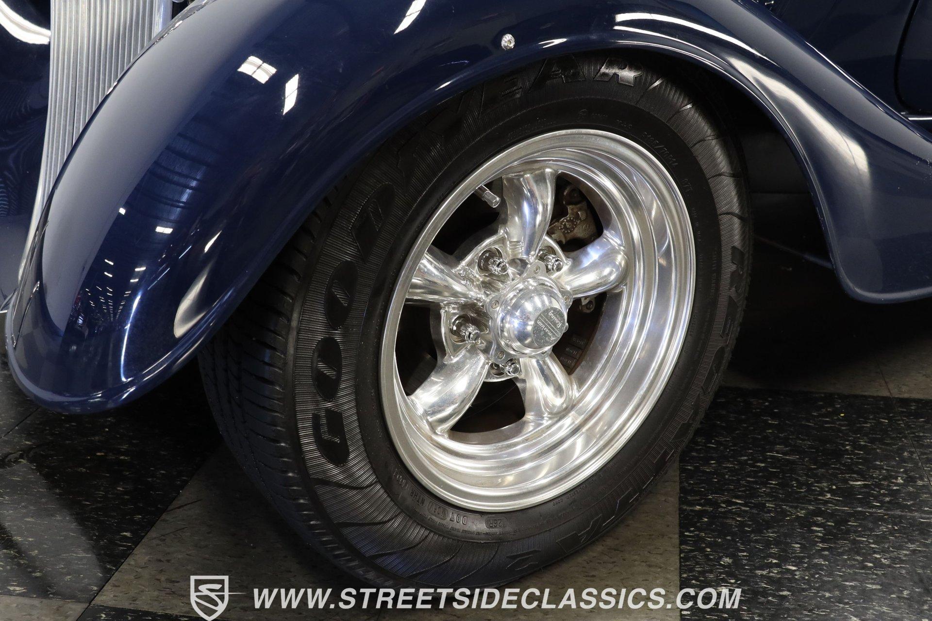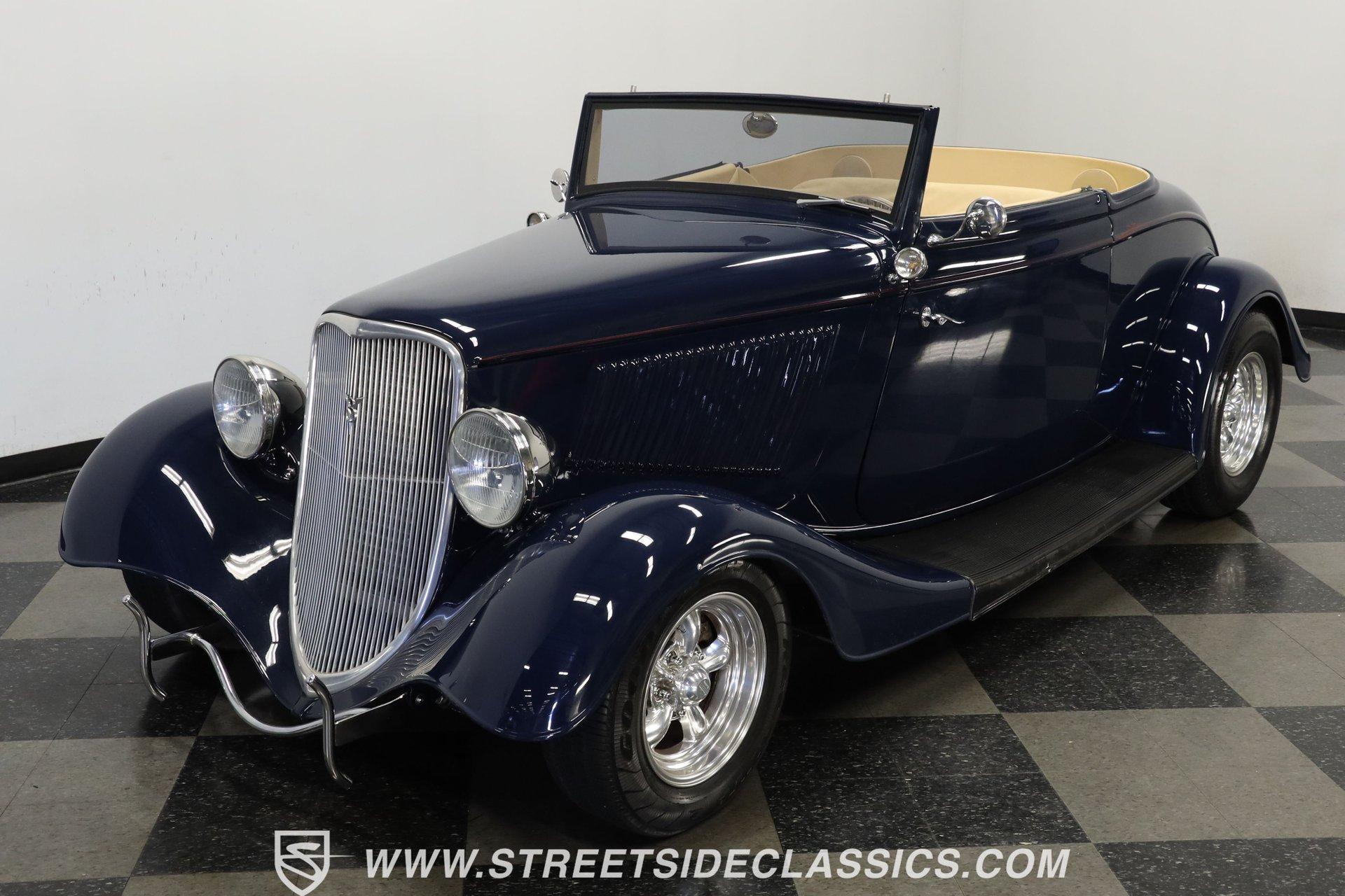 That sculpted front grille sitting between a pair of flared, tapered fenders. Those intricate engine vents. The husky form culminating in an aggressively sloped deck lid. With so much effortless style in one place, it's easy to see why this 1933 Ford Cabriolet makes for such a compelling foundation to build on. This is a great-looking cruiser, dressed in deep blue paint that holds a nice shine. And, where some circa '30s projects put the emphasis almost solely on aesthetics, this one features a collection of mechanical upgrades that make it a fine driver as well. Because it has only logged a little over 5,000 miles since being built, this open-air Ford should be well-positioned to offer many future miles of driving happiness. There's a lot to like about the accompanying interior. With its tan vinyl upholstery, tight, well-fitted door panels, and clean contrasting carpeting, this is a really nice driving environment. An aftermarket Budnik steering wheel sits on a tilt steering column, allowing you to arrive at the perfect driving position, and just in front of it, there's a collection of Auto Meter gauges sitting inside a nicely contoured instrument panel. An Alpine AM/FM/Cassette stereo sits at the center of the dash, teaming with a CD changer mounted in the trunk, to provide you with plenty of audio options. The removable cabriolet hardtop also makes this vintage Ford a viable driving option in less forgiving weather, and it fits nicely to keep the elements at bay. Beneath that distinctive hood sits a 350 cubic-inch V8 engine. It's fed by a 4-barrel Edelbrock carburetor and intake manifold and teams with a 3-speed automatic TH350 transmission that shifts well to result in a powerful, yet reliable drivetrain. An HEI electronic distributor supplies an enhanced, consistent spark while an upgraded aluminum radiator sits at the front of the engine bay to help keep operating temperatures under control. With all these mechanical components functioning in top form, this classic Ford starts promptly and accelerates smoothly. Power brakes that position discs in front supply a level of reliable stopping ability that comes in handy during frequent driving. HIGHLIGHTS ONLY A LITTLE MORE THAN 5,000 MILES ON THIS WELL-CONFIGURED BUILD 350 CUBIC-INCH CRATE ENGINE 4-BARREL CARBURETOR 3-SPEED AUTOMATIC TH350 TRANSMISSION SHORTY HEADERS DUAL EXHAUST, WITH BORLA MUFFLERS POWER STEERING POWER BRAKES WITH FRONT DISCS STAGGERED 14"/15" AMERICAN RACING WHEELS SUPER NICE DARK BLUE EXTERIOR TAN VINYL UPHOLSTERY BEIGE CANVAS CONVERTIBLE TOP BENCH SEATING AIR CONDITIONING COMPONENTS IN PLACE AM/FM/CASSETTE STEREO, COMBINED WITH TRUNK-MOUNTED CD CHANGER Featuring considerable head-turning ability, a well-planned configuration, and a strong driving condition, this 1933 Ford Cabriolet cruises on a set of staggered American Racing wheels that position 14" rims up front and 15" rims in back. It would be a great addition for the collector looking for Art Deco-inspired style combined with a fun experience behind the wheel. Call today!