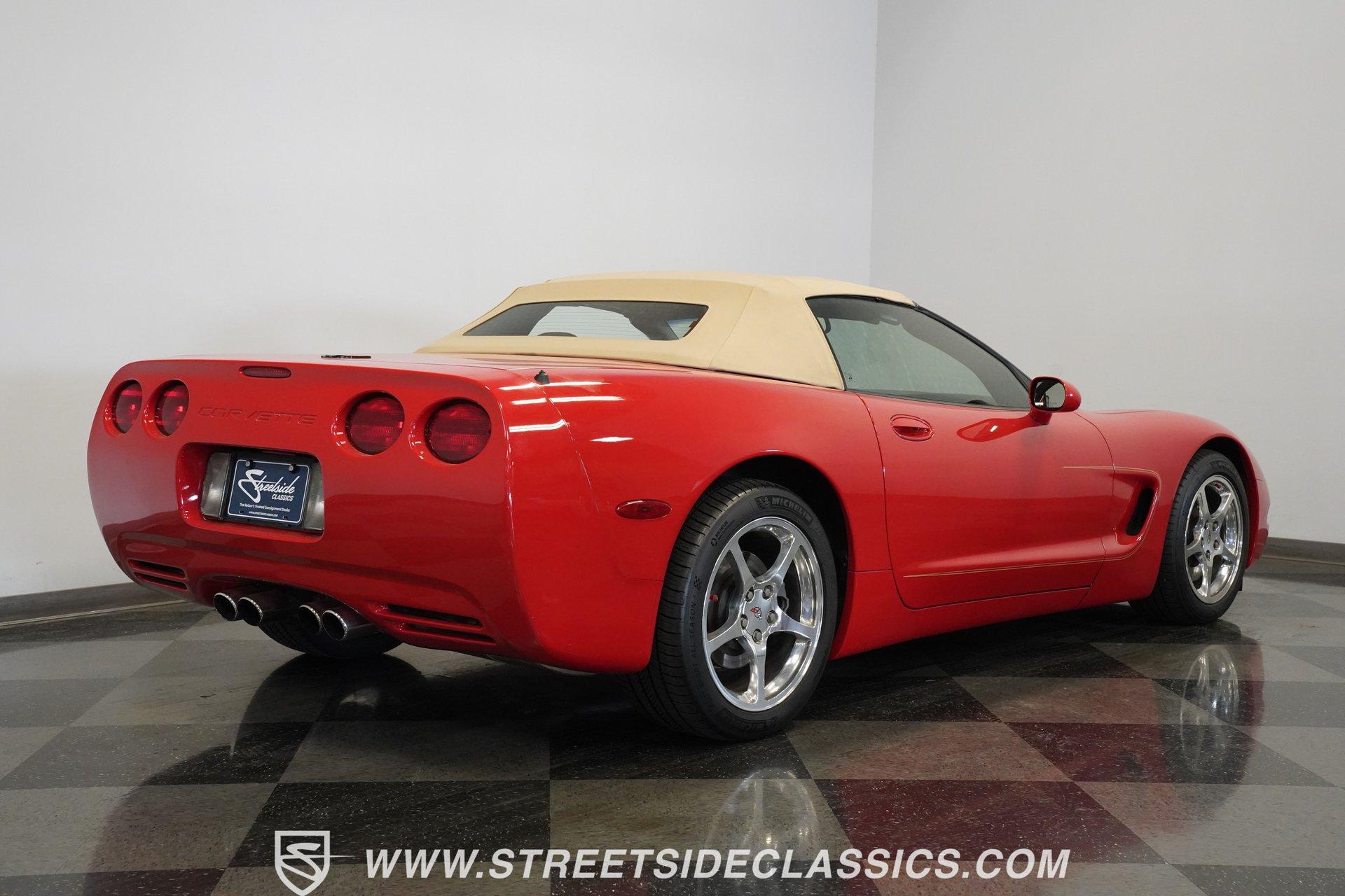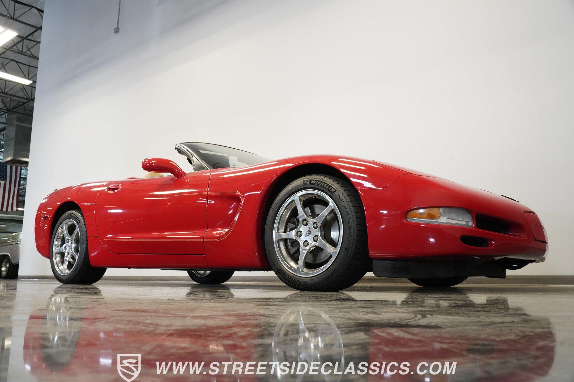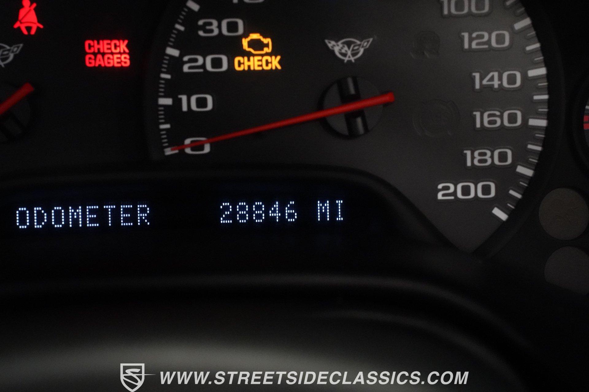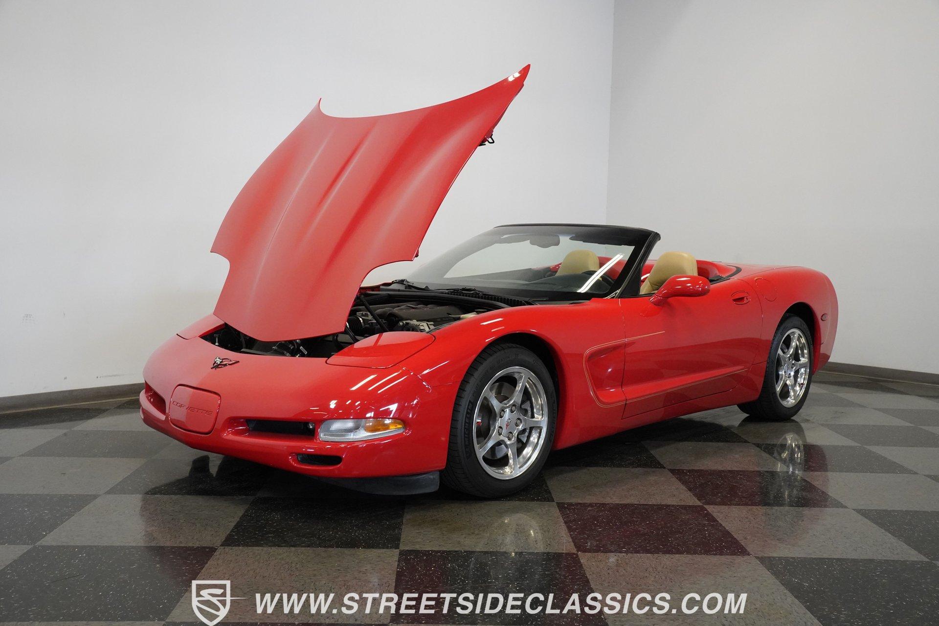 When it debuted in 1997, the C5 had the distinction of being the first Corvette designed as a convertible first, and then as a coupe. That design decision made the fifth-generation 'Vette the most structurally sound drop-top in Corvette history to date, making it feel safe and secure with or without a roof. With just 28,845 actual miles on its odometer, this 2001 Chevrolet Corvette Convertible, decked out in its original Torch Red paint, looks and feels almost new. Inside, we find a plush, two-tone Shale leather interior contrasted by sleek black trim features dual power bucket seats complete with lumbar support, separated by a beautiful center body color teardrop that displays the iconic Crossed Flags emblem. A four-spoke padded steering wheel sits in front of a six-pod analog gauge cluster, featuring a large 7,000 rpm tachometer and a matching 200 mph speedometer, each flanked by a pair of auxiliary gauges on either side. The convertible top was made for manual operation to keep weight down, but the locks, windows, and mirrors are all power-assisted. Another C5 introduced feature is the trick Heads-Up Display, allowing the driver to keep an eye on both speed and the road at the same time. The original AC Delco AM/FM/CD player is situated above the push-button dual-zone HVAC controls, allowing both the driver and passenger to easily customize the soundtrack and temperature. Underneath that signature front-hinged fiberglass hood, we find a 5.7-liter LS1 V-8 engine. One of the most advanced overhead valve engines to date, the LS1 made use of a lightweight aluminum block and heads setup, a 10.1:1 compression ratio, and a composite intake manifold to crank out an advertised 350 horsepower and 375 pound-feet of torque when equipped with a manual transmission. That transmission is a rear-mounted Tremec T56 six-speed manual transaxle that transfers power to the pavement via a limited-slip differential. A staggered set of wheels and tires measuring 17-inch polished five-spoke wheels shod in new 245/45ZR-17 Michelin Pilot Sport rubber, while a larger set of 18-inch wheels wrapped in wider 285/40ZR-18 Michelins out back to give this sports car an aggressive stance and look from any angle. HIGHLIGHTS: 28,845 Actual Miles Original Torch Red Paint Believed Original LS1 V8 Believed Original Tremec T56 Manual Top Power Windows Power Locks Power Mirrors Power Seats AC Cruise ABS Four Wheel Discs 2025 Michelin Pilot Sport Tires This 2001 Chevrolet Corvette Convertible rides on a fully independent suspension, with a set of four-wheel power disc brakes ready to scrub off speed at a moment's notice. If you missed your chance the first time around, this extremely low-mileage C5's fun factor is still a ten, thanks to its drop-top setup and tried-and-true manual transmission. The C5 was a revolutionary design that remains impressive all these years later. But don't wait because this one won't be around here long. Call today!