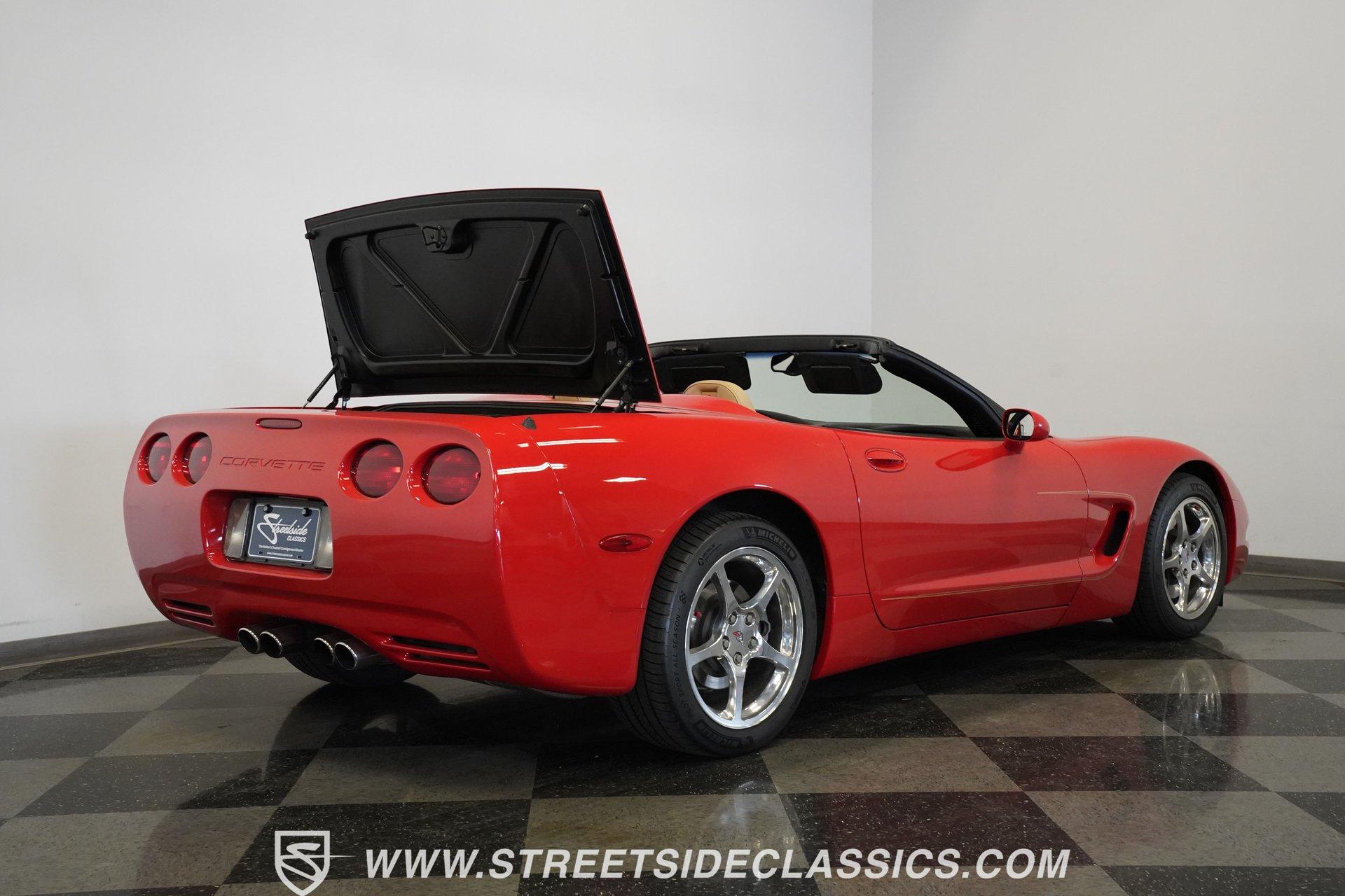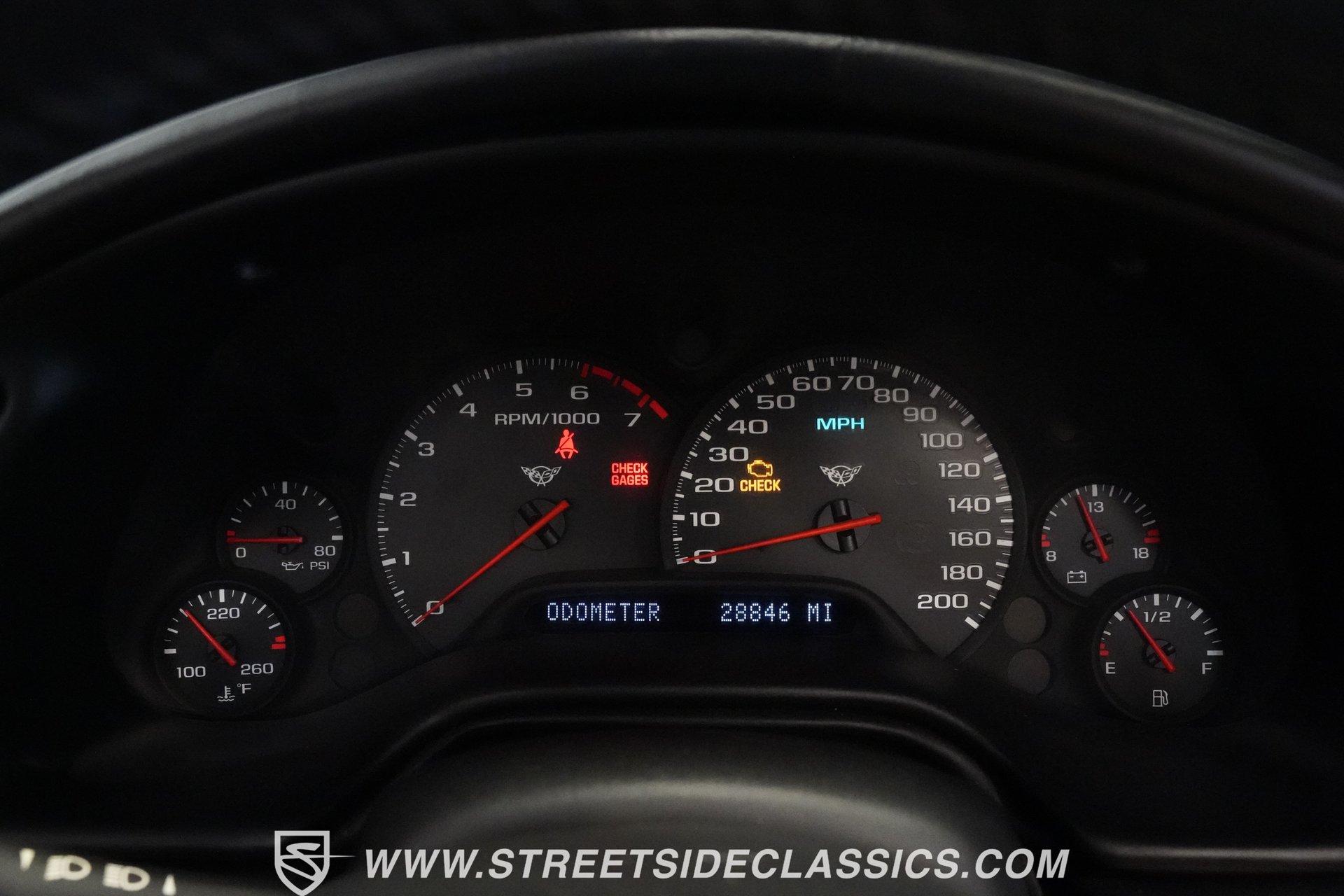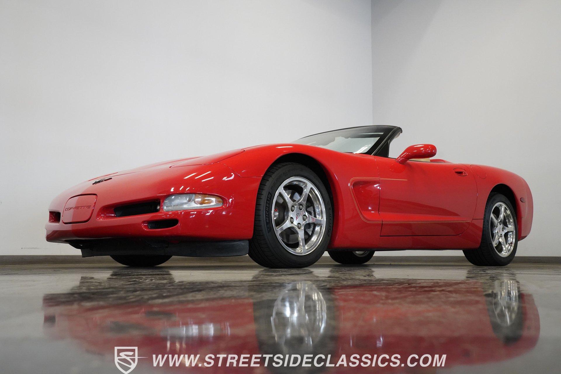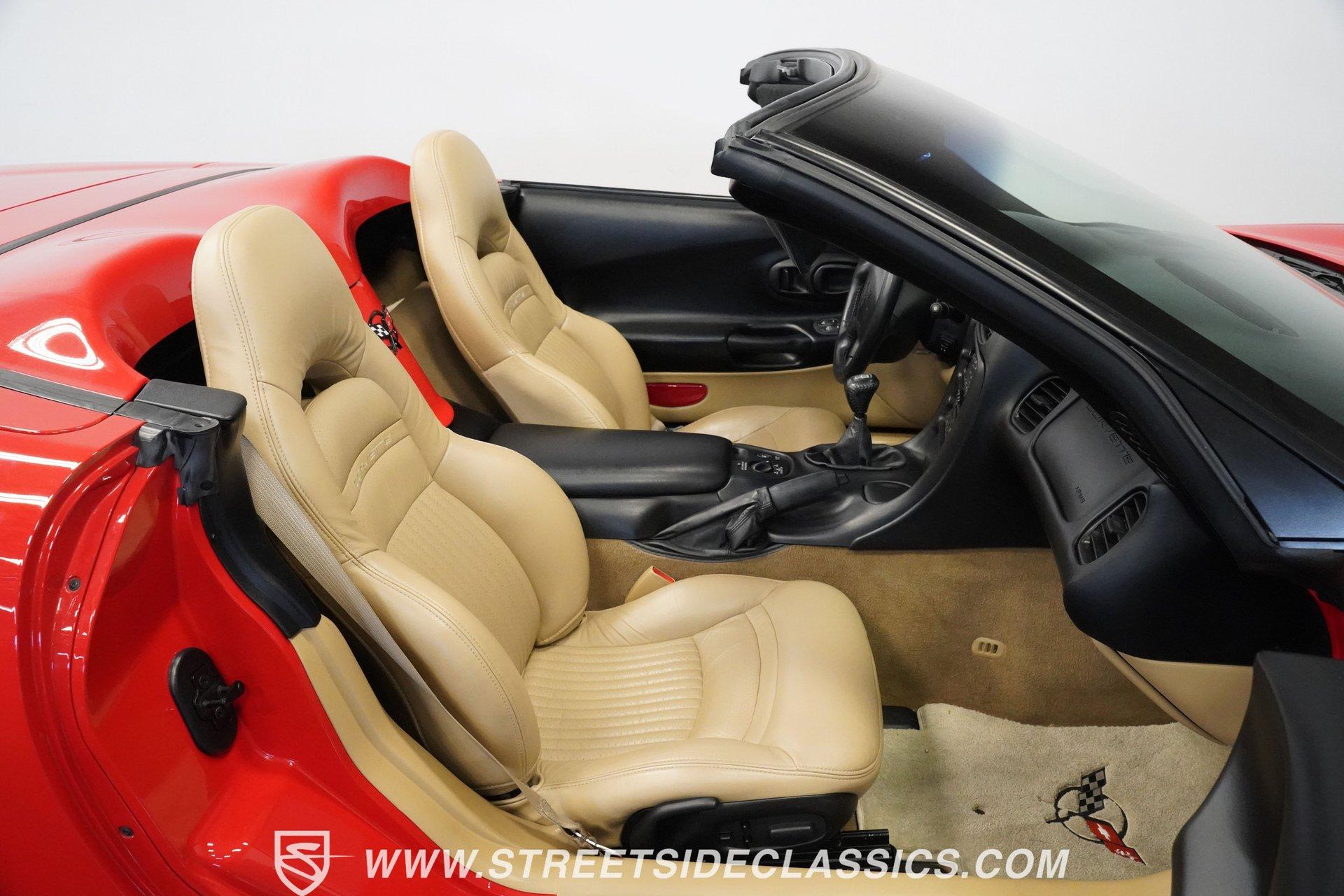 When it debuted in 1997, the C5 had the distinction of being the first Corvette designed as a convertible first, and then as a coupe. That design decision made the fifth-generation 'Vette the most structurally sound drop-top in Corvette history to date, making it feel safe and secure with or without a roof. With just 28,845 actual miles on its odometer, this 2001 Chevrolet Corvette Convertible, decked out in its original Torch Red paint, looks and feels almost new. Inside, we find a plush, two-tone Shale leather interior contrasted by sleek black trim features dual power bucket seats complete with lumbar support, separated by a beautiful center body color teardrop that displays the iconic Crossed Flags emblem. A four-spoke padded steering wheel sits in front of a six-pod analog gauge cluster, featuring a large 7,000 rpm tachometer and a matching 200 mph speedometer, each flanked by a pair of auxiliary gauges on either side. The convertible top was made for manual operation to keep weight down, but the locks, windows, and mirrors are all power-assisted. Another C5 introduced feature is the trick Heads-Up Display, allowing the driver to keep an eye on both speed and the road at the same time. The original AC Delco AM/FM/CD player is situated above the push-button dual-zone HVAC controls, allowing both the driver and passenger to easily customize the soundtrack and temperature. Underneath that signature front-hinged fiberglass hood, we find a 5.7-liter LS1 V-8 engine. One of the most advanced overhead valve engines to date, the LS1 made use of a lightweight aluminum block and heads setup, a 10.1:1 compression ratio, and a composite intake manifold to crank out an advertised 350 horsepower and 375 pound-feet of torque when equipped with a manual transmission. That transmission is a rear-mounted Tremec T56 six-speed manual transaxle that transfers power to the pavement via a limited-slip differential. A staggered set of wheels and tires measuring 17-inch polished five-spoke wheels shod in new 245/45ZR-17 Michelin Pilot Sport rubber, while a larger set of 18-inch wheels wrapped in wider 285/40ZR-18 Michelins out back to give this sports car an aggressive stance and look from any angle. HIGHLIGHTS: 28,845 Actual Miles Original Torch Red Paint Believed Original LS1 V8 Believed Original Tremec T56 Manual Top Power Windows Power Locks Power Mirrors Power Seats AC Cruise ABS Four Wheel Discs 2025 Michelin Pilot Sport Tires This 2001 Chevrolet Corvette Convertible rides on a fully independent suspension, with a set of four-wheel power disc brakes ready to scrub off speed at a moment's notice. If you missed your chance the first time around, this extremely low-mileage C5's fun factor is still a ten, thanks to its drop-top setup and tried-and-true manual transmission. The C5 was a revolutionary design that remains impressive all these years later. But don't wait because this one won't be around here long. Call today!