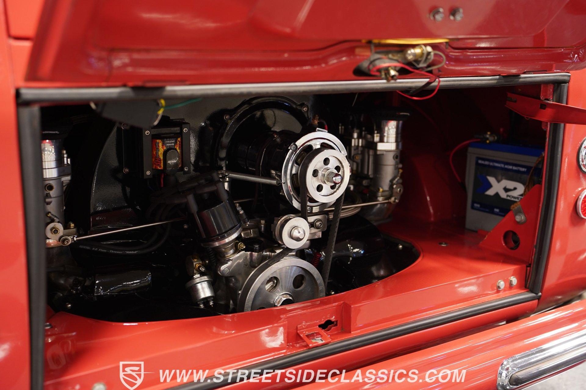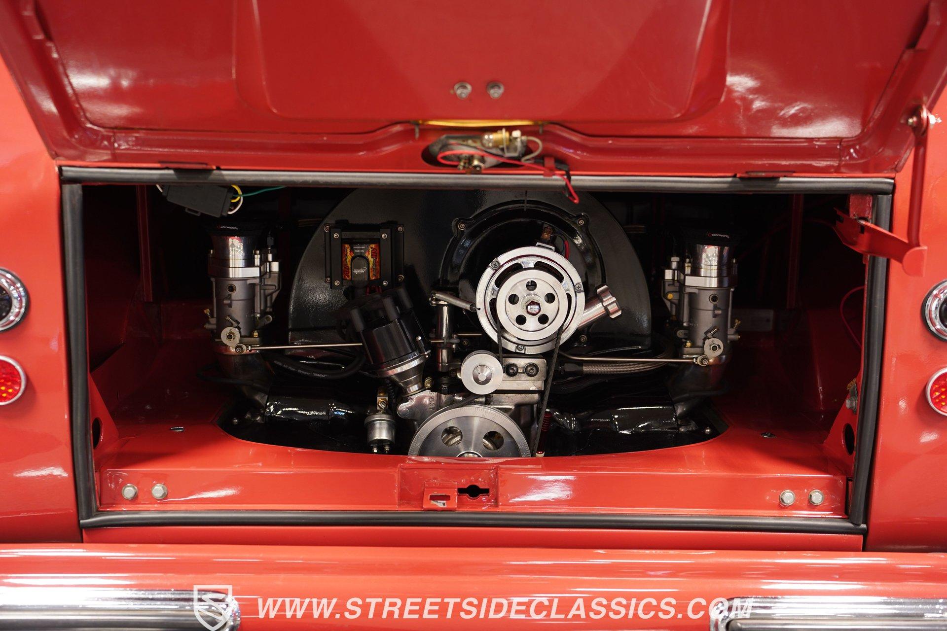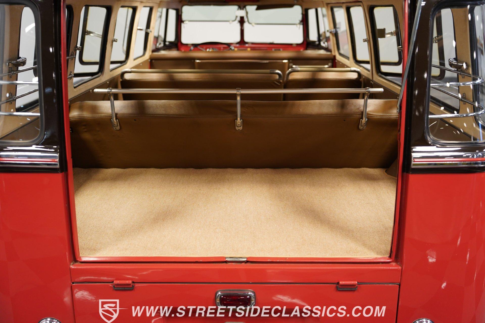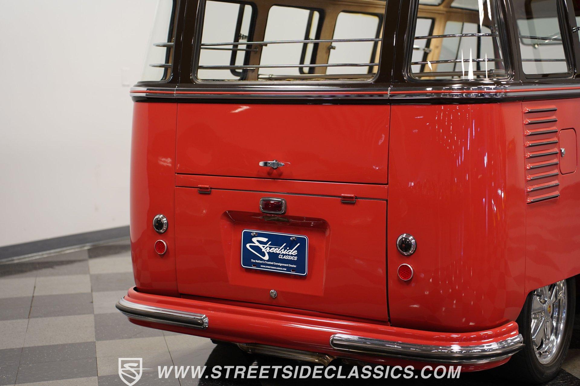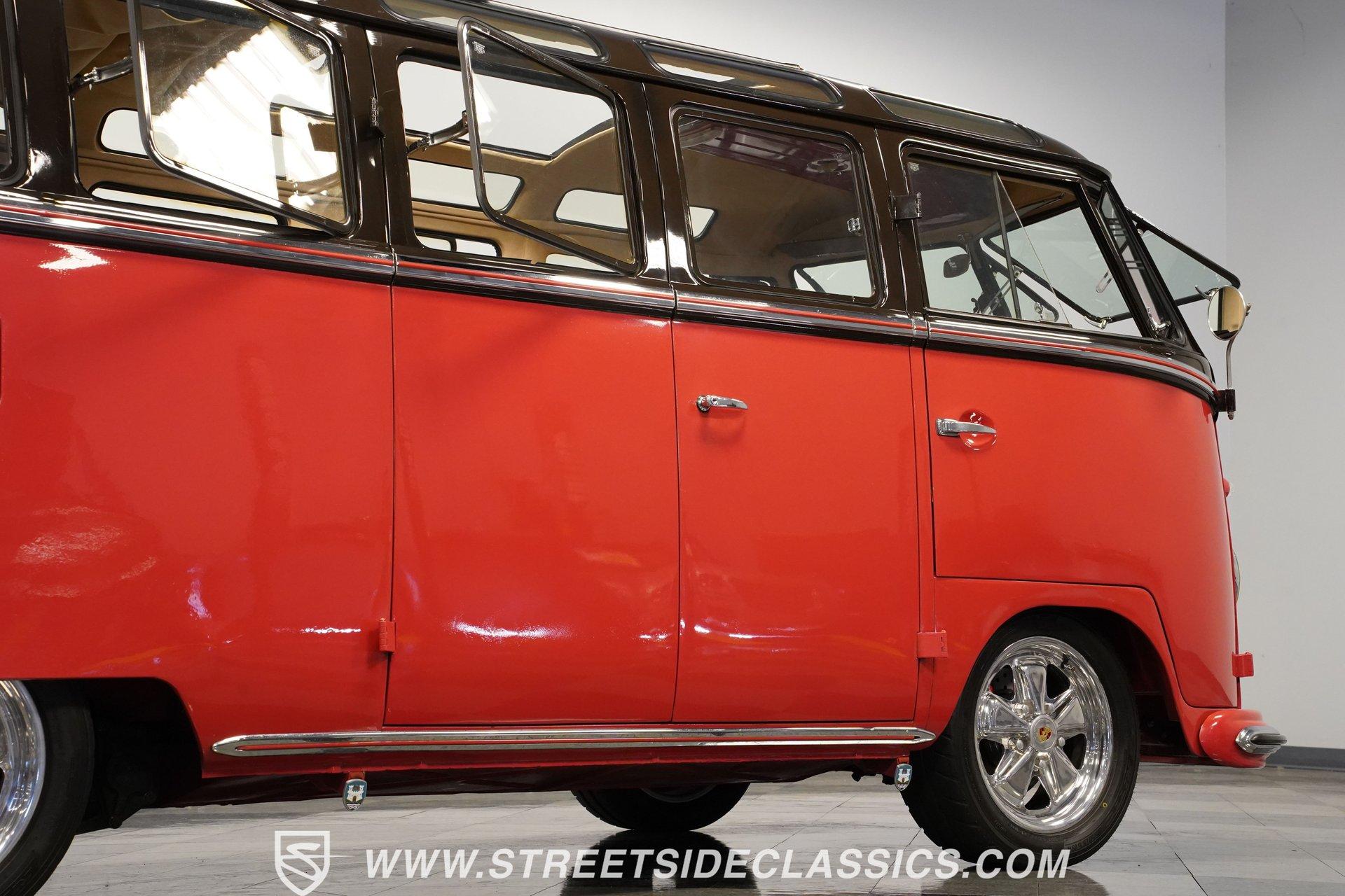 It's an early representative of a model that went on to be one of the most symbolic automotive offerings ever created. It features an impressive level of scarcity, as only about 5-10 percent of its kind sported its unique, high-visibility, open-air configuration. And, perhaps just as importantly, it's configured to provide an experience behind the wheel that few of its early VW counterparts could ever come close to matching. Yes, this 1957 Volkswagen Type 2 23-Window Deluxe Samba is one very special vehicle. It greets the present in strong form, wearing a two-tone, Sealing Wax Red and Chestnut Brown color scheme that's emblematic of its era and sporting consistent body lines and panel gaps to go along with its extensive collection of clear window glass and clean chrome trim. And check out that classic-looking luggage rack on top! The interior is in great condition and is dressed in period-correct colors. There's enough seating inside to accommodate a large group - a fine dividend of the Samba's origin as a vehicle designed to shepherd up to nine passengers on scenic excursions - and all of it is covered in tan vinyl that really shows well. The combination of no less than 23 windows and a canvas sunroof that slides open to reveal a large skylight window creates a passenger experience like no other, and the featured pop-out, safari-style front windows are fully functional. The dash area has been nicely refreshed and houses an original Blaupunkt AM radio. It will need a little attention to get back online, but creates a convincingly authentic look inside the cabin. A collection of well-chosen mechanical upgrades equips this iconic bus with a drivability that's downright impressive for its vehicle class. Its 2110cc rear-mounted engine is fed by a quartet of EMPI single-barrel carburetors, resulting in plenty of power to negotiate everyday driving conditions, and it sits in a clean engine bay that's protected by a fire suppression system. An upgraded transaxle affords this German classic the ability to handle consistent freeway driving without worry, while a newly installed steering box makes for surprisingly precise navigation. With disc brakes at both ends, including a Wilwood kit up front, it also has confidence-instilling stopping ability. Yes, it's pretty unlikely that you've come across a VW bus that handles and drives as well as this one does. HIGHLIGHTS SEALING WAX RED AND CHESTNUT BROWN EXTERIOR 2110 CC ENGINE EMPI QUAD SINGLE BARREL CARBURETORS 4-SPEED MANUAL TRANSMISSION FIRE SUPPRESSION SYSTEM IN ENGINE COMPARTMENT UPGRADED TRANSAXEL NEW STEERING BOX 15" PORSCHE FUCHS WHEELS DISC BRAKES WITH WILWOOD FRONT BRAKE KIT PERIOD CORRECT AM RADIO Riding just a touch lower than its factory spec, which only adds to its standout curb appeal, this 1957 Volkswagen Type 2 23-Window Deluxe Samba rolls on a set of 15" Porsche Fuchs wheels wrapped with Nitto tires and must be seen in person to be fully appreciated. Call today!