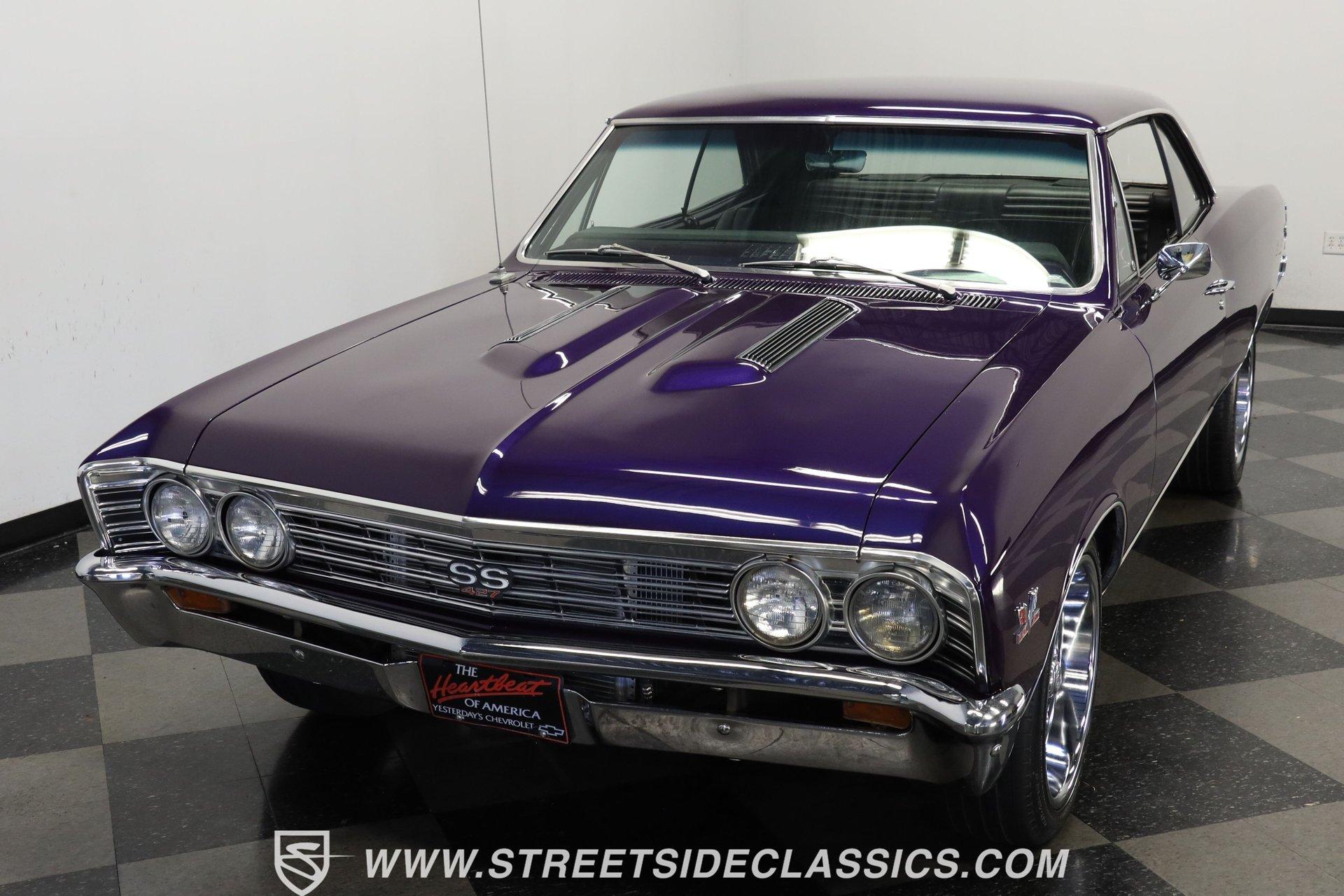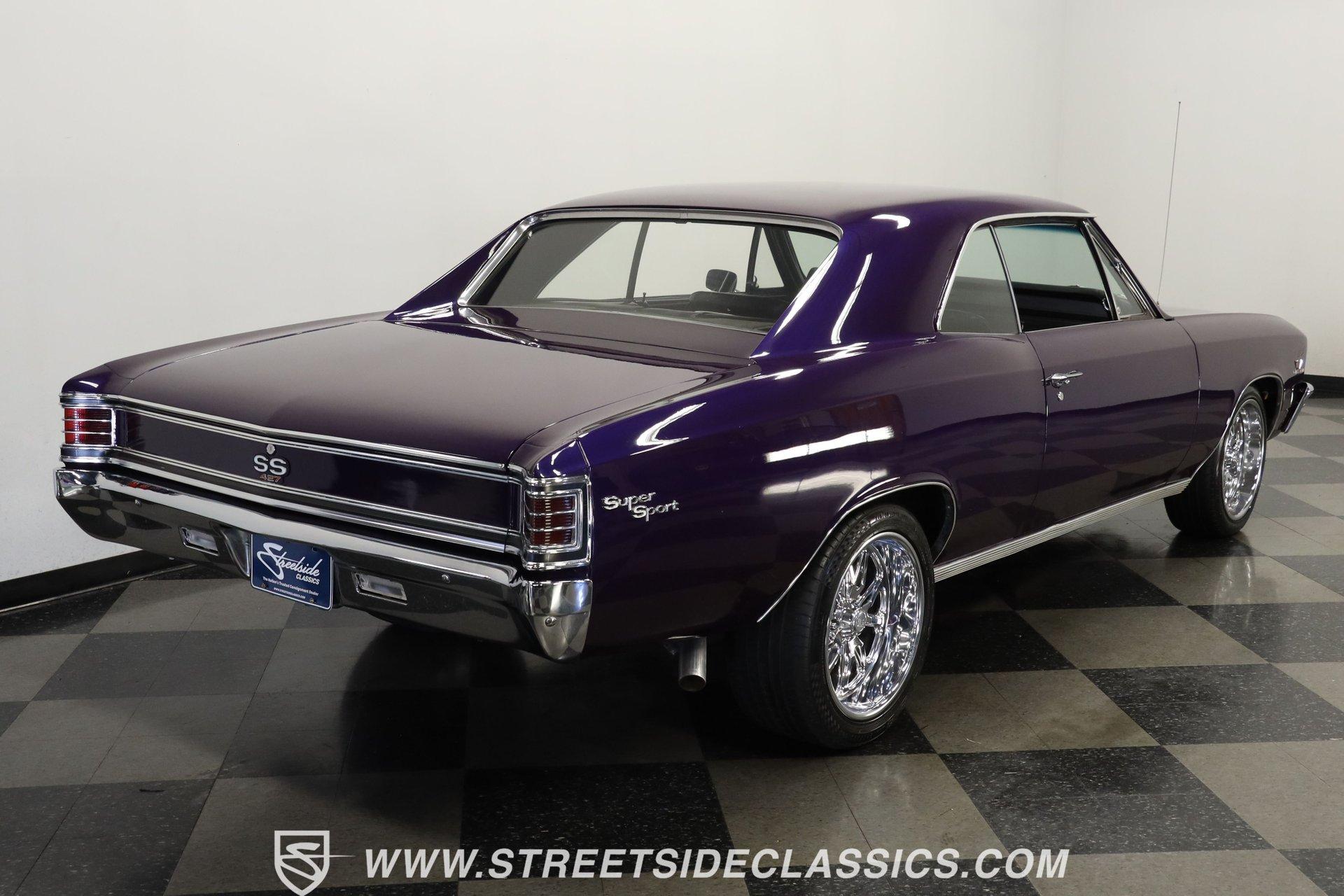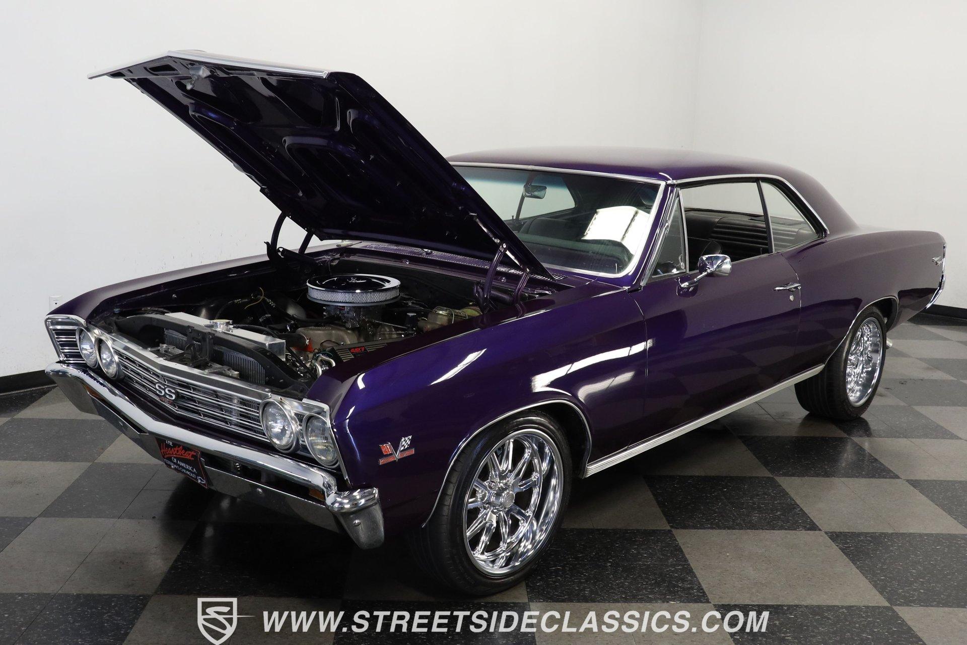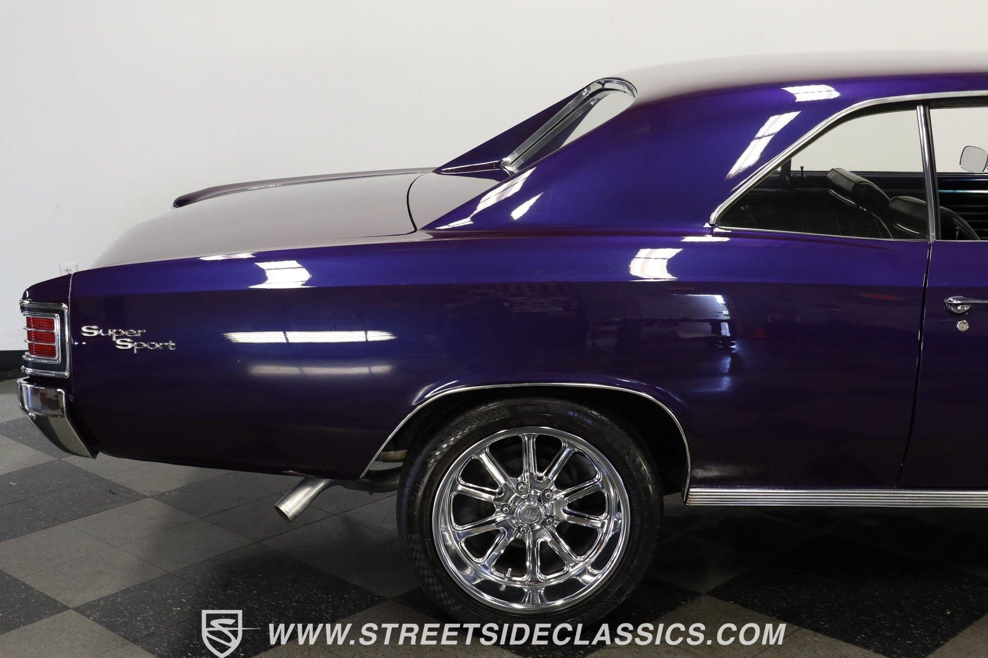 Of all the cars Chevrolet has resurrected over the years, unfortunately, the iconic Chevelle has yet to be one of them. But, on the bright side, that refusal does make cars like this 1967 Chevrolet Chevelle SS 396 even more valuable in the hearts of true enthusiasts. Fully repainted in a unique and eye-catching Purple Metallic, this SS looks subtly aggressive from any angle. Inside, a sea of black invites drivers and passengers aboard. Dual bucket seats offer a great view through the expansive windshield. Just beyond the three-spoke power-assisted steering wheel sits a horizontal 120 mph speedometer, flanked by a fuel gauge and an analog clock on either side. A pair of auxiliary gauges is mounted just below the dashboard. An AM/FM/Cassette player head unit offers more soundtrack options than the original unit it replaces, while air conditioning keeps everyone cool even on the longest of road trips. Under the hood, we find a 396 cubic-inch overhead valve V-8 engine. Equipped with an Edelbrock single 4-barrel carb and intake, long tube headers, and a FlowMaster dual exhaust, this big block routes power through a Muncie M20 four-speed manual transmission on its way to a 12-bolt rear. A set of 18-inch U.S. Mags wheels sits at all four corners, shod in modern 275/40ZR-18 rubber out back, while a narrower set of 235/45ZR-18 up front handles steering duties. HIGHLIGHTS: Real Super Sport (138 in the vin) Purple Metallic Repaint 396 CID V8 Edelbrock Four Barrel Longs Tubes FlowMasters Muncie M20 Four Speed 12 Bolt Rear US Mags Wheels Power Brakes Front Disc Brakes Power Steering Black Vinyl AC AM/FM/Cassette Seatbelts This 1967 Chevrolet Chevelle SS 396 is equipped with a solid axle suspension. Power brakes, which include a pair of front discs, are ready to scrub off speed whenever needed. So, while we will continue to lobby GM to bring back a modern-day Chevelle until they decide to come to reason, we will have to make do with incredible cars like this 1967 Chevrolet Chevelle SS 396 ... and maybe that's not so bad after all. Call today! We can assist you with getting an Extended Vehicle Service Plan from Freedom Warranty, which provides comprehensive coverage that can save thousands of dollars on unexpected repairs. Inquire for more details and pricing!
