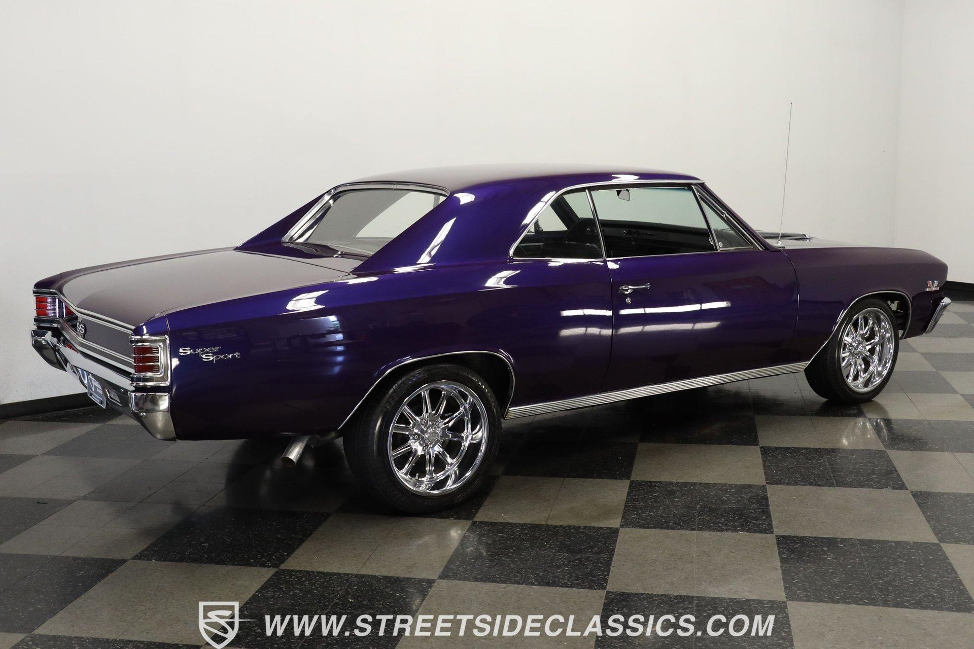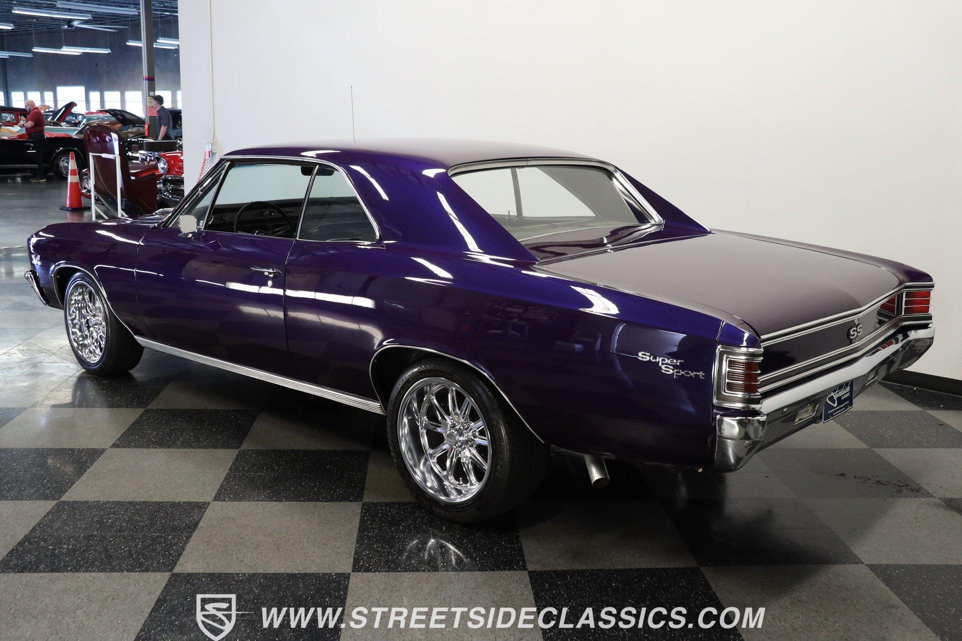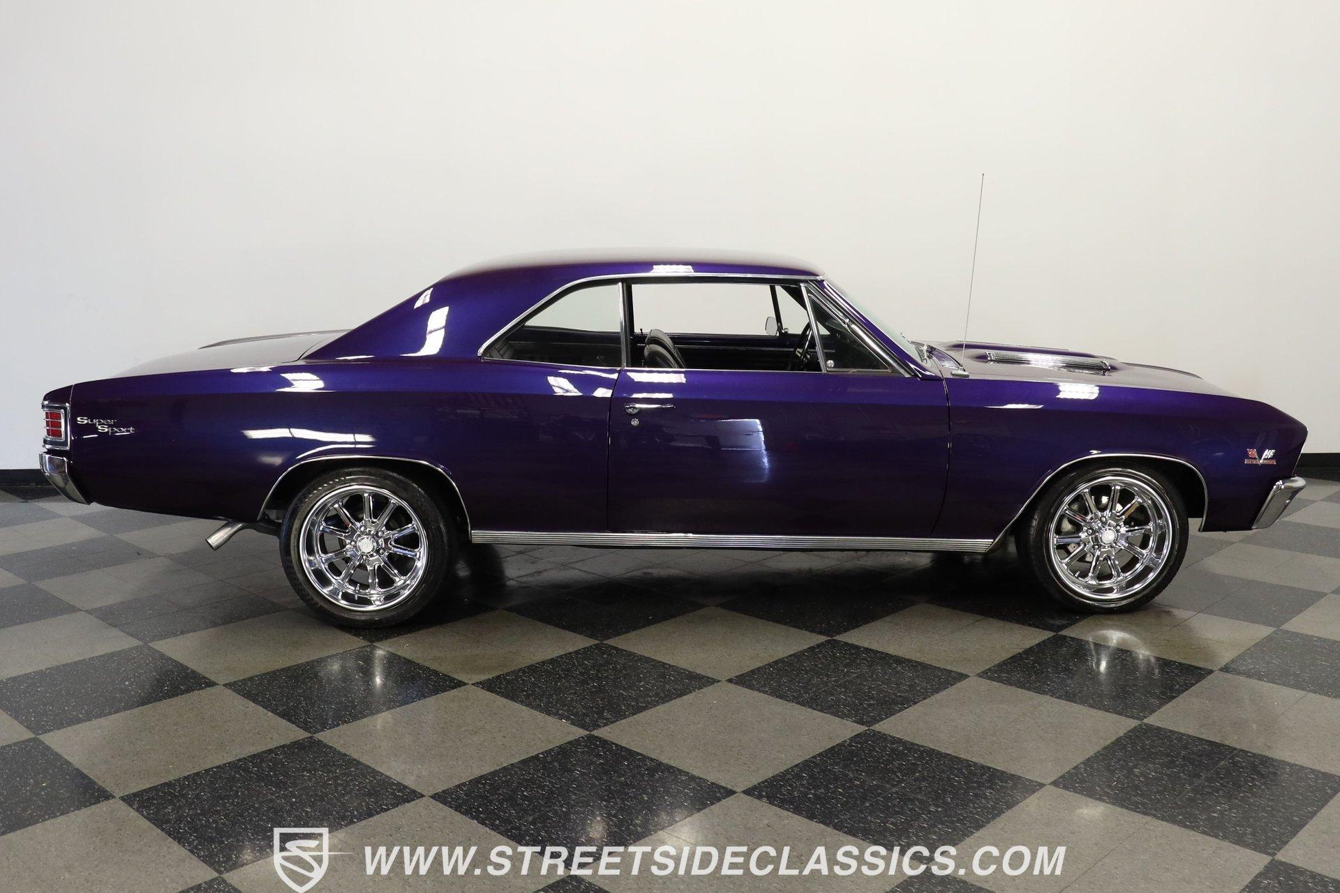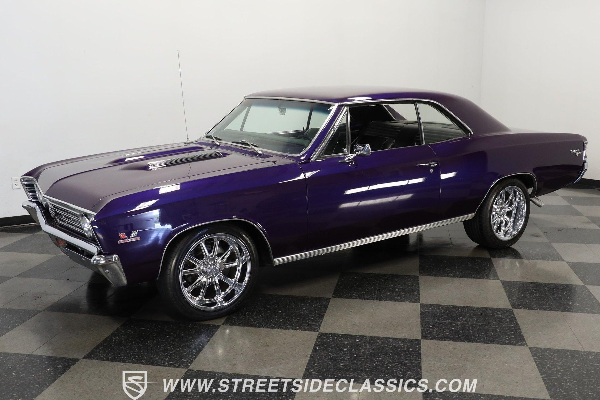 Of all the cars Chevrolet has resurrected over the years, unfortunately, the iconic Chevelle has yet to be one of them. But, on the bright side, that refusal does make cars like this 1967 Chevrolet Chevelle SS 396 even more valuable in the hearts of true enthusiasts. Fully repainted in a unique and eye-catching Purple Metallic, this SS looks subtly aggressive from any angle. Inside, a sea of black invites drivers and passengers aboard. Dual bucket seats offer a great view through the expansive windshield. Just beyond the three-spoke power-assisted steering wheel sits a horizontal 120 mph speedometer, flanked by a fuel gauge and an analog clock on either side. A pair of auxiliary gauges is mounted just below the dashboard. An AM/FM/Cassette player head unit offers more soundtrack options than the original unit it replaces, while air conditioning keeps everyone cool even on the longest of road trips. Under the hood, we find a 396 cubic-inch overhead valve V-8 engine. Equipped with an Edelbrock single 4-barrel carb and intake, long tube headers, and a FlowMaster dual exhaust, this big block routes power through a Muncie M20 four-speed manual transmission on its way to a 12-bolt rear. A set of 18-inch U.S. Mags wheels sits at all four corners, shod in modern 275/40ZR-18 rubber out back, while a narrower set of 235/45ZR-18 up front handles steering duties. HIGHLIGHTS: Real Super Sport (138 in the vin) Purple Metallic Repaint 396 CID V8 Edelbrock Four Barrel Longs Tubes FlowMasters Muncie M20 Four Speed 12 Bolt Rear US Mags Wheels Power Brakes Front Disc Brakes Power Steering Black Vinyl AC AM/FM/Cassette Seatbelts This 1967 Chevrolet Chevelle SS 396 is equipped with a solid axle suspension. Power brakes, which include a pair of front discs, are ready to scrub off speed whenever needed. So, while we will continue to lobby GM to bring back a modern-day Chevelle until they decide to come to reason, we will have to make do with incredible cars like this 1967 Chevrolet Chevelle SS 396 ... and maybe that's not so bad after all. Call today! We can assist you with getting an Extended Vehicle Service Plan from Freedom Warranty, which provides comprehensive coverage that can save thousands of dollars on unexpected repairs. Inquire for more details and pricing!
