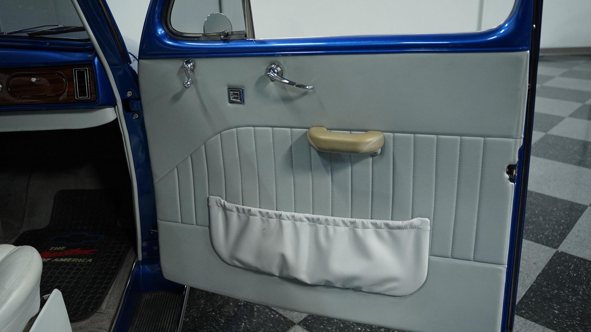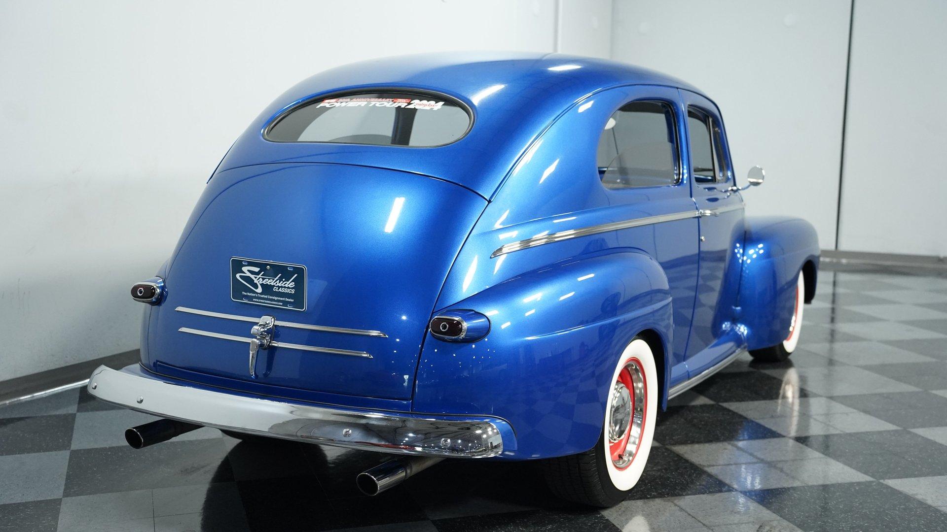 There is something about a postwar Ford that tugs at the heart of car lovers. It represents a bridge between old-world craftsmanship and the roar of modern V8 power, a vehicle that makes a statement whether cruising a small town main street or arriving at a weekend show. This Tudor carries that same nostalgic presence but with sensible upgrades that make driving effortless and enjoyable. If you want a classic that looks like it belongs in a museum yet behaves like a capable driver, consider this 1946 Ford Tudor finished in striking blue metallic with a refreshed 350 V8 and updated front end. Step inside and you find a nicely done interior that balances period charm with everyday comfort. The dash presents clearly readable gauges, door panels are in very good condition, and the headliner fitment is great. Upholstery shows very well and the carpets are free from major wear. Controls are straightforward and the cabin feels tidy enough for long drives or local cruises. The A/C blows cold and the interior overall communicates careful use and sensible restoration choices. Under the hood sits a 350 cubic inch V8 fed by a 4-barrel Edelbrock carburetor and an Edelbrock intake, paired with a TH350 three-speed automatic transmission. The driveline benefits from a Mustang II-style independent front suspension and rack and pinion steering, which markedly improves handling and road manners compared to a stock setup. Stopping power includes front power discs and rear power drums while power steering and power brakes make daily driving easy. The car starts easily, idles smoothly, shifts well and is ready for long-distance runs as evidenced by recent tour miles. Highlights: Peppy 350 cubic inch V8 TH350 three-speed automatic transmission Front end upgraded to Mustang II-style independent suspension with rack and pinion steering Front power disc brakes, rear power drum brakes Rear 10-bolt axle; rear leaf springs with shocks and sway bar Wheels: 15 inch wheels; tires sized 215/70R15 front and 235/70R15 rear Air conditioning is installed and operational Full repaint in blue metallic Custom interior is nicely finished This Ford Tudor offers a terrific blend of period looks and usable performance thanks to its drivetrain and front end upgrades. It is a practical classic that is enjoyable to drive and sensible to own. If this checks the boxes you care about, call today!