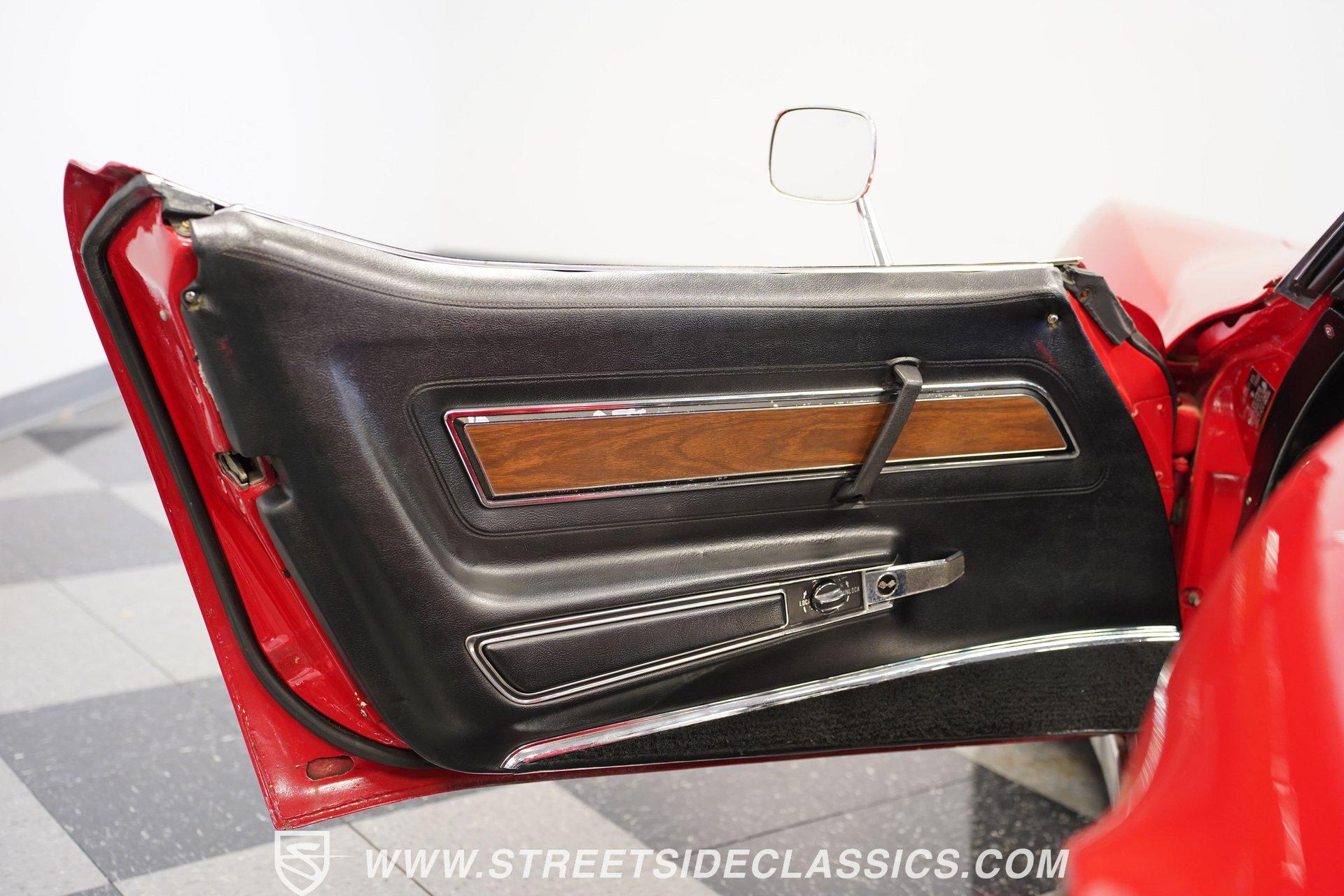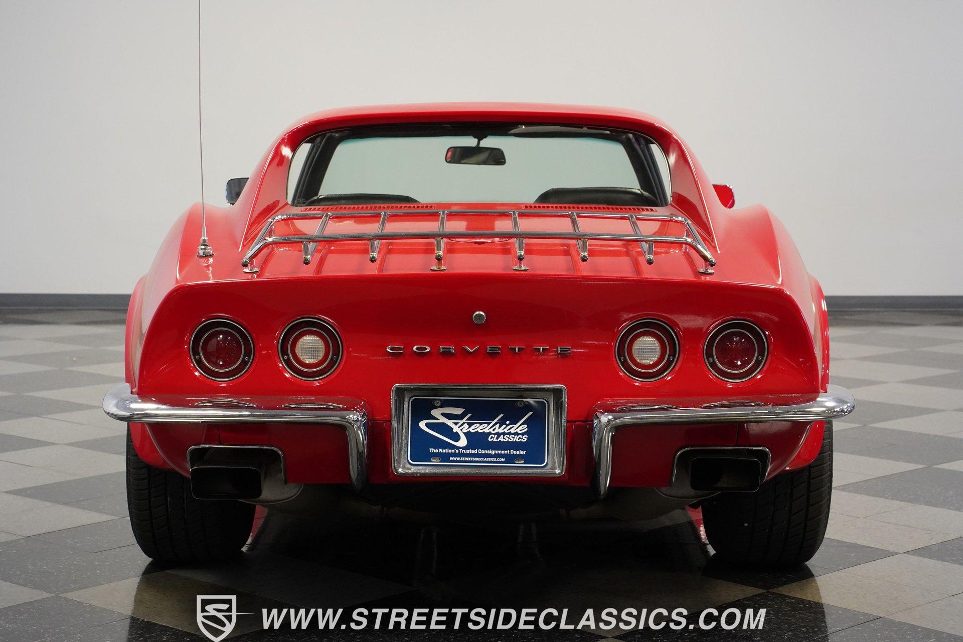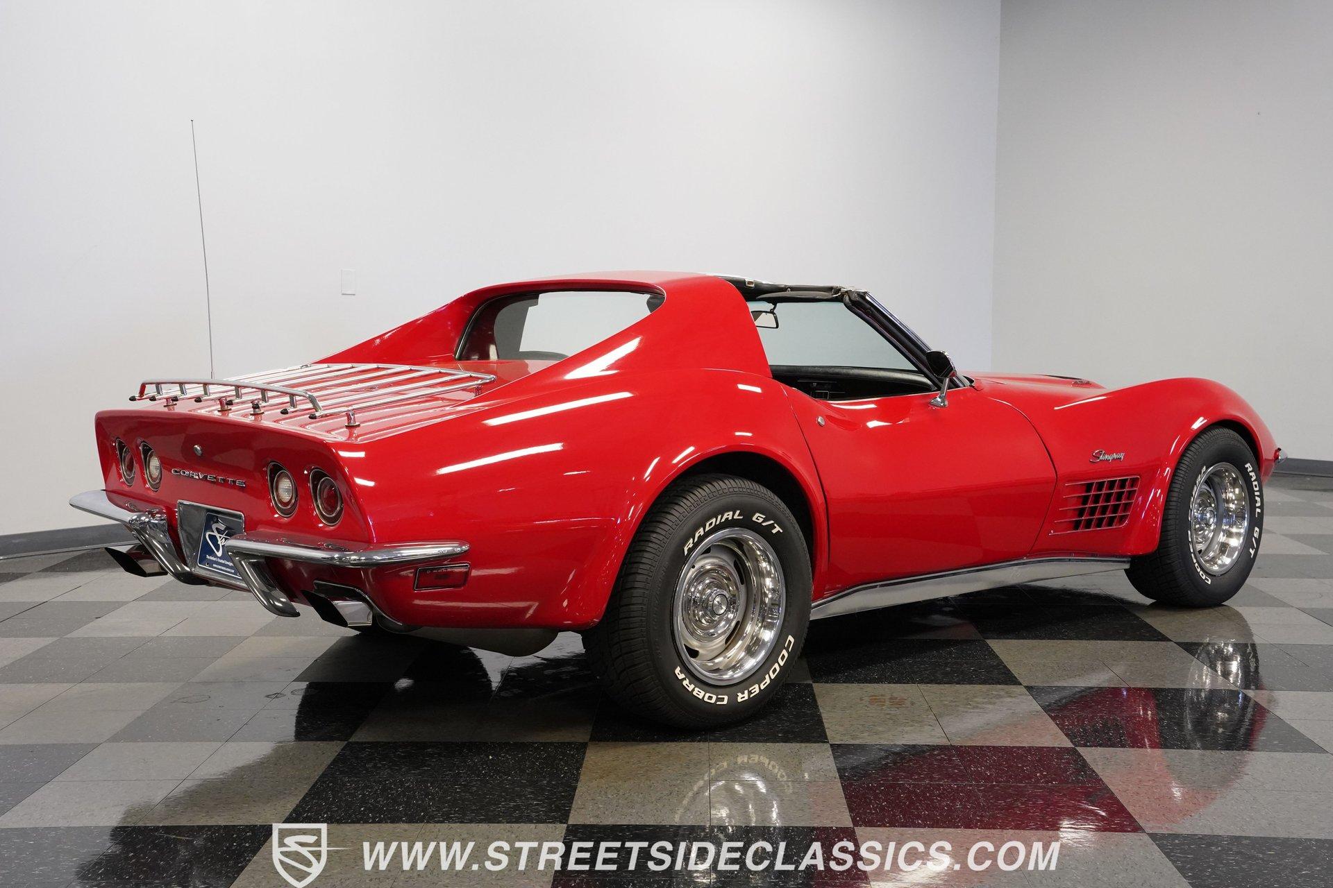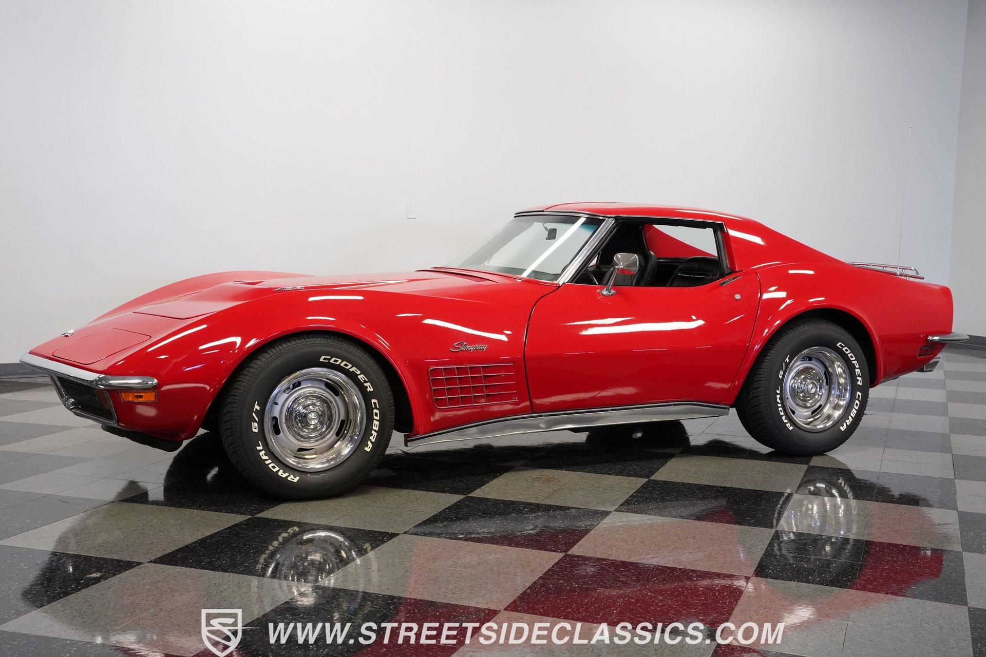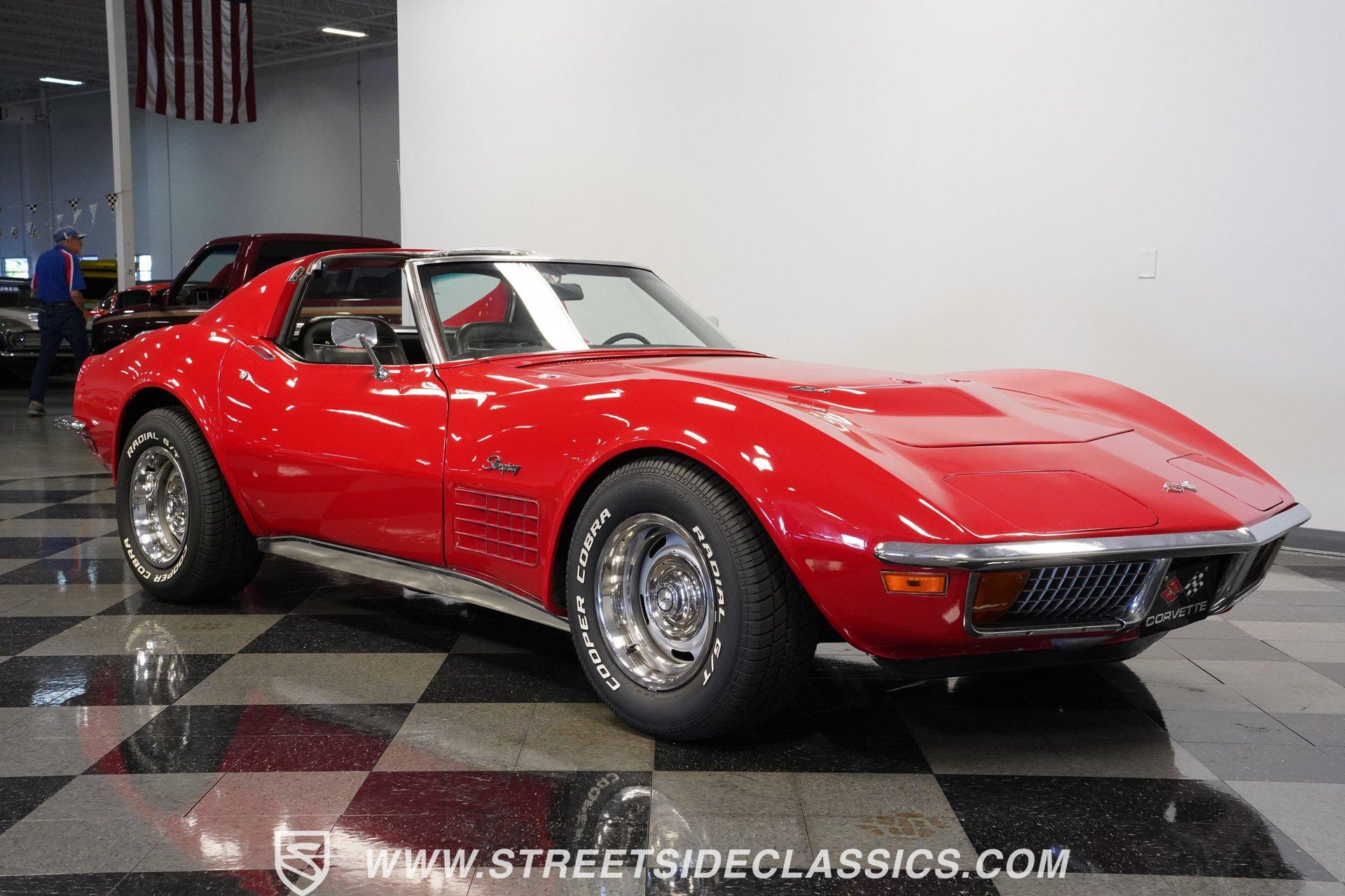 Owning a Corvette is like being part of no other vehicle lineage in the world. America's longest-running model, Chevy's halo car is now in its eighth generation, and with each passing year, more of its previous seven iterations become more collectible. The C3, exemplified by this 1972 Chevrolet Corvette LS5 454 Stingray we have for you, has been slowly gaining popularity in the hearts and minds of collectors and enthusiasts over the last several years. Fully repainted in this impossible-to-miss Mille Miglia-inspired red, this numbers-matching big block is one of just 3,913 made for the final year of the iconic LS5 V-8. Inside and beneath those versatile T-Tops, a black vinyl interior envelops you in a cockpit of gauges. The speedometer and tachometer sit front and center, while atop the center stack, we find fuel, water temperature, oil pressure, battery charge, and even an analog clock display all the pertinent information you might need or want. An original-looking AM/FM stereo handles soundtrack duties. However, you'd be hard-pressed to try and drown out the sound of that massive numbers-matching 454 cubic-inch V-8 sitting under this 'Vette's signature front-hinged hood. Rebuilt and upgraded with a single four-barrel Holley carburetor. From the factory, the stock LS5 was the biggest block made with hydraulic lifters, and even with emissions regulations beginning to take hold, this V-8 still managed to produce an advertised and impressive SAE net (versus the 1971 gross) 270 horsepower and 390 pound-feet of torque. That power is then funneled through a numbers-matching four-speed manual transmission before being sent out to its standard-issue Posi rear end. HIGHLIGHTS: Numbers Matching LS5 454 V8 Numbers Matching Four Speed Manual One of 3,913 LS5's Produced T-Tops Dual Exhaust Independent Suspension Power Four Wheel Power Discs Air Conditioning Power Steering This 1972 Chevrolet Corvette LS5 454 Stingray features a four-wheel independent suspension. Fifteen-inch Rallye wheels are shod in P255/60R-15 Cooper Cobra Radial G/T tires, while four-wheel power disc brakes wait to scrub off speed whenever called upon. If you've never owned a 'Vette before, this numbers-matching LS5 big block will make for an excellent introduction to America's longest-running car club. Call today!