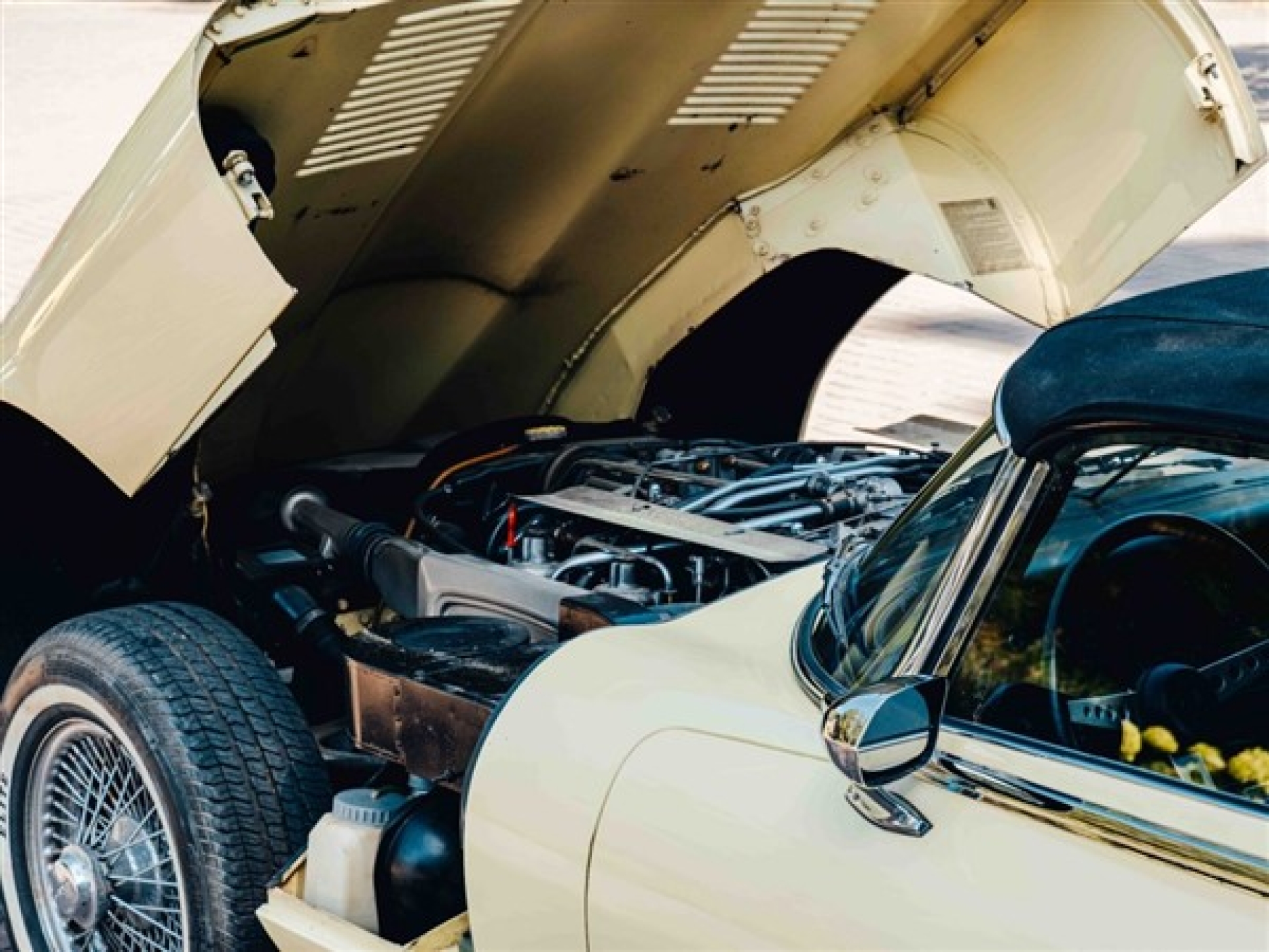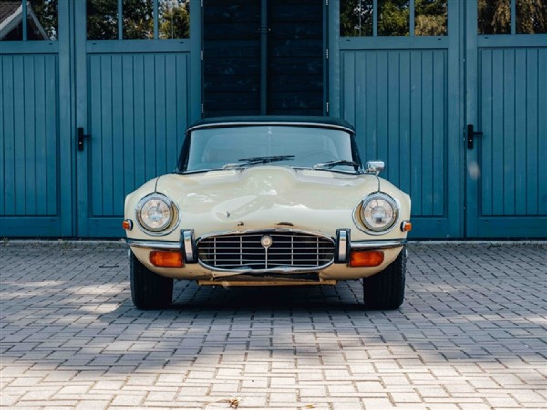 1973 Jaguar E-Type OTS Roadster finished in Primrose Yellow with chrome wire wheels. A matching numbers Series 3 with only 23,000 documented miles, equipped with the 5.3L V12 engine and a manual gearbox. The interior is finished in beige leather with matching trim and carpets, featuring rebuilt seats and a recently fitted convertible top. Imported from Canada with EU duties paid, the car shows minor transport damage to the hood and grille which will be repaired before delivery.