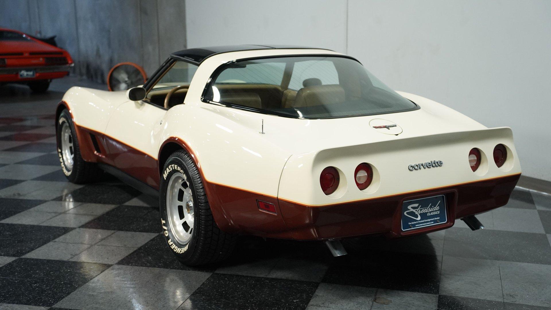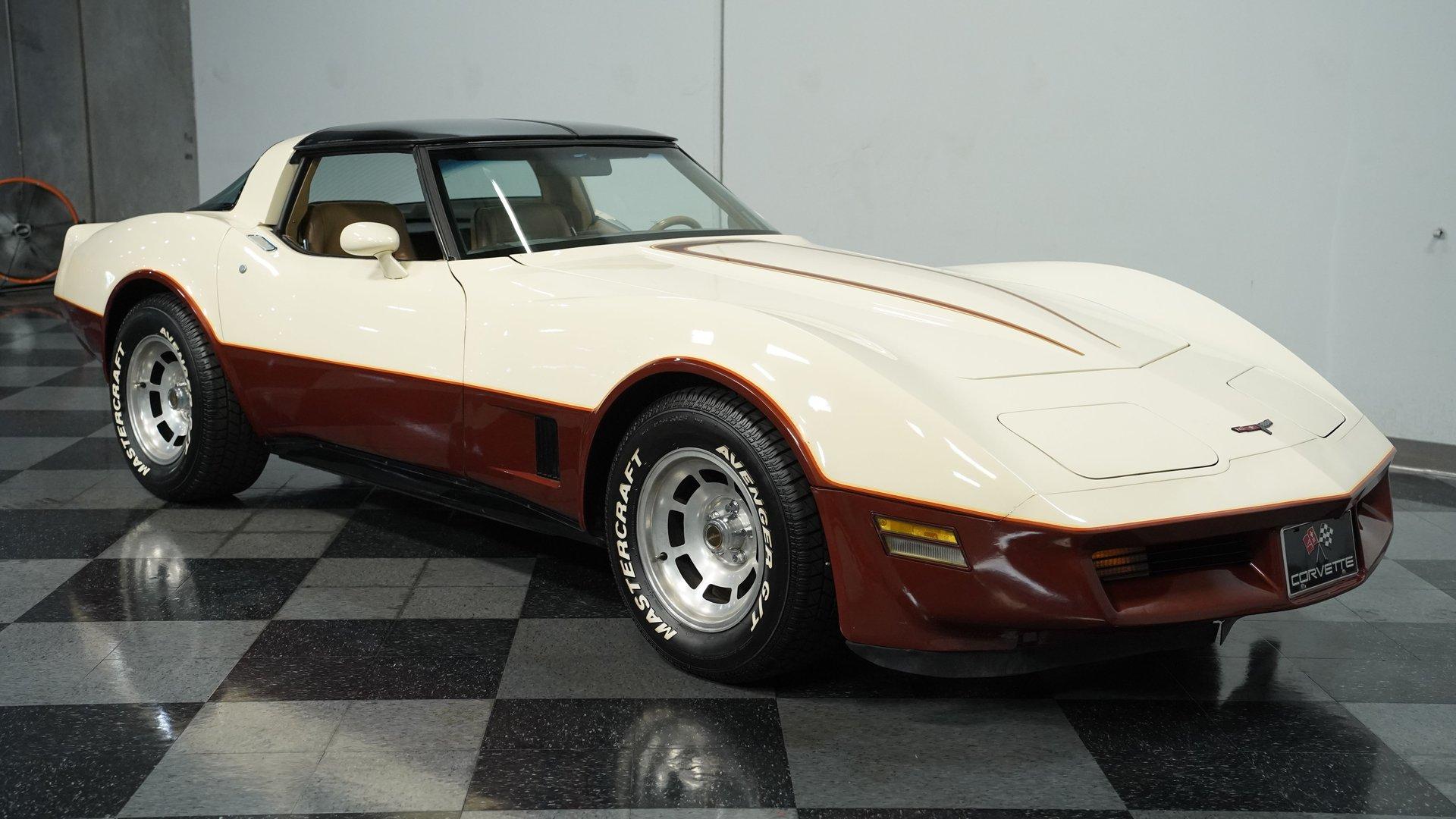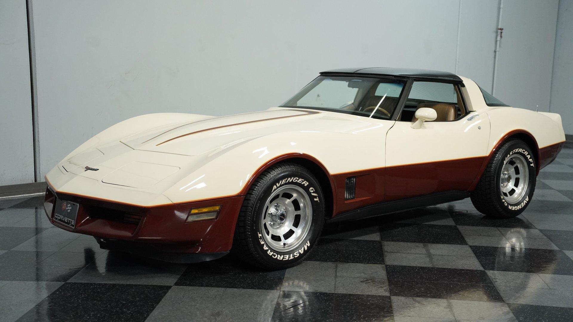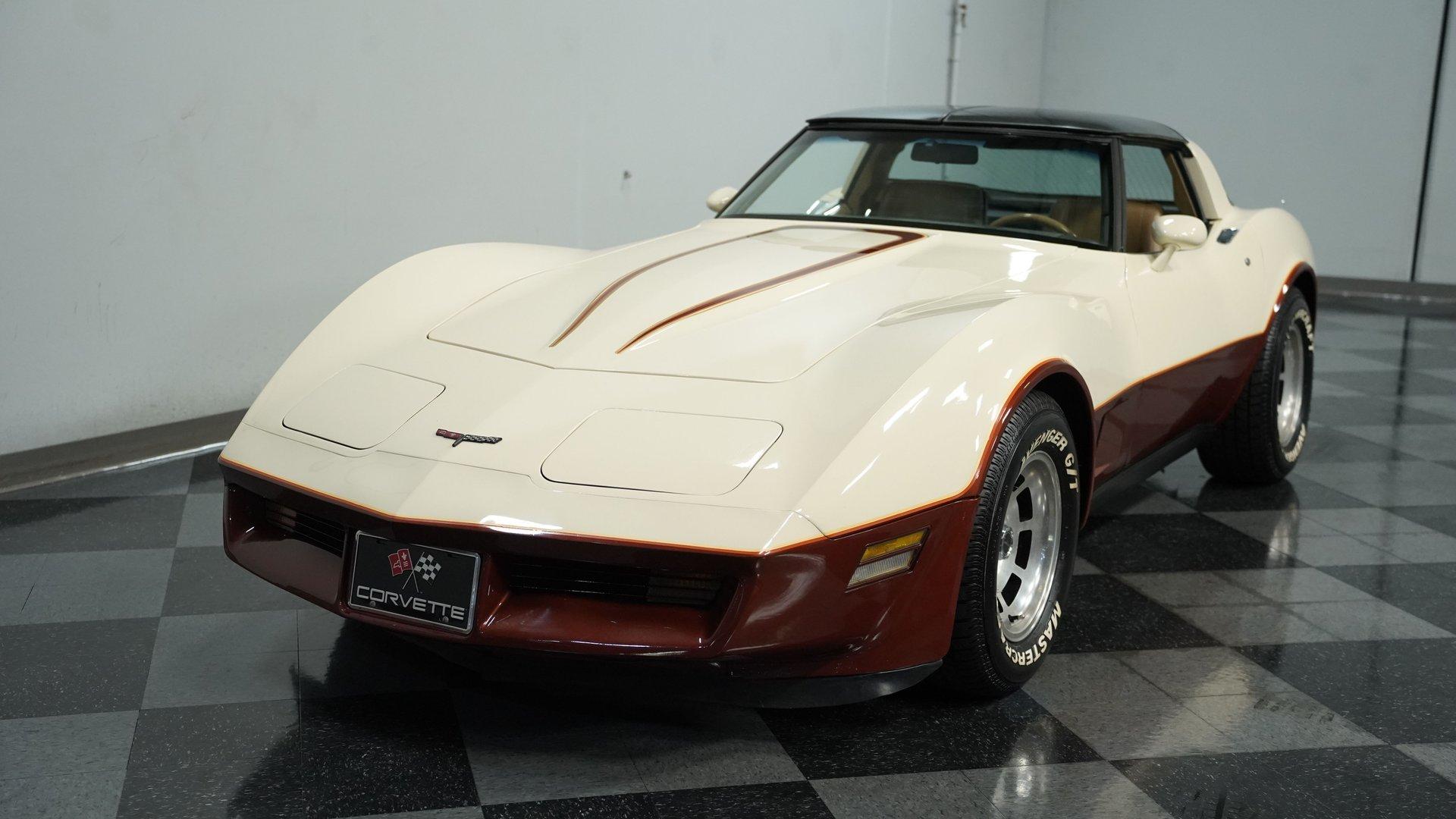 This highly original 1981 Chevrolet Corvette boasts a rare two-tone Cream Beige and Dark Bronze paint scheme that gleams in the sunlight, a testament to decades of meticulous care. The C3's iconic silhouette remains as striking today as it was in '81, with Transparent T-tops ready for open-air adventures. Rolling on factory 15-inch wheels wrapped in beefy 255/60R15 rubber, this Corvette combines classic style with road-gripping performance. Dark Bronze accents complement the sleek bodywork, creating a quintessential American sports car aesthetic. Doe Skin Tan upholstery adorns the interior, creating a driver-focused environment built for serious motoring. Supportive bucket seats keep you planted during spirited driving, while the center console houses the shifter for the 3-speed automatic transmission. A factory Delco AM/FM/cassette radio stands ready to provide the soundtrack for your journey. Power windows, locks, and steering offer effortless control. The driver-oriented dash puts all gauges and controls within easy reach, reinforcing the Corvette's performance-first philosophy. The original, numbers-matching 350 cubic inch V8 engine sits proudly in the engine bay. This 190-horsepower power-plant, fed by a single 4-barrel carburetor top with a factory dual-snorkel air cleaner, delivers ample thrust for both cruising and more aggressive driving. The automatic transmission shifts with precision, allowing you to focus on the road ahead. Four-wheel disc brakes provide confident stopping power, while the legendary Corvette suspension - featuring coil springs up front and a transverse leaf spring in the rear - delivers the handling prowess this sports car is known for. A dual exhaust system provides a fitting auditory complement to the V8's performance. HIGHLIGHTS: Numbers-Matching 350 V8 Engine 3-Speed Automatic Transmission Single 4-Barrel Carburetor Power Steering Four-Wheel Disc Brakes Dual Exhaust System Coil Spring Front Suspension Transverse Leaf Spring Rear Suspension Rare Cream Beige/Dark Bronze Paint Scheme Transparent T-Top Roof 15-Inch wheels in 255/60R15 Tires Well-Preserved, Highly Original Car Doe Skin Tan upholstery Bucket Seats Center Console Power Windows and Locks Factory AM/FM Radio with Cassette Player This un-modified, highly-original, 1981 Chevrolet Corvette, with its numbers-matching V8, eye-catching Cream Beige/Dark Bronze exterior, and luxurious Doe Skin Tan interior, represents a genuine piece of American sports car engineering. Cherished by and well cared for since it left the showroom floor, this C3 Corvette awaits its next passionate owner. Call today!