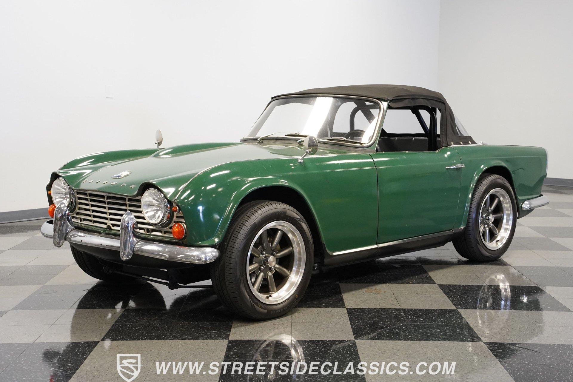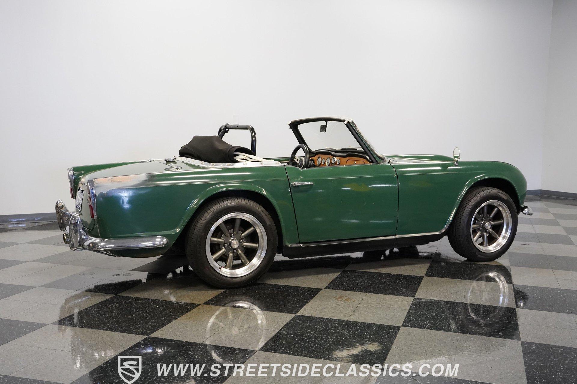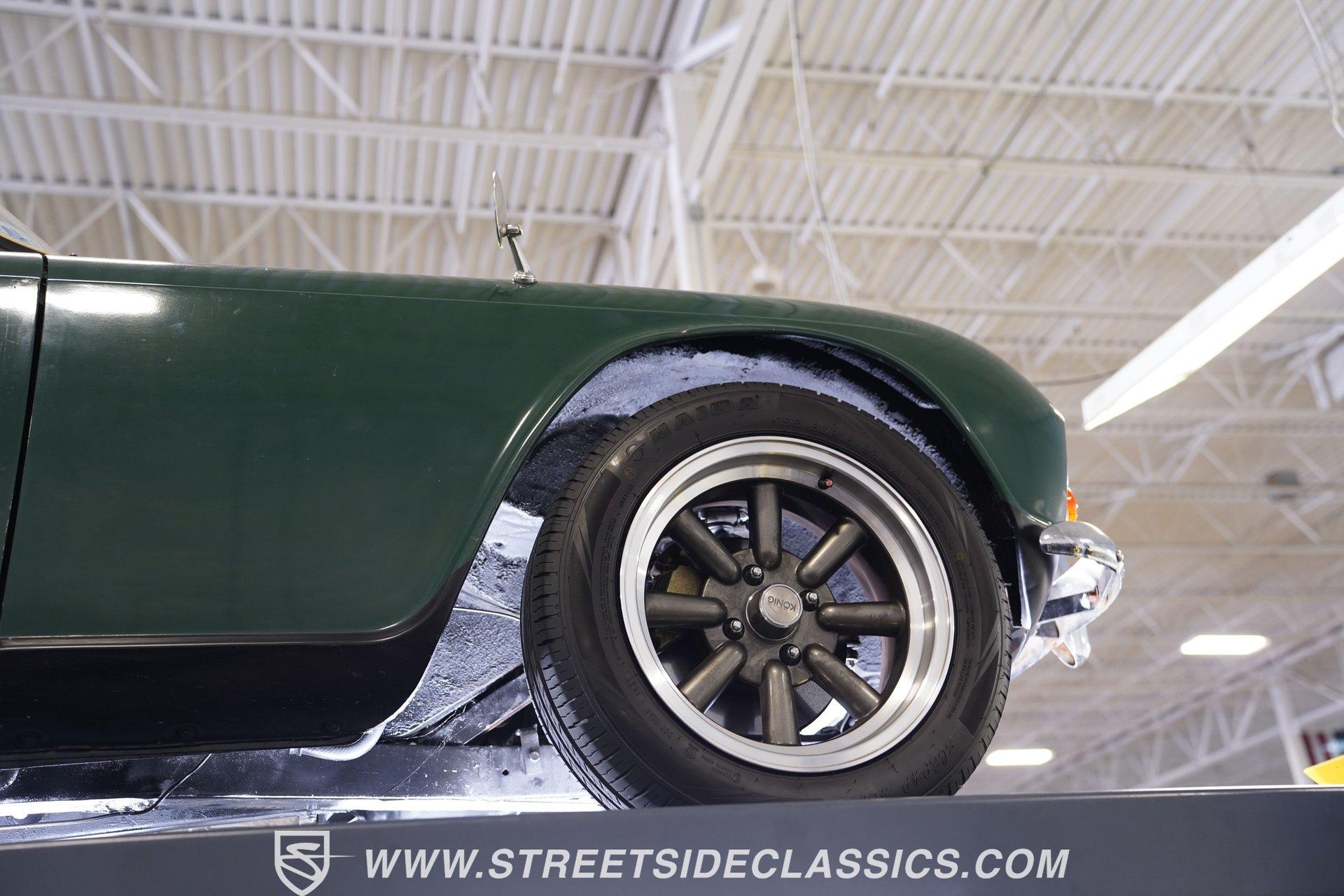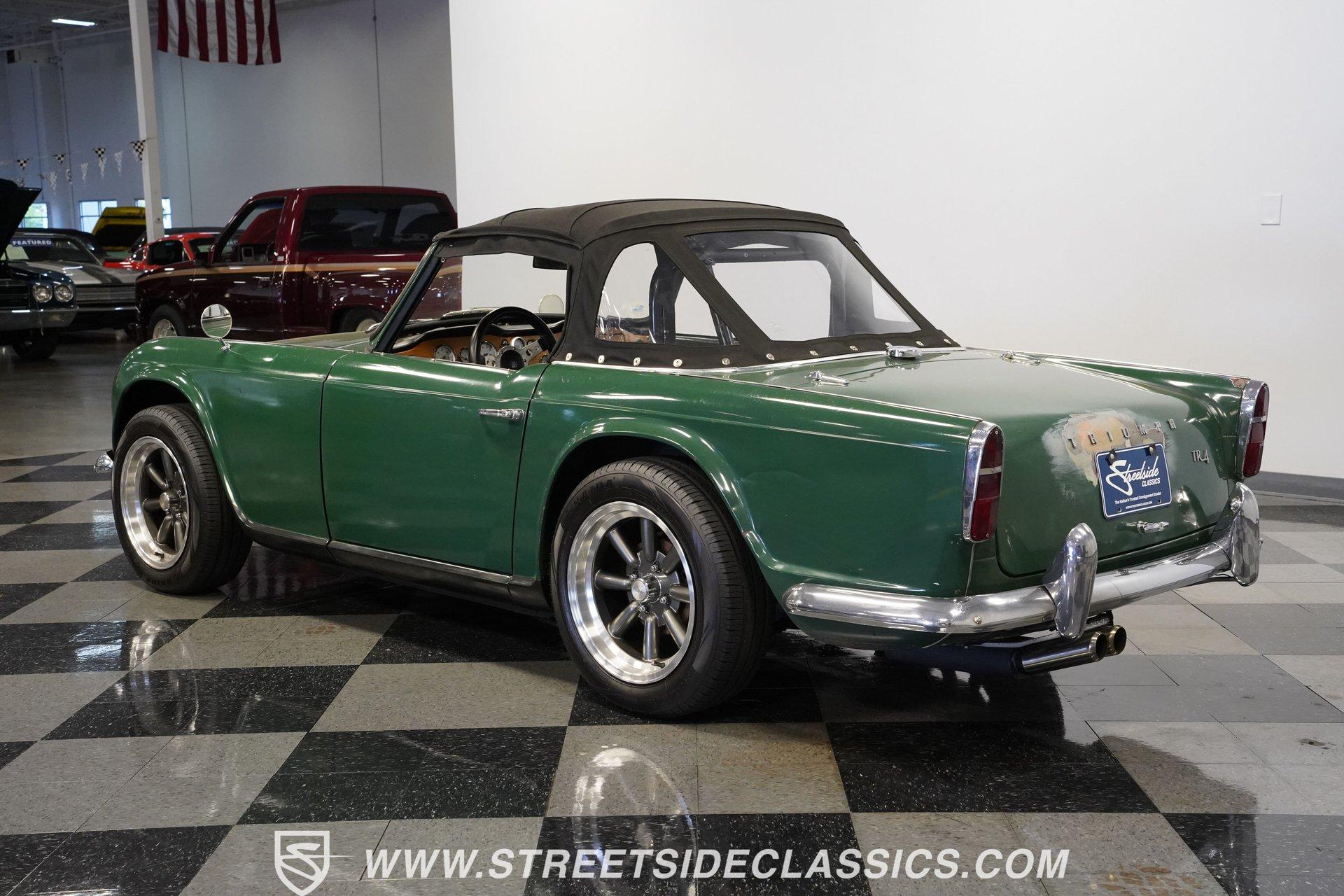 Looking to get behind the wheel of an iconic British sports car but want a little more power at your disposal? Then this 1964 Triumph TR4 Convertible Restomod is definitely worth checking out. It presents a whole host of distinctive styling cues that set its model apart from its competition when it was first released. Check out that full-width grille, those lidded headlamps, and just how often do you see a mid-'60s roadster sporting a pair of tailfins? Clad in iconic British Racing Green paint, this is a great-looking, compact ride, and combined with its timeless aesthetics, it features a significantly more powerful engine than it rolled off the assembly line with. Having logged fewer than 2,000 miles since it emerged from its restoration, this Triumph is ready, willing, and able to provide plenty of future driving fun for its next lucky owner. The interior blends a mixture of factory and aftermarket components while retaining a convincingly authentic appearance very much in keeping with this car's identity. The dash area offers a fresh pad on top, along with wood accents that were also recently replaced. As you lower yourself into the driver's seat and grip the steering wheel, you'll find a collection of fresh, white-faced AutoMeter gauges in place to help you keep tabs on motoring functions. A Jensen AM/FM stereo with an auxiliary port replaces its factory counterpart to offer an enhanced audio experience. Below, the carpeting has been redone and really fits nicely, providing a strong complement to the canvas convertible top, which is also in good shape. The engine compartment has been well-maintained and now features a 2.4-liter 22R Toyota 4-cylinder engine at its center. Revered for both its efficiency and anvil-like sturdiness, 22Rs have been entrusted to power countless aftermarket automotive projects, and, fed by both a Weber 2-barrel carburetor and Offenhauser intake, this one performs with all the vigor and reliability you'd expect. In fact, this British classic is a great driver in all respects. The accompanying 5-speed transmission shifts smoothly, and the suspension has been totally redone to provide a firm but comfortable ride. The wiring system has also been replaced to improve reliability, and there's now an aluminum radiator armed with dual electric fans up front to keep operating temperatures in check. HIGHLIGHTS FEWER THAN 2,000 MILES ON THIS BUILD 2366CC TOYOTA 22R INLINE 4-CYLINDER ENGINE 2 BARREL CARBURETOR OFFENHAUSER INTAKE MANIFOLD SHORTY HEADER 5-SPEED MANUAL TRANSMISSION FRONT DISC BRAKES 16" KONIG WHEELS STYLISH FACTORY-CORRECT BRITISH RACING GREEN EXTERIOR FACTORY-CORRECT BLACK VINYL UPHOLSTERY BLACK CANVAS CONVERTIBLE TOP AM/FM STEREO WITH AUXILIARY PORT AND BLUETOOTH CONNECTIVITY PREVIOUSLY-USED DUAL WEBER CARBURETORS INCLUDED Featuring an unbeatable blend of vintage good looks and an upgraded, more modern engine, this 1964 Triumph TR4 Convertible Restomod is outfitted with very sharp 16" Konig wheels and would be a great fit for the classic sports car enthusiast searching for a little more power than you'd normally expect from this segment. Call today!