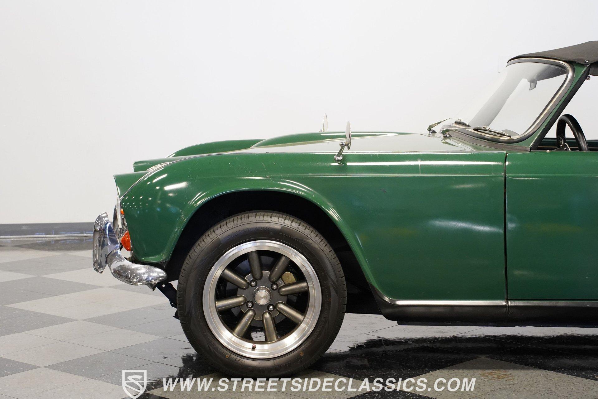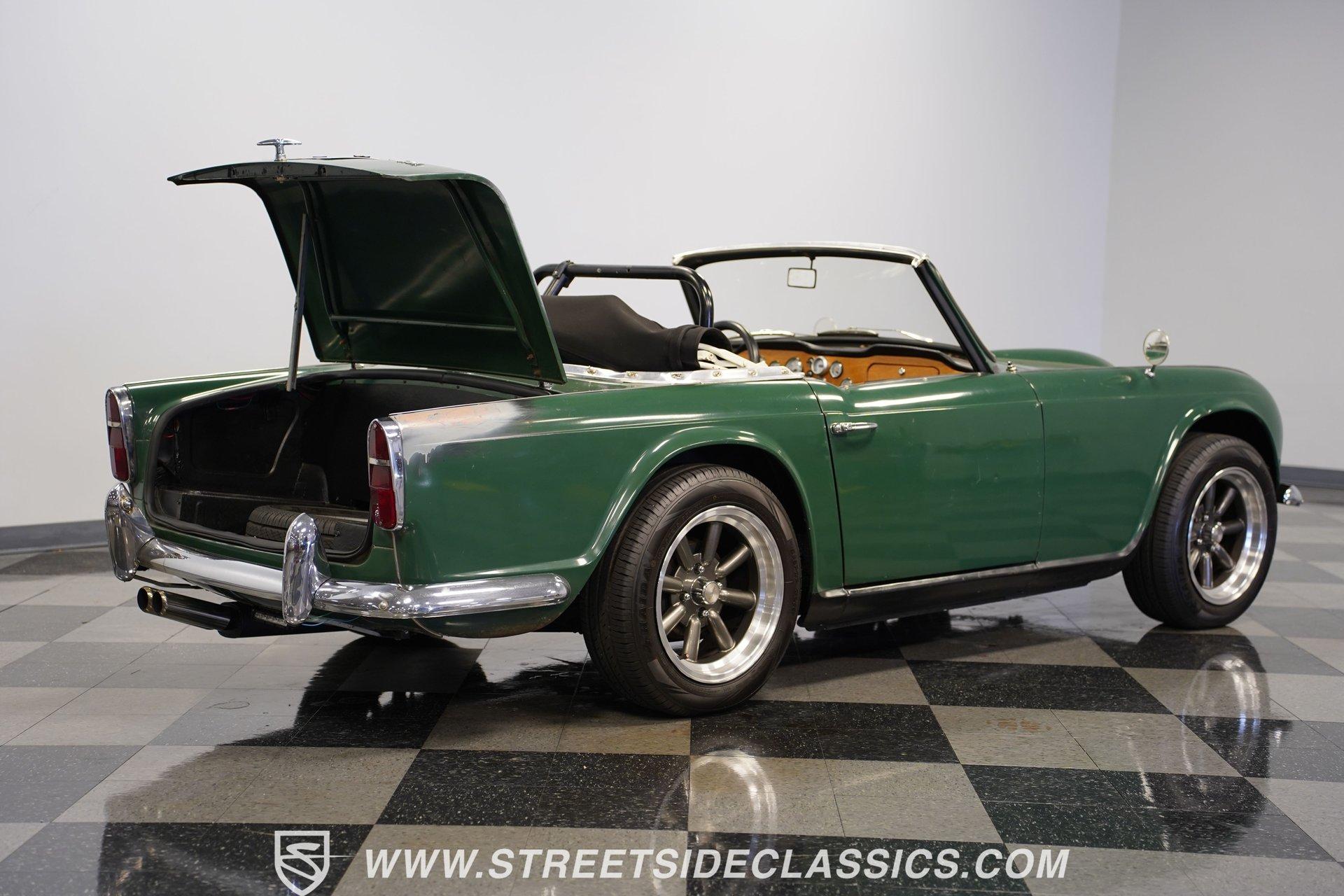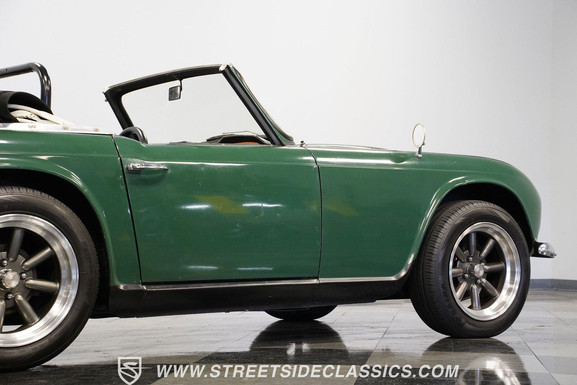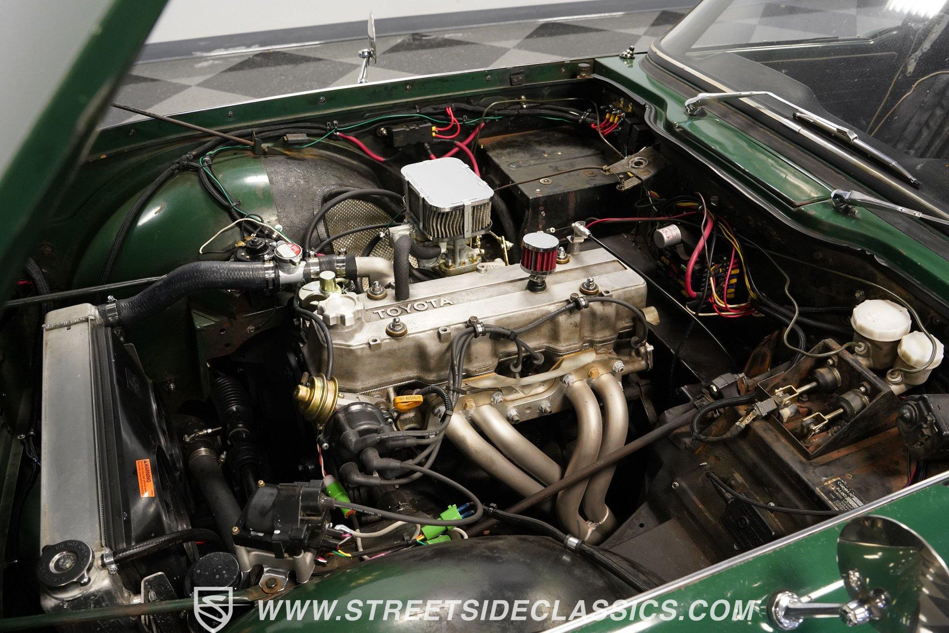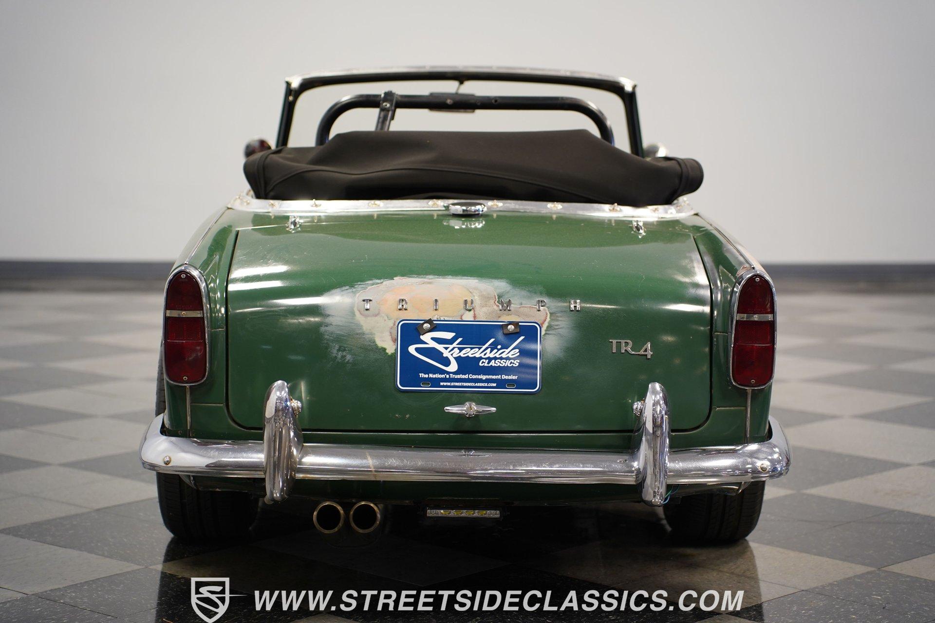 Looking to get behind the wheel of an iconic British sports car but want a little more power at your disposal? Then this 1964 Triumph TR4 Convertible Restomod is definitely worth checking out. It presents a whole host of distinctive styling cues that set its model apart from its competition when it was first released. Check out that full-width grille, those lidded headlamps, and just how often do you see a mid-'60s roadster sporting a pair of tailfins? Clad in iconic British Racing Green paint, this is a great-looking, compact ride, and combined with its timeless aesthetics, it features a significantly more powerful engine than it rolled off the assembly line with. Having logged fewer than 2,000 miles since it emerged from its restoration, this Triumph is ready, willing, and able to provide plenty of future driving fun for its next lucky owner. The interior blends a mixture of factory and aftermarket components while retaining a convincingly authentic appearance very much in keeping with this car's identity. The dash area offers a fresh pad on top, along with wood accents that were also recently replaced. As you lower yourself into the driver's seat and grip the steering wheel, you'll find a collection of fresh, white-faced AutoMeter gauges in place to help you keep tabs on motoring functions. A Jensen AM/FM stereo with an auxiliary port replaces its factory counterpart to offer an enhanced audio experience. Below, the carpeting has been redone and really fits nicely, providing a strong complement to the canvas convertible top, which is also in good shape. The engine compartment has been well-maintained and now features a 2.4-liter 22R Toyota 4-cylinder engine at its center. Revered for both its efficiency and anvil-like sturdiness, 22Rs have been entrusted to power countless aftermarket automotive projects, and, fed by both a Weber 2-barrel carburetor and Offenhauser intake, this one performs with all the vigor and reliability you'd expect. In fact, this British classic is a great driver in all respects. The accompanying 5-speed transmission shifts smoothly, and the suspension has been totally redone to provide a firm but comfortable ride. The wiring system has also been replaced to improve reliability, and there's now an aluminum radiator armed with dual electric fans up front to keep operating temperatures in check. HIGHLIGHTS FEWER THAN 2,000 MILES ON THIS BUILD 2366CC TOYOTA 22R INLINE 4-CYLINDER ENGINE 2 BARREL CARBURETOR OFFENHAUSER INTAKE MANIFOLD SHORTY HEADER 5-SPEED MANUAL TRANSMISSION FRONT DISC BRAKES 16" KONIG WHEELS STYLISH FACTORY-CORRECT BRITISH RACING GREEN EXTERIOR FACTORY-CORRECT BLACK VINYL UPHOLSTERY BLACK CANVAS CONVERTIBLE TOP AM/FM STEREO WITH AUXILIARY PORT AND BLUETOOTH CONNECTIVITY PREVIOUSLY-USED DUAL WEBER CARBURETORS INCLUDED Featuring an unbeatable blend of vintage good looks and an upgraded, more modern engine, this 1964 Triumph TR4 Convertible Restomod is outfitted with very sharp 16" Konig wheels and would be a great fit for the classic sports car enthusiast searching for a little more power than you'd normally expect from this segment. Call today!