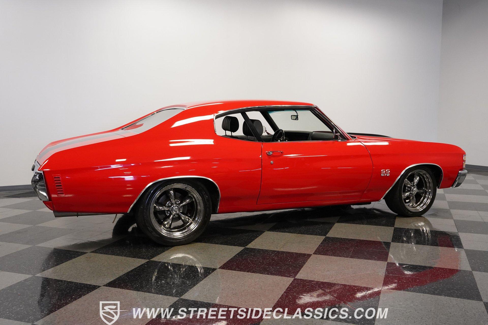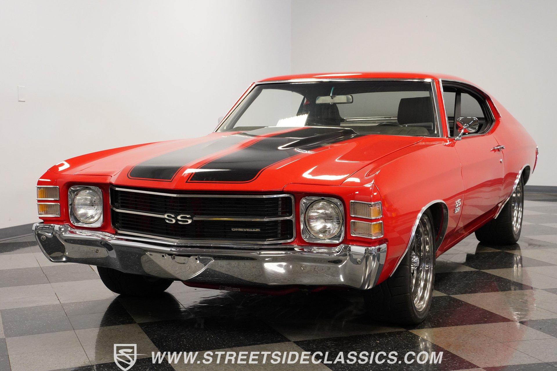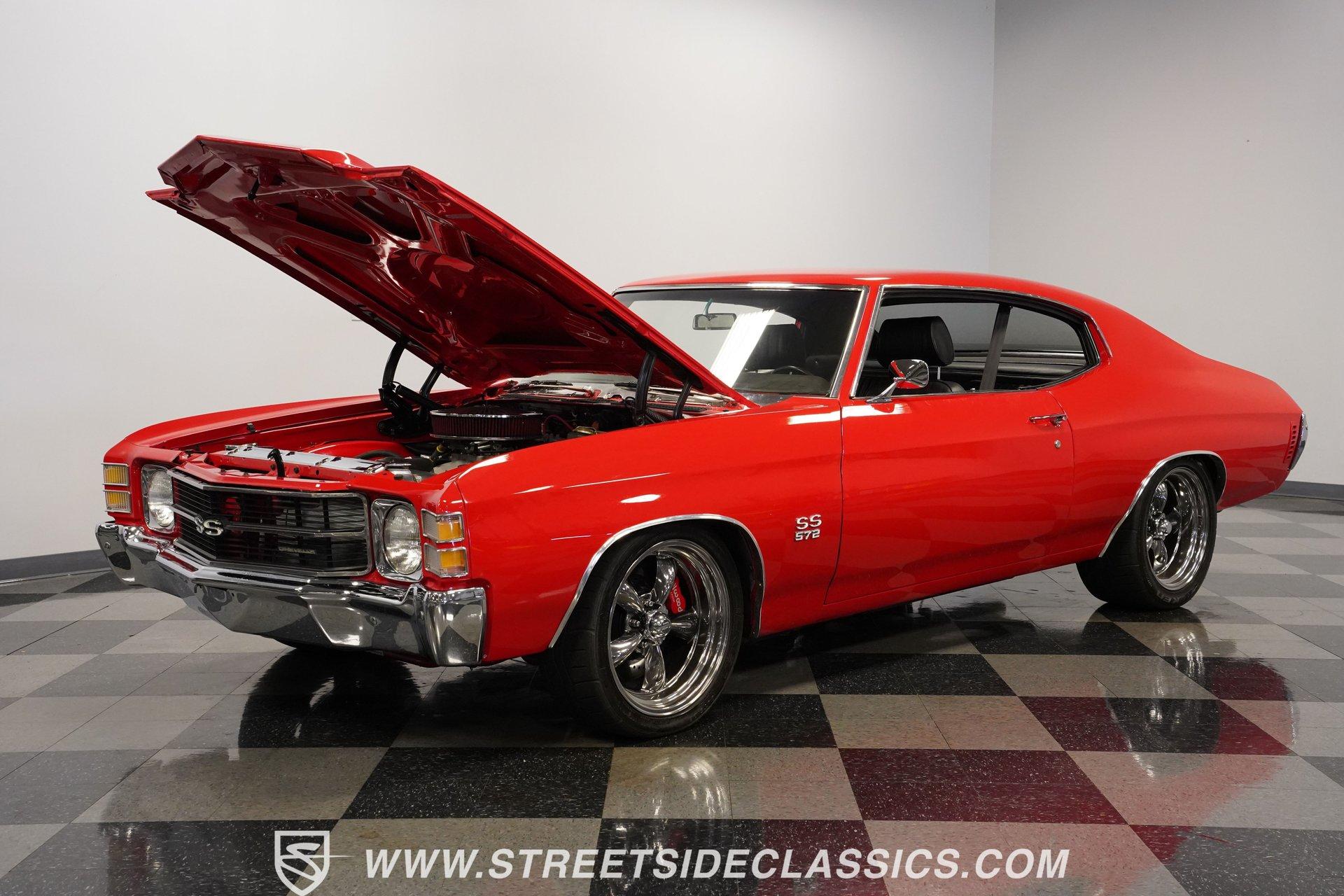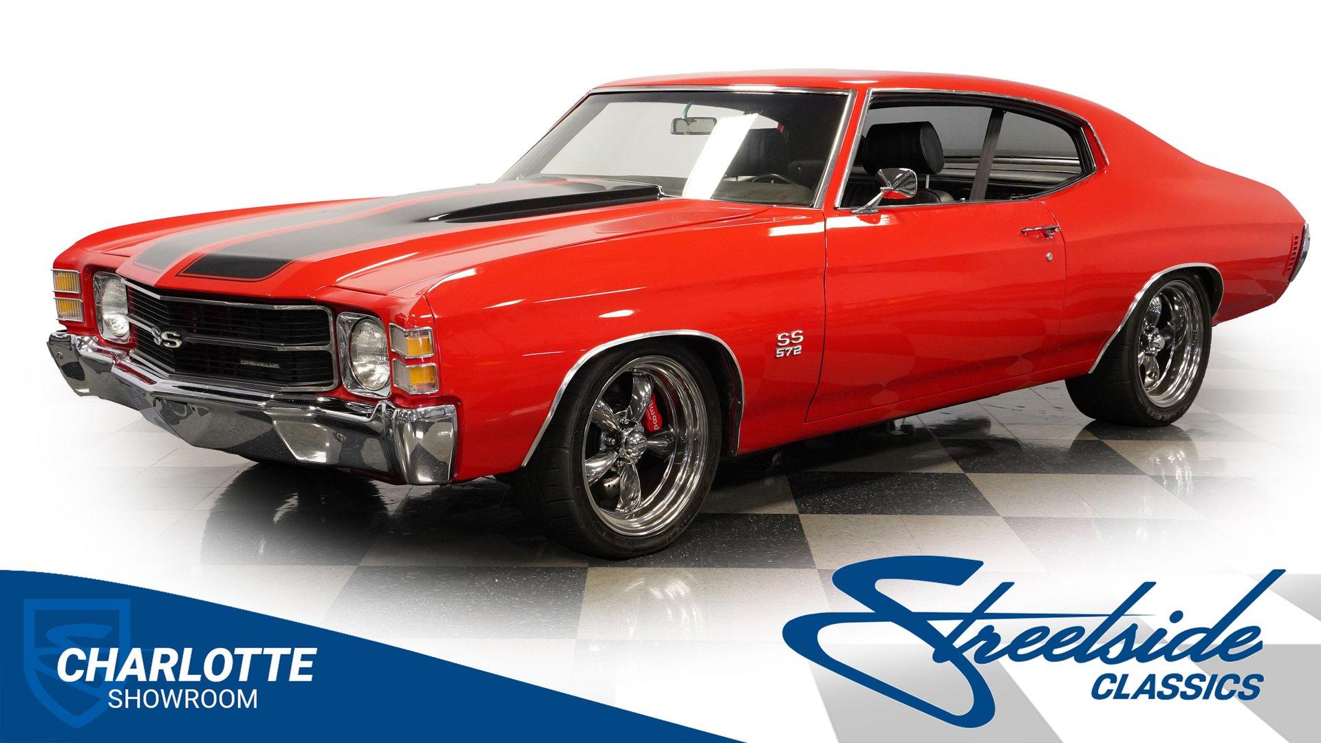 In the annals of the autoverse, muscle cars are as revered and imposing as the Chevelle. One look at this 1971 Chevrolet Chevelle SS Tribute 572 Restomod, and despite being out of production since 1977, it's easy to see why this car has left an indelible mark on enthusiasts worldwide. Fully repainted in a brilliant Red, complemented by a set of full-length black painted SS stripes to go along with its cowl-induction hood, this Tribute shows off the aggressive lines of the Chevelle from any angle. Inside, we find a clean black vinyl interior. A center console separates a pair of modern, plush, and supportive bucket seats, while a power-assisted, three-spoke steering wheel sits just ahead of a column-mounted AutoMeter 10,000 rpm tachometer, while a trio of white-faced auxiliary gauges sits under the dashboard. A chrome B&M shifter serves as both a hand rest and an excitement lever. Under the hood, we find a clean engine bay featuring a massive 572 cubic-inch V-8 engine, reportedly built by Skip White Racing engines, on display in all its glory. This Dart Big M block is topped with a classic chrome air cleaner and '572' embossed valve covers, this big block sports a single four-barrel Holley Proform 1050 carburetor, while spent gases are expelled through a set of long tube headers and Pypes dual exhaust. That power is routed through a built TH400 three-speed automatic transmission before being sent to a beefed-up nine-inch rear end, which translates those ponies to the pavement via a set of 18-inch American Racing wheels. HIGHLIGHTS: Full Red Repaint Black Racing Stripes Cowl Hood 572 Dart Big M Block Built by Skip White Racing Holley Proform 1050 Carb Long Tubes Pypes Dual Exhaust Built TH400 Built Nine Inch Rear American Racing Wheels Four Wheel Power Discs Wildwood Calipers Front Cross Drilled and Slotted Rotors Full UMI Suspension Viking Adjustable Coilovers Power Steering Black Vinyl Interior Modern Bucket Seats B&M Shifter Column Mounted Tach This 1971 Chevrolet Chevelle SS Tribute 572 Restomod is equipped with a full UMI Suspension Kit and four-wheel Viking adjustable coilovers. A power brake setup is highlighted by Wilwood calipers and a pair of cross-drilled and slotted rotors up front, which are ready to scrub off speed at a moment's notice. If you have been looking for a sinister-looking big-block monster from the Golden Age of muscle cars, then look no further because this is the car for you. Don't wait, call today!
