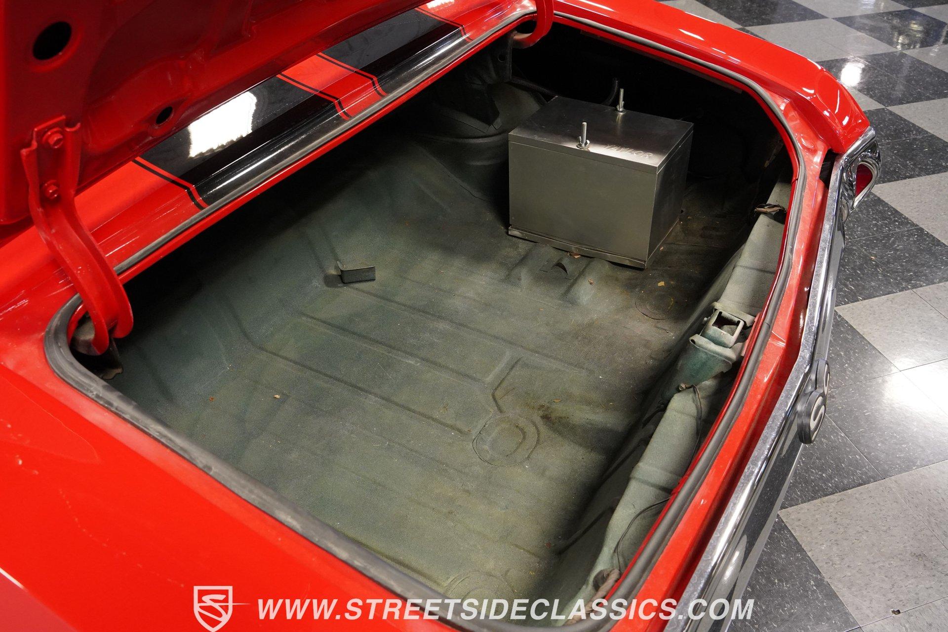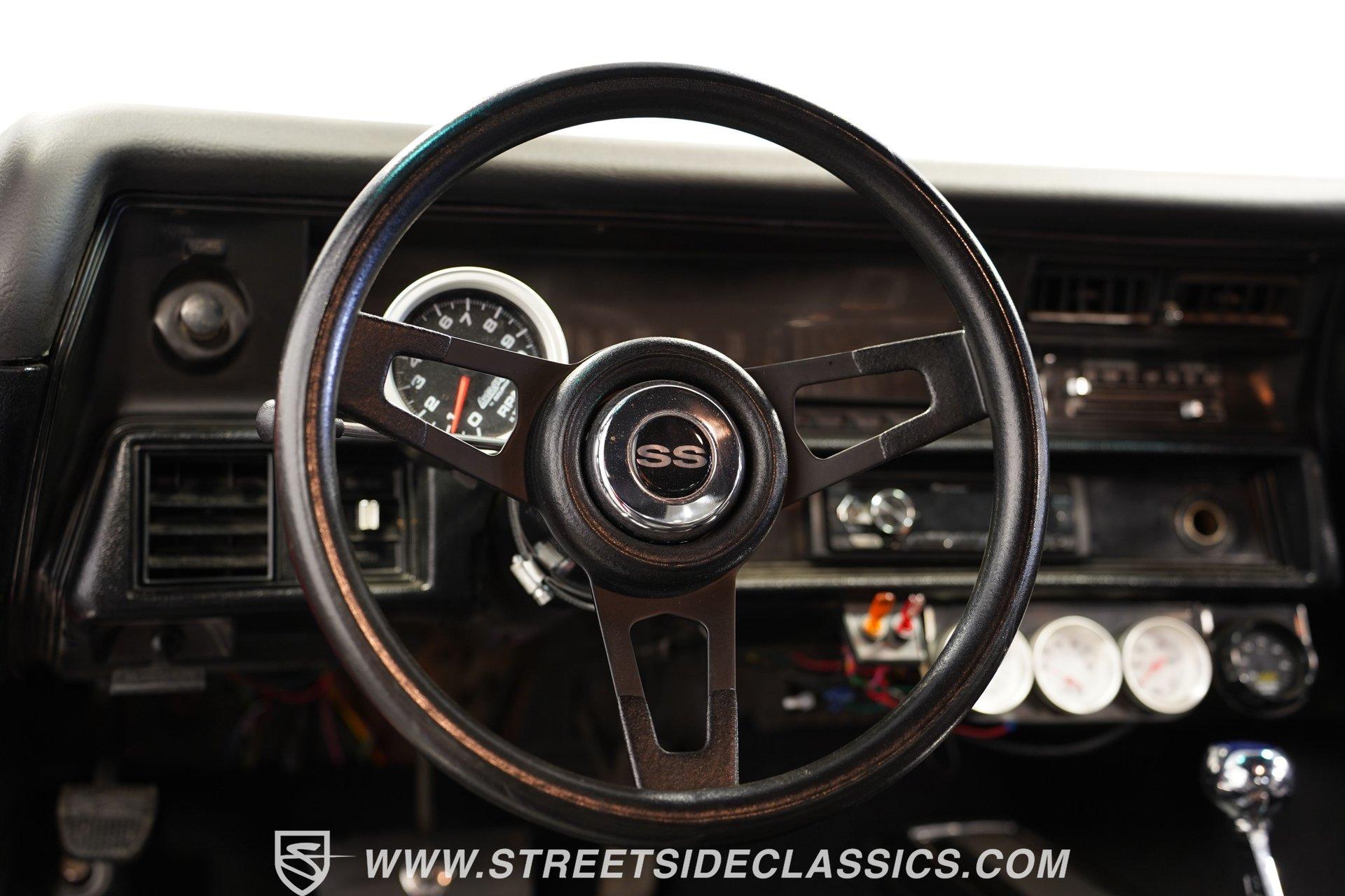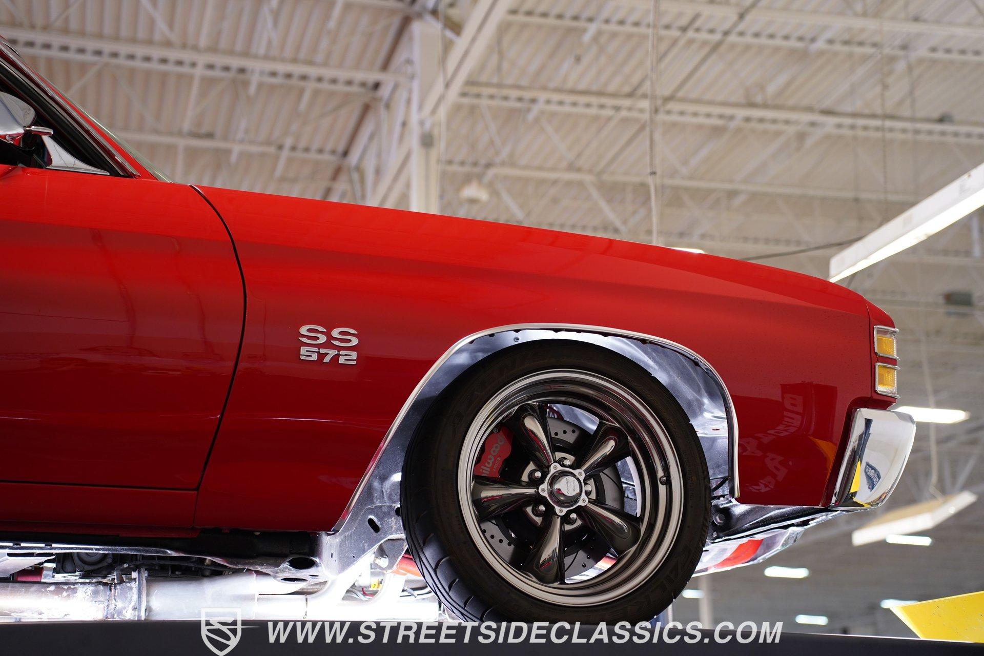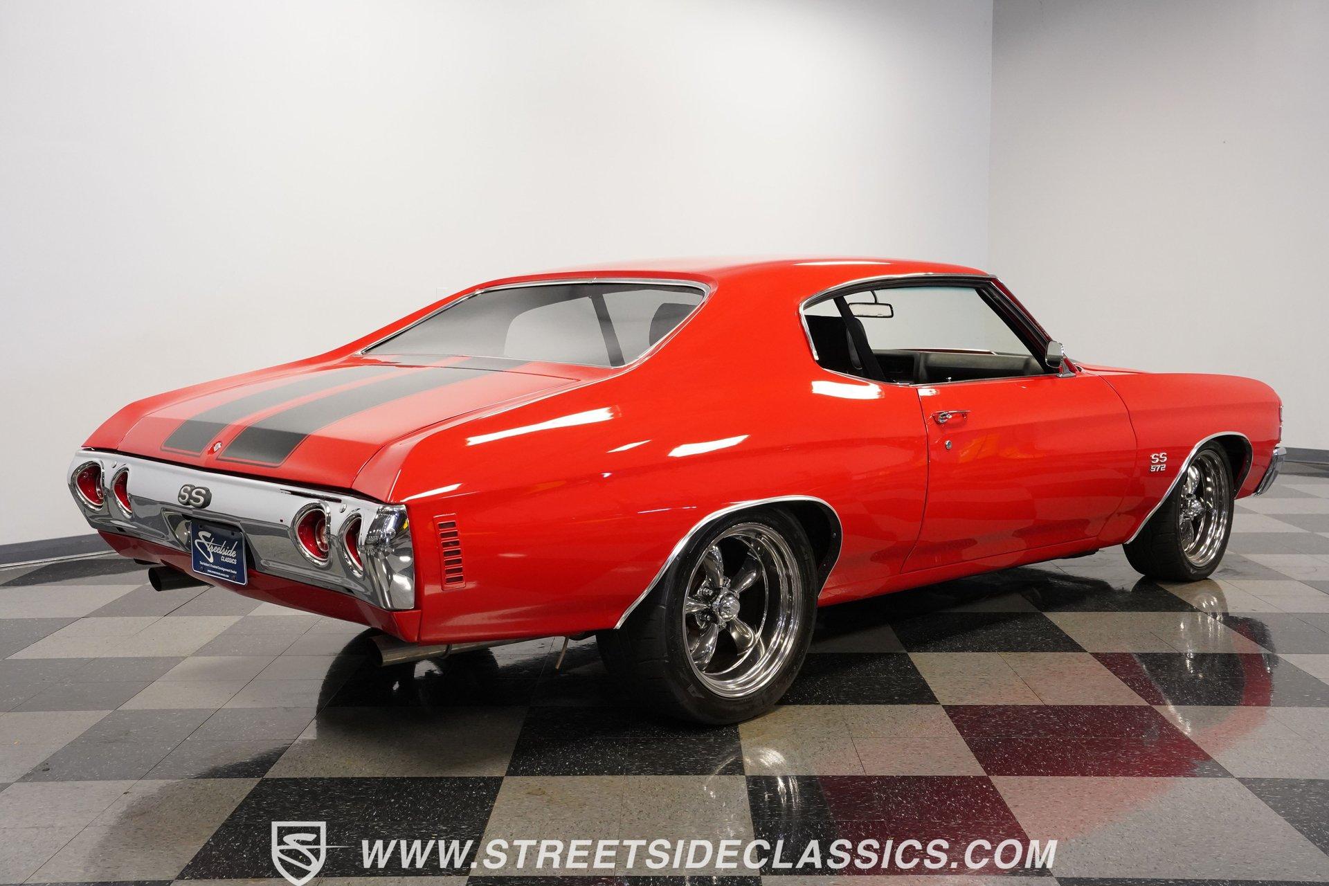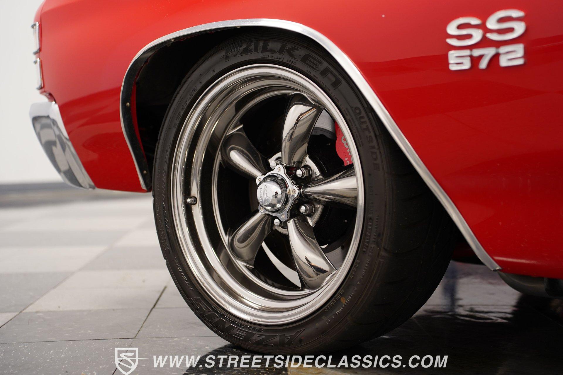 In the annals of the autoverse, muscle cars are as revered and imposing as the Chevelle. One look at this 1971 Chevrolet Chevelle SS Tribute 572 Restomod, and despite being out of production since 1977, it's easy to see why this car has left an indelible mark on enthusiasts worldwide. Fully repainted in a brilliant Red, complemented by a set of full-length black painted SS stripes to go along with its cowl-induction hood, this Tribute shows off the aggressive lines of the Chevelle from any angle. Inside, we find a clean black vinyl interior. A center console separates a pair of modern, plush, and supportive bucket seats, while a power-assisted, three-spoke steering wheel sits just ahead of a column-mounted AutoMeter 10,000 rpm tachometer, while a trio of white-faced auxiliary gauges sits under the dashboard. A chrome B&M shifter serves as both a hand rest and an excitement lever. Under the hood, we find a clean engine bay featuring a massive 572 cubic-inch V-8 engine, reportedly built by Skip White Racing engines, on display in all its glory. This Dart Big M block is topped with a classic chrome air cleaner and '572' embossed valve covers, this big block sports a single four-barrel Holley Proform 1050 carburetor, while spent gases are expelled through a set of long tube headers and Pypes dual exhaust. That power is routed through a built TH400 three-speed automatic transmission before being sent to a beefed-up nine-inch rear end, which translates those ponies to the pavement via a set of 18-inch American Racing wheels. HIGHLIGHTS: Full Red Repaint Black Racing Stripes Cowl Hood 572 Dart Big M Block Built by Skip White Racing Holley Proform 1050 Carb Long Tubes Pypes Dual Exhaust Built TH400 Built Nine Inch Rear American Racing Wheels Four Wheel Power Discs Wildwood Calipers Front Cross Drilled and Slotted Rotors Full UMI Suspension Viking Adjustable Coilovers Power Steering Black Vinyl Interior Modern Bucket Seats B&M Shifter Column Mounted Tach This 1971 Chevrolet Chevelle SS Tribute 572 Restomod is equipped with a full UMI Suspension Kit and four-wheel Viking adjustable coilovers. A power brake setup is highlighted by Wilwood calipers and a pair of cross-drilled and slotted rotors up front, which are ready to scrub off speed at a moment's notice. If you have been looking for a sinister-looking big-block monster from the Golden Age of muscle cars, then look no further because this is the car for you. Don't wait, call today!