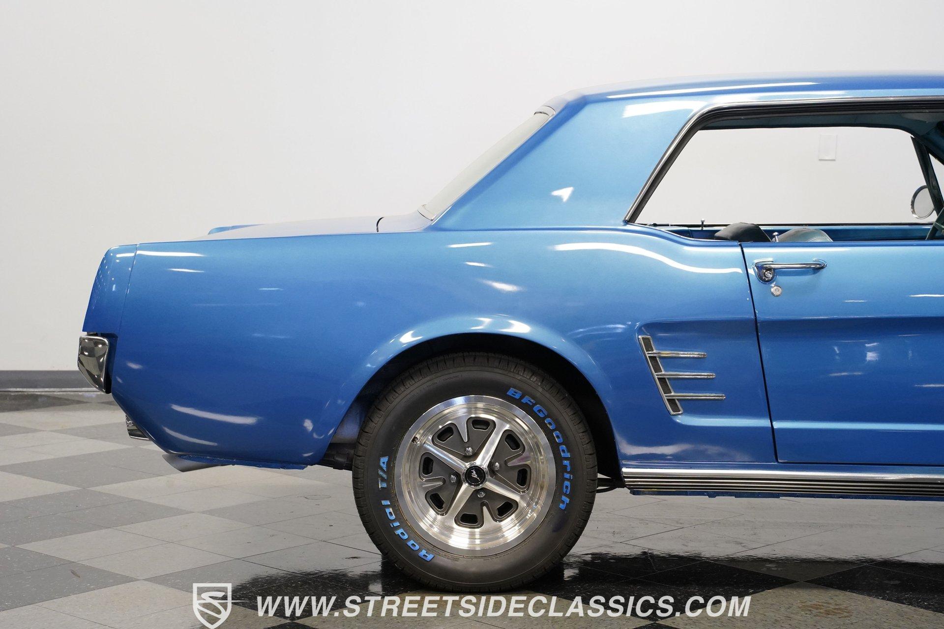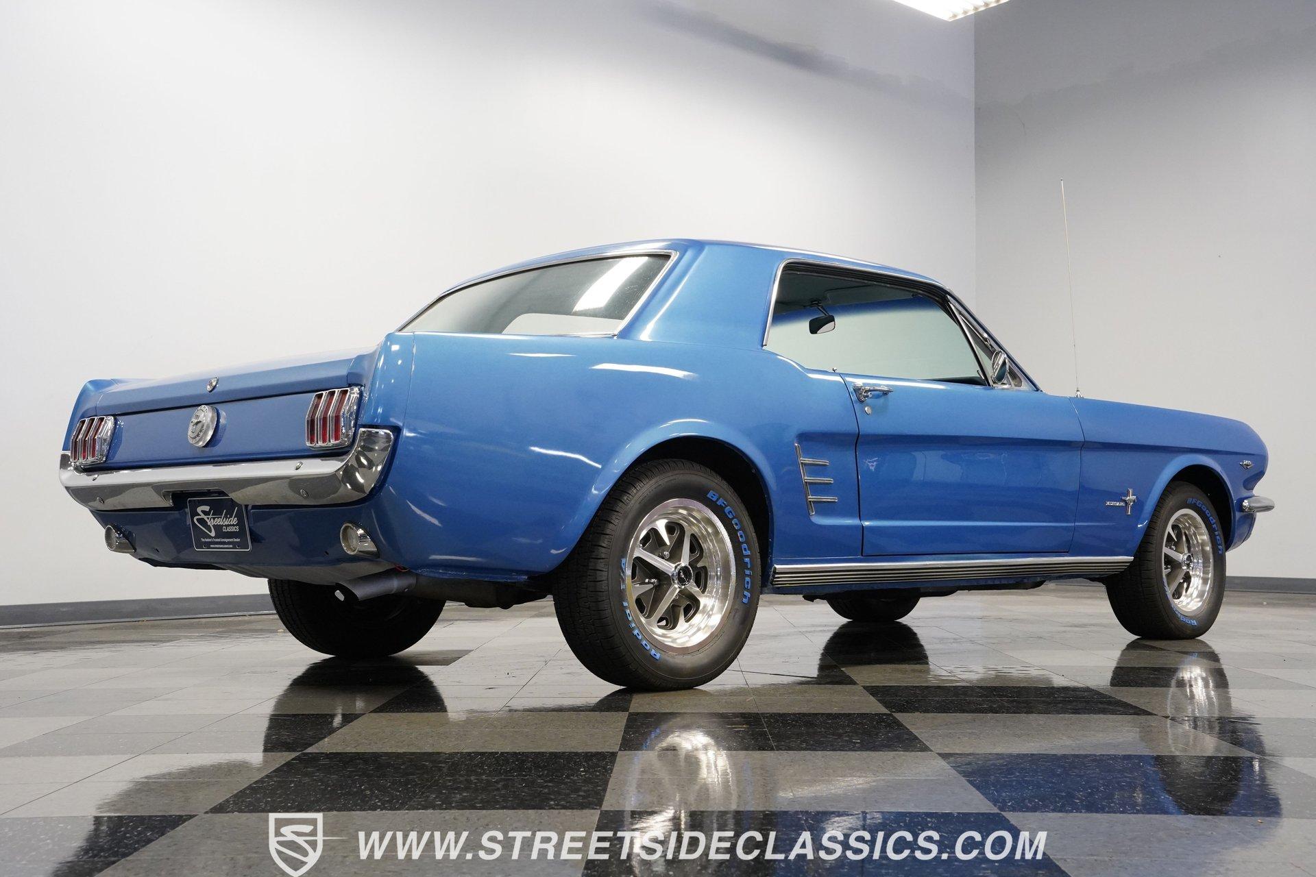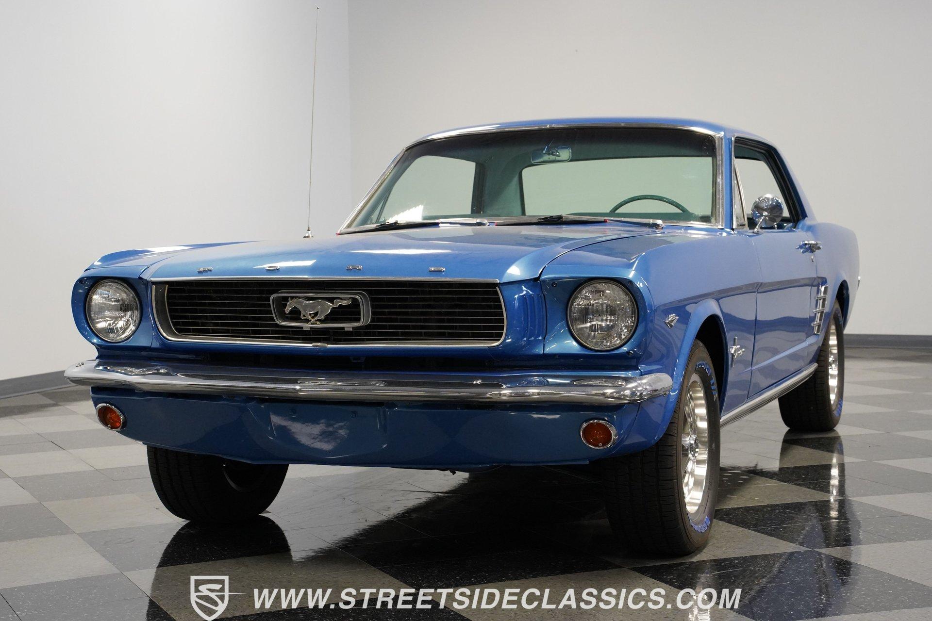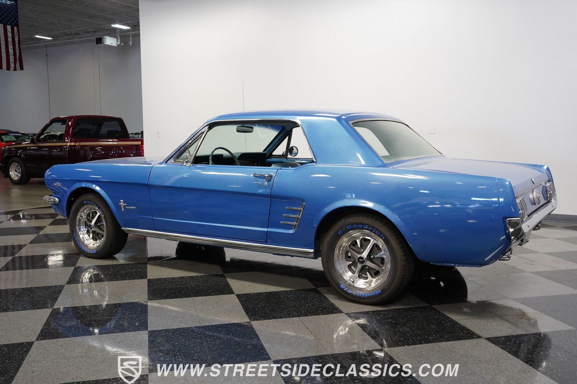 Arguably, cruising down the highway from behind the wheel of a first-generation Pony Car may just be one of the best things life has to offer. This particular 1966 Ford Mustang comes configured as a cool blue hardtop, showcasing its straight lines and aggressive stance from all angles. Inside, we find a turquoise blue vinyl and cloth interior. A three-spoke wheel showcases a Mustang center cap, positioned just ahead of a five-pod gauge cluster that features a big center-mounted 140 mph speedometer. Sliding HVAC controls keep things easy, while the under-dash-mounted air conditioning setup promises to keep things cool during those warm months. A galloping horse hologram highlights a Mustang AM/FM/Cassette head unit, and reminds everyone this Pony Car is meant to run. The real soundtrack, however, is situated beneath that steel hood. A 302 cubic-inch overhead valve V-8 engine. Outfitted with a single two-barrel carburetor and a stock-style exhaust manifold, this small block retains the original style dual-to-single exhaust along with a factory replacement muffler. Power is routed through a C4 three-speed automatic transmission before heading out to the solid-axle rear end. HIGHLIGHTS: Hardtop 302 CID V8 Single 2 Barrel Carb C4 Three Speed Auto 15 Inch Wheels BFG Tires Blue Vinyl Interior Air Conditioning Bucket Seats AM/FM/Cassette Seatbelts Heat This 1966 Ford Mustang is equipped with a stock-style suspension that utilizes coil springs, shocks, and a sway bar up front, while leaf springs and shocks comprise the rear setup. Fifteen-inch wheels show off Pony center caps, while BFGoodrich Radial T/A tires measure P215/60R-15 all around. If you have never experienced the thrill of piloting a first-gen Pony Car, then this is your chance. But don't wait, call today!