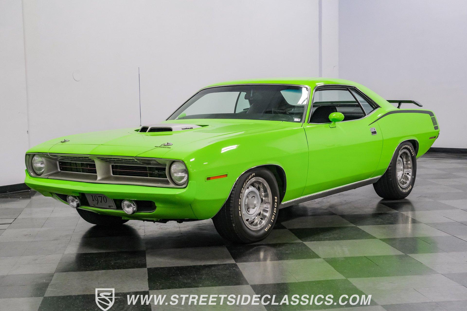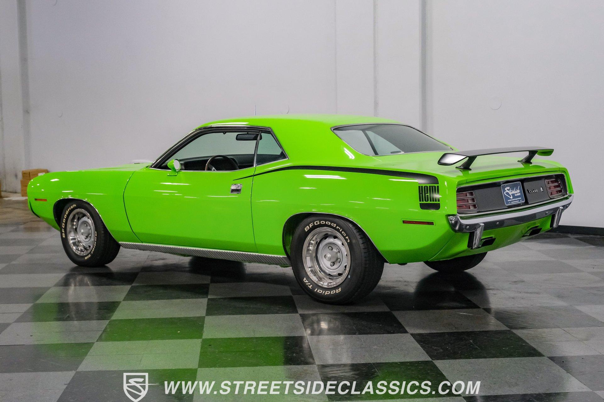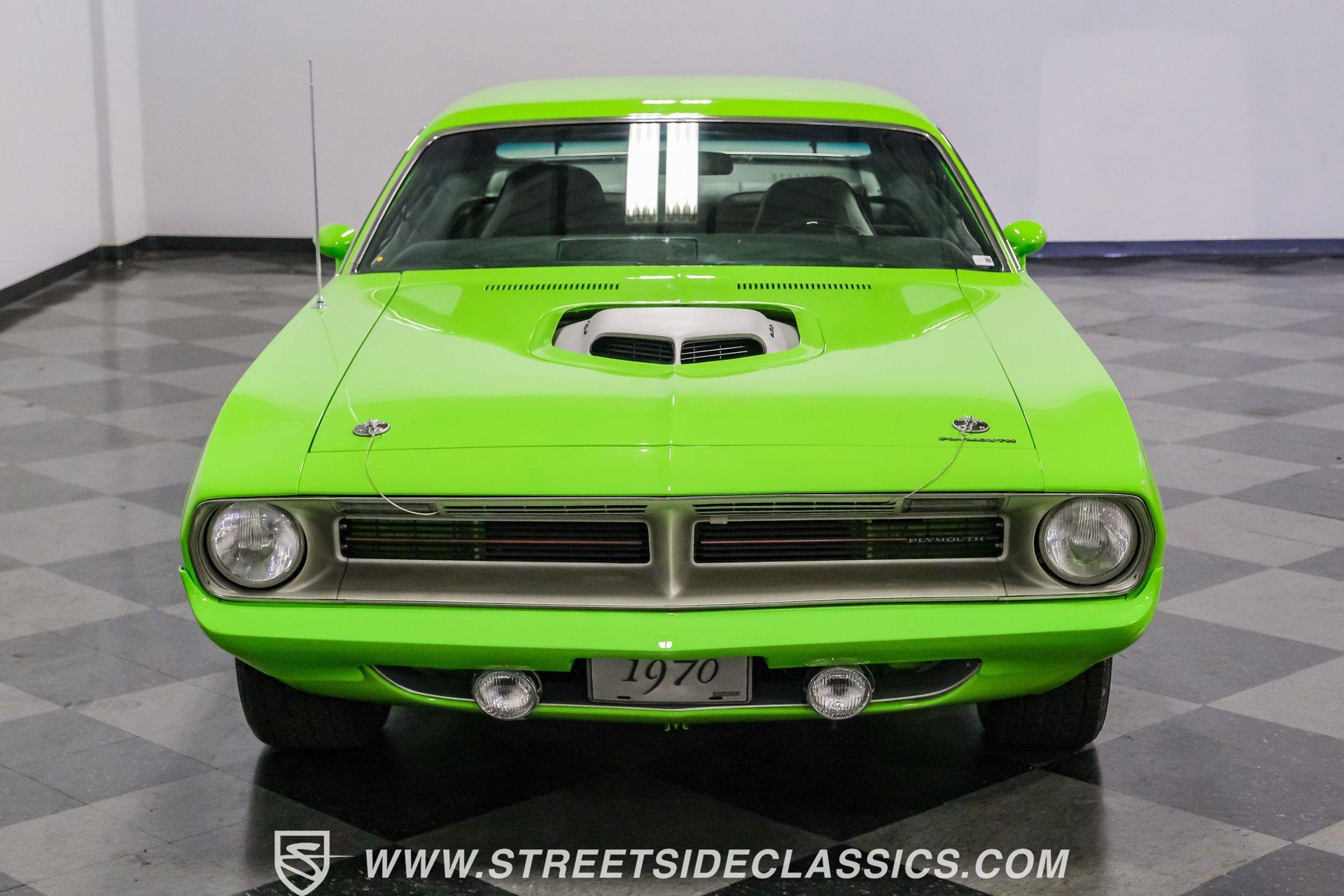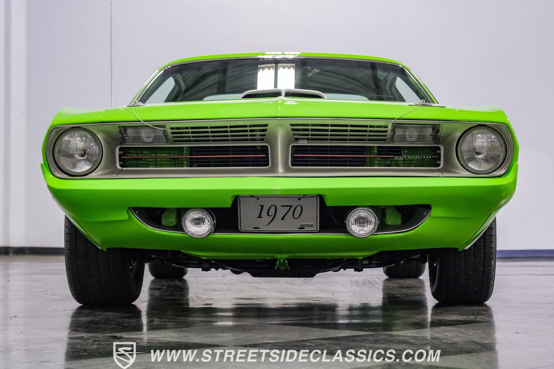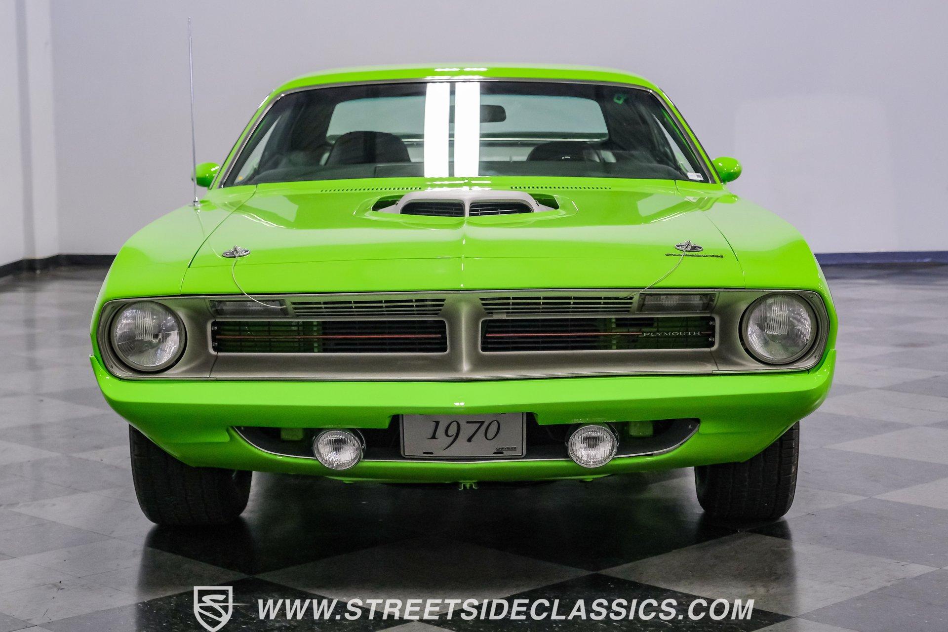 Owning a true Cuda is about making a statement, and this 1970 Plymouth Cuda Hemi Tribute captures that feeling in every line. Born an authentic 'Cuda in High Impact Lime Light, this car began life with the right bones and has been treated to a high quality restoration that dresses its classic attitude in show-ready form. With the iconic shaker hood, rear spoiler, and tasteful Hemi graphics on the quarters, it presents like a muscle car meant to be driven and admired. If you want a 1970 Plymouth Cuda with a 426 Hemi V8 and 4-speed manual that looks and feels special, this may be the one to see. Step inside and the cabin welcomes you with black vinyl bucket seats that present like new and a clean, crack-free dash. The wood grain steering wheel looks refreshed and the pistol grip shifter gives the cockpit authentic driver appeal. Air conditioning utilizes the stock AC and heat controls, and correct gauges maintain the vintage experience while Cuda floor mats and a center console add period charm. Under the hood in place of the original 383 sits a 426 Hemi V8, period correct and dressed and detailed in a very tidy bay. The transmission is a 4-speed manual which shifts smoothly and the chassis shows the results of a comprehensive frame-off style restoration with a gloss painted underside and sound suspension work. It runs dual exhaust, rides on 15 inch Rallye wheels with BF Goodrich tires, and uses power steering for easy driving. Brakes are drums front and rear and the car retains original style mechanicals that suit a true-restored cruiser. Highlights: High quality, frame-off style restoration; paint and body restored to a very high standard in factory correct Lime Light green Odometer reads 11,251; odometer is from the same car as the Hemi and is believed to reflect the engine mileage 426 Hemi V8, period correct Shaker hood 4-speed manual transmission with pistol grip shifter Air conditioning converted to R134a Power steering Drum brakes front and rear as original to this configuration Black vinyl buckets, wood grain wheel, center console Full repaint approximately 18 years ago, excellent finish with straight body panels and clean chrome and glass along with vinyl Hemi quarter decals 15 inch Rallye wheels with BF Goodrich tires 235/60R15 front and 255/60R15 rear This 1970 Plymouth Cuda Hemi Tribute blends authentic presence and thoughtful restoration into a package that is ready to be enjoyed. It represents a strong choice for collectors who appreciate period correct presentation with some modernized creature comforts. Call today!