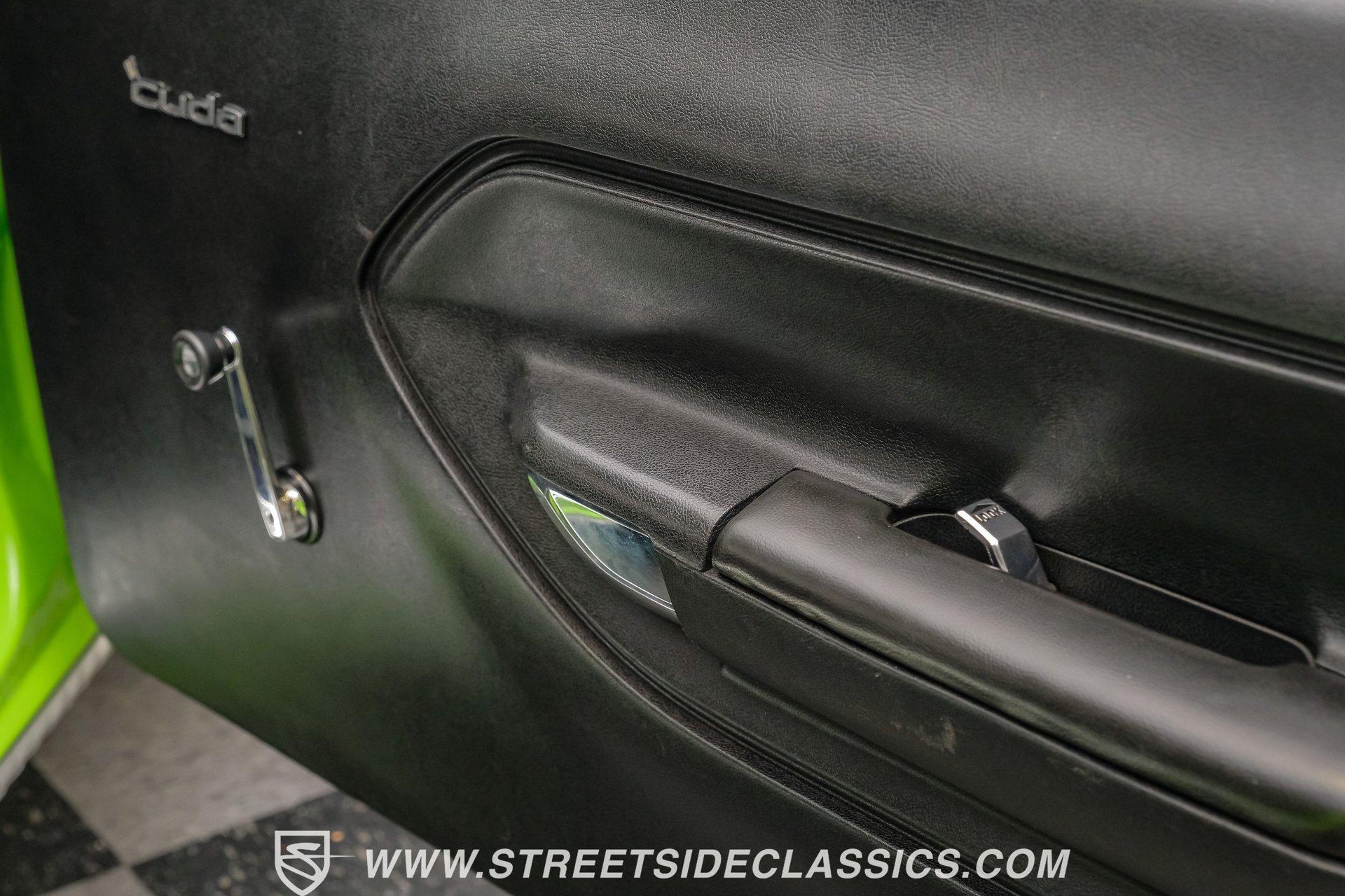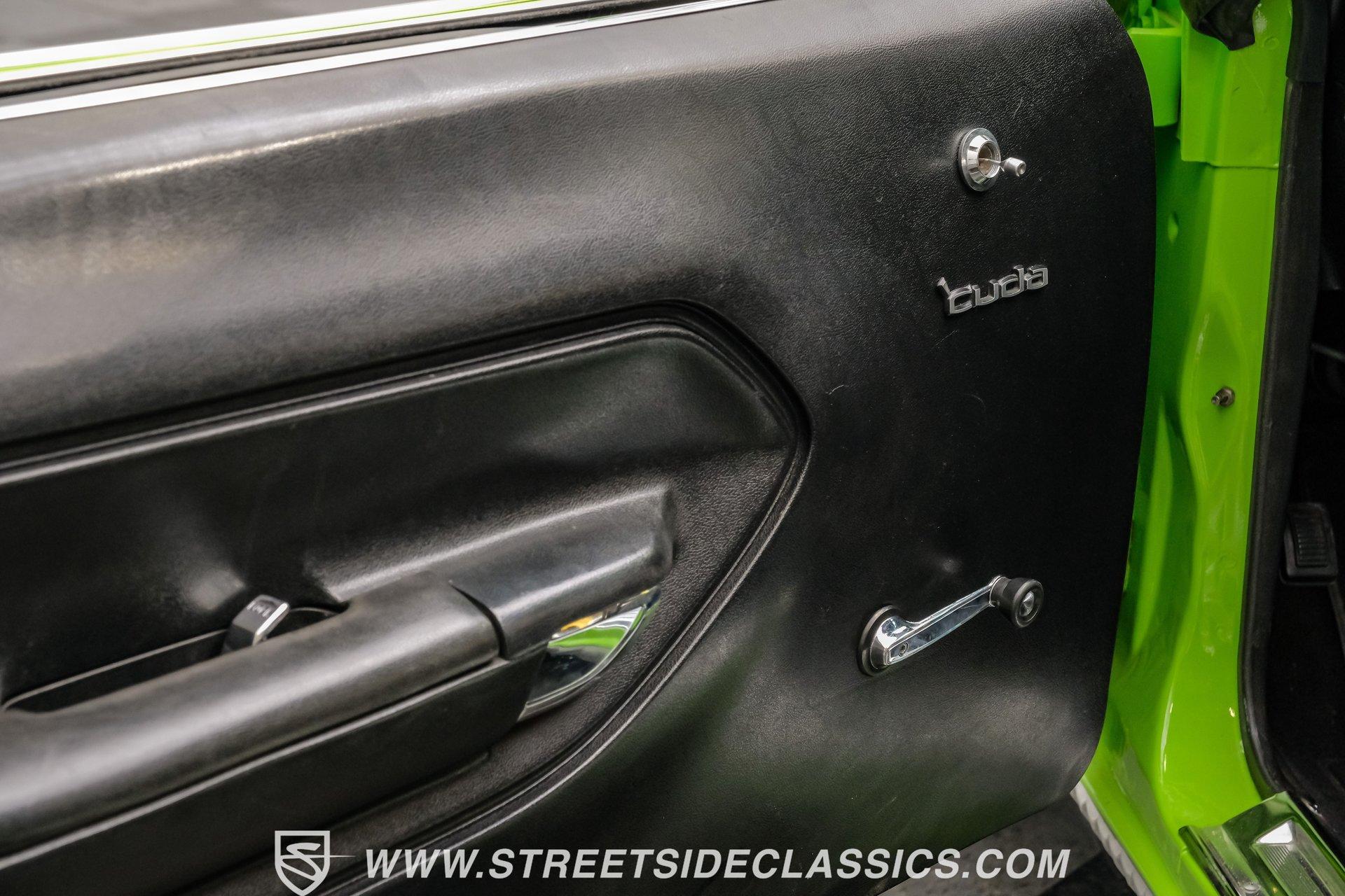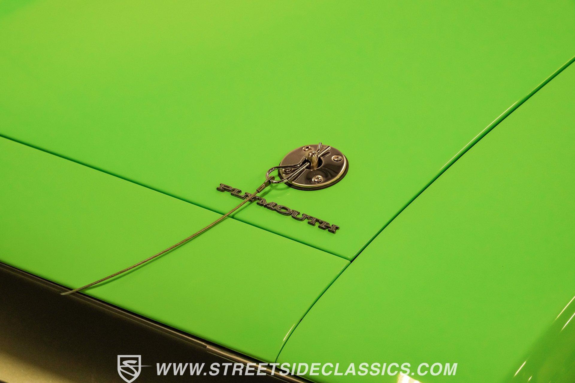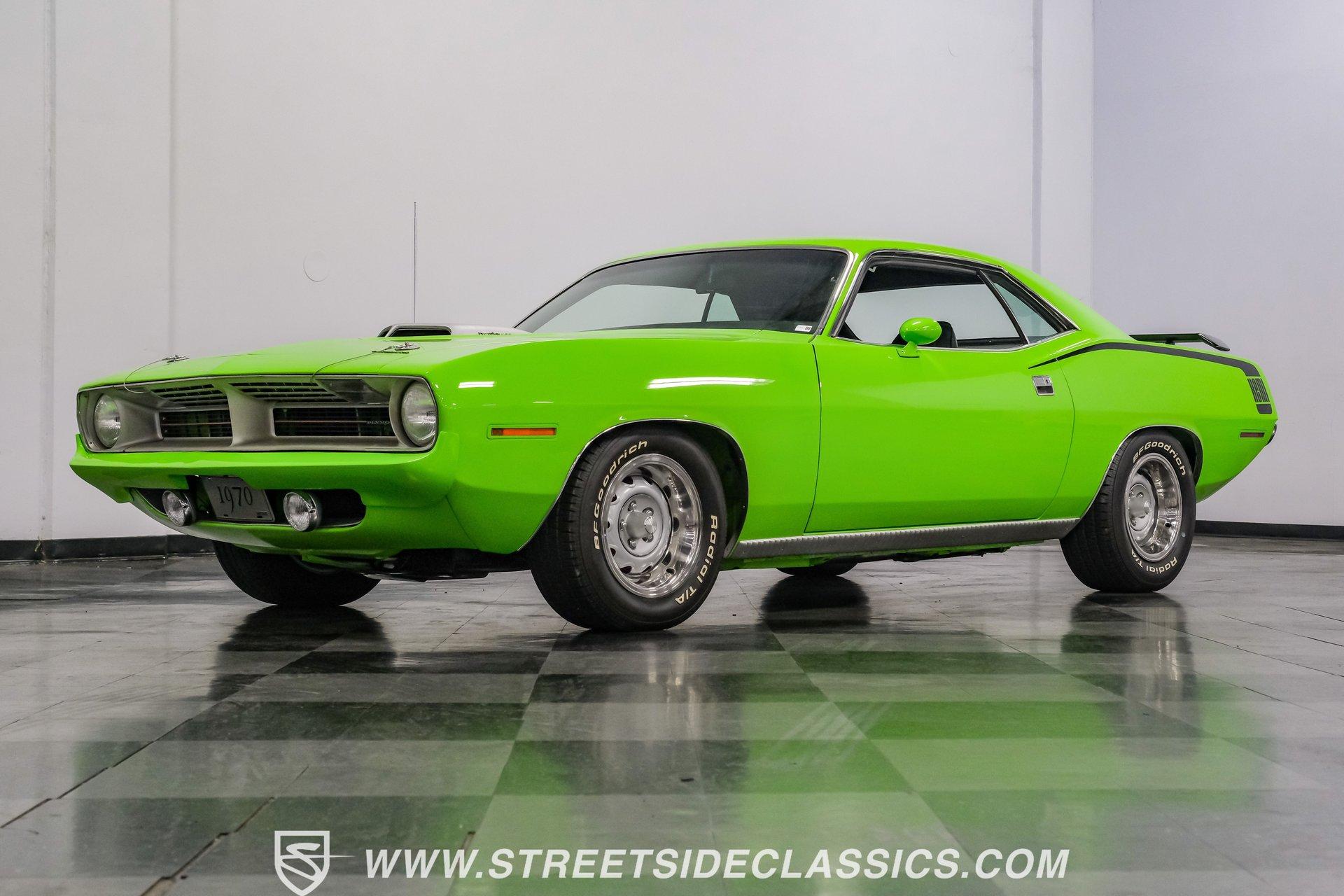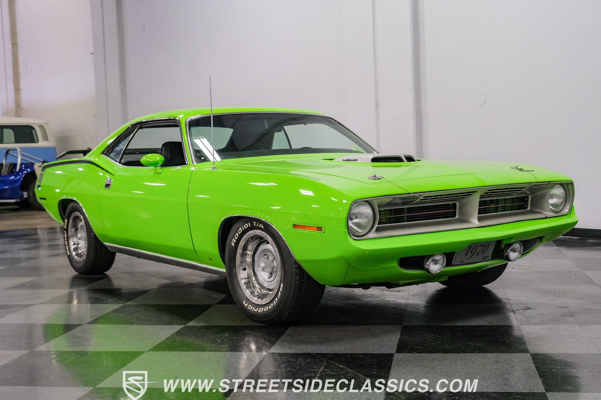 Owning a true Cuda is about making a statement, and this 1970 Plymouth Cuda Hemi Tribute captures that feeling in every line. Born an authentic 'Cuda in High Impact Lime Light, this car began life with the right bones and has been treated to a high quality restoration that dresses its classic attitude in show-ready form. With the iconic shaker hood, rear spoiler, and tasteful Hemi graphics on the quarters, it presents like a muscle car meant to be driven and admired. If you want a 1970 Plymouth Cuda with a 426 Hemi V8 and 4-speed manual that looks and feels special, this may be the one to see. Step inside and the cabin welcomes you with black vinyl bucket seats that present like new and a clean, crack-free dash. The wood grain steering wheel looks refreshed and the pistol grip shifter gives the cockpit authentic driver appeal. Air conditioning utilizes the stock AC and heat controls, and correct gauges maintain the vintage experience while Cuda floor mats and a center console add period charm. Under the hood in place of the original 383 sits a 426 Hemi V8, period correct and dressed and detailed in a very tidy bay. The transmission is a 4-speed manual which shifts smoothly and the chassis shows the results of a comprehensive frame-off style restoration with a gloss painted underside and sound suspension work. It runs dual exhaust, rides on 15 inch Rallye wheels with BF Goodrich tires, and uses power steering for easy driving. Brakes are drums front and rear and the car retains original style mechanicals that suit a true-restored cruiser. Highlights: High quality, frame-off style restoration; paint and body restored to a very high standard in factory correct Lime Light green Odometer reads 11,251; odometer is from the same car as the Hemi and is believed to reflect the engine mileage 426 Hemi V8, period correct Shaker hood 4-speed manual transmission with pistol grip shifter Air conditioning converted to R134a Power steering Drum brakes front and rear as original to this configuration Black vinyl buckets, wood grain wheel, center console Full repaint approximately 18 years ago, excellent finish with straight body panels and clean chrome and glass along with vinyl Hemi quarter decals 15 inch Rallye wheels with BF Goodrich tires 235/60R15 front and 255/60R15 rear This 1970 Plymouth Cuda Hemi Tribute blends authentic presence and thoughtful restoration into a package that is ready to be enjoyed. It represents a strong choice for collectors who appreciate period correct presentation with some modernized creature comforts. Call today!