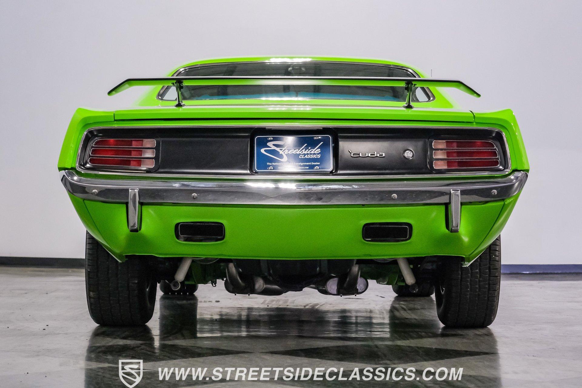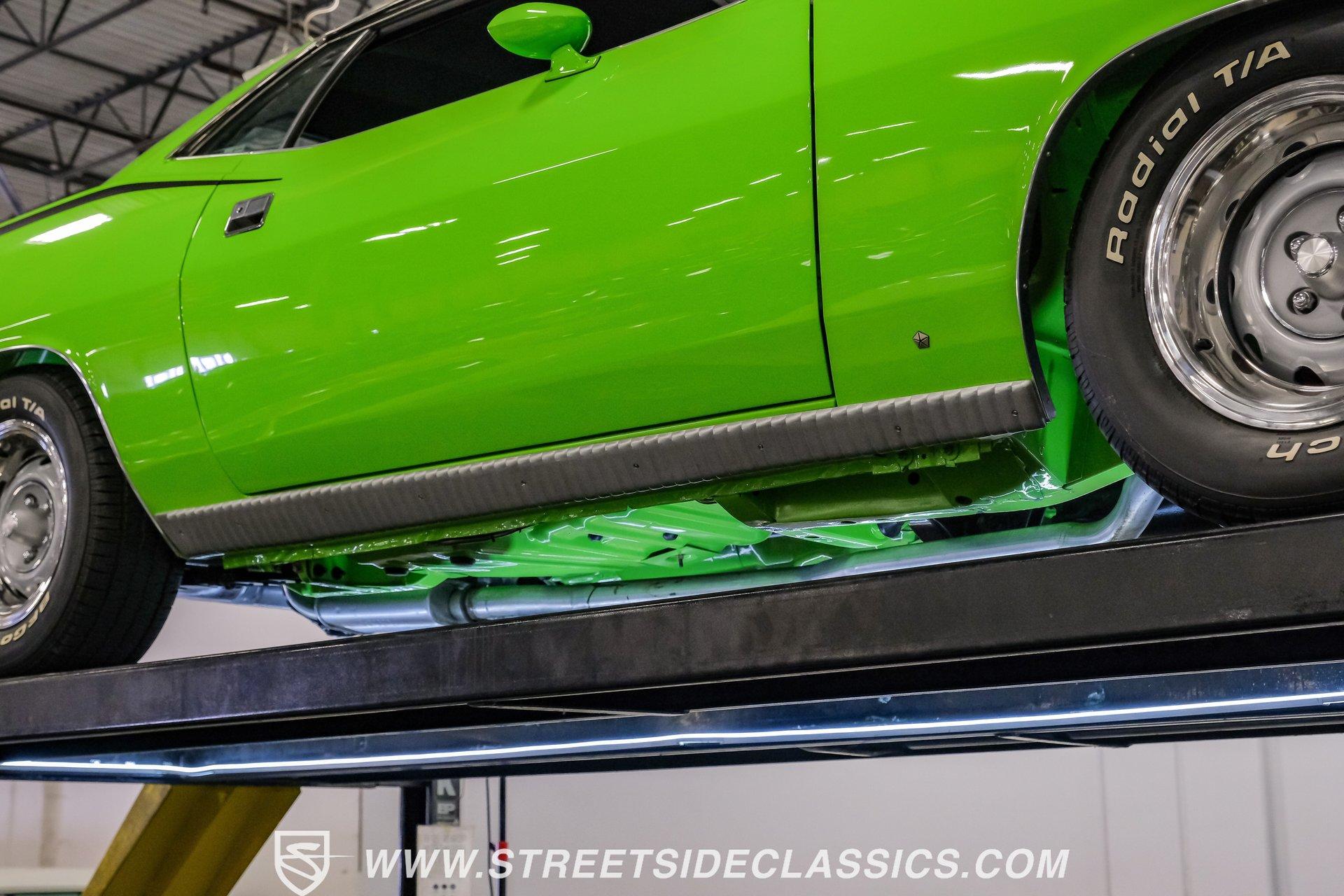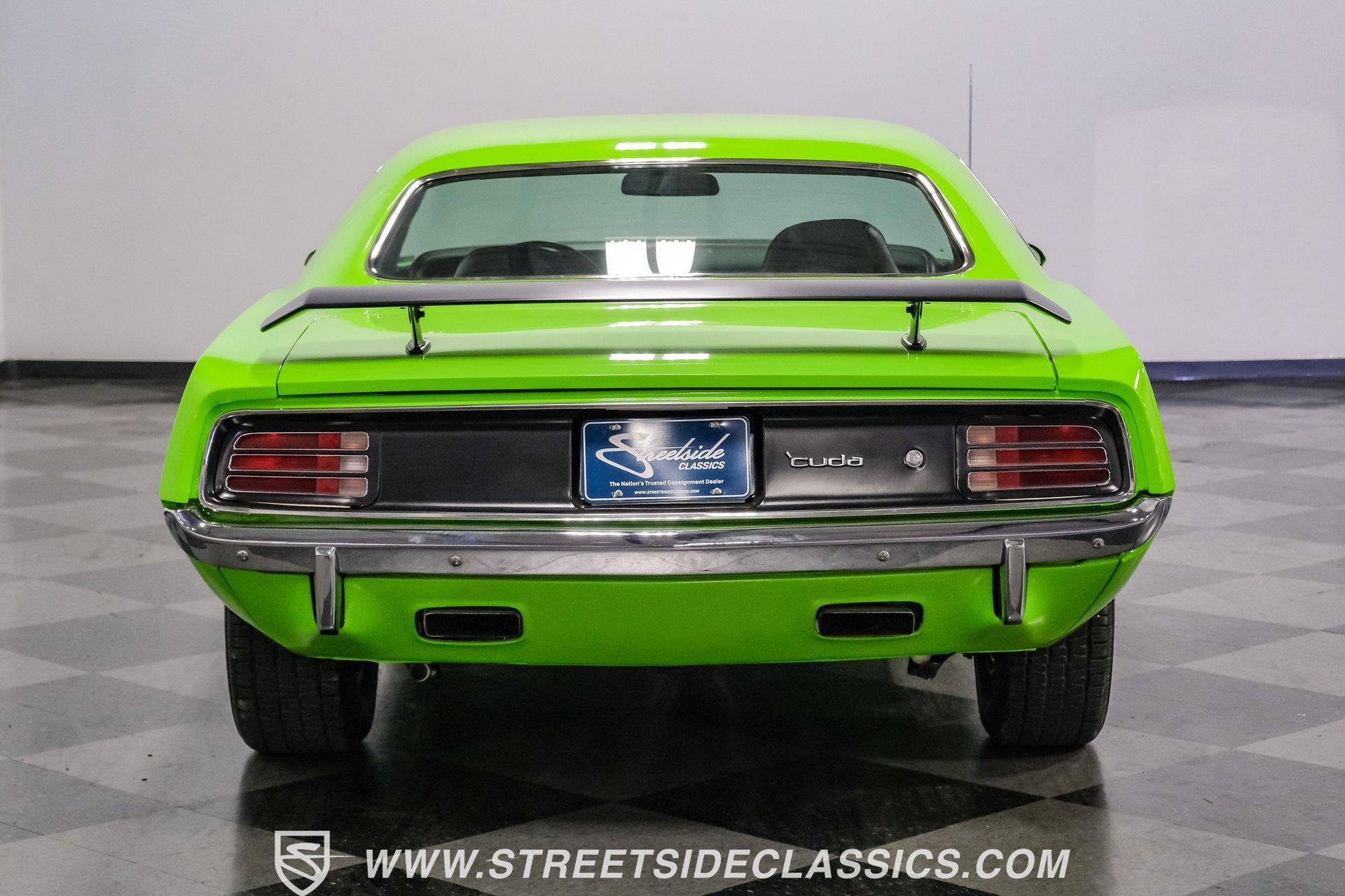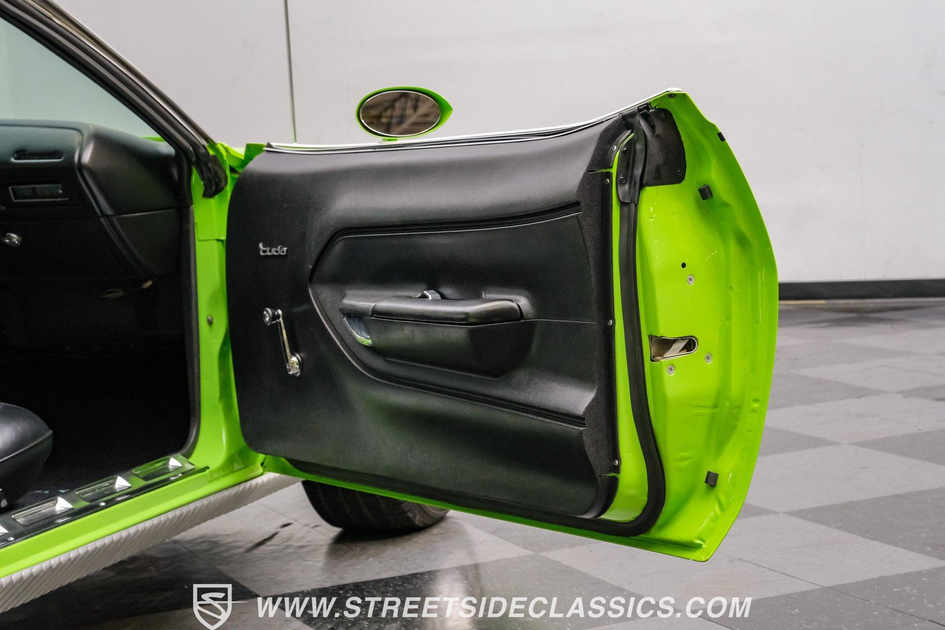 Owning a true Cuda is about making a statement, and this 1970 Plymouth Cuda Hemi Tribute captures that feeling in every line. Born an authentic 'Cuda in High Impact Lime Light, this car began life with the right bones and has been treated to a high quality restoration that dresses its classic attitude in show-ready form. With the iconic shaker hood, rear spoiler, and tasteful Hemi graphics on the quarters, it presents like a muscle car meant to be driven and admired. If you want a 1970 Plymouth Cuda with a 426 Hemi V8 and 4-speed manual that looks and feels special, this may be the one to see. Step inside and the cabin welcomes you with black vinyl bucket seats that present like new and a clean, crack-free dash. The wood grain steering wheel looks refreshed and the pistol grip shifter gives the cockpit authentic driver appeal. Air conditioning utilizes the stock AC and heat controls, and correct gauges maintain the vintage experience while Cuda floor mats and a center console add period charm. Under the hood in place of the original 383 sits a 426 Hemi V8, period correct and dressed and detailed in a very tidy bay. The transmission is a 4-speed manual which shifts smoothly and the chassis shows the results of a comprehensive frame-off style restoration with a gloss painted underside and sound suspension work. It runs dual exhaust, rides on 15 inch Rallye wheels with BF Goodrich tires, and uses power steering for easy driving. Brakes are drums front and rear and the car retains original style mechanicals that suit a true-restored cruiser. Highlights: High quality, frame-off style restoration; paint and body restored to a very high standard in factory correct Lime Light green Odometer reads 11,251; odometer is from the same car as the Hemi and is believed to reflect the engine mileage 426 Hemi V8, period correct Shaker hood 4-speed manual transmission with pistol grip shifter Air conditioning converted to R134a Power steering Drum brakes front and rear as original to this configuration Black vinyl buckets, wood grain wheel, center console Full repaint approximately 18 years ago, excellent finish with straight body panels and clean chrome and glass along with vinyl Hemi quarter decals 15 inch Rallye wheels with BF Goodrich tires 235/60R15 front and 255/60R15 rear This 1970 Plymouth Cuda Hemi Tribute blends authentic presence and thoughtful restoration into a package that is ready to be enjoyed. It represents a strong choice for collectors who appreciate period correct presentation with some modernized creature comforts. Call today!