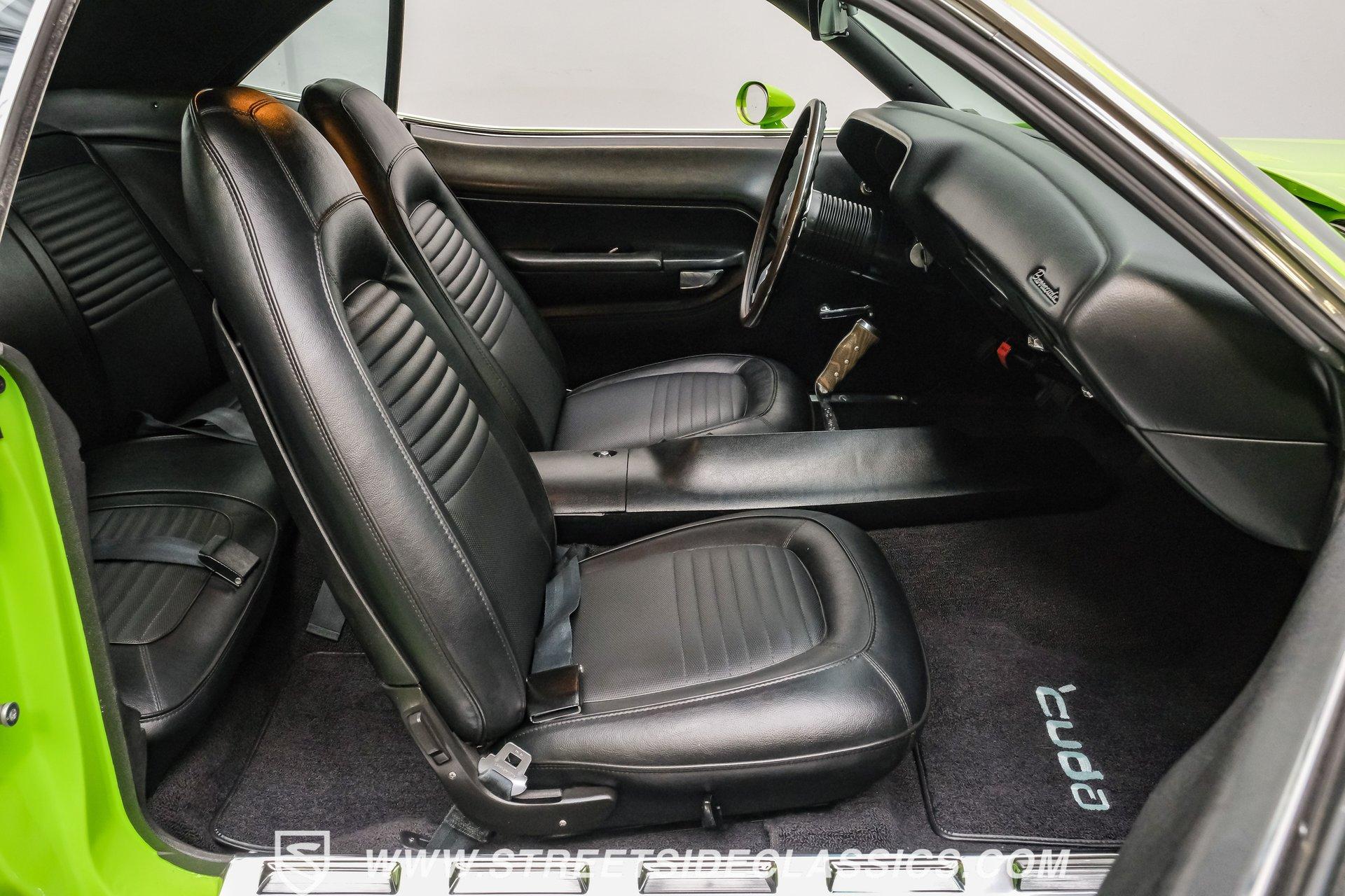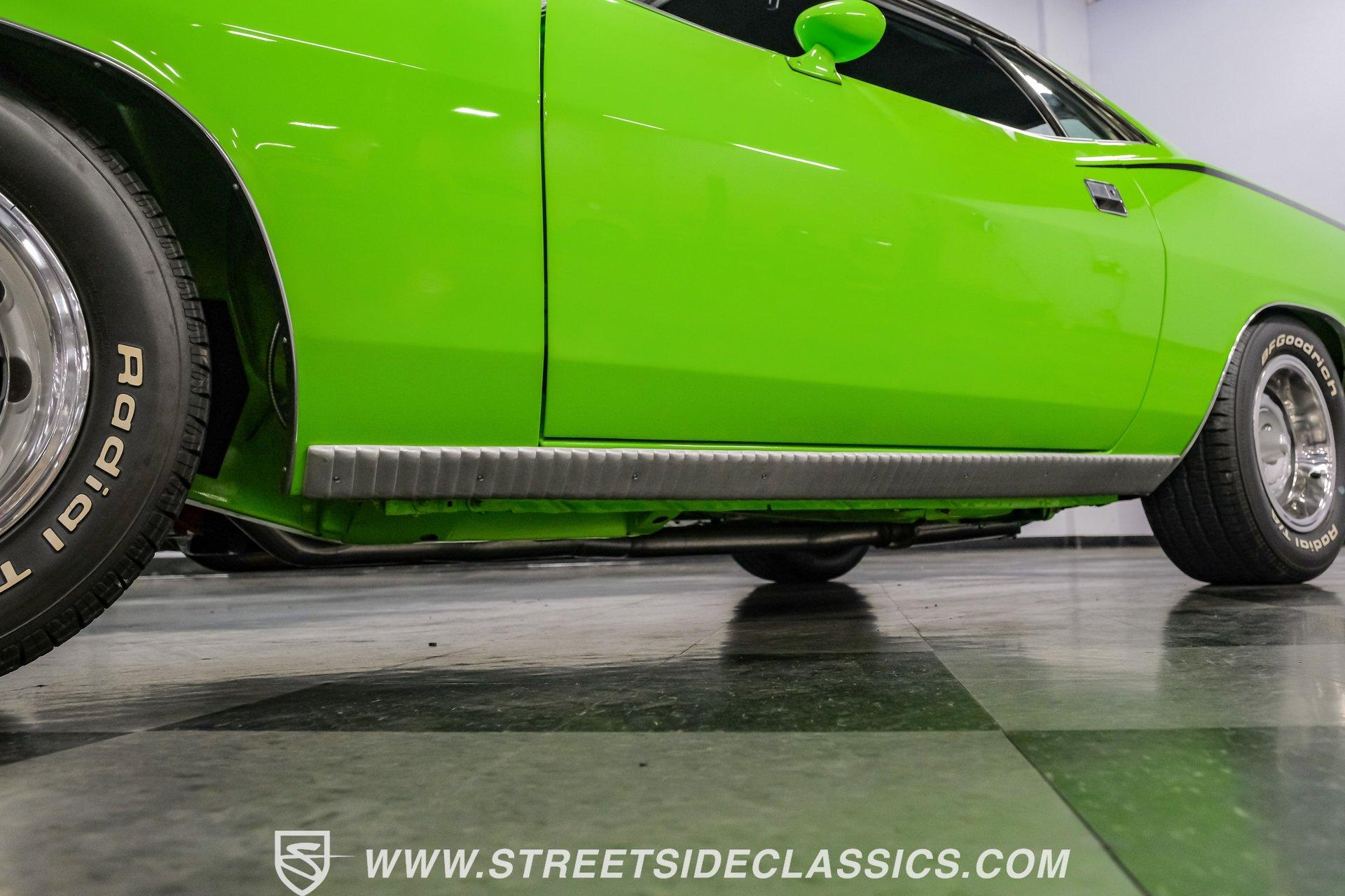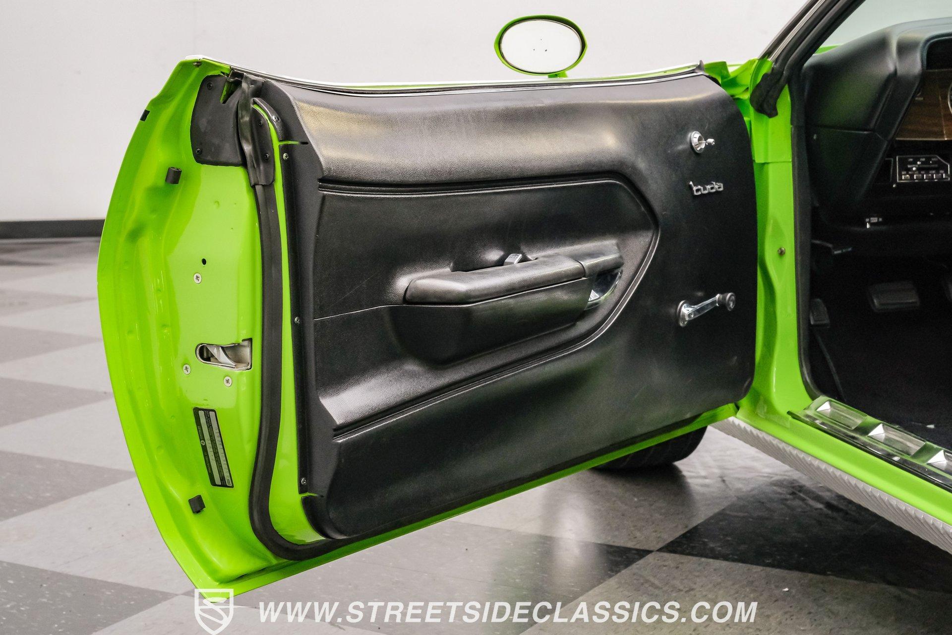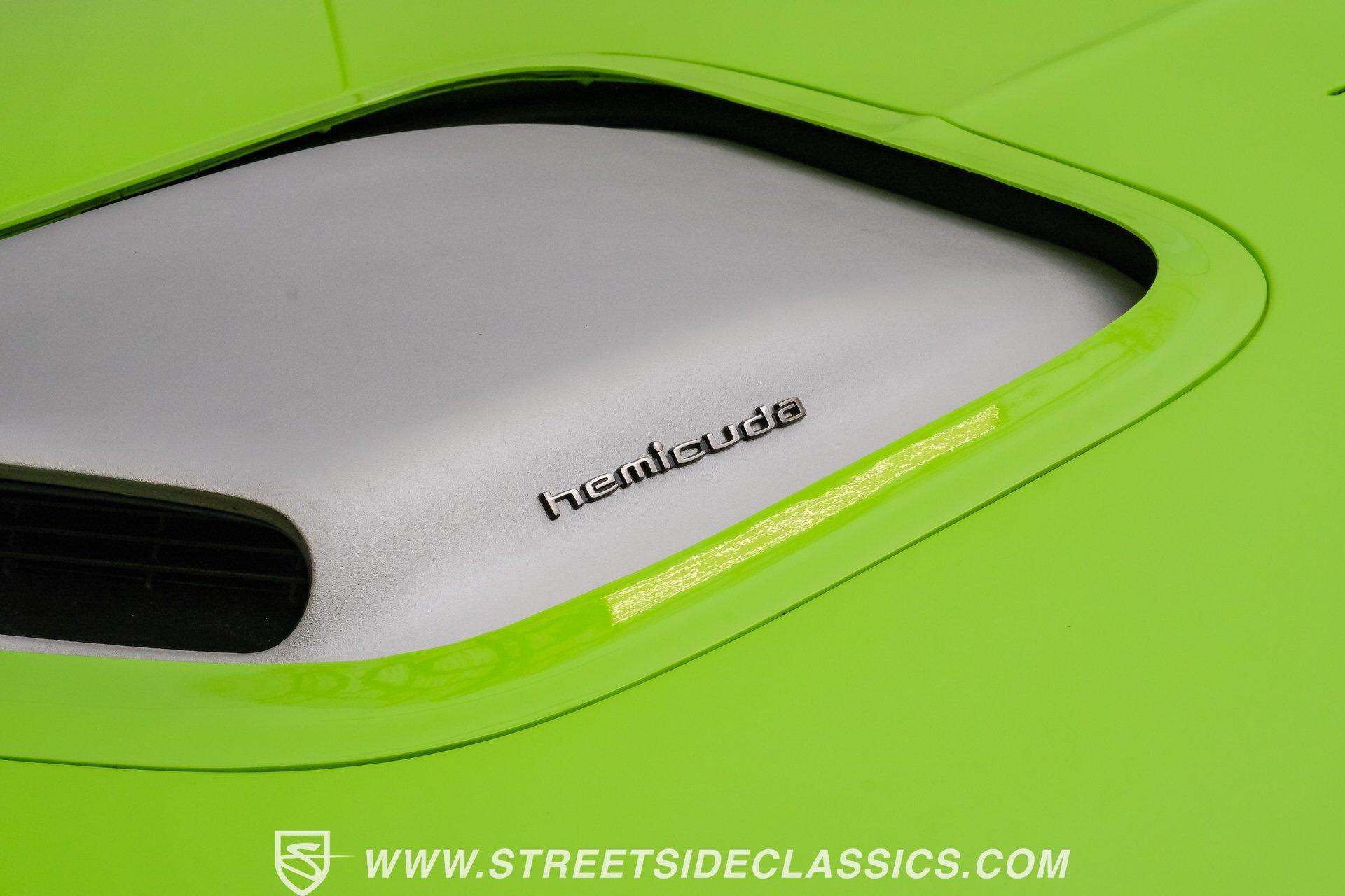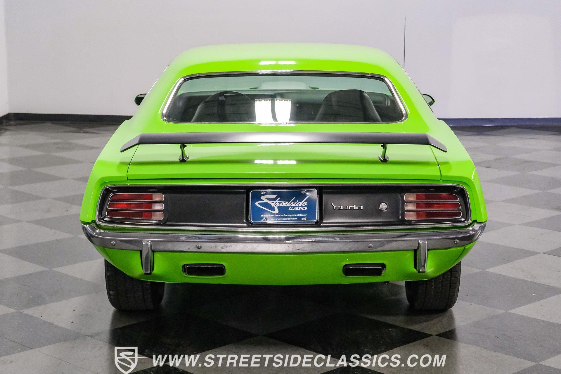 Owning a true Cuda is about making a statement, and this 1970 Plymouth Cuda Hemi Tribute captures that feeling in every line. Born an authentic 'Cuda in High Impact Lime Light, this car began life with the right bones and has been treated to a high quality restoration that dresses its classic attitude in show-ready form. With the iconic shaker hood, rear spoiler, and tasteful Hemi graphics on the quarters, it presents like a muscle car meant to be driven and admired. If you want a 1970 Plymouth Cuda with a 426 Hemi V8 and 4-speed manual that looks and feels special, this may be the one to see. Step inside and the cabin welcomes you with black vinyl bucket seats that present like new and a clean, crack-free dash. The wood grain steering wheel looks refreshed and the pistol grip shifter gives the cockpit authentic driver appeal. Air conditioning utilizes the stock AC and heat controls, and correct gauges maintain the vintage experience while Cuda floor mats and a center console add period charm. Under the hood in place of the original 383 sits a 426 Hemi V8, period correct and dressed and detailed in a very tidy bay. The transmission is a 4-speed manual which shifts smoothly and the chassis shows the results of a comprehensive frame-off style restoration with a gloss painted underside and sound suspension work. It runs dual exhaust, rides on 15 inch Rallye wheels with BF Goodrich tires, and uses power steering for easy driving. Brakes are drums front and rear and the car retains original style mechanicals that suit a true-restored cruiser. Highlights: High quality, frame-off style restoration; paint and body restored to a very high standard in factory correct Lime Light green Odometer reads 11,251; odometer is from the same car as the Hemi and is believed to reflect the engine mileage 426 Hemi V8, period correct Shaker hood 4-speed manual transmission with pistol grip shifter Air conditioning converted to R134a Power steering Drum brakes front and rear as original to this configuration Black vinyl buckets, wood grain wheel, center console Full repaint approximately 18 years ago, excellent finish with straight body panels and clean chrome and glass along with vinyl Hemi quarter decals 15 inch Rallye wheels with BF Goodrich tires 235/60R15 front and 255/60R15 rear This 1970 Plymouth Cuda Hemi Tribute blends authentic presence and thoughtful restoration into a package that is ready to be enjoyed. It represents a strong choice for collectors who appreciate period correct presentation with some modernized creature comforts. Call today!