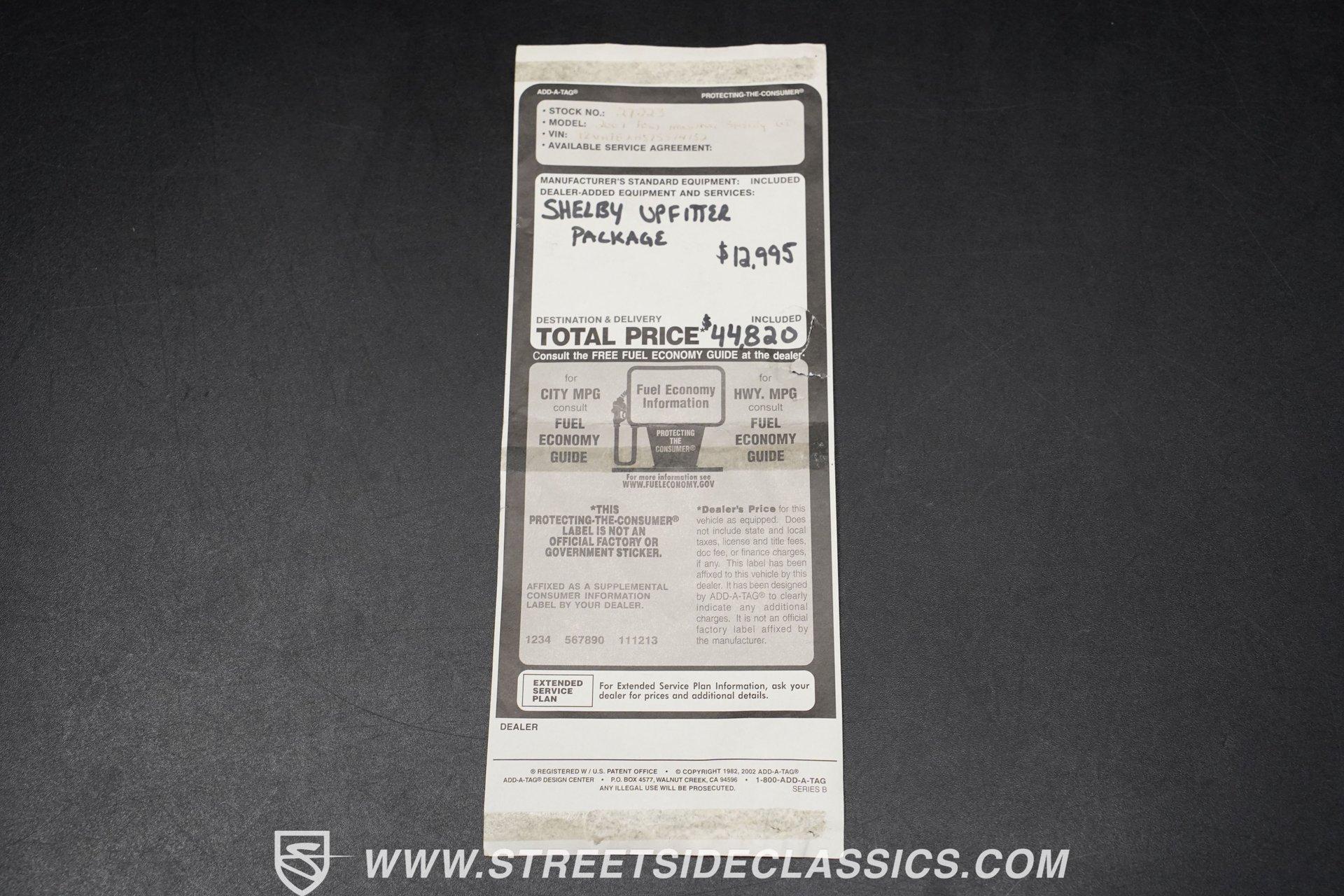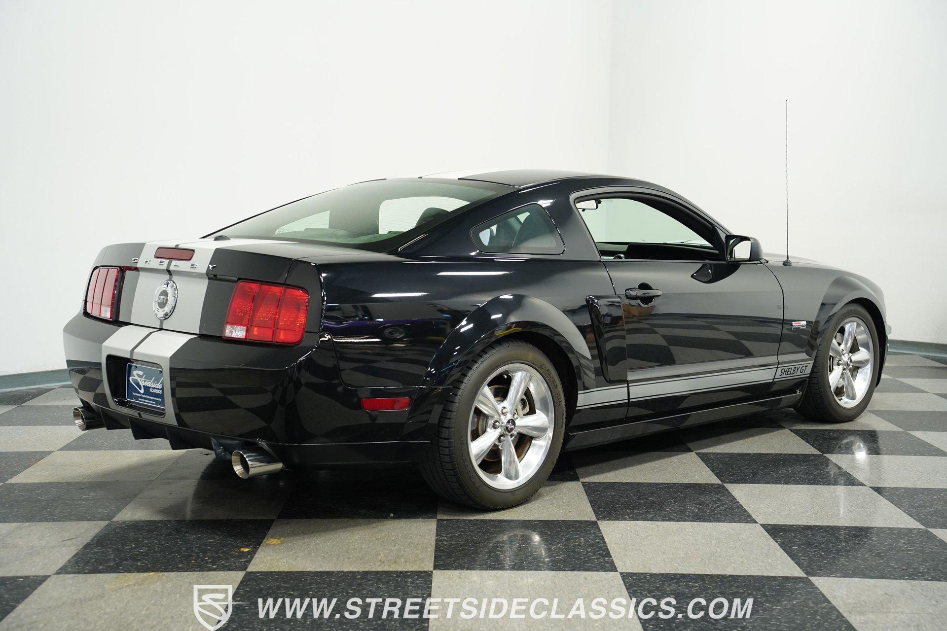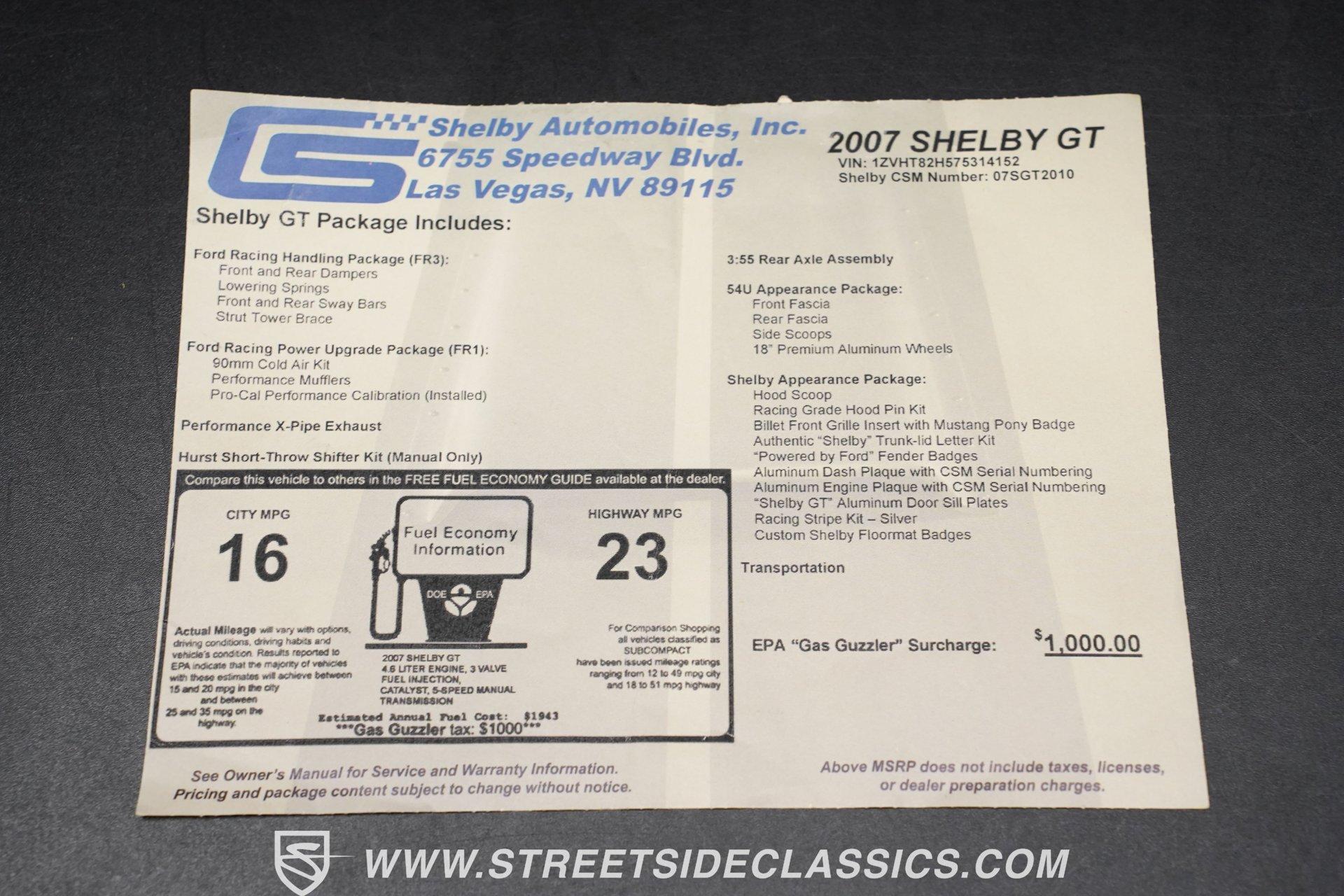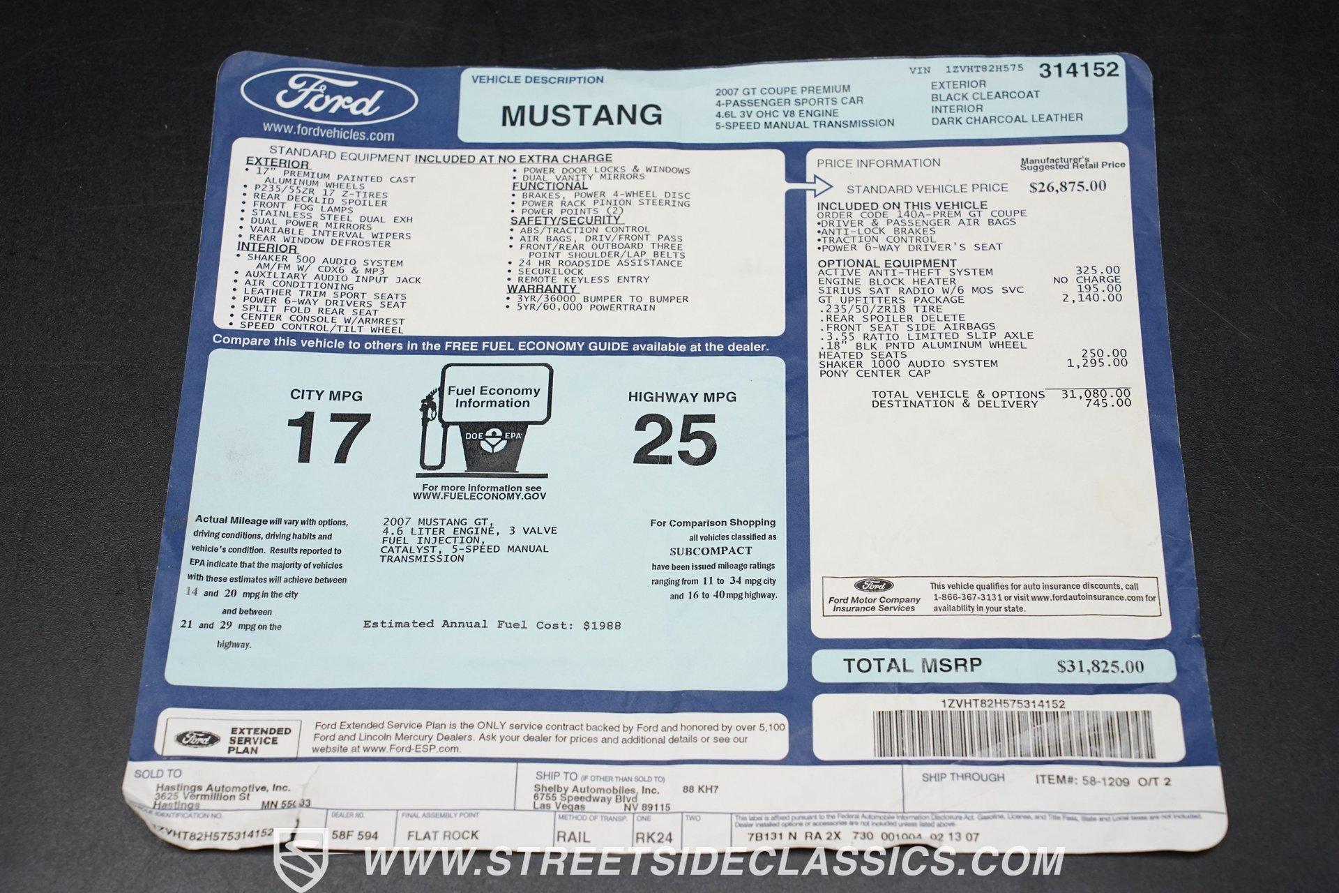Anytime you add the name Shelby to a car, it instantly gets more impressive. Along with the GT500 in the same year, the Godfather of Ford performance returned with this 2007 Ford Mustang Shelby GT. One of just 5,632 Shelby GTs produced in its inaugural year, this car is among the 3,373 to feature a black paint scheme and manual transmission, making it as rare as it is impressive. Add to that a mere 10,213 actual miles on its odometer and its original window sticker, and this late model Pony Car is quickly becoming a collectible show steed. Inside, specific Shelby GT door bezels greet you as soon as the door opens, and a plaque displaying this car's unique serial number is mounted in the middle of the dashboard to further underscore that this Mustang is something special. A short-throw Hurst shifter and brushed aluminum pedal covers are subtle upgrades that add to the overall performance vibe of the car. Heated power leather seats, power mirrors, power locks, cruise control, air conditioning, and a Shaker 1000 premium audio system provide all the modern amenities one could want. Under the hood is an aluminum block and heads, naturally-aspirated SOHC 4.6-liter Modular V-8 engine. Upgraded with a cold-air intake, unique X-pipe dual exhaust, and Ford Racing-specific recalibration, this small block was capable of pumping out 319 horsepower at 5,750 rpm and 330 pound-feet of torque at 4,500 rpm. Power is routed through Tremec TR-3650 five-speed manual transmission before heading out to the 3.55-geared limited-slip rear end. HIGHLIGHTS: 10,213 Actual Miles One of 3,373 Black Manual Transmission GTs Original Window Sticker Racing Stripes Shelby Badging Unique Serial Numbered Plaque 4.6 Liter V8 CAI Ford Racing Tune Unique X-Pipe Exhaust Tremec Five Speed Manual 3.55 Limited Slip Rear 18 Inch Wheels Power Steering Leather Power Windows Power Locks Power Mirrors Shaker 1000 Stereo Hust Short Throw Shifter Four Wheel Power Disc Brakes This 2007 Ford Mustang Shelby GT is equipped with a Ford Racing suspension that lowers the car a full 1.5 inches, while adding improved sway bar, dampers, and springs. Hiding behind the old-school-looking five-spoke polished aluminum wheels shod in performance-oriented tires are power disc brakes at all four corners. From the factory, the Shelby GT was capable of running from 0 to 60 in the low-five-second range and through the quarter mile in the low 13 seconds. If you have been looking for a rare late-model muscle car, this is the one for you. Don't wait, call today!