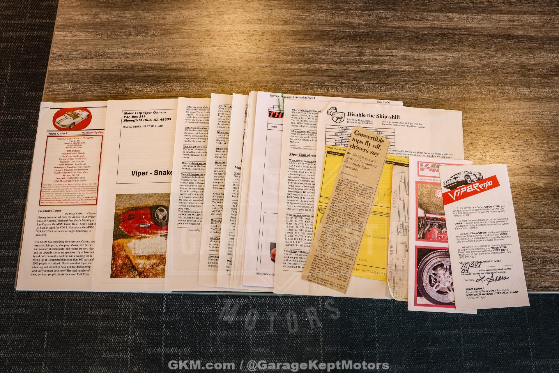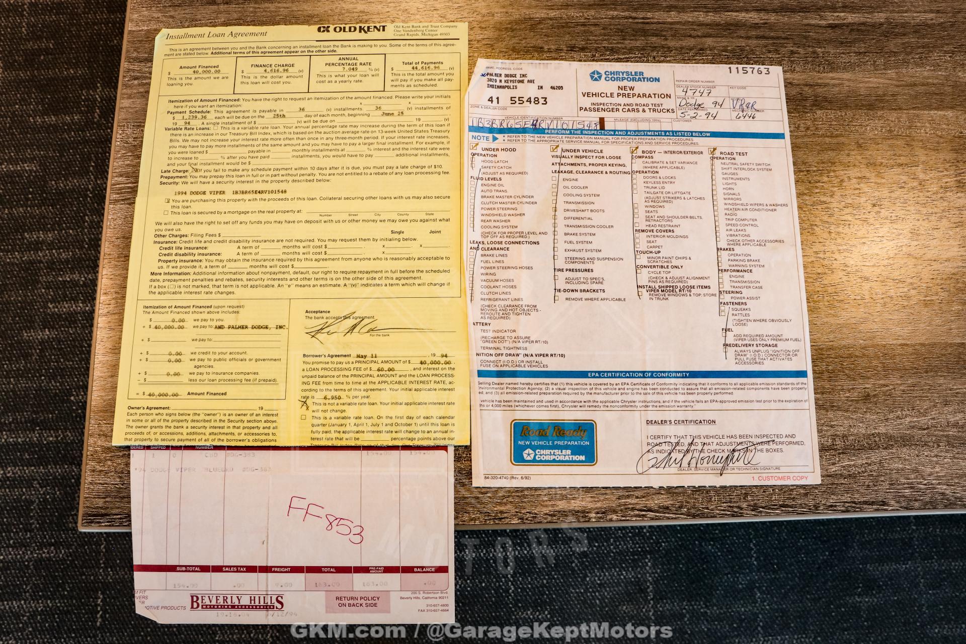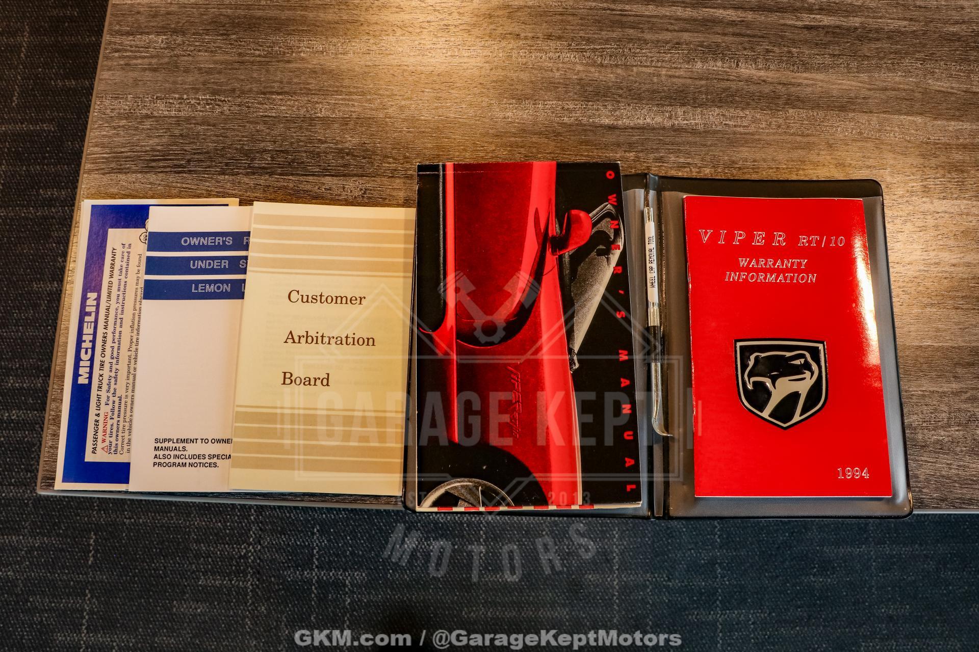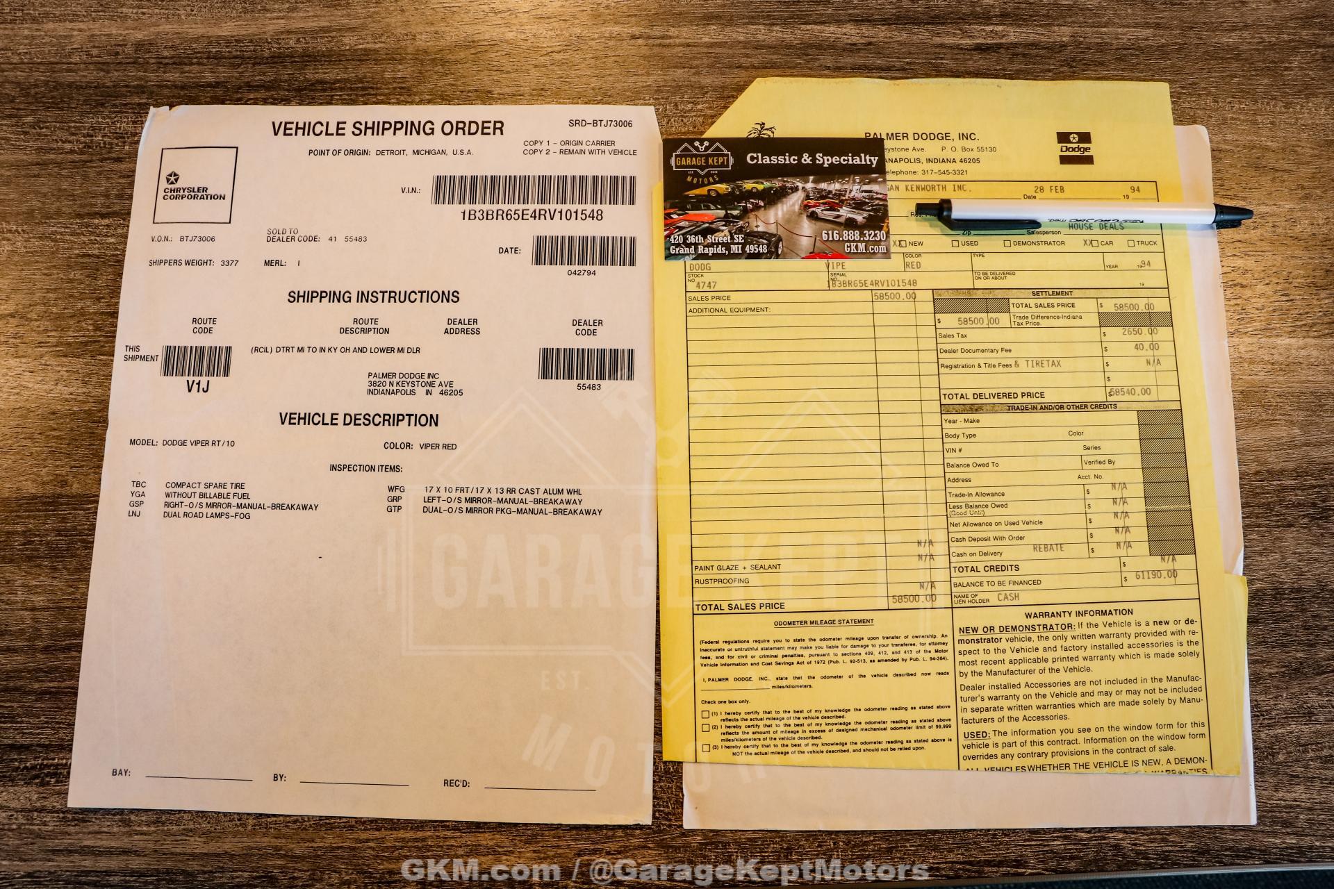 1994 Dodge Viper RT/10- Only 12,668 Original Miles- 8.0L/400HP V10- 0 to 60mph in 4.5 Seconds- Top Speed: 165mph- 6 Speed Manual Transmission- Viper Red Exterior- Black Interior- Original Window Sticker and Manuals- Collector Grade Example- AC Blows ColdStep into the world of high-performance driving with this stunning 1994 Dodge Viper RT/10, now available at Garage Kept Motors. This iconic American sports car is a true testament to raw power and exceptional design, offering an exhilarating driving experience that is sure to captivate any automotive enthusiast. With only 12,668 miles on the odometer, this Viper is a rare find, meticulously maintained and ready to deliver the thrill of the open road.At the heart of this beast lies an 8.0L naturally aspirated V10 engine, a powerhouse that defines the Viper's legendary status. This engine is renowned for its robust performance, delivering an awe-inspiring driving experience with every press of the accelerator. The Viper's rear-wheel-drive configuration ensures that power is delivered efficiently to the road, providing a dynamic and engaging ride that is both thrilling and rewarding.This particular Viper RT/10 comes equipped with a built-in radar detector (undetectable to the naked eye), a thoughtful addition for those who appreciate the need for speed while remaining mindful of road regulations. This feature enhances the driving experience, allowing you to enjoy the Viper's capabilities with added peace of mind.The 1994 Dodge Viper RT/10 is not just a car; it's an exotic class vehicle that stands out for its unique design and engineering. Its aggressive styling, characterized by bold lines and a low-slung profile, commands attention wherever it goes. The Viper's distinctive look is complemented by its performance-oriented features, making it a true icon in the world of sports cars.This Viper has been lovingly preserved, reflecting its low mileage and careful ownership. It is a rare opportunity to own a piece of automotive history, a car that embodies the spirit of American muscle and innovation. Available now at Garage Kept Motors, this Viper RT/10 is ready to find a new home with a discerning driver who appreciates its legacy and performance.Don't miss your chance to own this exceptional 1994 Dodge Viper RT/10, a car that offers an unparalleled driving experience and a place in the pantheon of automotive legends. Visit Garage Kept Motors today to see this remarkable vehicle in person and experience the thrill of the Viper for yourself. Whether you're a collector or a driving enthusiast, this Viper is sure to exceed your expectations and deliver a lifetime of unforgettable moments on the road.