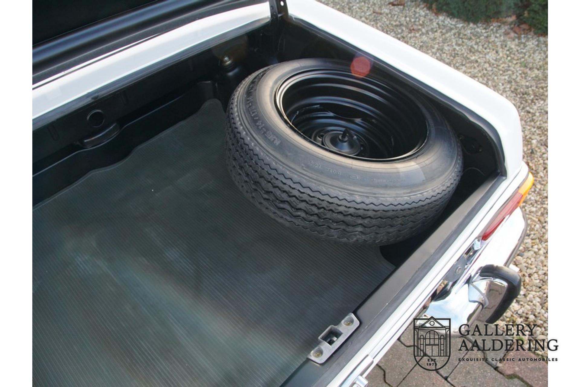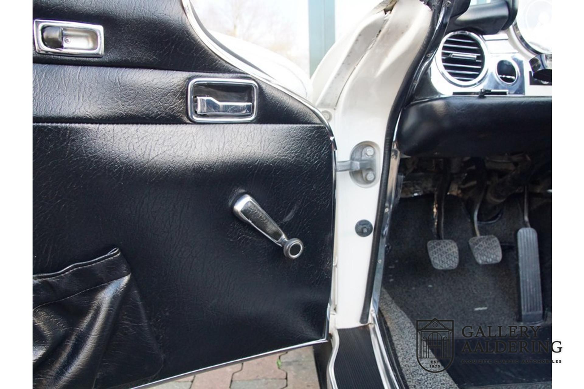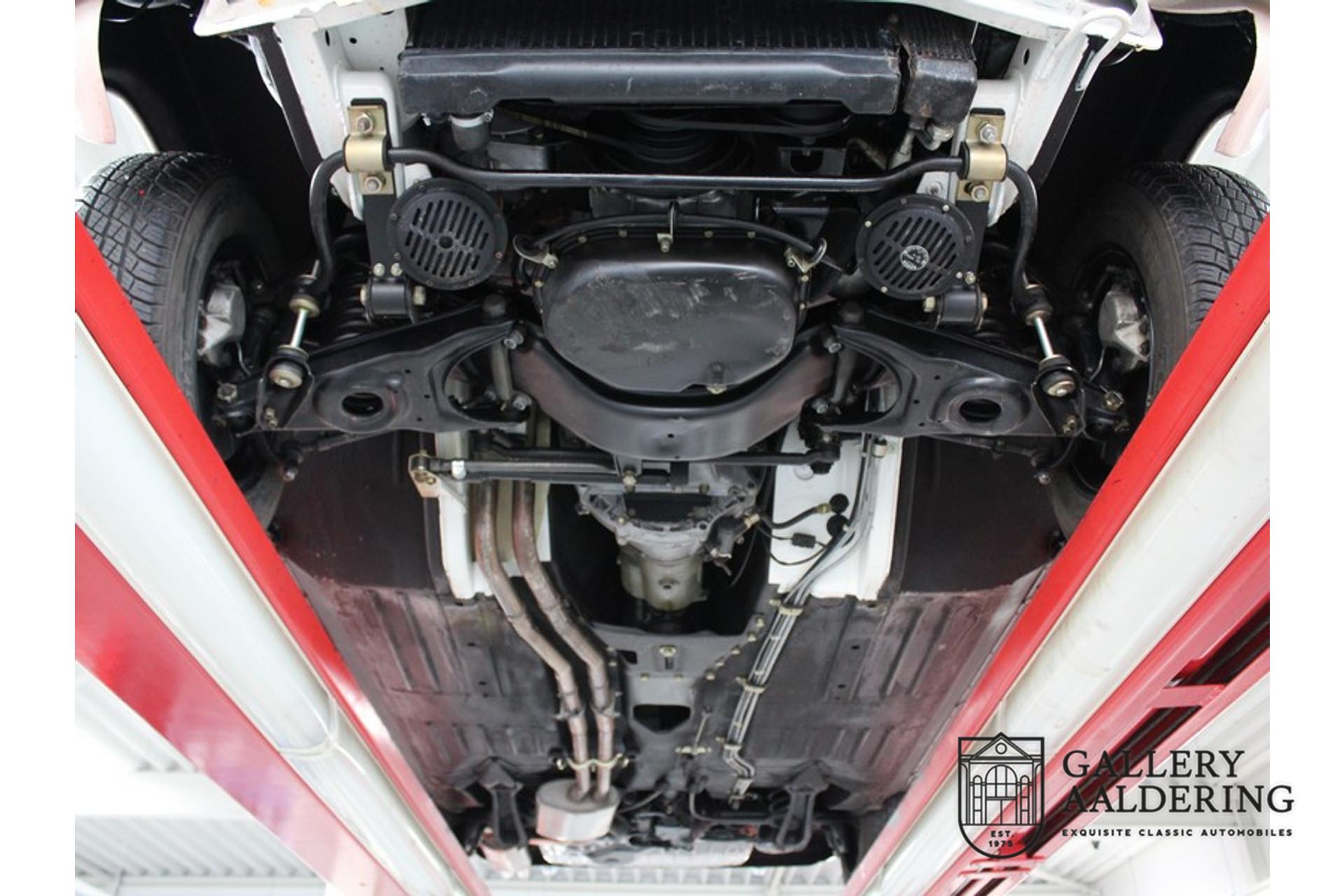 The classic color combination of a white exterior with a black interior is as timeless as it gets, and the cabin immediately impresses with its refinement. The upholstery is of outstanding quality, the carpets are immaculate, and the dashboard—complete with the correct steering wheel—looks superb. A thick file of invoices further confirms that this is an outstanding example in every respect.