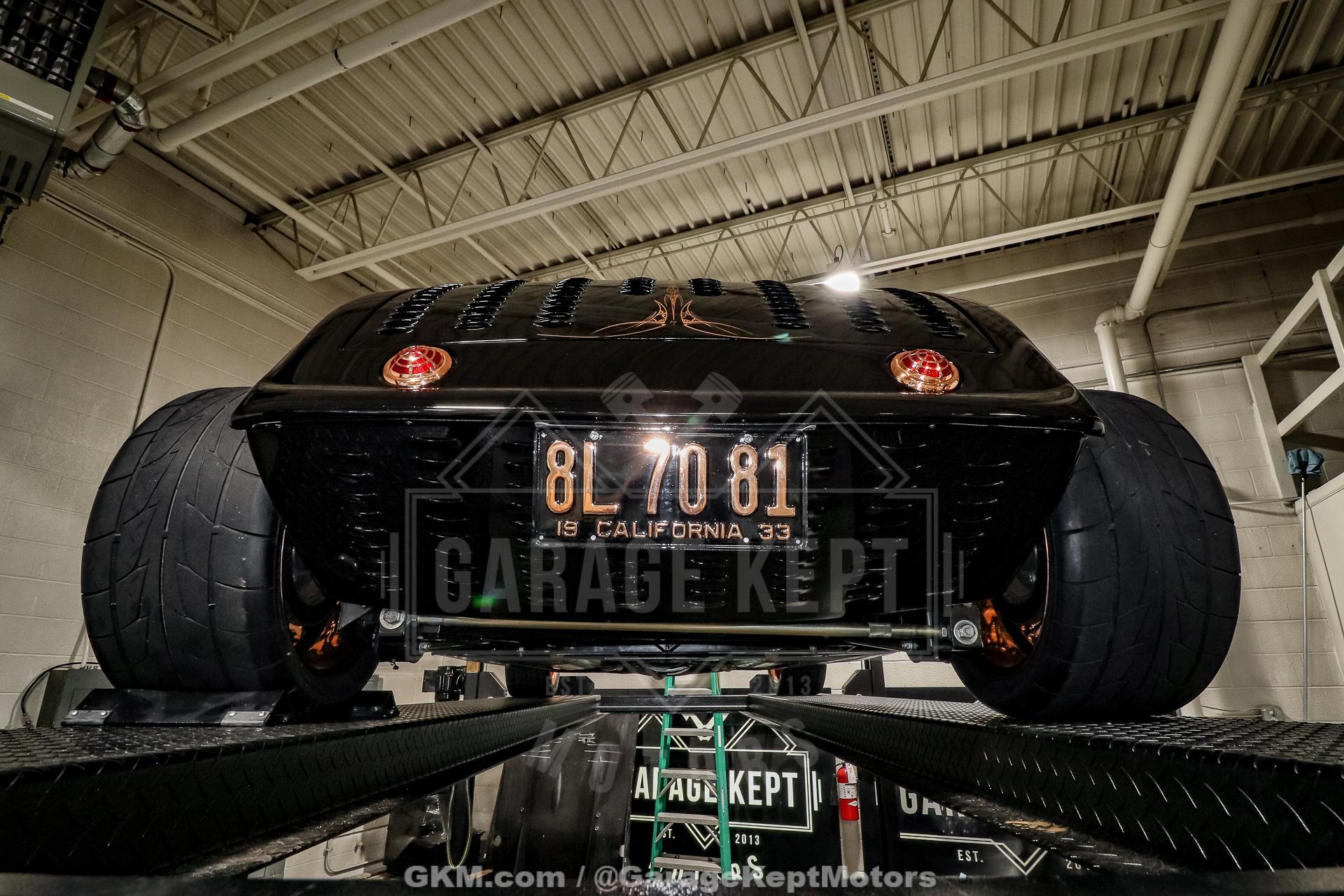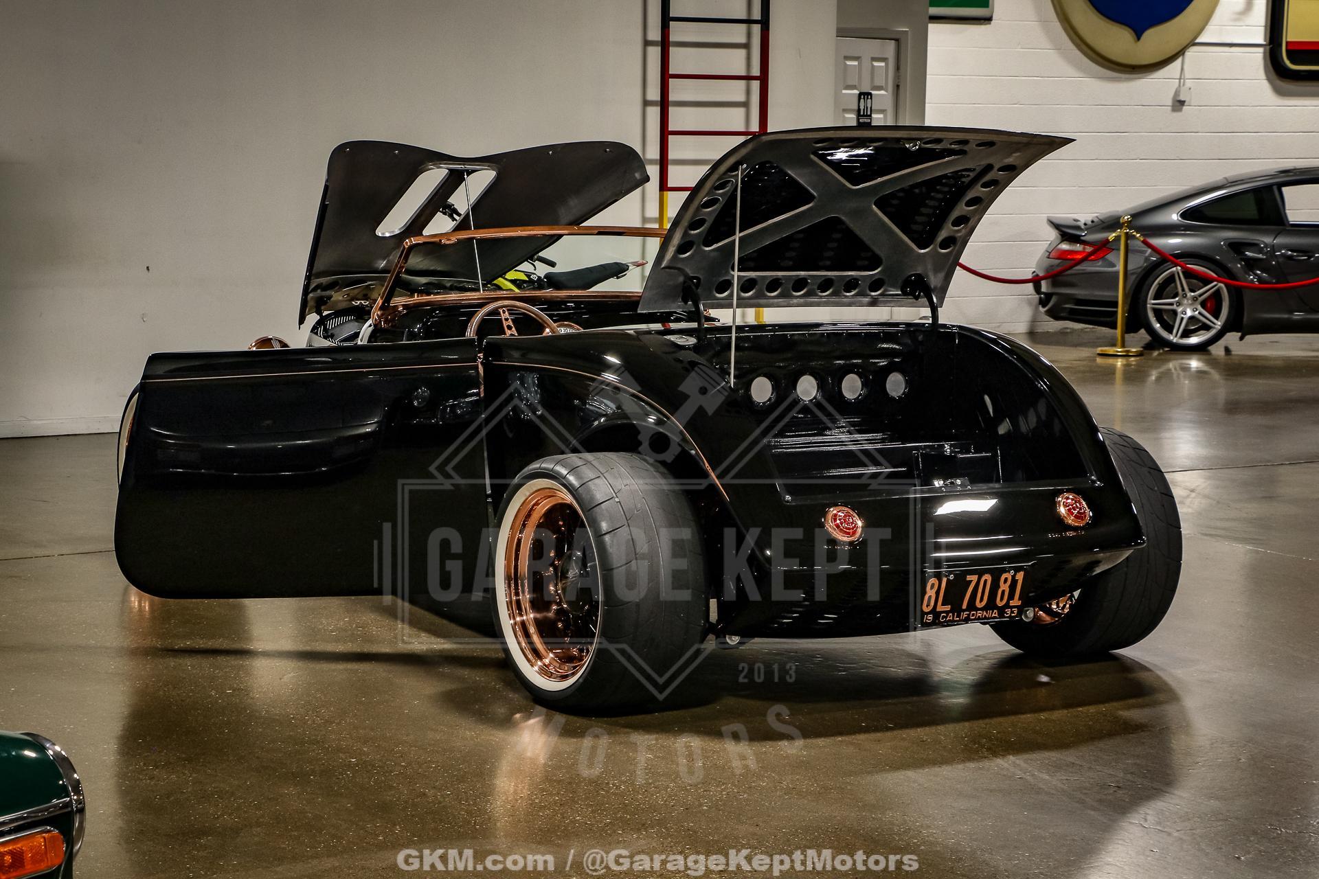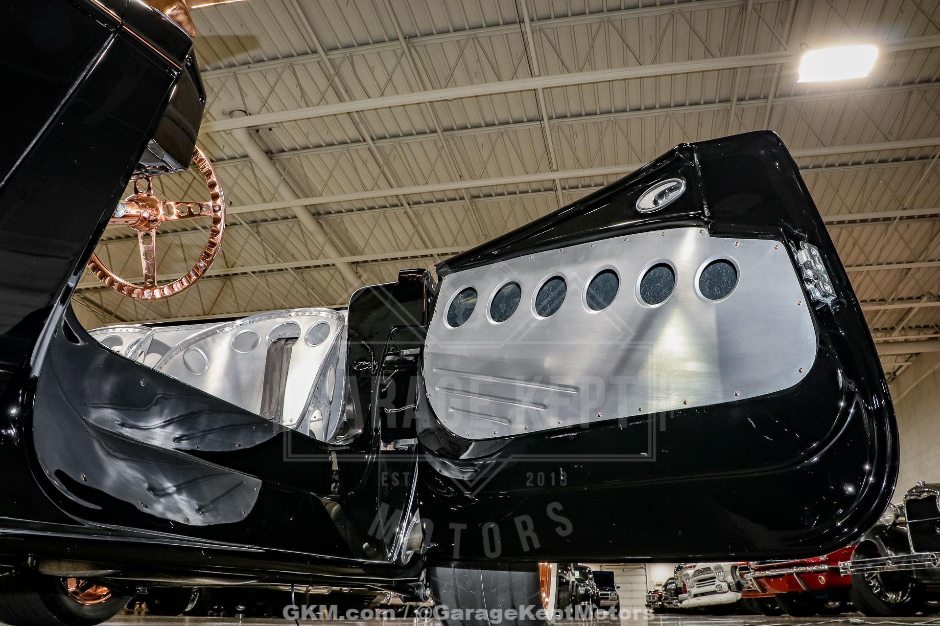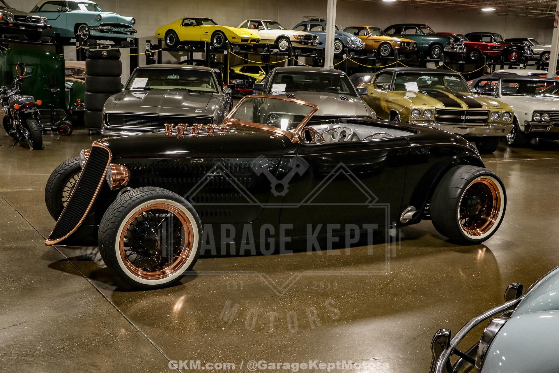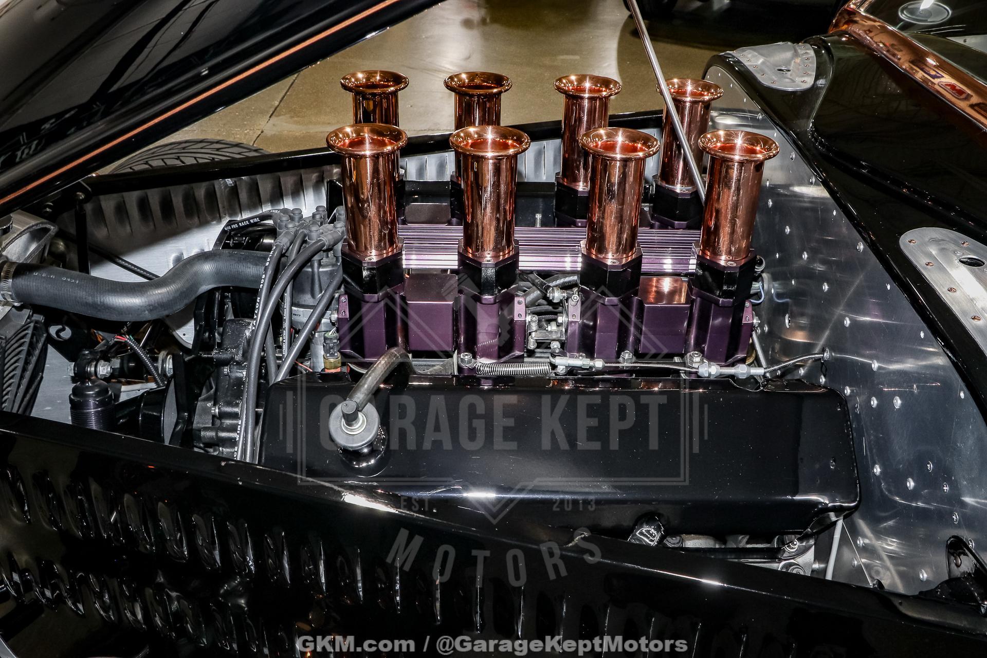 1933 Ford "Steampunk" Hot Rod- Massive 510-inch Big-Block Ford: Powered by a beastly 460 stroked to 510 cubic inches by Peters Racing.- Forged Internals: Featuring a Scat 4.150-inch forged crank, forged Scat rods, and JE 4.390-inch forged pistons (10:1 compression).- Imagine Injection System: Feeds twin ported Edelbrock aluminum heads through four Weber-like throttle bodies for aggressive power delivery and stunning looks.- Custom Exhaust: Hand-made stainless-steel headers by West Coast Auto Craft flow into Magnaflow mufflers, ensuring an exhilarating soundtrack.- TKO 600 Five-Speed Transmission: Paired with a Centerforce dual disc clutch for precise gear changes and maximum power transfer.- Factory Five Racing Chassis: Built on a sophisticated steel tube chassis with a 112-inch wheelbase, designed for serious road performance.- Advanced Suspension: Features a Mustang 8.8-inch Ford Truetrac differential (3.55:1) with a four-link rear suspension and inboard coilover shocks.- Precise Handling: FFR's unequal-length A-arm front suspension, Unisteer rack, and 11-inch disc brakes from a 2000 Mustang.- Wilwood Braking System: Ensures confident stopping power.- Hand-Formed Aluminum Body: Forget fiberglass! The entire body was custom fabricated from aluminum by Chris Miranda and Ben Star, taking the Factory Five design to an entirely new level.- Unique Body Elements: Features a custom hood with oblong injection stack openings, curvy hood sides revealing the IFS, louvered decklid and rear pan, and exhaust outlets in each quarter-panel.Step into a world where classic design meets modern engineering with this extraordinary 1933 Ford Hot Rod, available exclusively at Garage Kept Motors. This vehicle is not just a car; it's a masterpiece of automotive art, embodying the spirit of the steampunk aesthetic with its unique blend of vintage charm and cutting-edge performance.At the heart of this remarkable machine lies a massive 510ci V8 engine, a testament to raw power and precision engineering. This beastly powerplant is a 460 stroked to 510 cubic inches by the renowned Peters Racing, ensuring an exhilarating driving experience. The engine features forged internals, including a Scat 4.150-inch forged crank, forged Scat rods, and JE 4.390-inch forged pistons, delivering a 10:1 compression ratio. The Imagine Injection System feeds twin ported Edelbrock aluminum heads through four Weber-like throttle bodies, providing aggressive power delivery and a stunning visual appeal.The custom exhaust system, crafted with hand-made stainless-steel headers by West Coast Auto Craft, flows into Magnaflow mufflers, producing an exhilarating soundtrack that matches the car's performance. The TKO 600 five-speed transmission, paired with a Centerforce dual disc clutch, ensures precise gear changes and maximum power transfer, making every drive an unforgettable experience.Built on a sophisticated Factory Five Racing chassis with a 112-inch wheelbase, this Hot Rod is designed for serious road performance. The advanced suspension system features a Mustang 8.8-inch Ford Truetrac differential with a 3.55:1 ratio, a four-link rear suspension, and inboard coilover shocks. The FFR's unequal-length A-arm front suspension, Unisteer rack, and 11-inch disc brakes from a 2000 Mustang provide precise handling and confident stopping power, further enhanced by the Wilwood braking system.This Hot Rod's body is a work of art, hand-formed from aluminum by Chris Miranda and Ben Star, elevating the Factory Five design to an entirely new level. Forget fiberglass; this custom-fabricated aluminum body features unique elements such as a custom hood with oblong injection stack openings, curvy hood sides revealing the independent front suspension, a louvered decklid and rear pan, and exhaust outlets in each quarter-panel. The black paint color adds a touch of elegance and sophistication, perfectly complementing the steampunk theme.This 1933 Ford Hot Rod is truly an exotic class car, not only because of its unique steampunk design but also due to its unparalleled performance capabilities and bespoke craftsmanship. It stands as a testament to the art of custom car building, offering a driving experience that is both nostalgic and exhilarating.Don't miss the opportunity to own this one-of-a-kind 1933 Ford Hot Rod. Visit Garage Kept Motors today to experience the perfect fusion of classic design and modern performance. This is more than just a car; it's a piece of automotive history waiting to be driven.