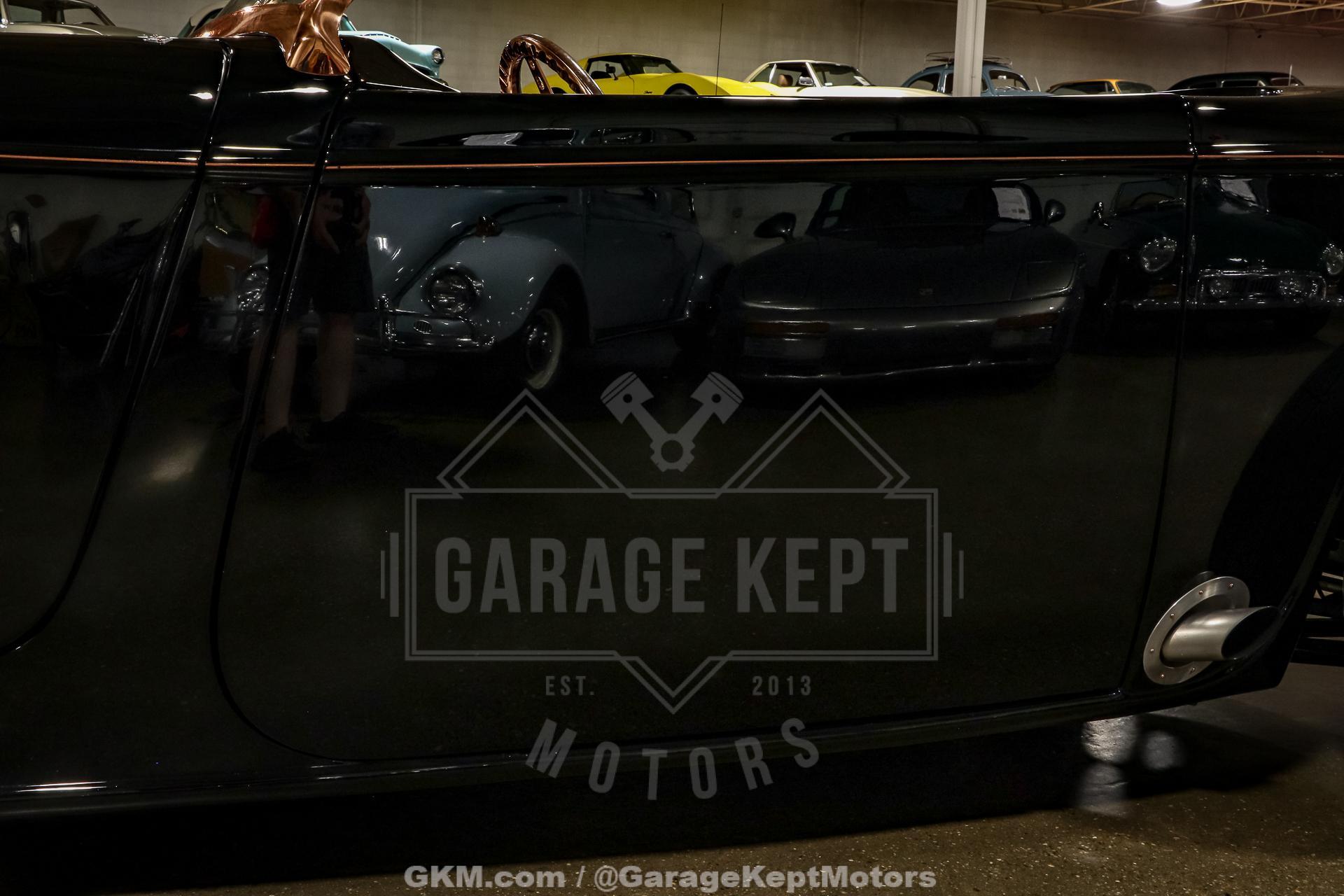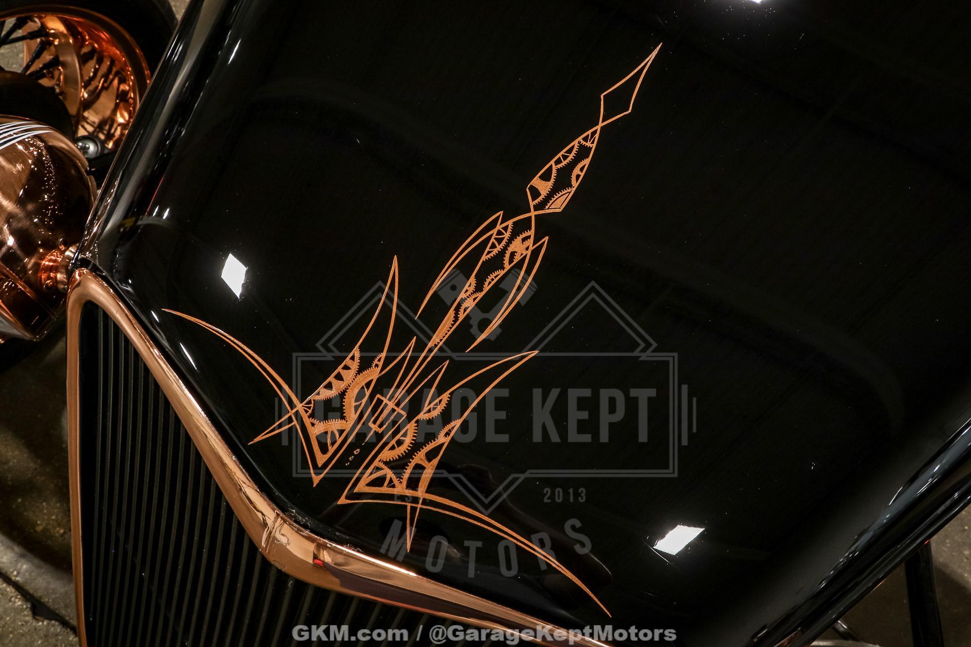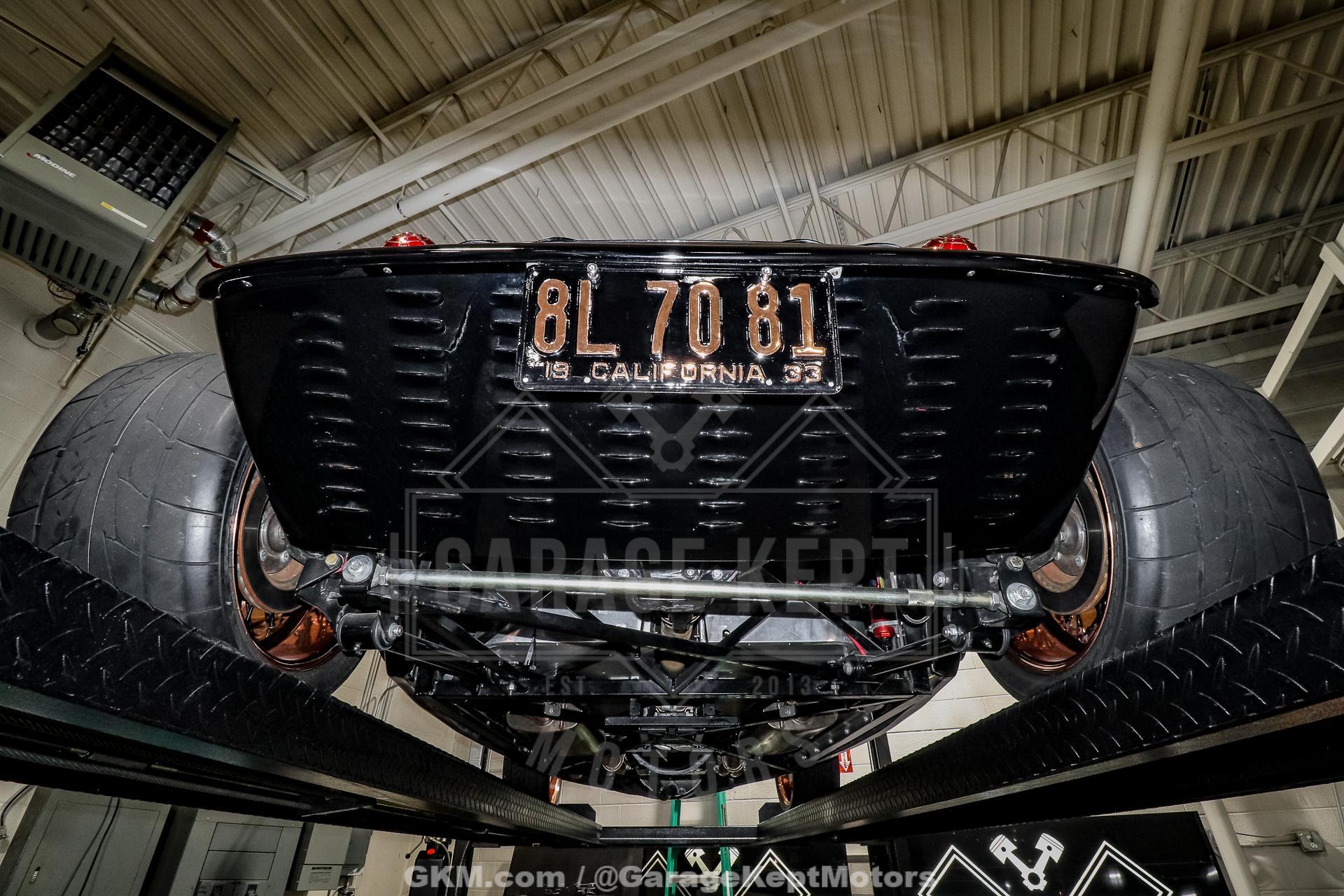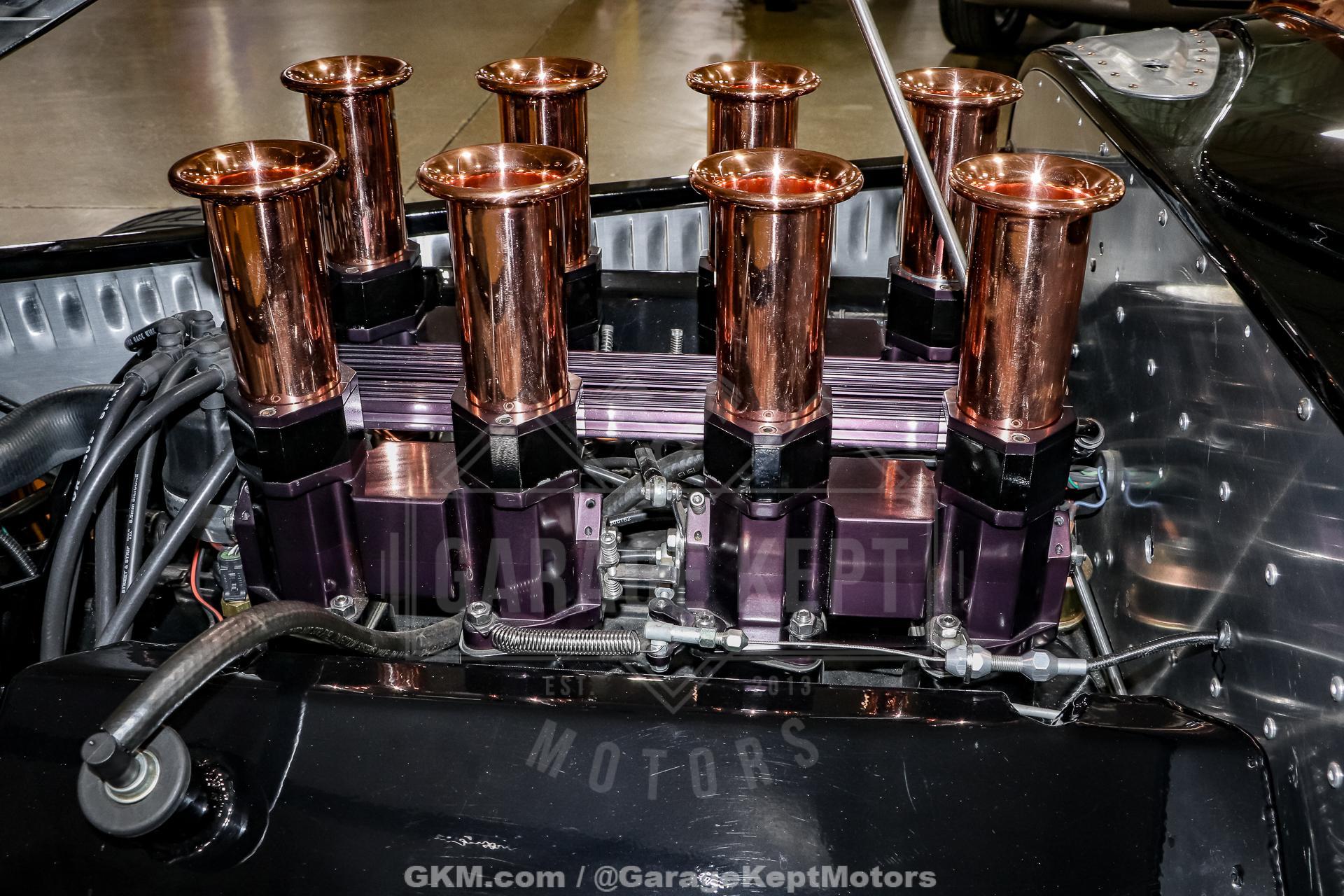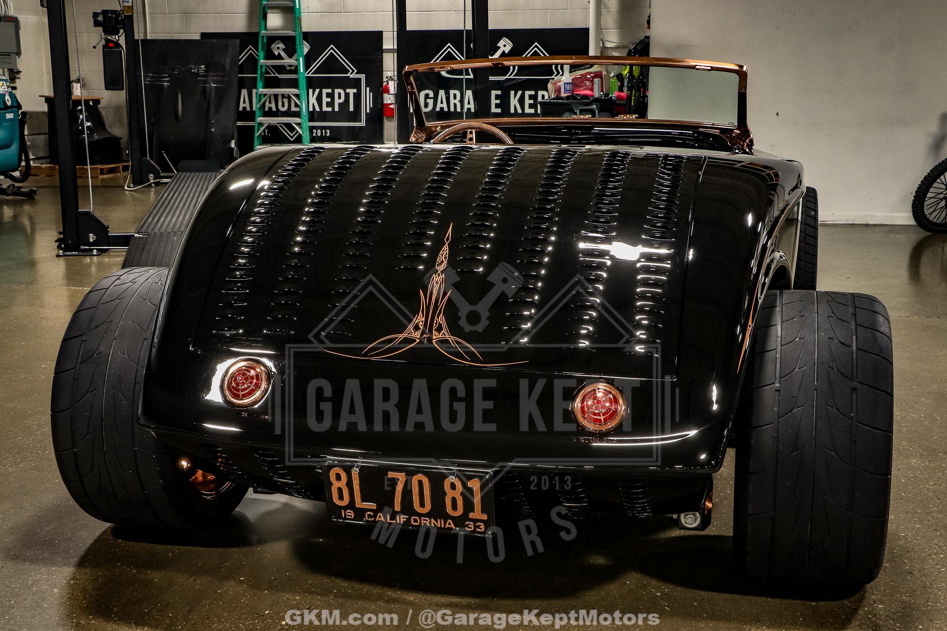 1933 Ford "Steampunk" Hot Rod- Massive 510-inch Big-Block Ford: Powered by a beastly 460 stroked to 510 cubic inches by Peters Racing.- Forged Internals: Featuring a Scat 4.150-inch forged crank, forged Scat rods, and JE 4.390-inch forged pistons (10:1 compression).- Imagine Injection System: Feeds twin ported Edelbrock aluminum heads through four Weber-like throttle bodies for aggressive power delivery and stunning looks.- Custom Exhaust: Hand-made stainless-steel headers by West Coast Auto Craft flow into Magnaflow mufflers, ensuring an exhilarating soundtrack.- TKO 600 Five-Speed Transmission: Paired with a Centerforce dual disc clutch for precise gear changes and maximum power transfer.- Factory Five Racing Chassis: Built on a sophisticated steel tube chassis with a 112-inch wheelbase, designed for serious road performance.- Advanced Suspension: Features a Mustang 8.8-inch Ford Truetrac differential (3.55:1) with a four-link rear suspension and inboard coilover shocks.- Precise Handling: FFR's unequal-length A-arm front suspension, Unisteer rack, and 11-inch disc brakes from a 2000 Mustang.- Wilwood Braking System: Ensures confident stopping power.- Hand-Formed Aluminum Body: Forget fiberglass! The entire body was custom fabricated from aluminum by Chris Miranda and Ben Star, taking the Factory Five design to an entirely new level.- Unique Body Elements: Features a custom hood with oblong injection stack openings, curvy hood sides revealing the IFS, louvered decklid and rear pan, and exhaust outlets in each quarter-panel.Step into a world where classic design meets modern engineering with this extraordinary 1933 Ford Hot Rod, available exclusively at Garage Kept Motors. This vehicle is not just a car; it's a masterpiece of automotive art, embodying the spirit of the steampunk aesthetic with its unique blend of vintage charm and cutting-edge performance.At the heart of this remarkable machine lies a massive 510ci V8 engine, a testament to raw power and precision engineering. This beastly powerplant is a 460 stroked to 510 cubic inches by the renowned Peters Racing, ensuring an exhilarating driving experience. The engine features forged internals, including a Scat 4.150-inch forged crank, forged Scat rods, and JE 4.390-inch forged pistons, delivering a 10:1 compression ratio. The Imagine Injection System feeds twin ported Edelbrock aluminum heads through four Weber-like throttle bodies, providing aggressive power delivery and a stunning visual appeal.The custom exhaust system, crafted with hand-made stainless-steel headers by West Coast Auto Craft, flows into Magnaflow mufflers, producing an exhilarating soundtrack that matches the car's performance. The TKO 600 five-speed transmission, paired with a Centerforce dual disc clutch, ensures precise gear changes and maximum power transfer, making every drive an unforgettable experience.Built on a sophisticated Factory Five Racing chassis with a 112-inch wheelbase, this Hot Rod is designed for serious road performance. The advanced suspension system features a Mustang 8.8-inch Ford Truetrac differential with a 3.55:1 ratio, a four-link rear suspension, and inboard coilover shocks. The FFR's unequal-length A-arm front suspension, Unisteer rack, and 11-inch disc brakes from a 2000 Mustang provide precise handling and confident stopping power, further enhanced by the Wilwood braking system.This Hot Rod's body is a work of art, hand-formed from aluminum by Chris Miranda and Ben Star, elevating the Factory Five design to an entirely new level. Forget fiberglass; this custom-fabricated aluminum body features unique elements such as a custom hood with oblong injection stack openings, curvy hood sides revealing the independent front suspension, a louvered decklid and rear pan, and exhaust outlets in each quarter-panel. The black paint color adds a touch of elegance and sophistication, perfectly complementing the steampunk theme.This 1933 Ford Hot Rod is truly an exotic class car, not only because of its unique steampunk design but also due to its unparalleled performance capabilities and bespoke craftsmanship. It stands as a testament to the art of custom car building, offering a driving experience that is both nostalgic and exhilarating.Don't miss the opportunity to own this one-of-a-kind 1933 Ford Hot Rod. Visit Garage Kept Motors today to experience the perfect fusion of classic design and modern performance. This is more than just a car; it's a piece of automotive history waiting to be driven.