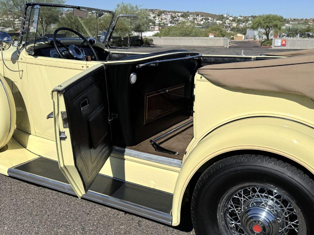NEW PRICE! This 1933 Packard Eight Series 1002 Phaeton is a well-preserved example powered by the 320ci L-head straight-eight paired with a 3-speed synchromesh transmission. With the original Light Yellow paint and original black leather interior, this Packard is a beautiful representation that would be a great weekend driver, tourer and welcome at local shows. Originally sold new in 1933, one of only 1,099 Series 1002 chassis produced, this Packard has been cared for by a small number of dedicated enthusiasts. The earliest documented owner, Mr. Brown, retained the car for over 25 years before selling it in 1999. David Critchlow Sr. acquired the Packard in 2004, later selling it to Tom Crook, the esteemed Packard expert and restorer. Mr. Crook completed an engine rebuild and sold the car to the current owner in 2013, at which point it had just 4,618 miles since restoration. The current owner has been driven approximately 8,000 miles. This Packard is a former CCCA National First Prize winner and holds CCCA Full Classic status. This Packard presents well and is in good overall condition. The Light-Yellow paint is in good condition and mostly original with some selected touchups over the years from normal use. The chrome trim accents are in good overall condition with some wear showing in the expected areas from high use. The Packard has dual horns, dual side spotlights, wind wings, windscreen that can lie flat, driving lamps, tan canvas-covered trunk and 17inch wire wheels. The tan canvas top is in good condition with minor frayingin two corners. This Packard is a beautiful, mostly original example that would be welcomed at local shows and a great motorcar to use for touring. The Packards original interior is in good condition with age showing from regular use. The original black leather seating shows an overall patina with a couple tears. The black leather door sides are in great condition, and the brown carpet is in good overall condition. The dash presents well with the instrument panel in overall good condition. The interior is in considerably well-maintained condition for a Packard that has been a reliable driver over the years. This model 1002 is powered by its original 320ci L-head straight-eight with nine main bearings, paired with a three-speed synchromesh manual transmission and single-plate clutch. Fuel is delivered through a Stromberg dual downdraft carburetor with automatic choke and a mechanical fuel pump. Power is sent to a semi-floating rear axle, with the chassis employing semi-elliptic leaf springs and worm-and-roller steering. Stopping power comes from mechanical drum brakes assisted by a vacuum power unit for all four wheels, with adjustments available for brake sensitivity. The car is equipped with Packards Ride Control system, offering driver-adjustable shock absorber settings. All factory instrument gauges are functional; a tachometer has been added. Maintenance highlights include regular servicing every 500 to 750 miles, steering sector shaft and thermostat syphon assembly serviced in 2019 and tires replaced in 2023. The Packard was most recently serviced in July 2025, comes with service records and a collection of service manuals. For more information and details, please call or text Kendi Brown at 1.623.404.9042 or email us at sales@classicpromenade.com. This Packard is available for inspection at our showroom in Phoenix. We are pleased to coordinate inspections, and we help coordinate shipping worldwide. We also have financing partners if you are interested in financing.
