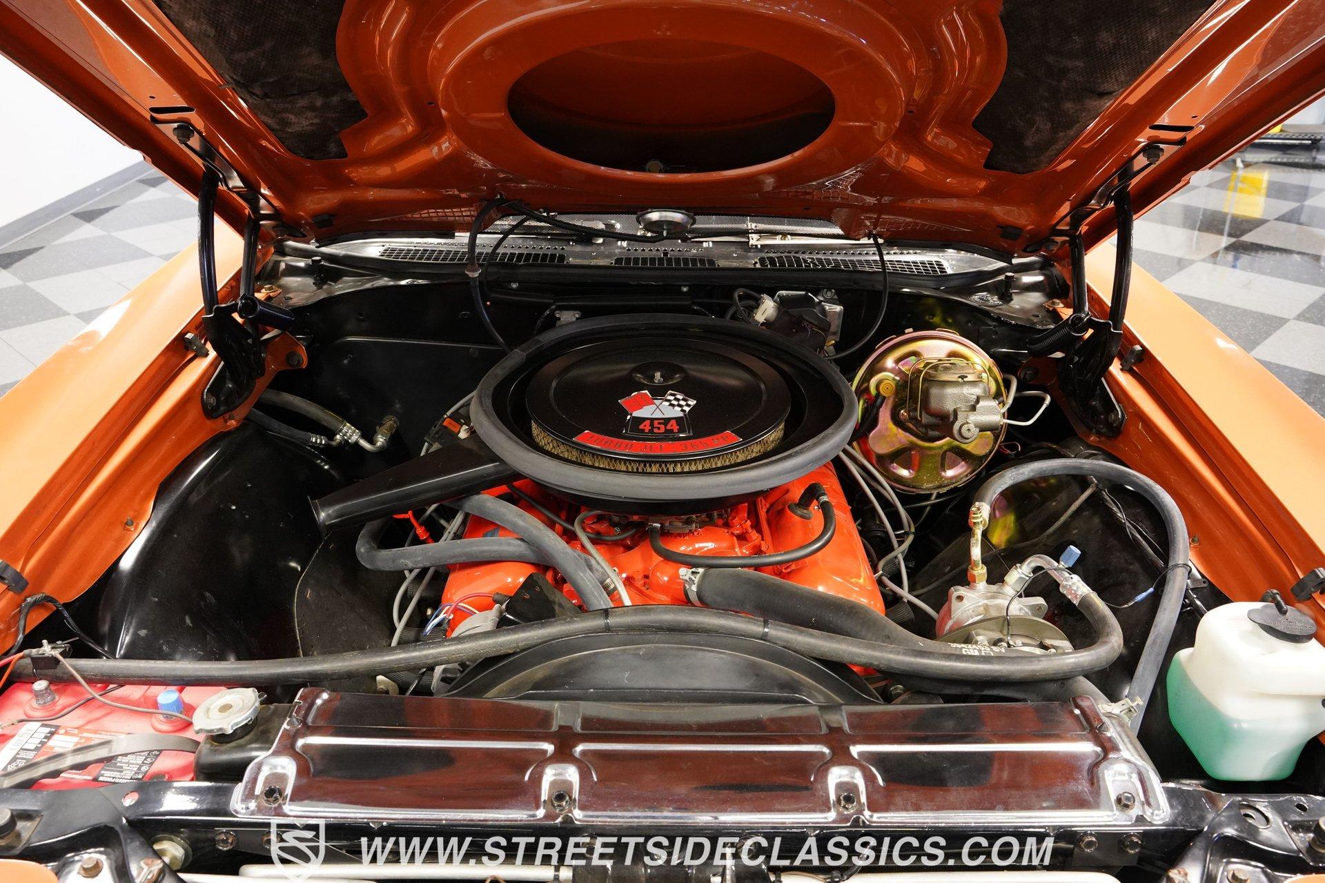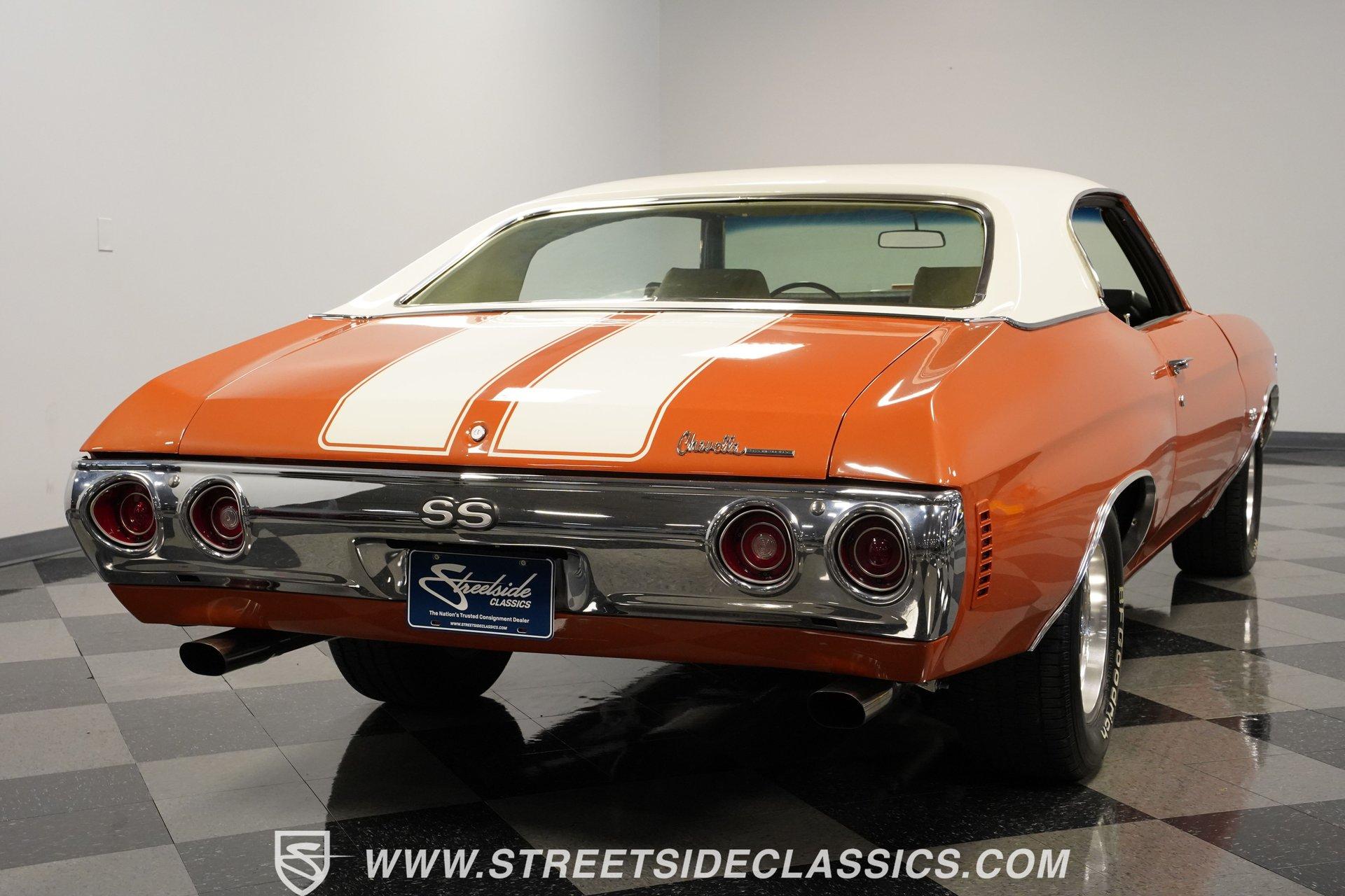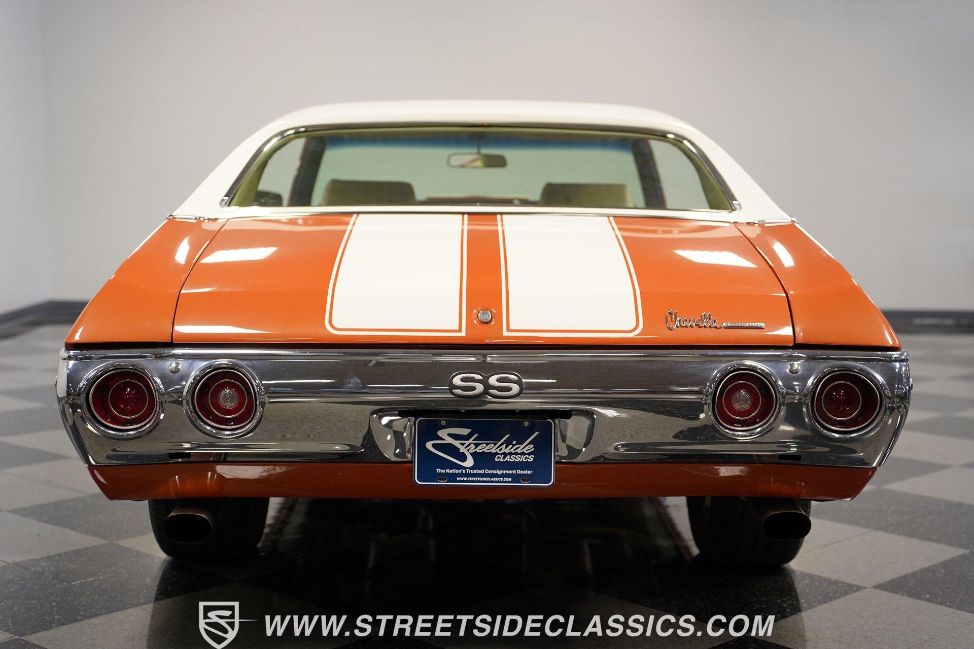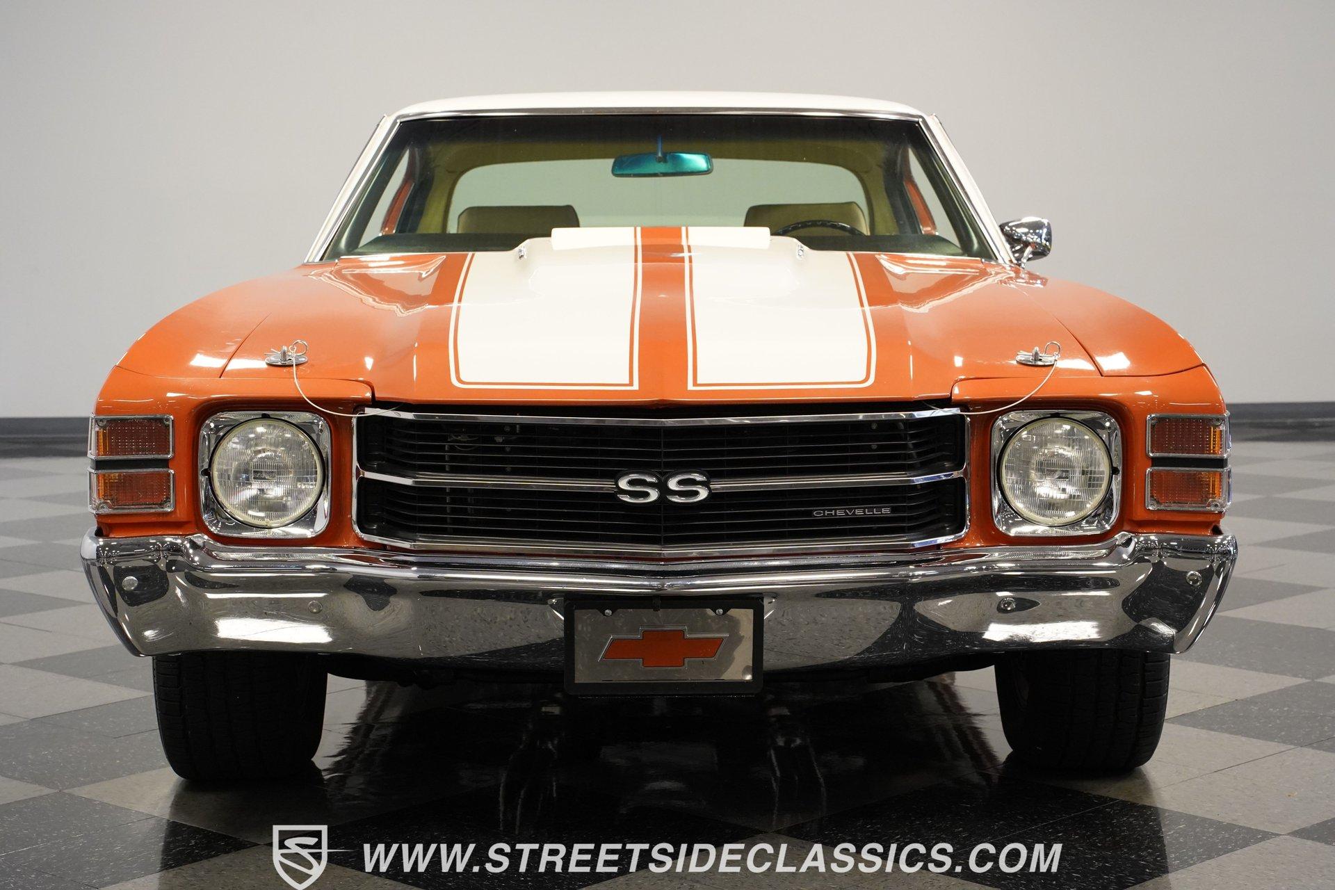 White roof over Burnt Orange paint gives this 1971 Chevrolet Chevelle SS 454 a bold, factory-correct color combination that flat-out works. Painted stripes stretch across the body, finishing off a look that lands squarely in muscle car territory. The stance sits right thanks to US Mags 15" wheels wrapped in P235/60R15 front and P255/60R15 rear tires. A functioning cowl induction hood and clean trim help define the SS package, while the overall body fit keeps everything tight and solid from front to rear. Inside, Sandalwood vinyl covers the bucket seats, working with the center console and horseshoe shifter to keep the muscle car vibe intact. Vintage Air A/C is fitted and modern Bluetooth sound replaces the original signal while leaving the classic layout intact. The dash pad, original steering wheel, and clean gauge cluster all hold their place. Fresh carpet and a tight headliner finish the job, while the panels and trim pieces carry that consistent, well-kept look. The LS5 454 V8 pairs with a TH400 3-speed automatic transmission and breathes through a Holley 4-barrel carburetor. Intake and valve covers have been finished to match the engine bay, while Patriot long tube headers feed into a dual Pypes exhaust system. Coil springs and sway bar control the front, trailing arms with tubular upgrades handle the rear. Power disc brakes up front, power steering, and a 12-bolt rear axle round out the setup. HIGHLIGHTS: LS5 454 V8 TH400 3-Speed Automatic Transmission Holley 4-Barrel Carburetor Patriot Long Tube Headers Dual Pypes Exhaust System Power Disc Brakes 12-Bolt Rear End Coil Spring/Shock/Sway Bar Front Suspension Trailing Arm/Coil Spring/Shock Rear Suspension Tubular Rear Trailing Arms Burnt Orange Paint With Painted Stripes White Roof US Mags 15" Wheels P235/60R15 Front & P255/60R15 Rear Tires Functioning Cowl Induction Hood Sandalwood Interior With Bucket Seats Center Console With Horseshoe Shifter Vintage Air Conditioning Original Steering Wheel Power Steering Bluetooth Stereo Newer Carpet Tight Headliner Clean Door Panels Factory Buildsheet Owner's Manual Service Receipts Big block power, Complete restoration and authentic SS appointments make this 1971 Chevrolet Chevelle SS 454 a serious muscle car investment. Call today!