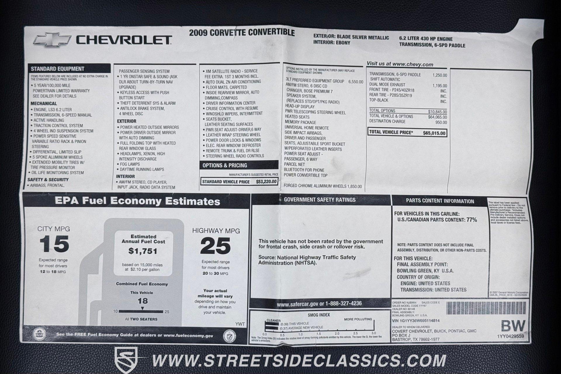 Owning a Corvette convertible is about more than transportation. It is about the feeling of open-air freedom, a purposeful engine note, and the confidence that comes with a well-sorted American sports car. This 2009 Corvette 3LT convertible delivers that experience with a tidy presentation that makes it easy to enjoy every day or weekend. With a 6.2L LS3 V8 and 6-speed automatic transmission, this Vette is ready for a new owner. Step inside and you will find a comfortable 3LT Preferred interior with sport bucket power seats trimmed in perforated leather, heated seats, memory functions, and a heads-up display that keeps essential information in view. The Bose premium audio and AM/FM/CD/Bluetooth setup make cruising enjoyable. The cockpit is clean and well kept and shows only minor wear. There is a toggle switch installed in the ashtray for the dual mode exhaust system. Under the hood is the potent 6.2L LS3 V8 paired to the 6-speed automatic transmission equipped with paddle shifters for a more engaging experience. A K&N cold air intake improves throttle response and sound and the suspension features Bilstein shocks for confident handling, while 18- and 19-inch wheels wear Michelin tires (front 245/40ZR18 and rear 285/35ZR19). Braking is handled by power discs front and rear. Highlights: Mileage: 70,479 miles One careful owner since new Original paint with very nice overall finish Convertible power top 6.2L LS3 V8 with K&N cold air intake 6-speed automatic transmission with paddle shifters 3LT Preferred package, Bose premium audio, HUD, power telescoping/tilt steering, heated power seats, memory package, universal home remote, sport bucket seats with perforated leather Bilstein shocks Power disc brakes front and rear Wheels and tires: 18" front / 19" rear wheels with Michelin tires (front 245/40ZR18, rear 285/35ZR19) Original window sticker and owner's manuals included This Corvette presents an inviting balance of classic appeal and usable performance, making it a solid choice for someone seeking an enjoyable convertible that is ready to drive. Call today!